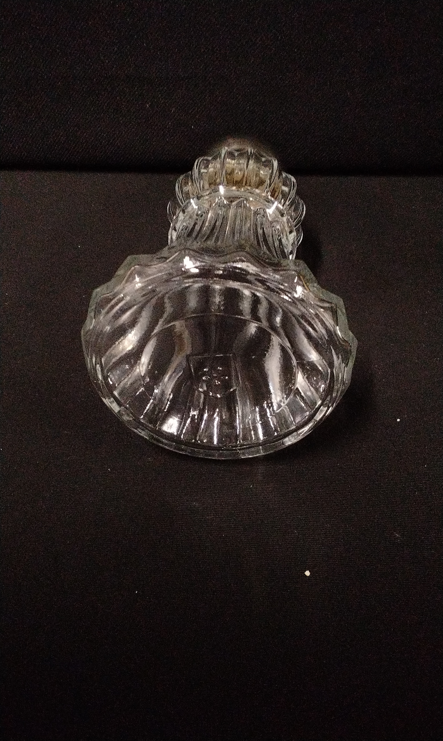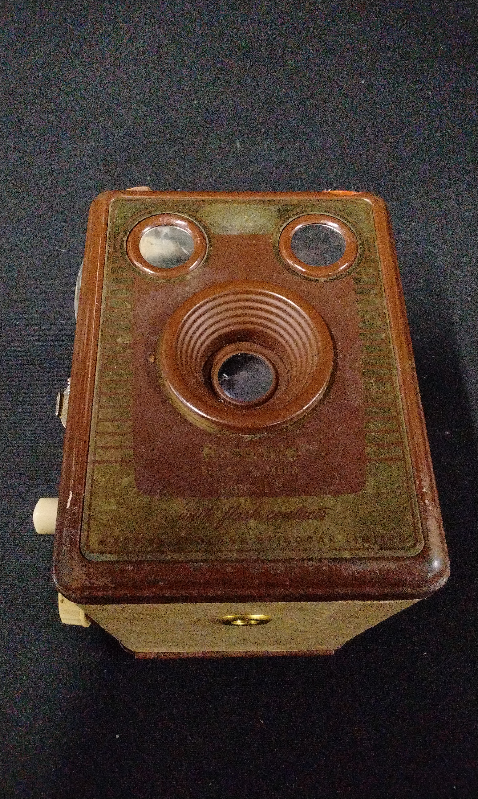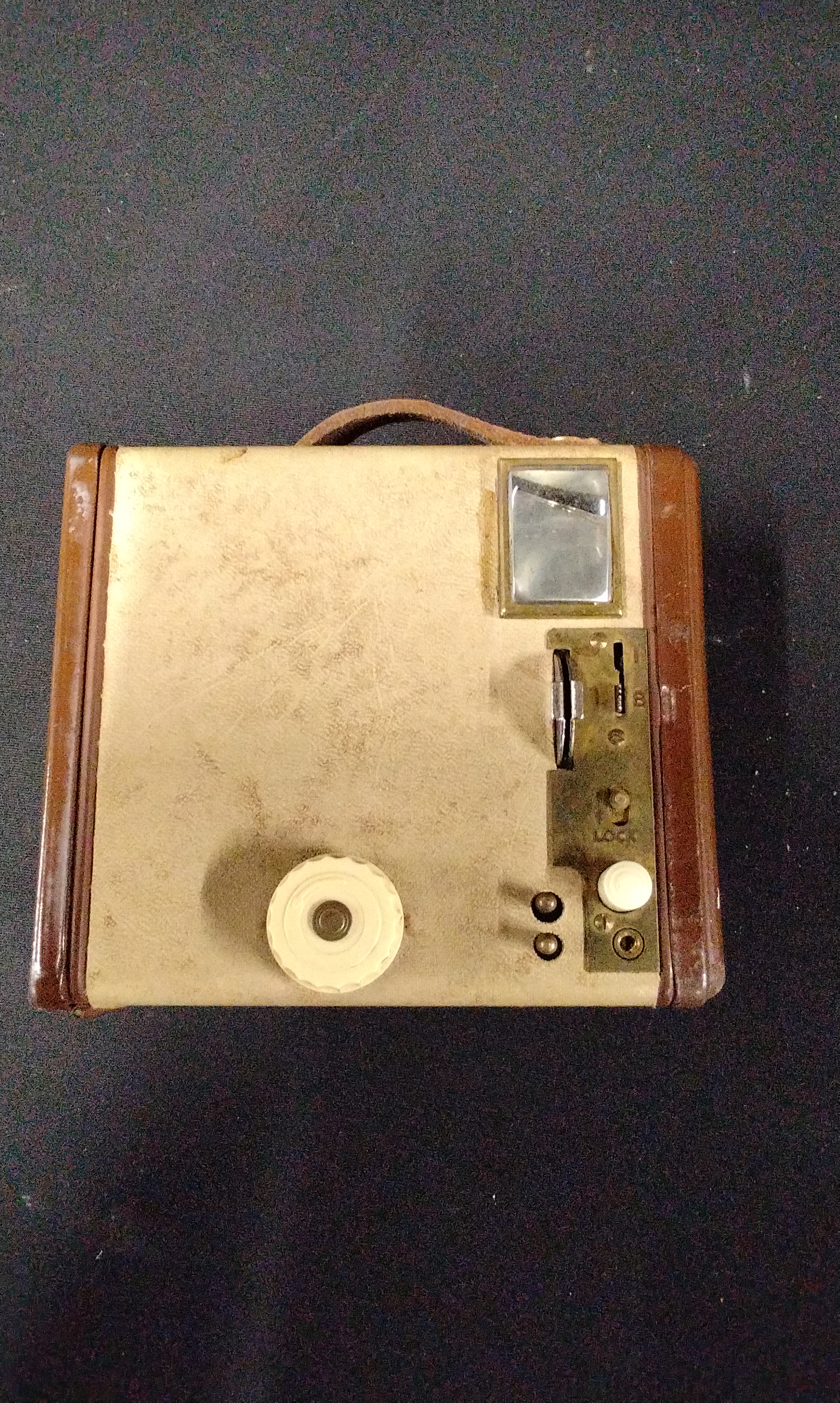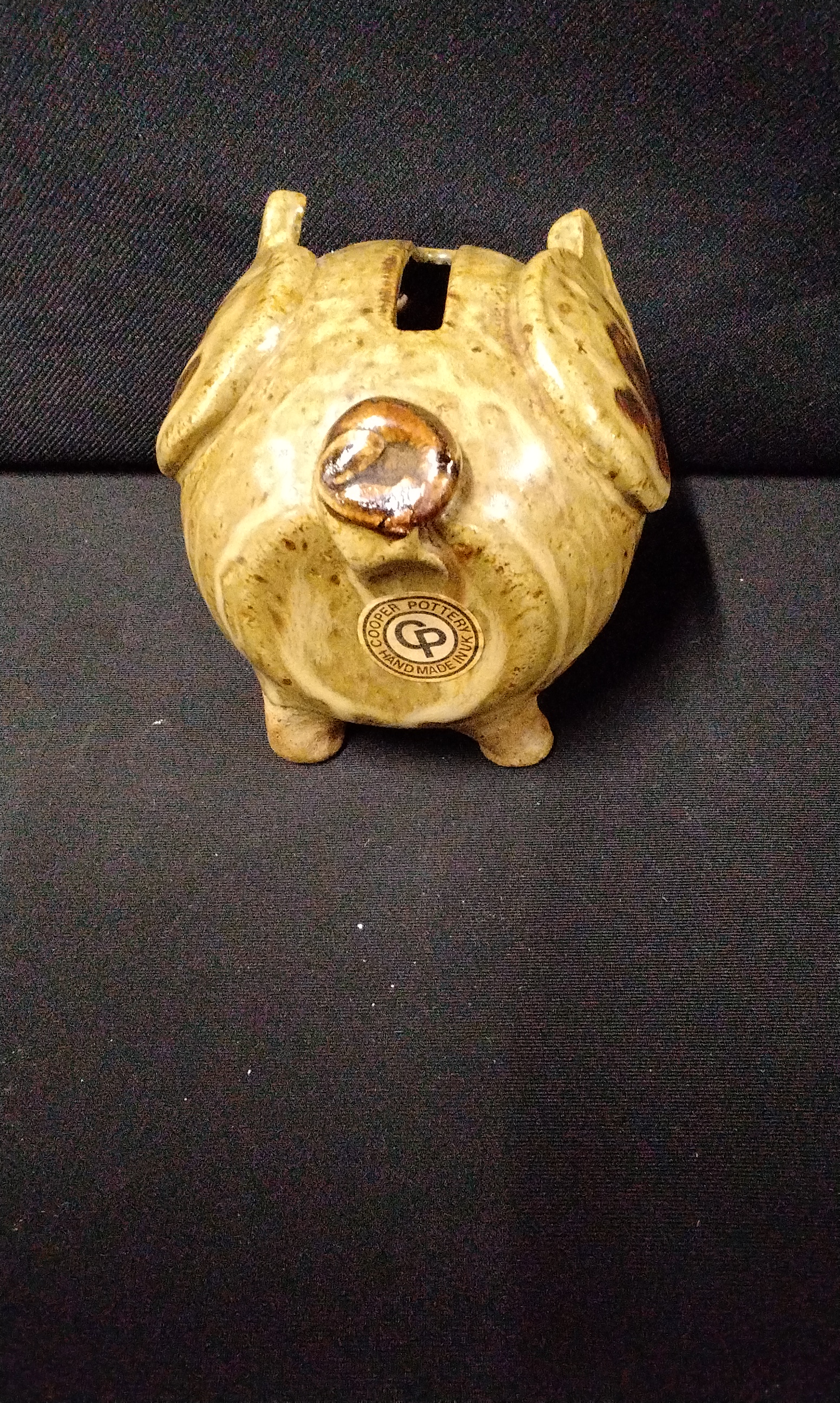 A collection of four miscellaneous vintage objects. The lot includes a Kodak Six-20 Model E box camera, identified by front plate text as having flash contacts and confirmed internally by a label reading “USE KODAK 620 FILMS MADE IN ENGLAND BY KODAK LIMITED LONDON.” The camera features a tan and brown faux leather exterior and a leather carrying handle. Also included is a functional tan woven canvas/vinyl carrying case or bag designed specifically to house the camera, complete with a shoulder strap. The third item is a glazed ceramic figural piggy bank in earthy brown and olive tones, marked on the underside with the stamp “COOPER POTTERY HAND MADE” and the monogram “CP.” The final item is a clear pressed glass shaker with a fluted design and a silver-toned metal perforated cap.