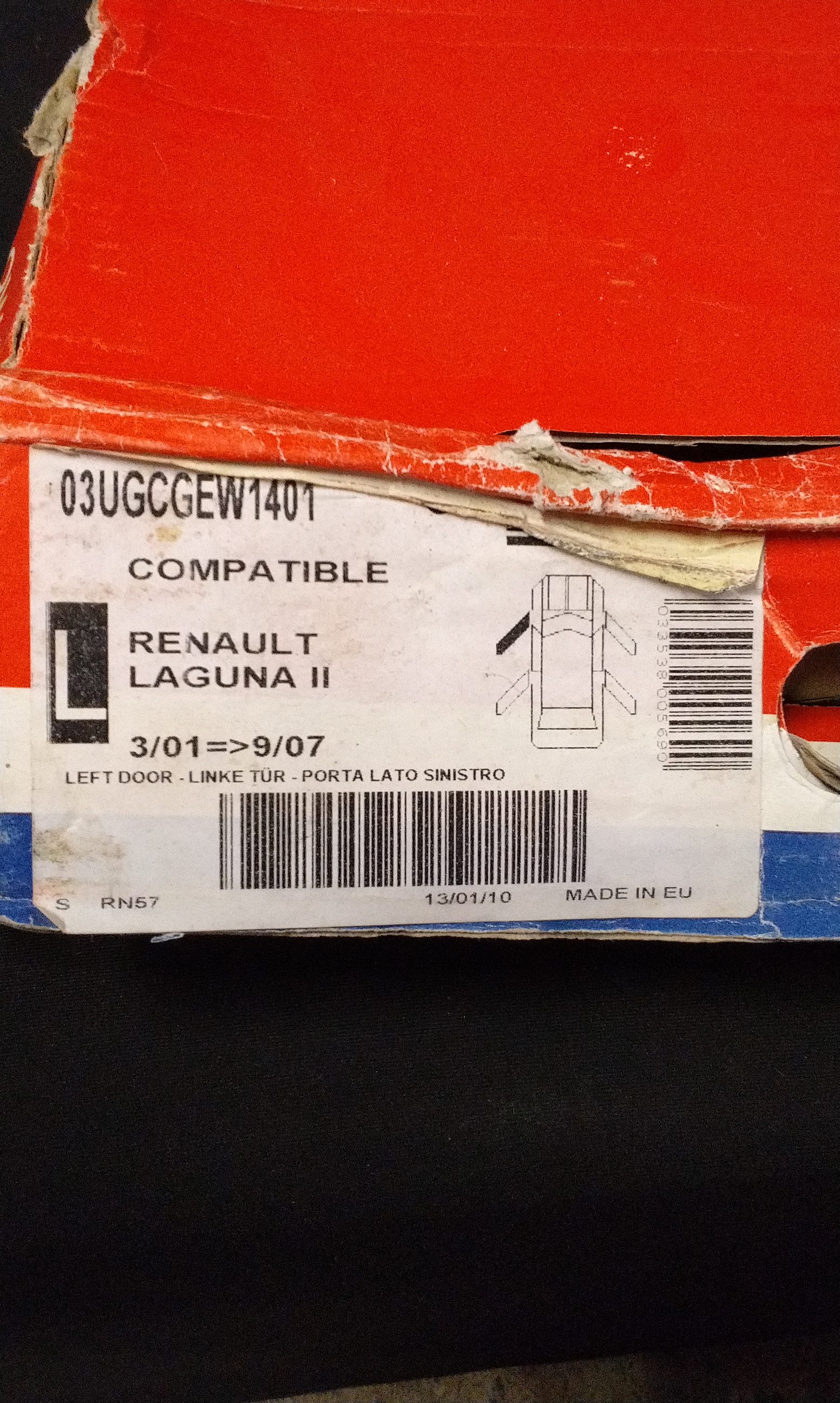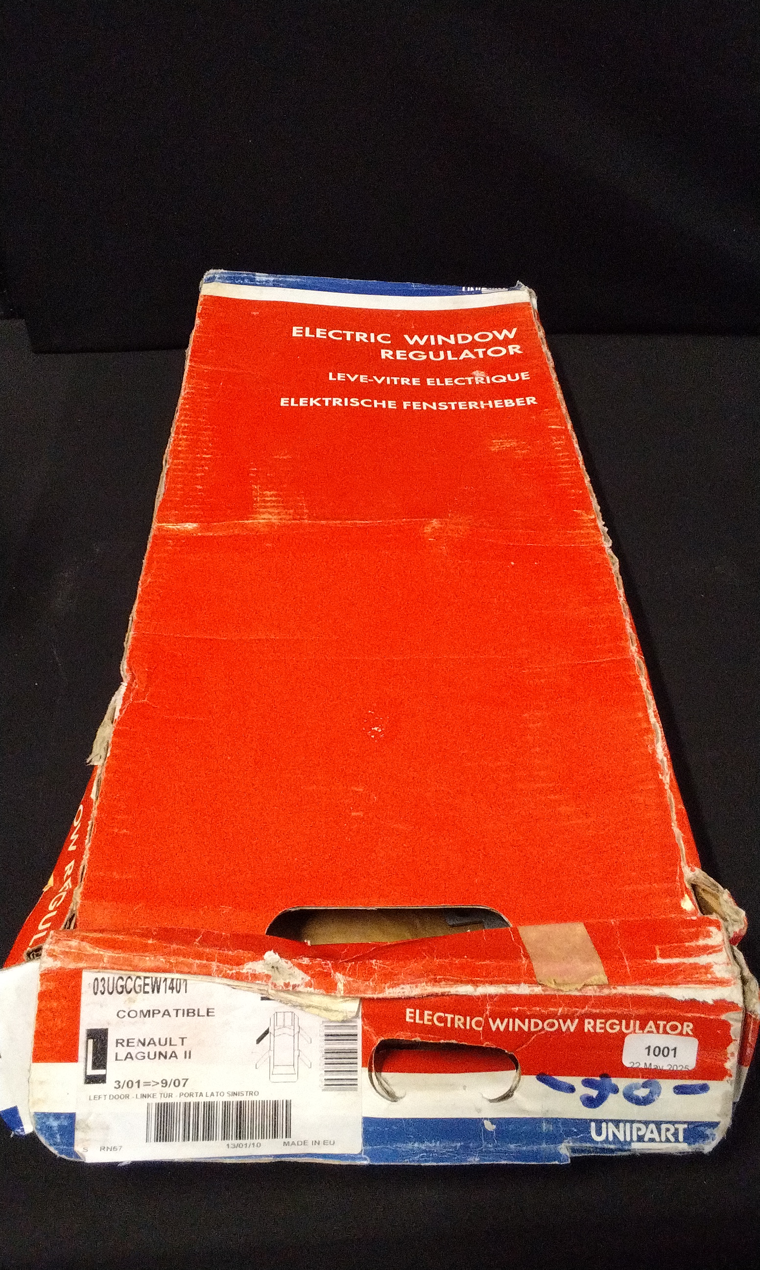 A single boxed UNIPART Electric Window Regulator, part number 03UGCGEW1401. The packaging indicates compatibility with the RENAULT LAGUNA II model manufactured between 3/01 and 9/07, specifically for the LEFT DOOR (LINKE TÜR – PORTA LATO SINISTRO). The packaging is multilingual, identifying the contents as “ELECTRIC WINDOW REGULATOR,” “LEVE-VITRE ELECTRIQUE,” and “ELEKTRISCHE FENSTERHEBER.” Visible markings include the code RN57, the designation “MADE IN EU,” and a stamped date of 13/01/10. The item is contained within its original orange and white cardboard packaging.