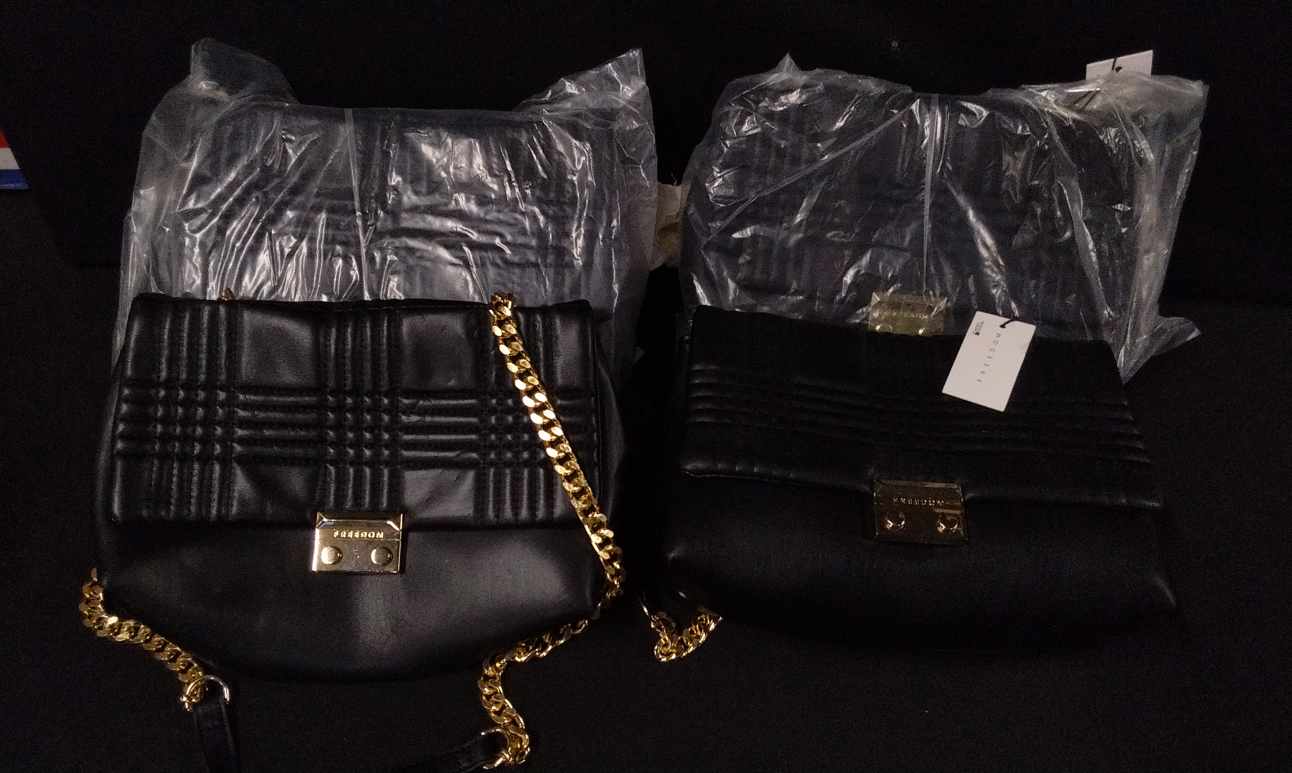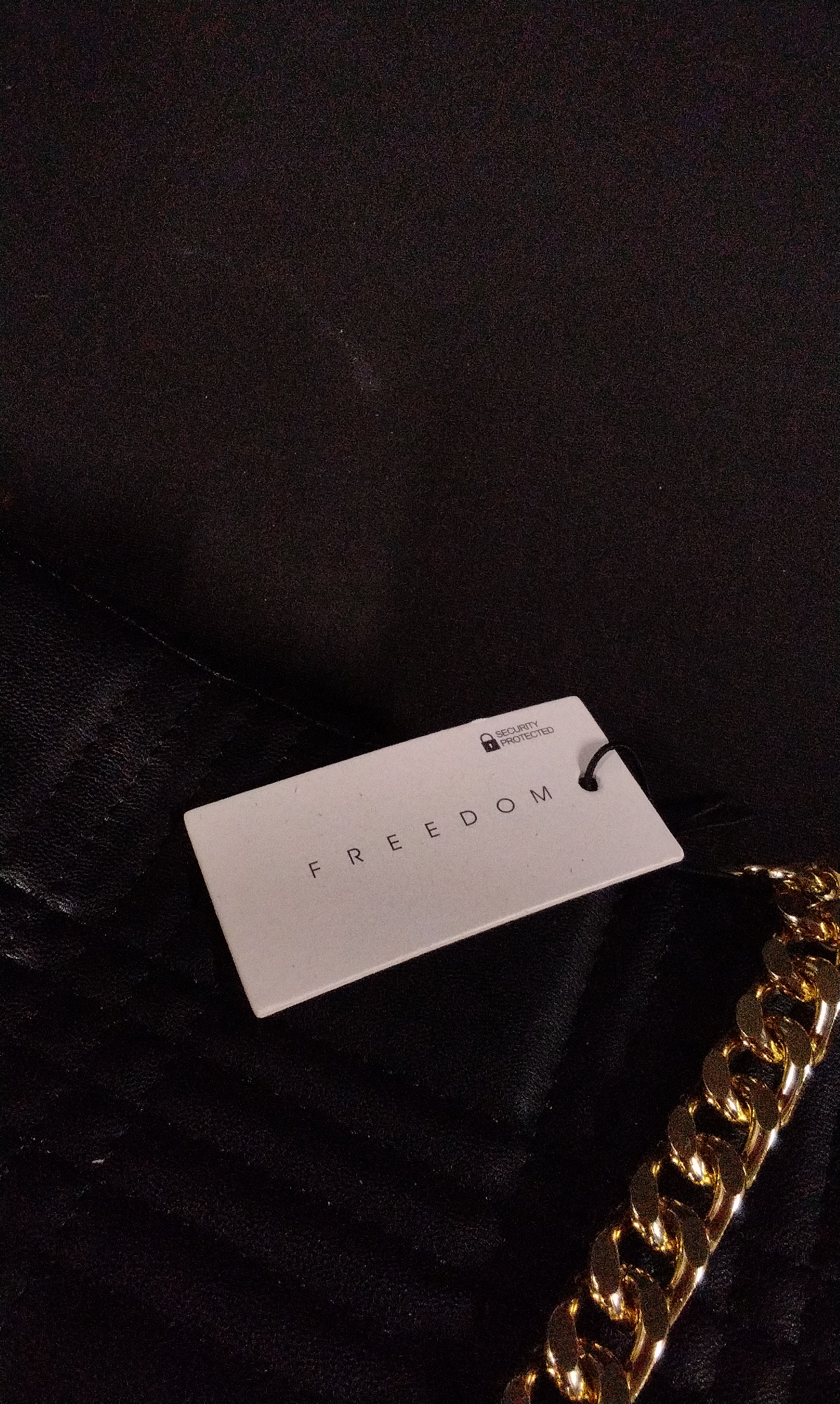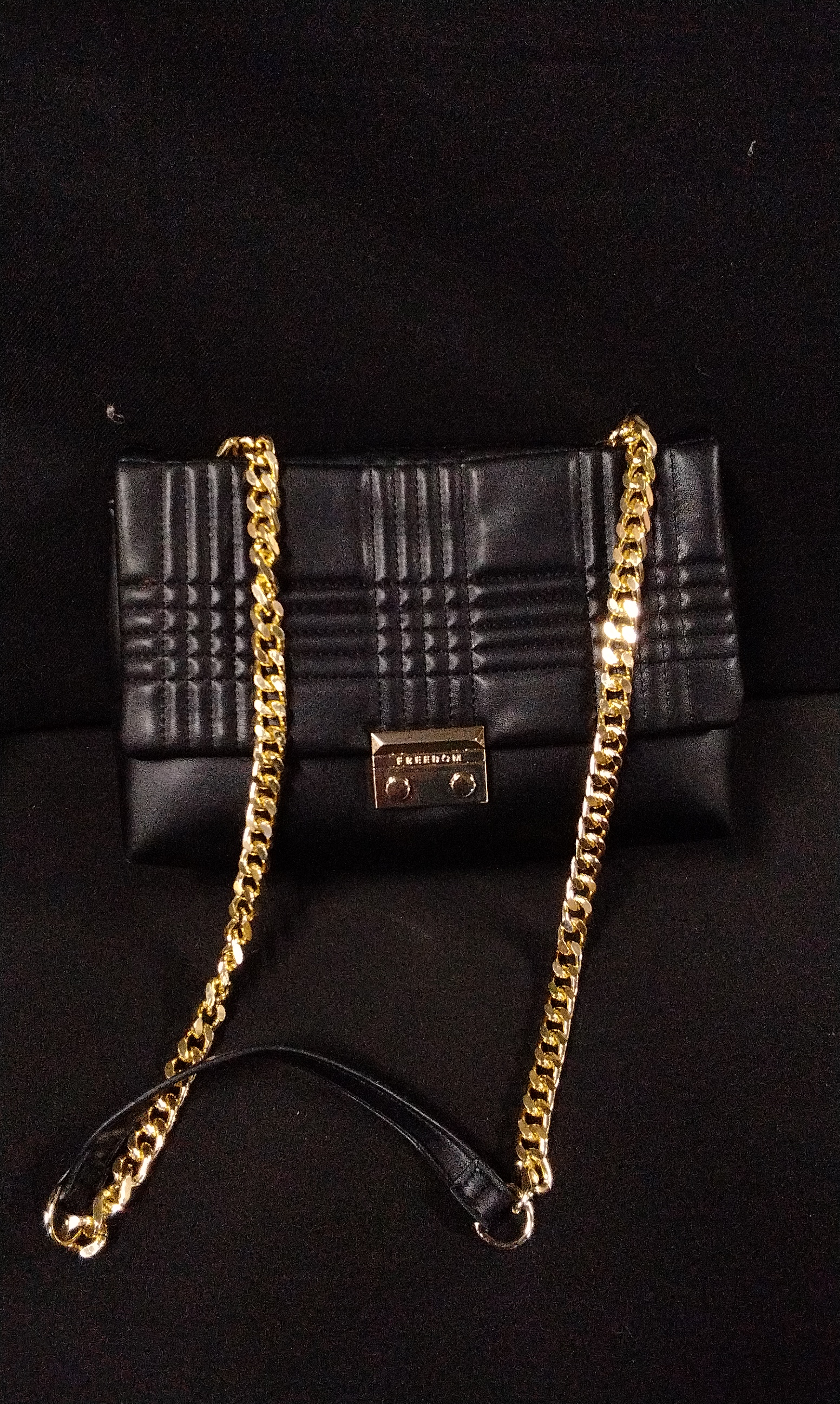4x Brand New modern flap handbags attributed to the brand FREEDOM. The bags are constructed from black faux leather or synthetic material. Both items feature structured flaps, prominent gold-tone curb chain shoulder straps, and rectangular gold-tone turn-lock clasps. The clasp mechanism on both bags is visibly branded FREEDOM. One bag features a quilted plaid pattern on the flap, while the second bag features horizontal quilted stitching. Both items retain partial clear plastic packaging and attached retail tags, consistent with new or unused stock.