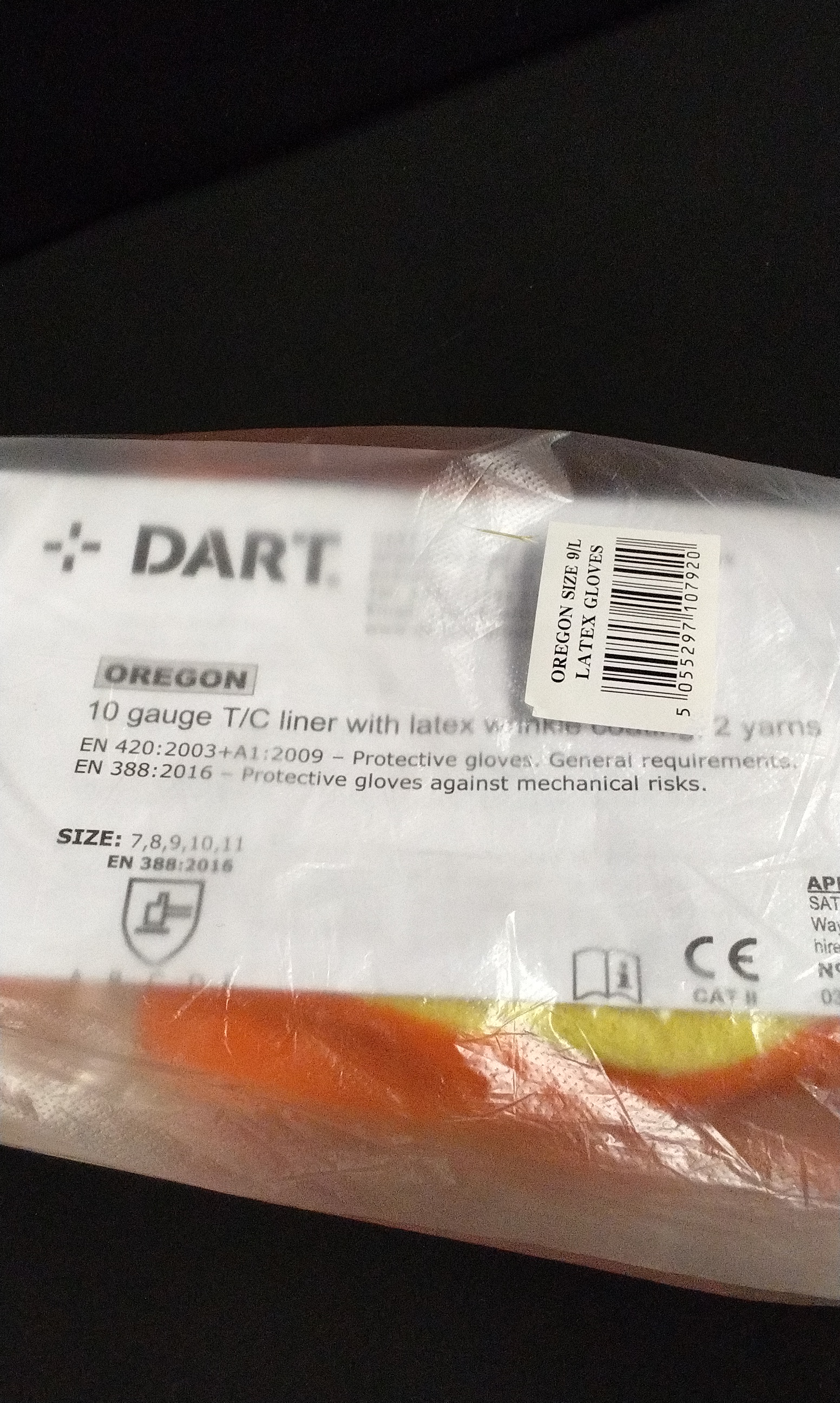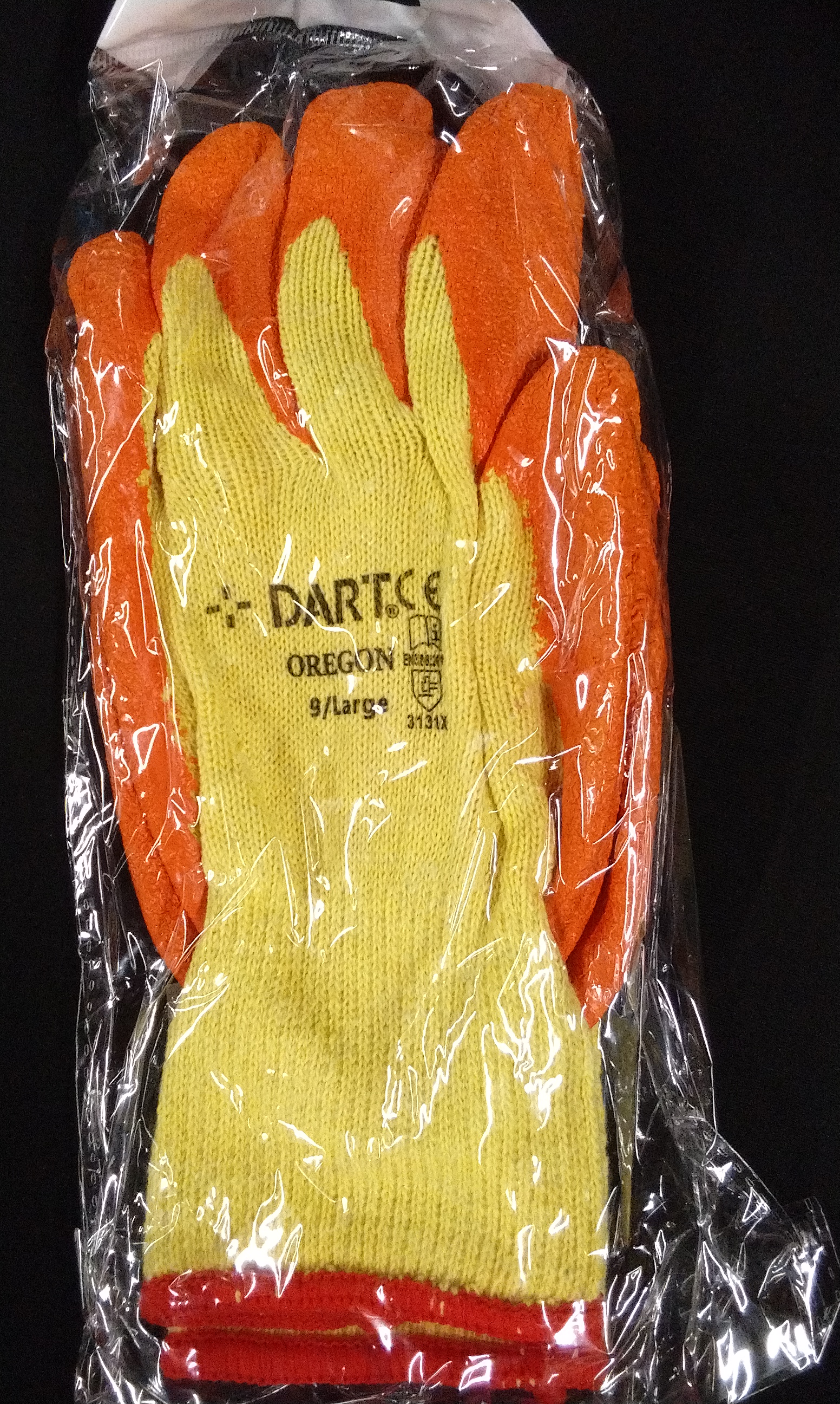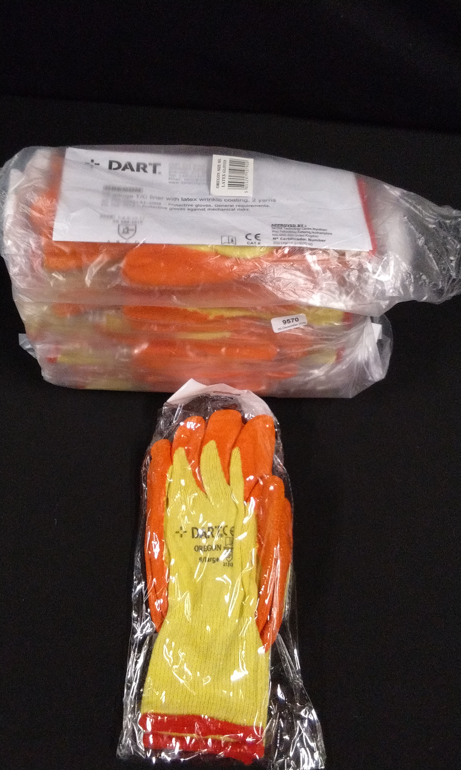 This lot contains a bundle of packaged DART OREGON protective work gloves, size 9/L, featuring a 10 gauge T/C liner with latex wrinkle coating, approved under EN 420 and EN 388 standards.