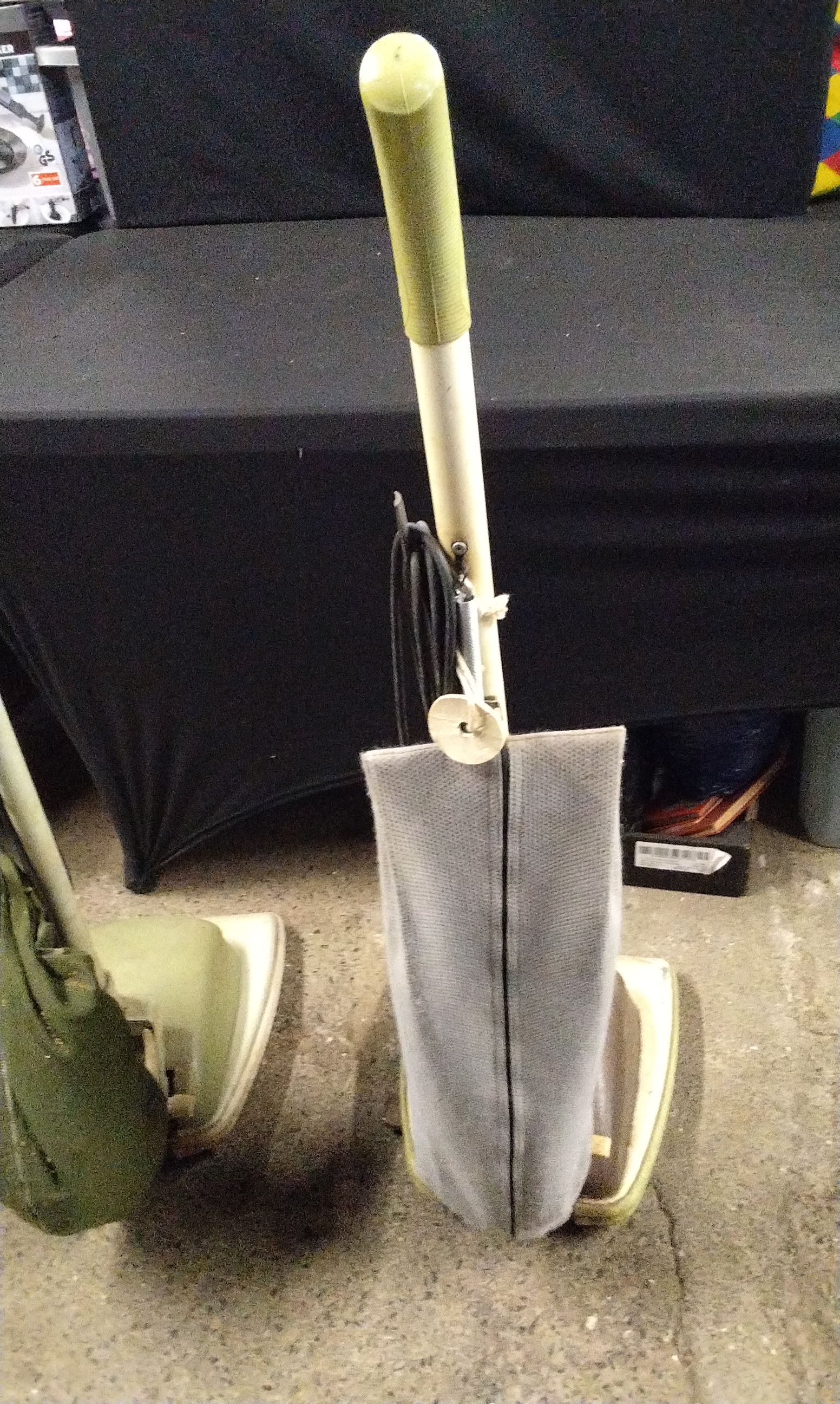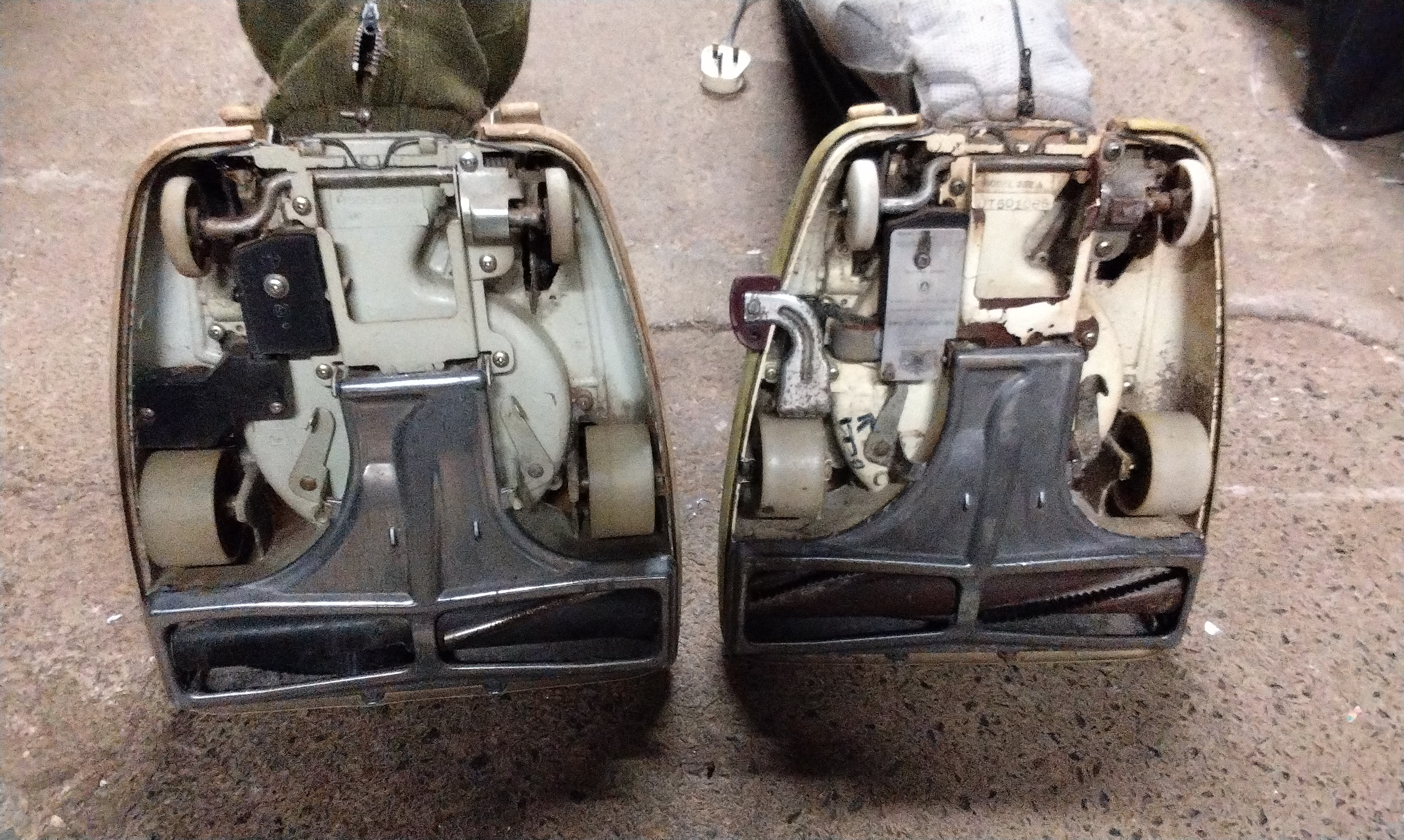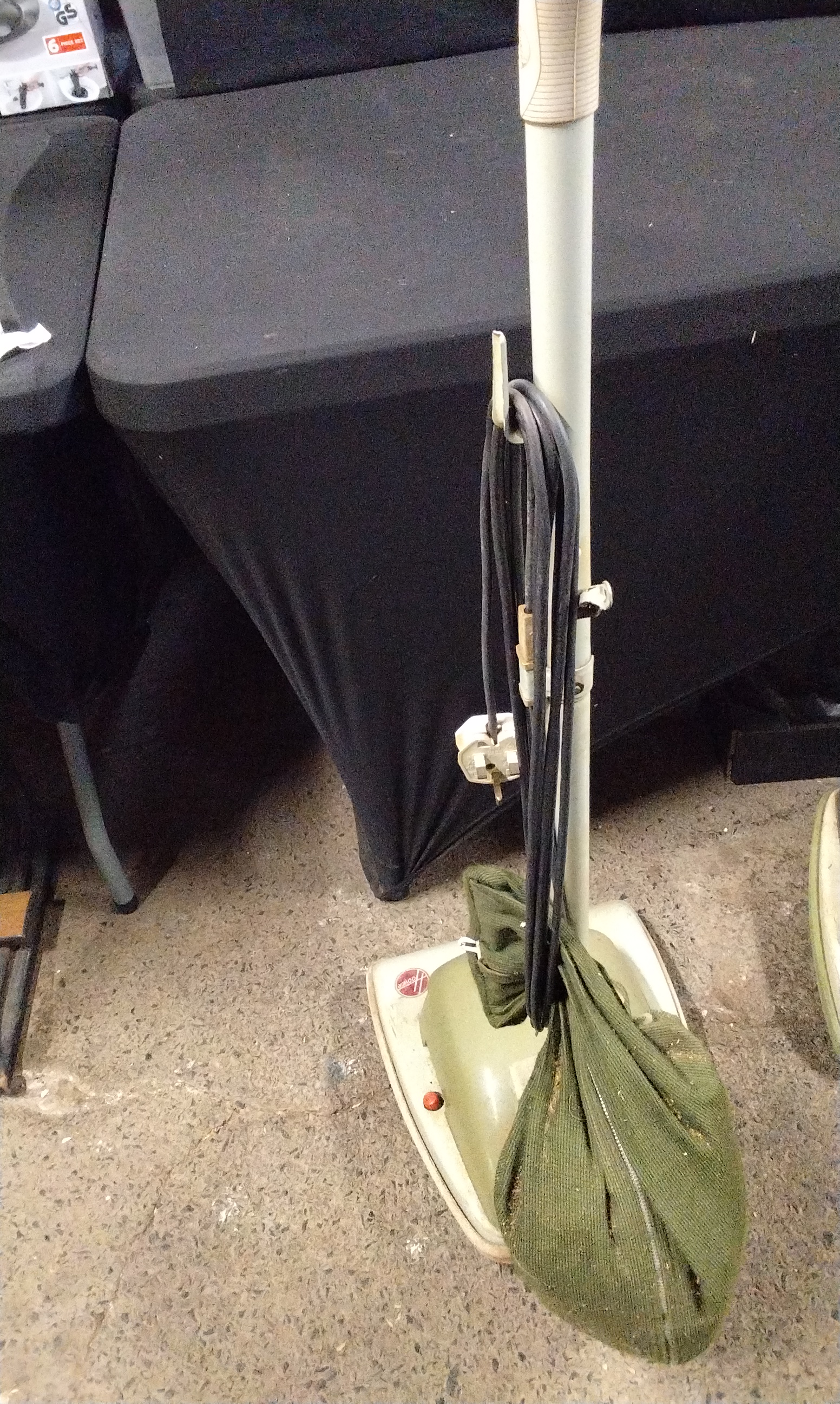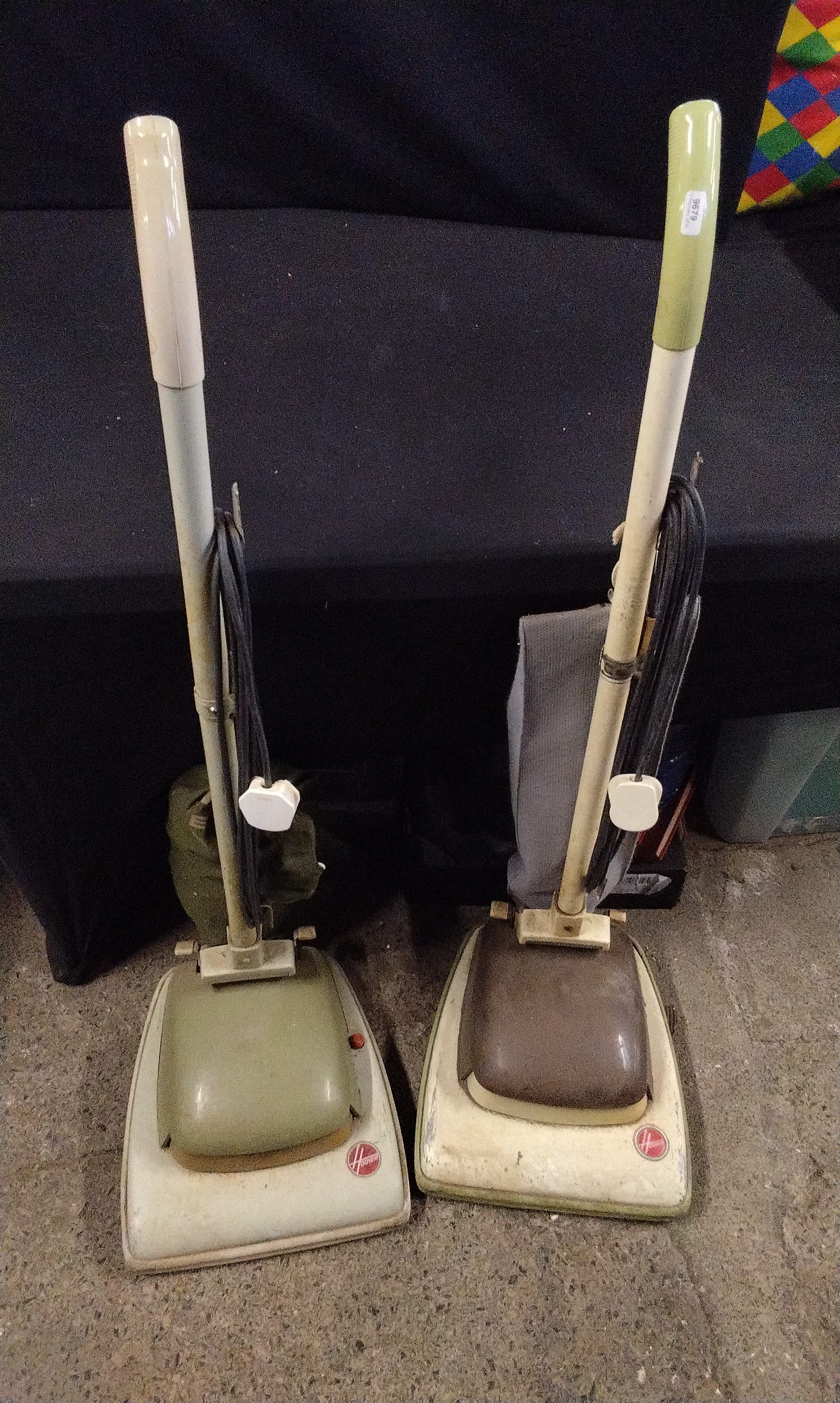 A Pair of vintage Hoover upright vacuum cleaners, colored cream and green, featuring the Hoover logo on the base;