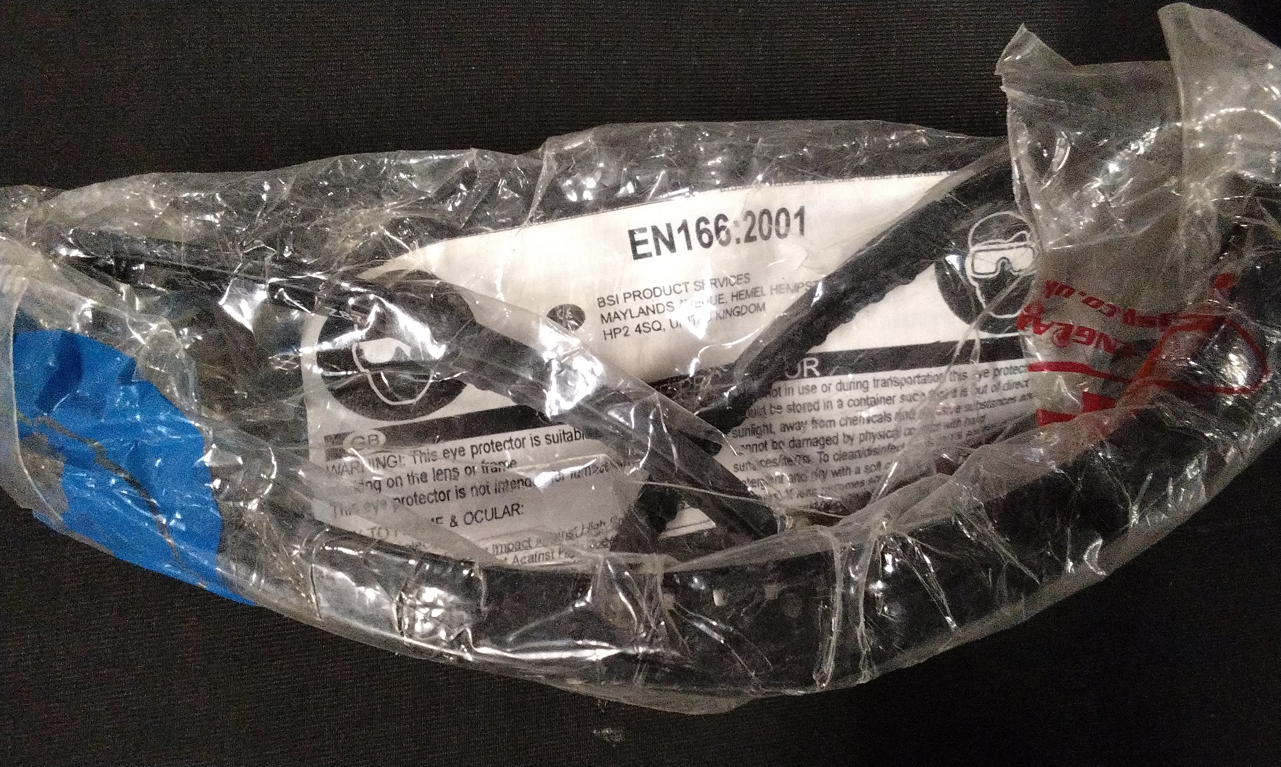 A Collection of 7 pairs of safety glasses featuring clear lenses and black frames, with packaging inserts displaying EN166:2001 and manufacturer details for BSI Product Services in Hemel Hempstead, UK.