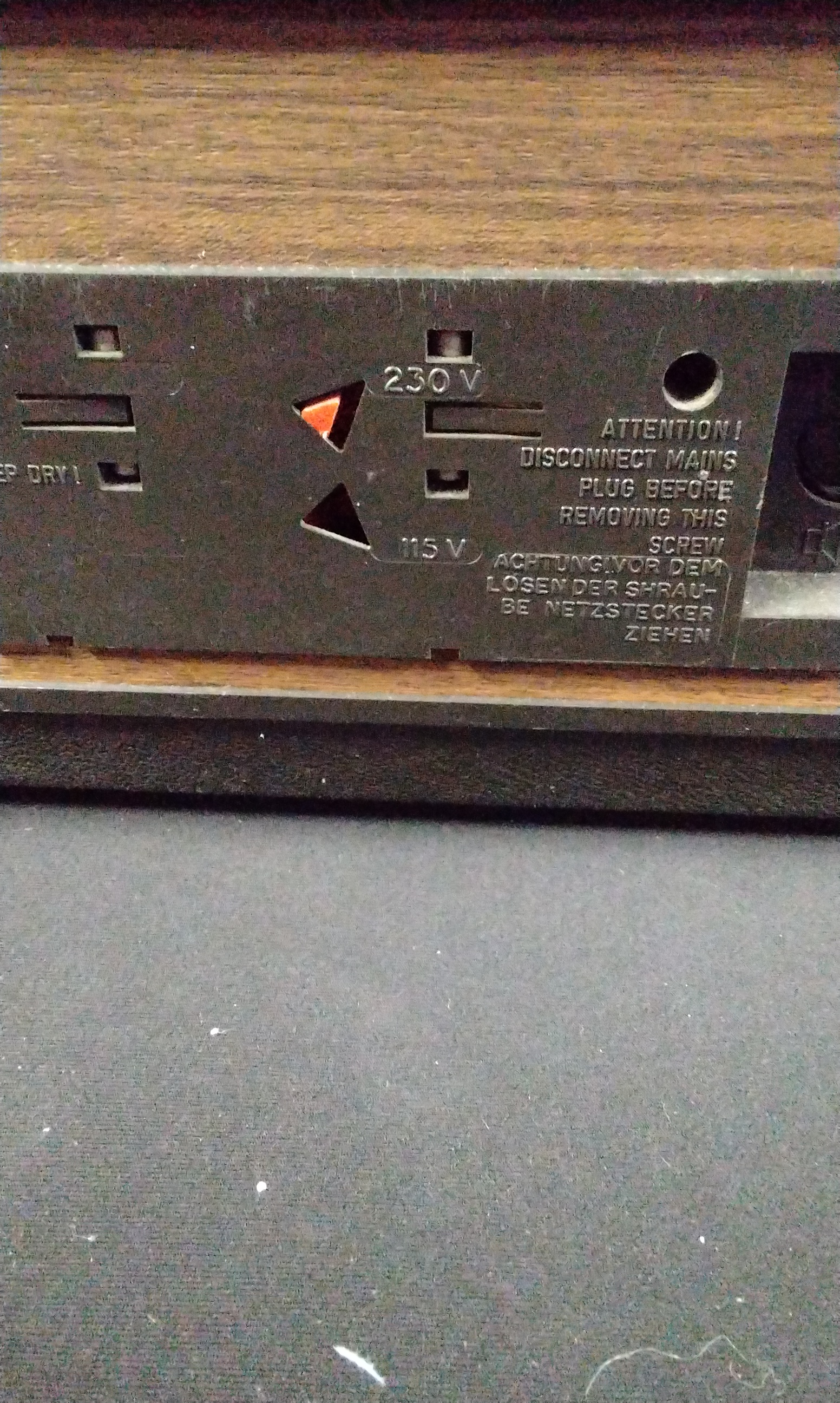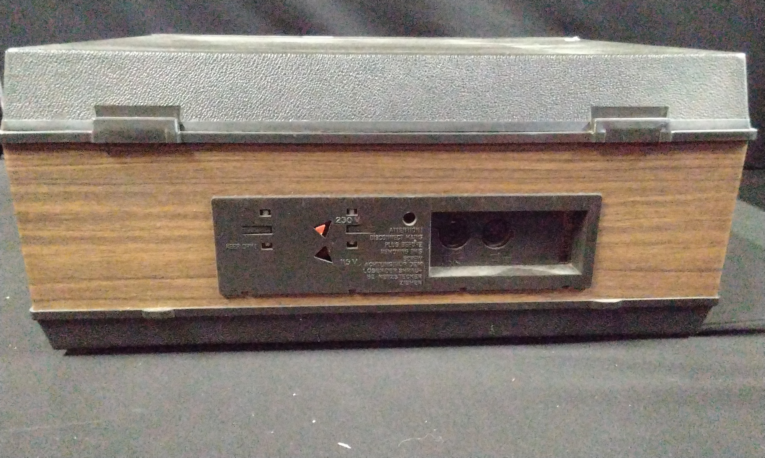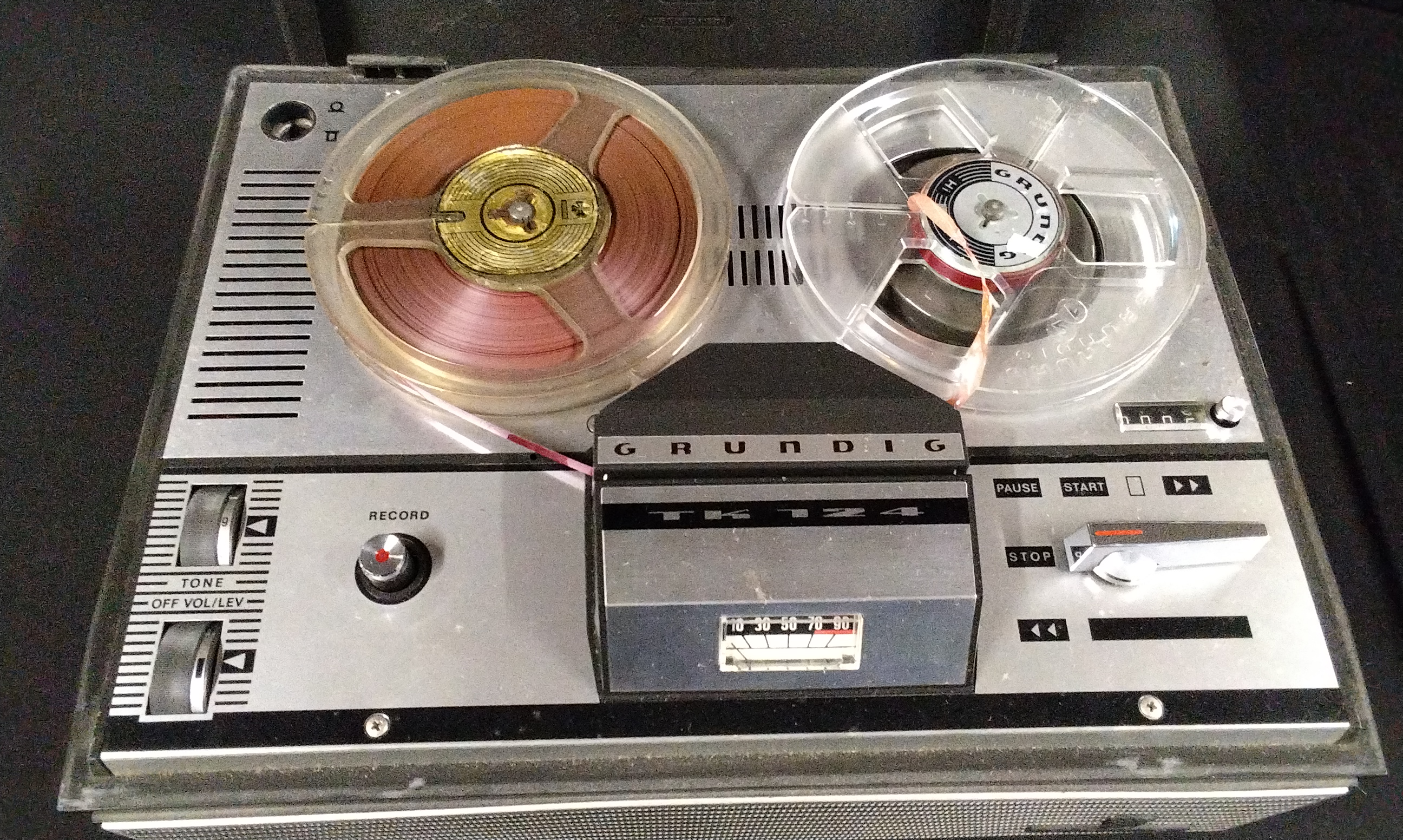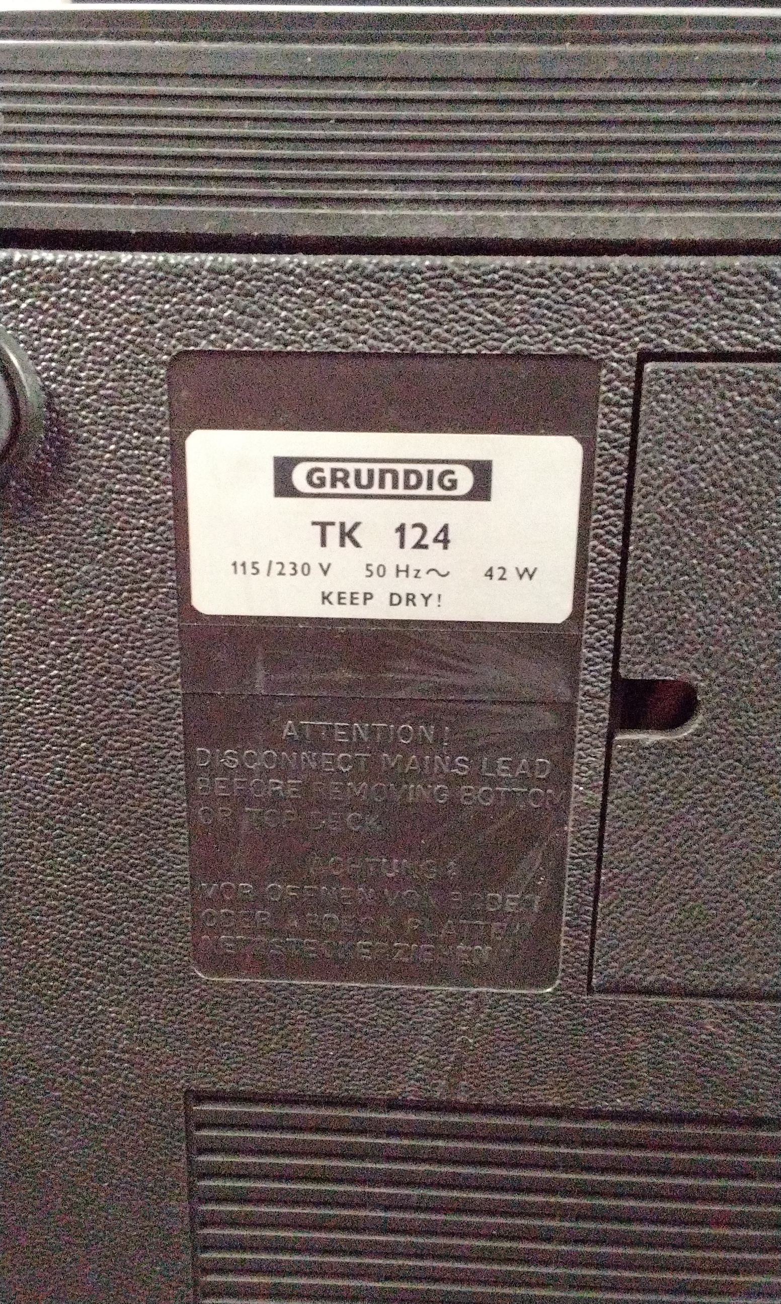 A black and silver/wood-grain Grundig reel-to-reel tape recorder, model TK 124, marked with specifications 115/230 V 50 Hz~ 42 W.No power supply