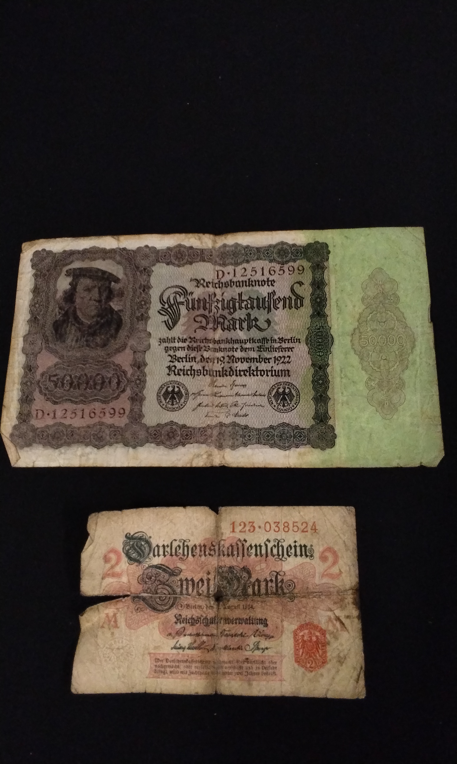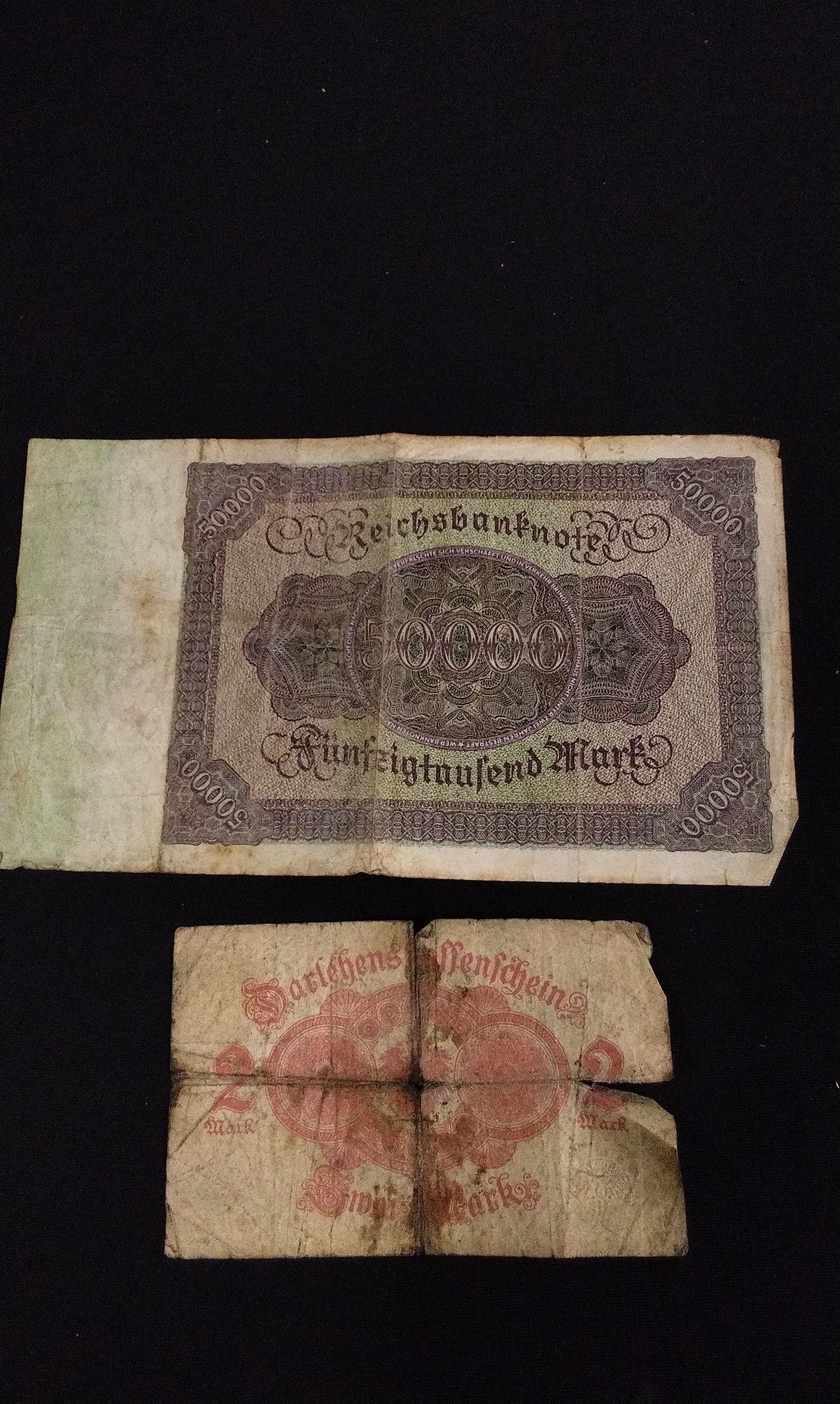A Pair of aged German paper currency notes, including a large green and purple 50,000 Mark Reichsbanknote dated November 19, 1922, and a smaller, heavily damaged red and brown 2 Mark Darlehenskassenschein
