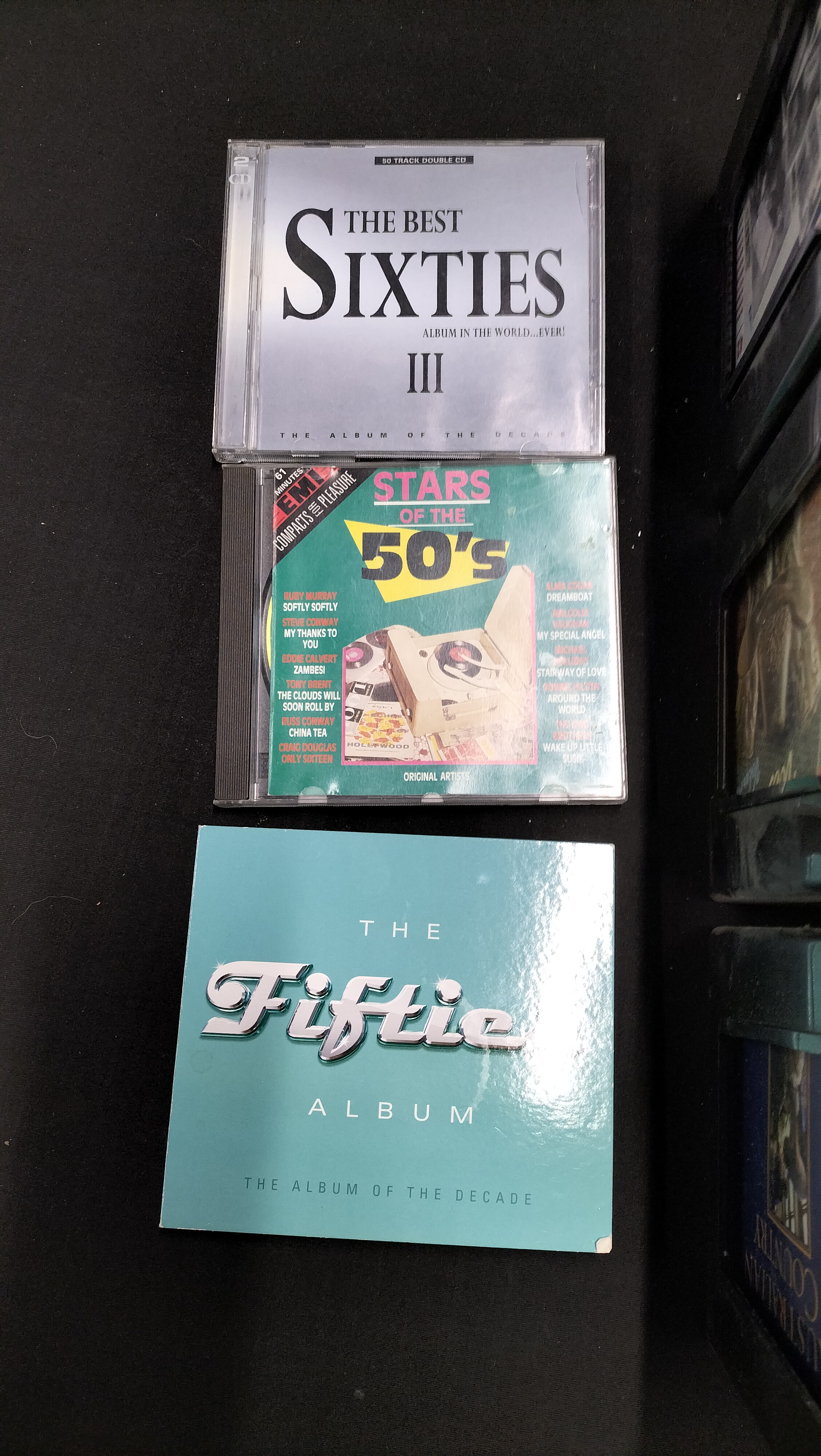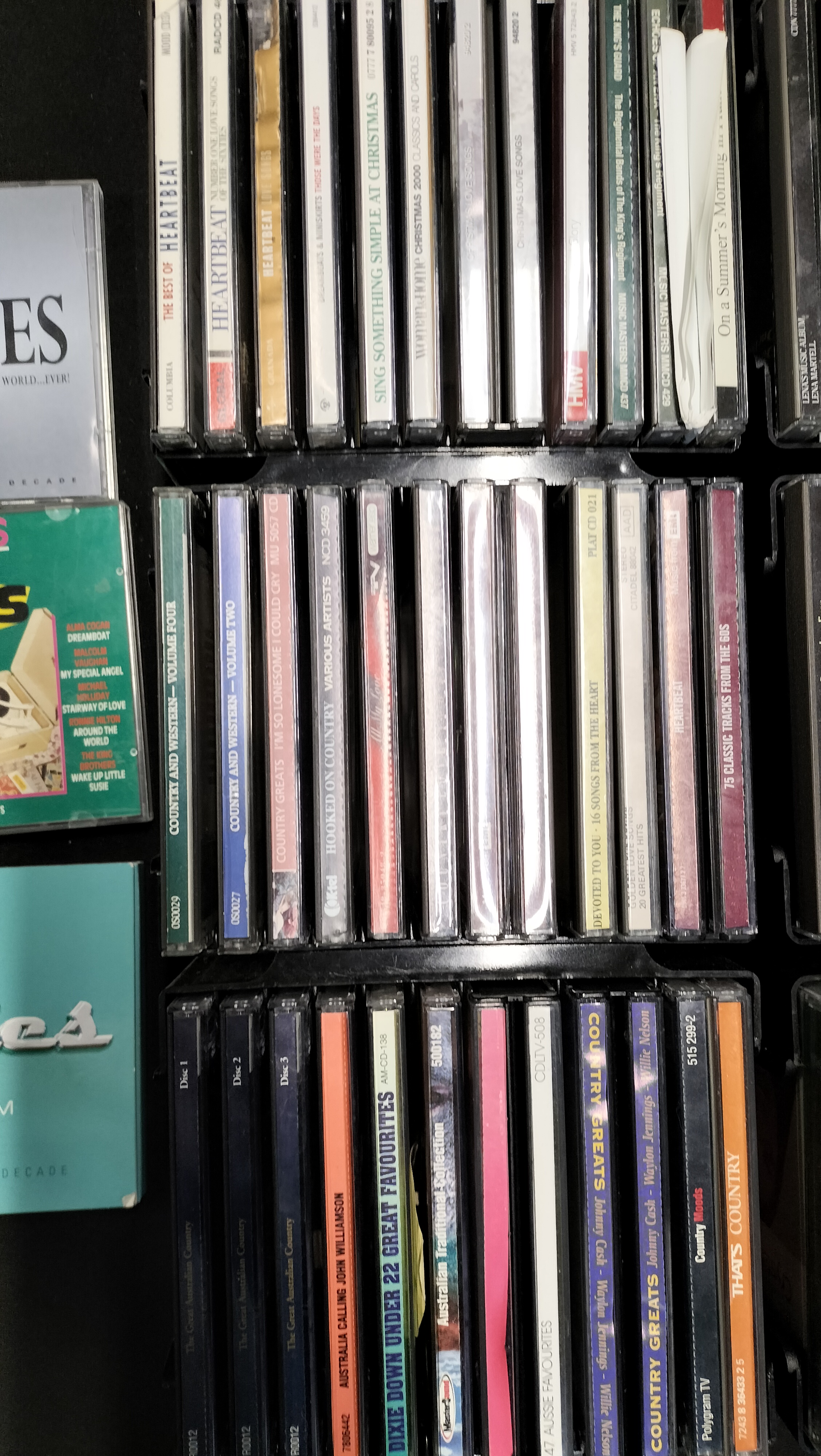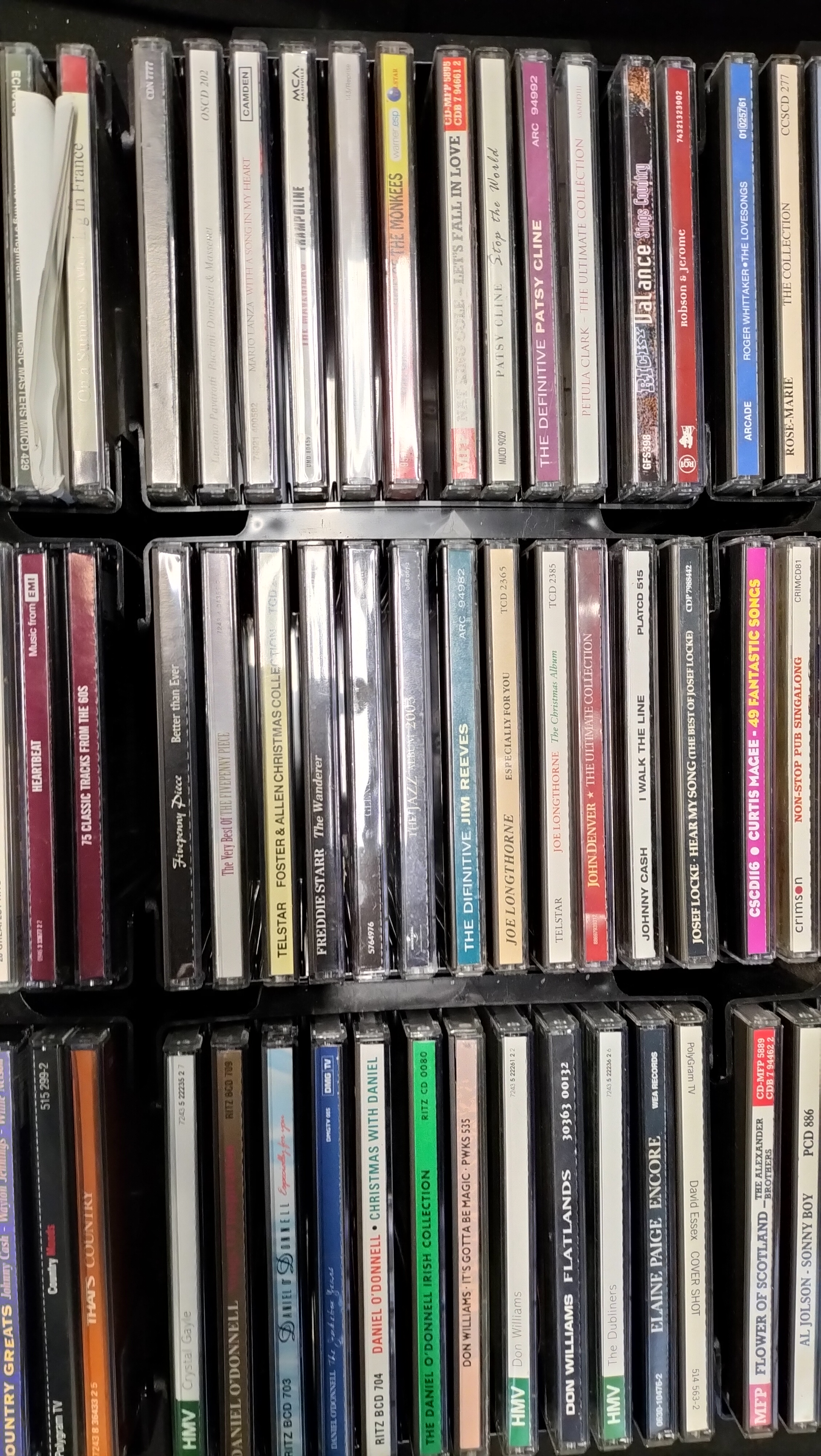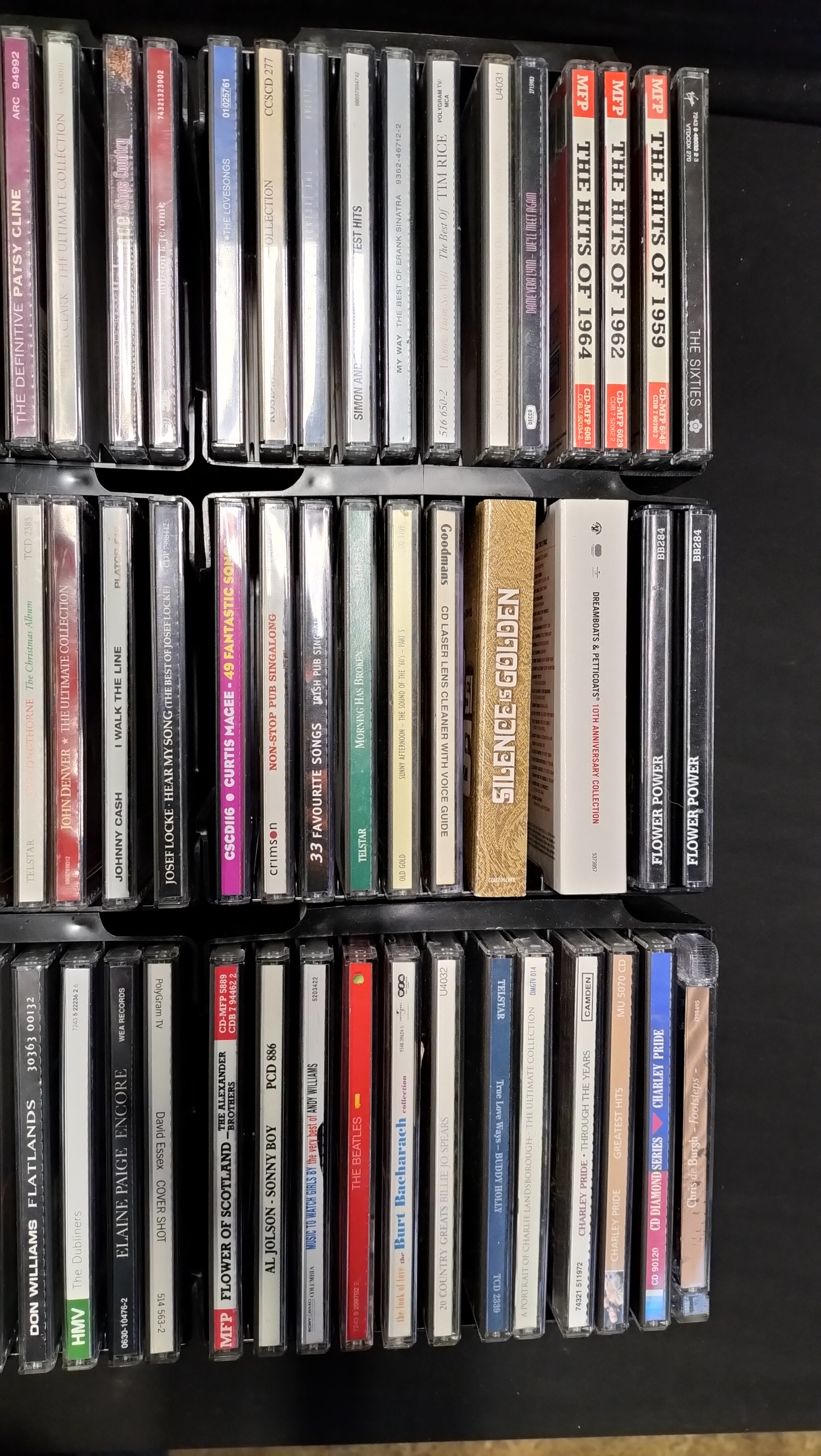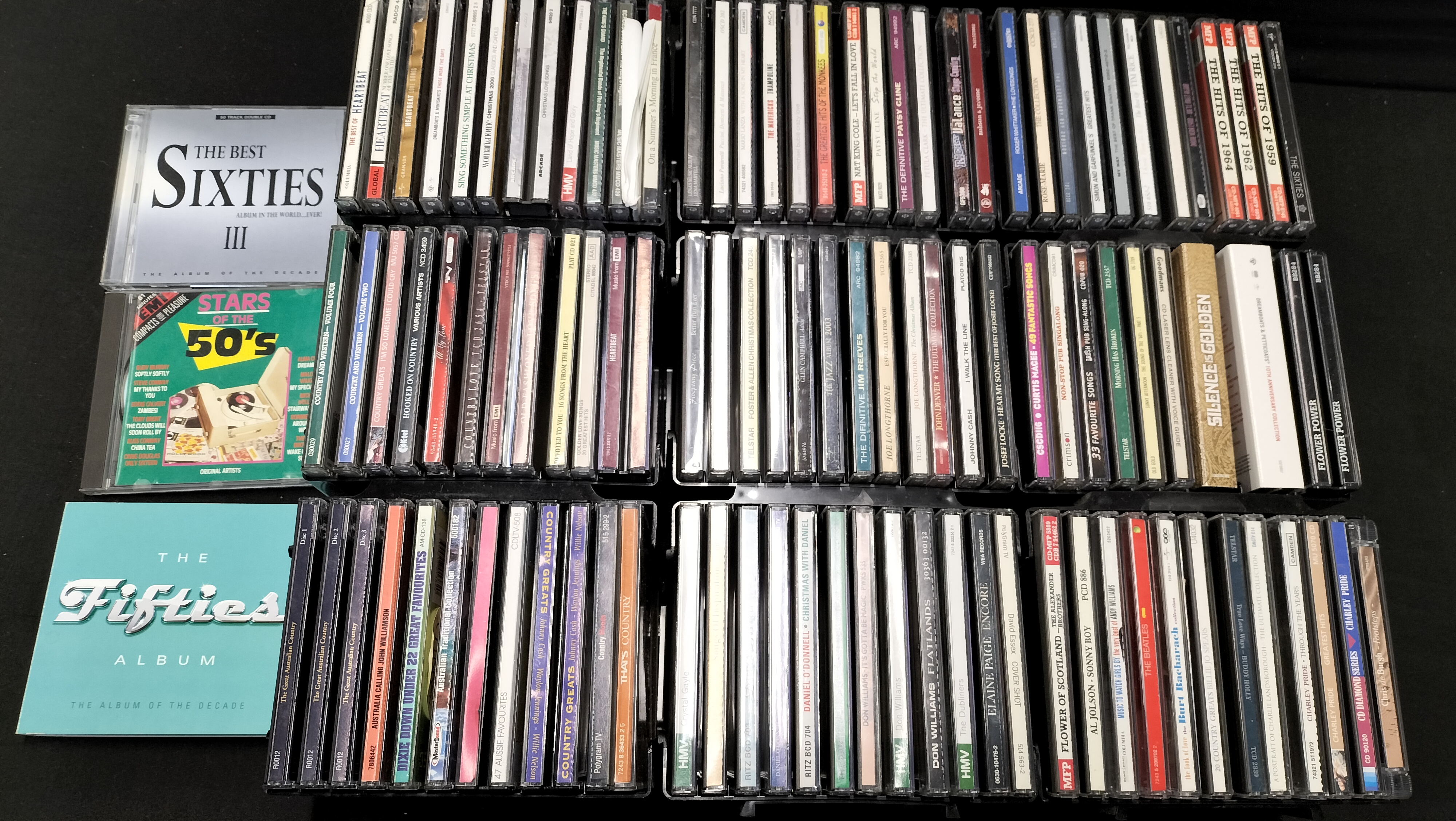 A collection of 100 music CDs in jewel cases and sleeves featuring various artists and compilations including The Beatles, Johnny Cash, and The Fifties Album.