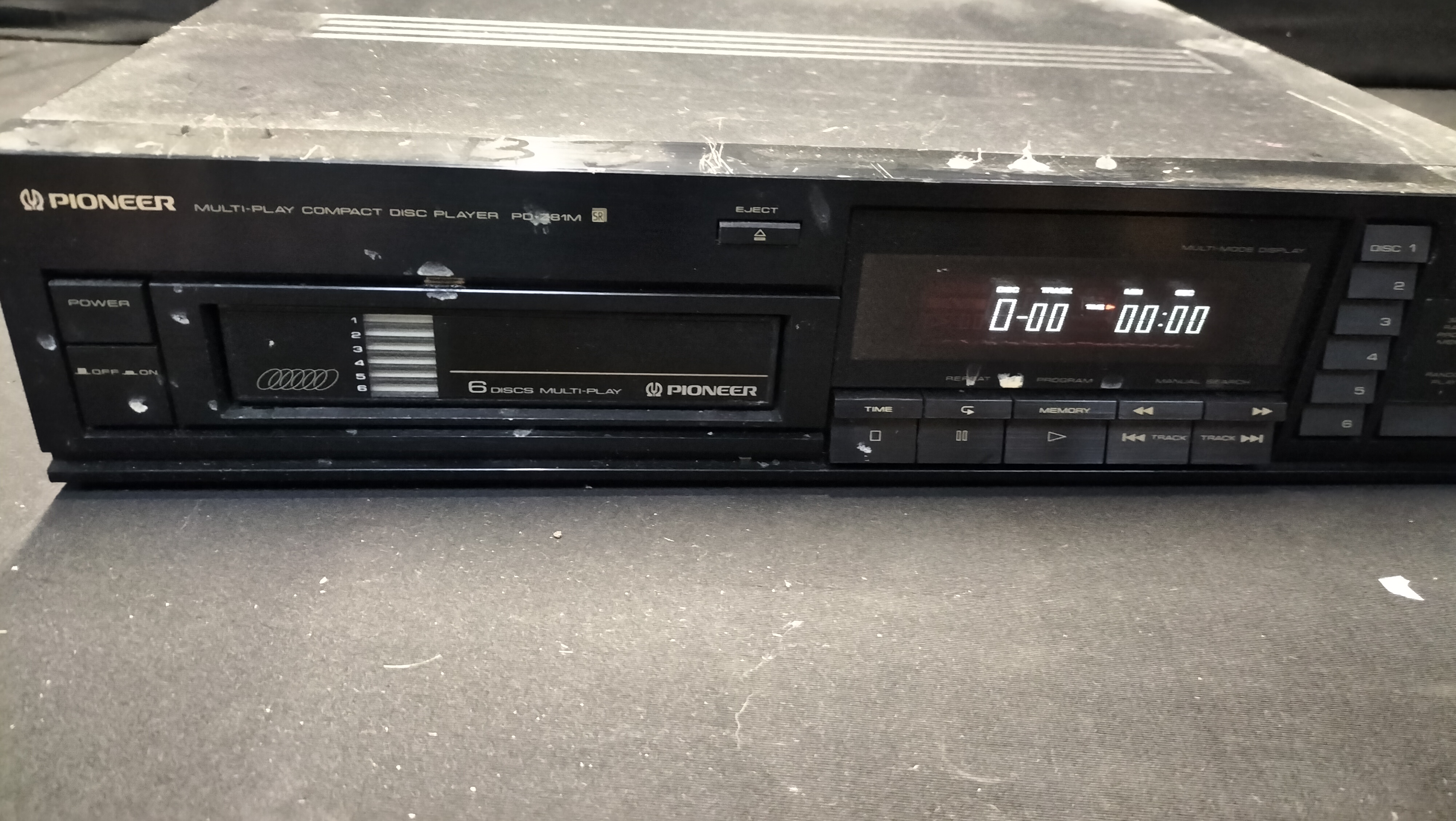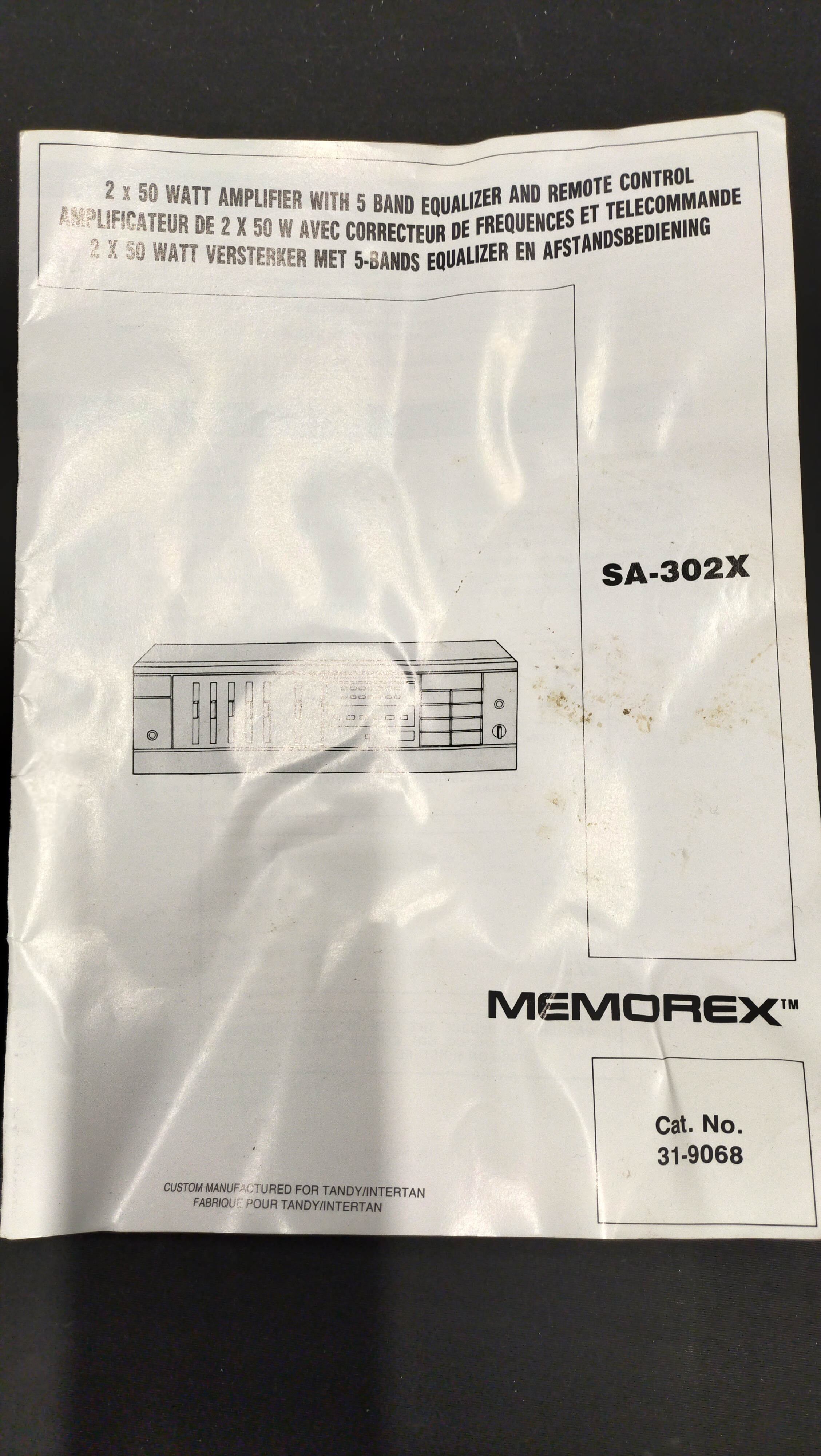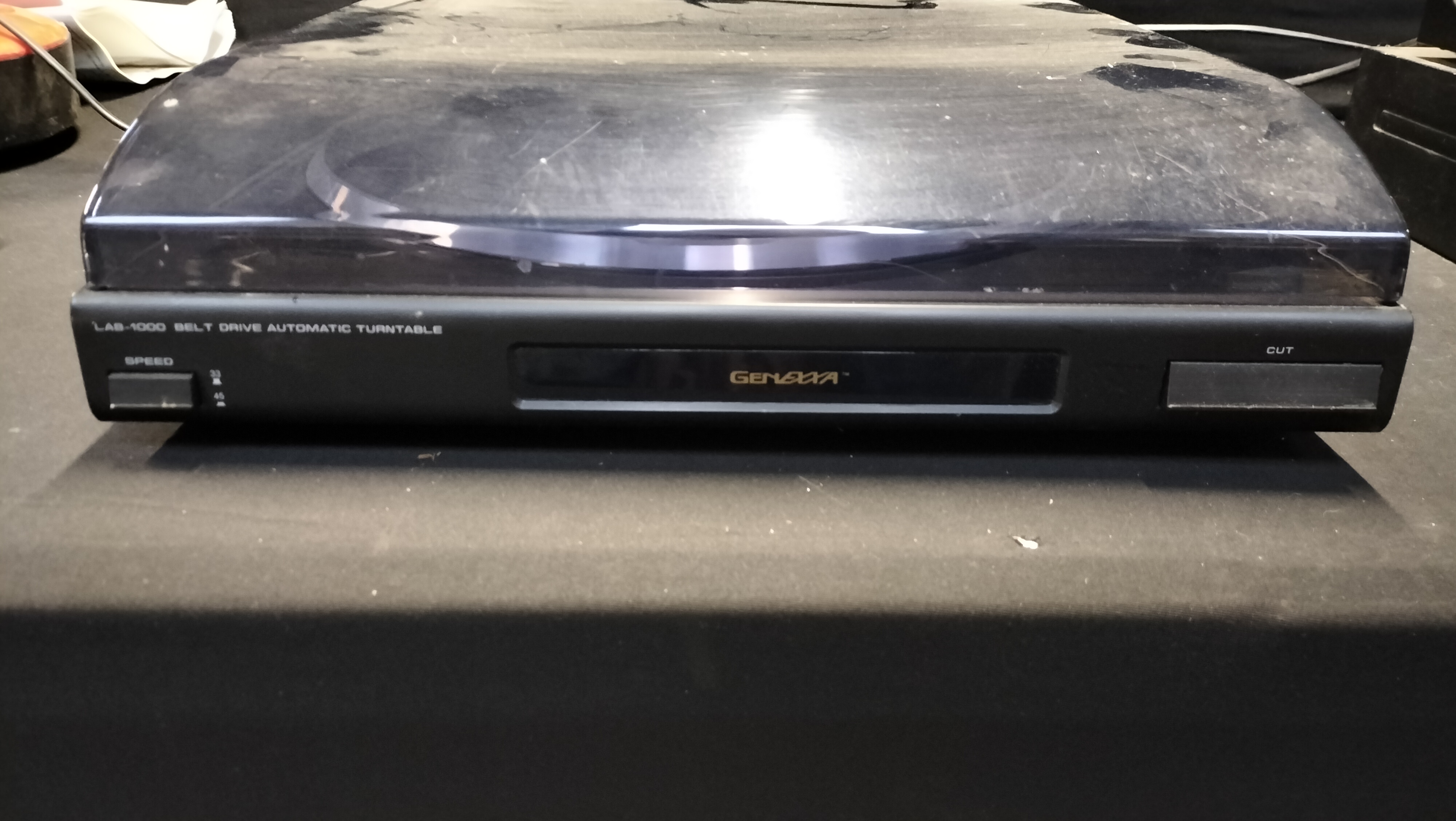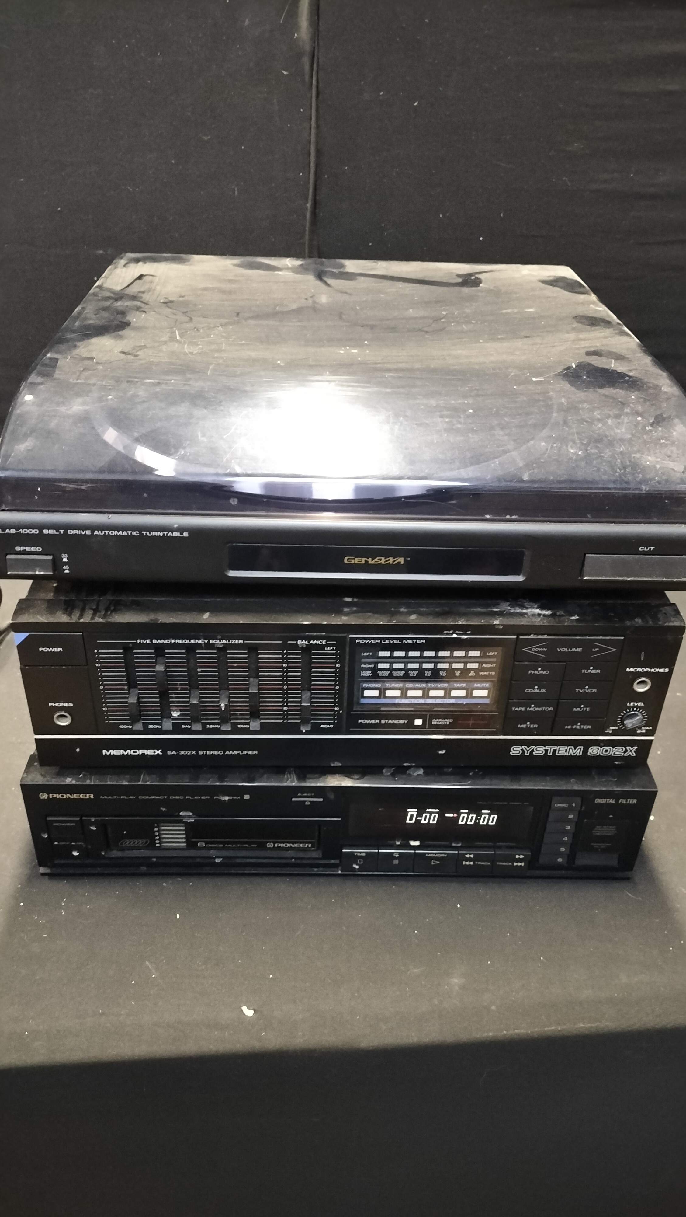 A trio of black stereo components comprising a Genexxa LAB-1000 turntable, a Memorex SA-302X amplifier with remote and manual, and a Pioneer PD-Z81M multi-play CD player with manual and magazine.