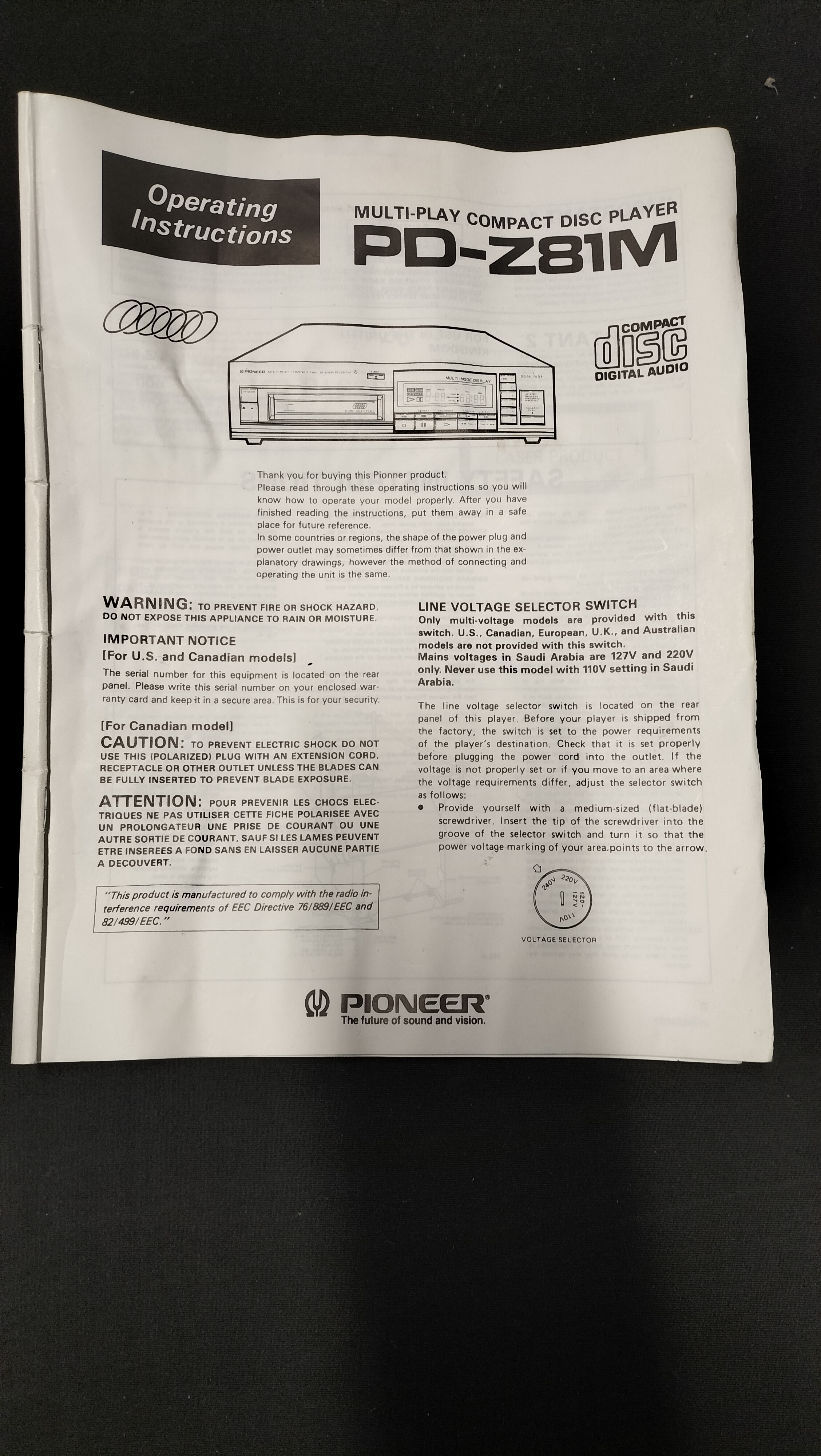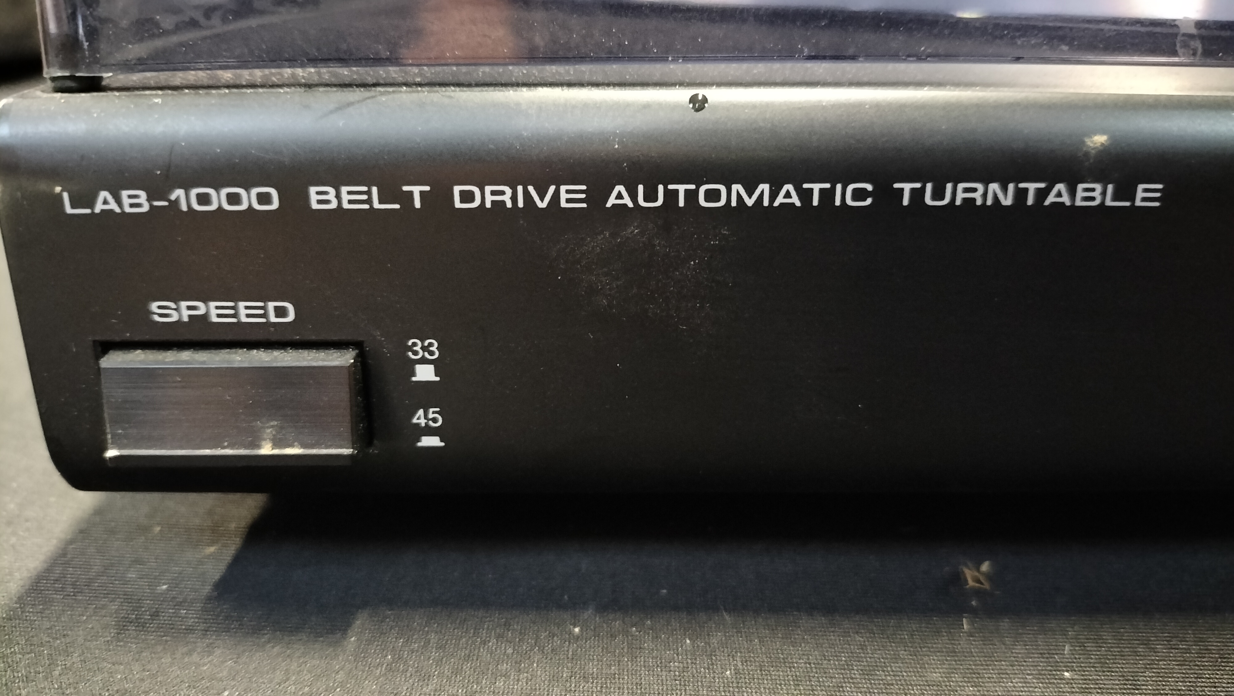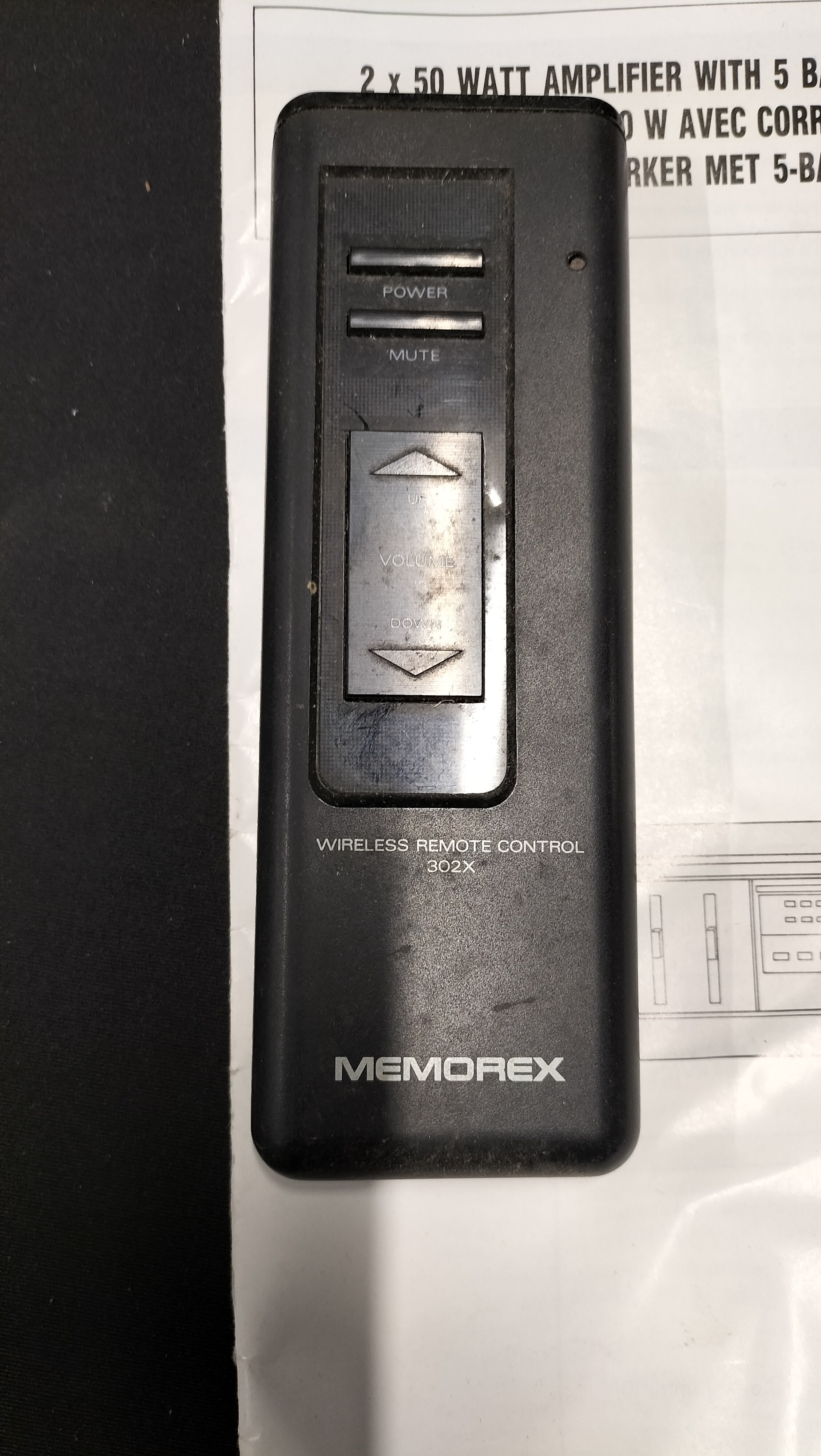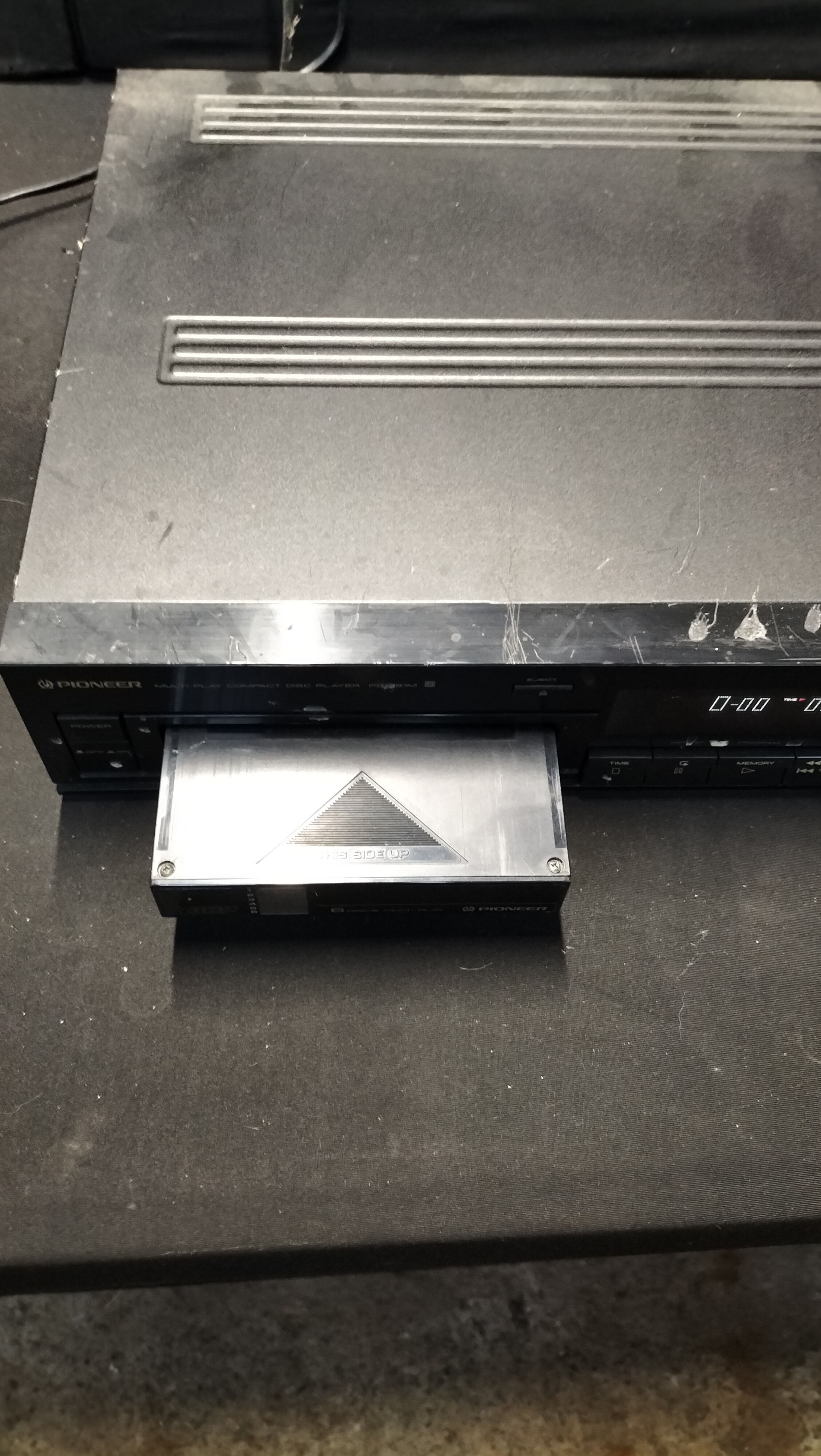 A trio of black stereo components comprising a Genexxa LAB-1000 turntable, a Memorex SA-302X amplifier with remote and manual, and a Pioneer PD-Z81M multi-play CD player with manual and magazine.