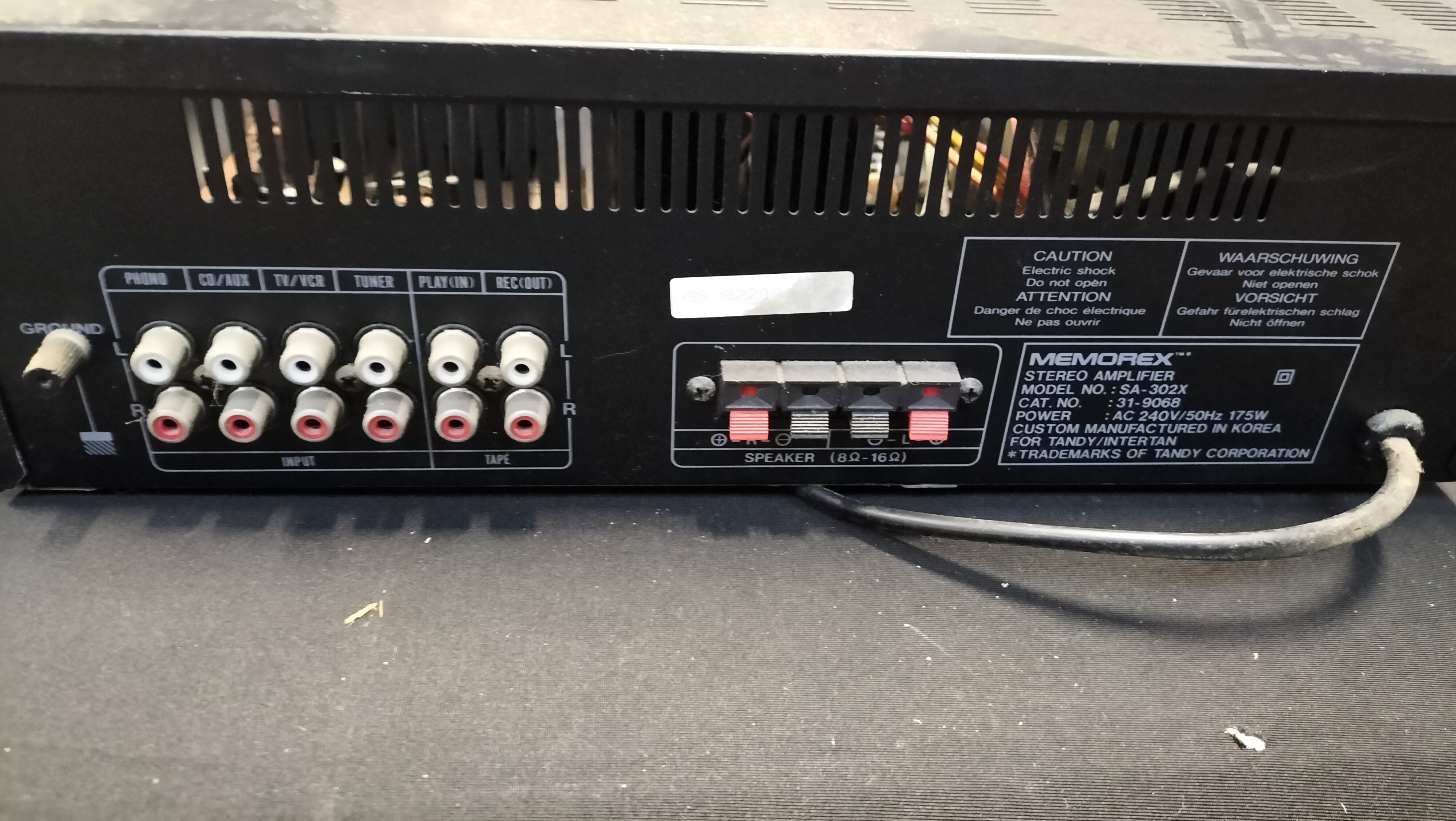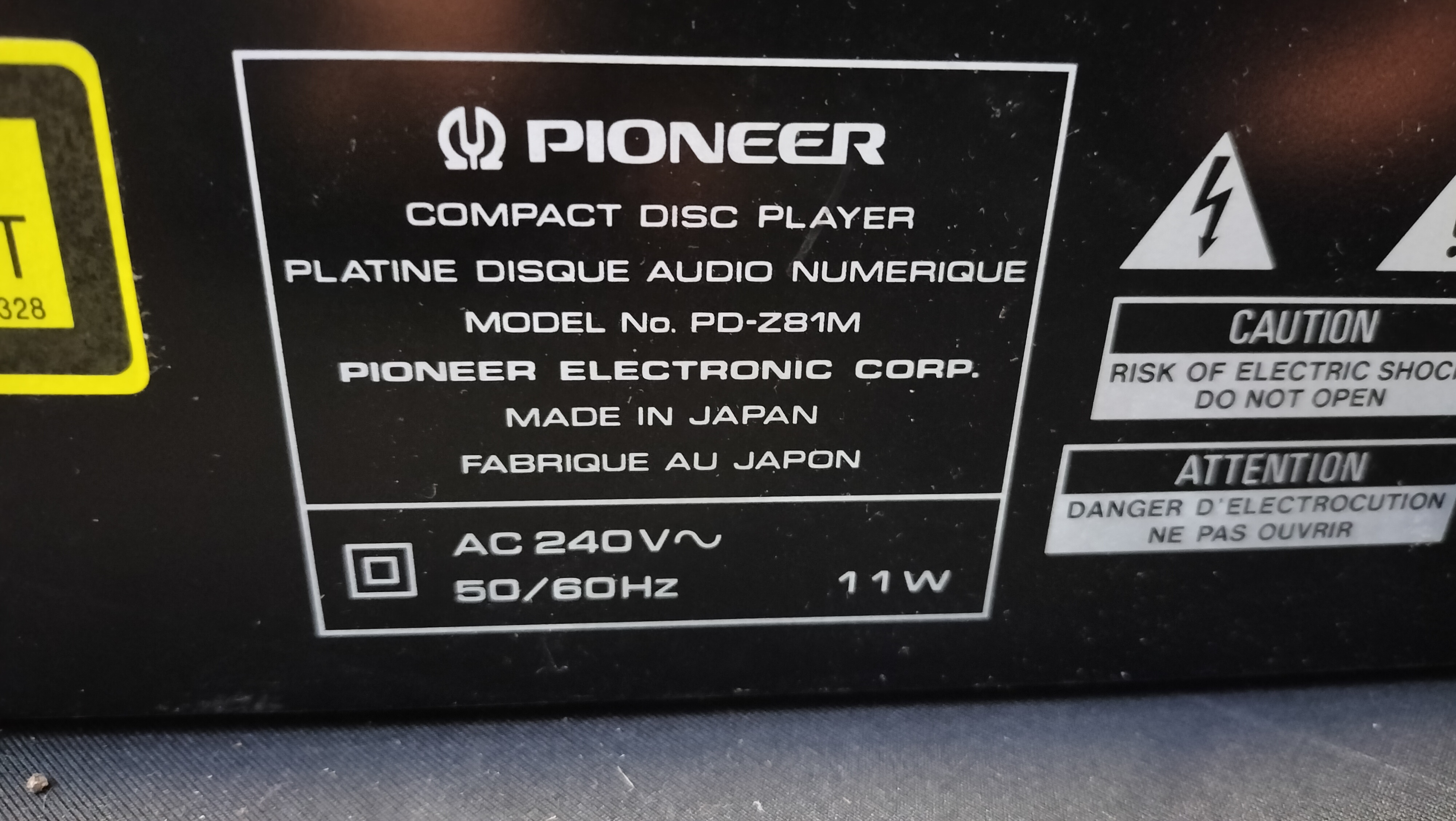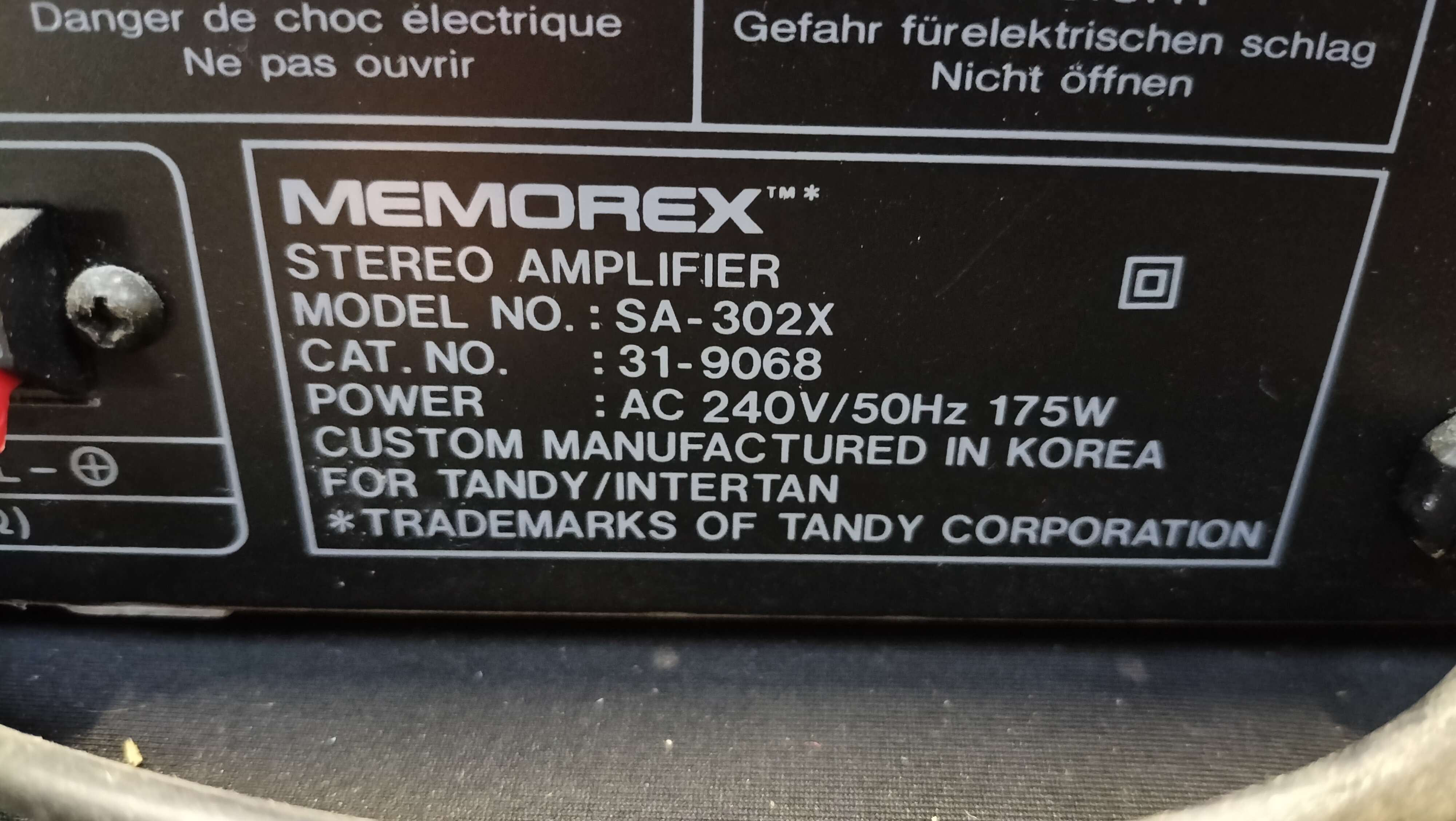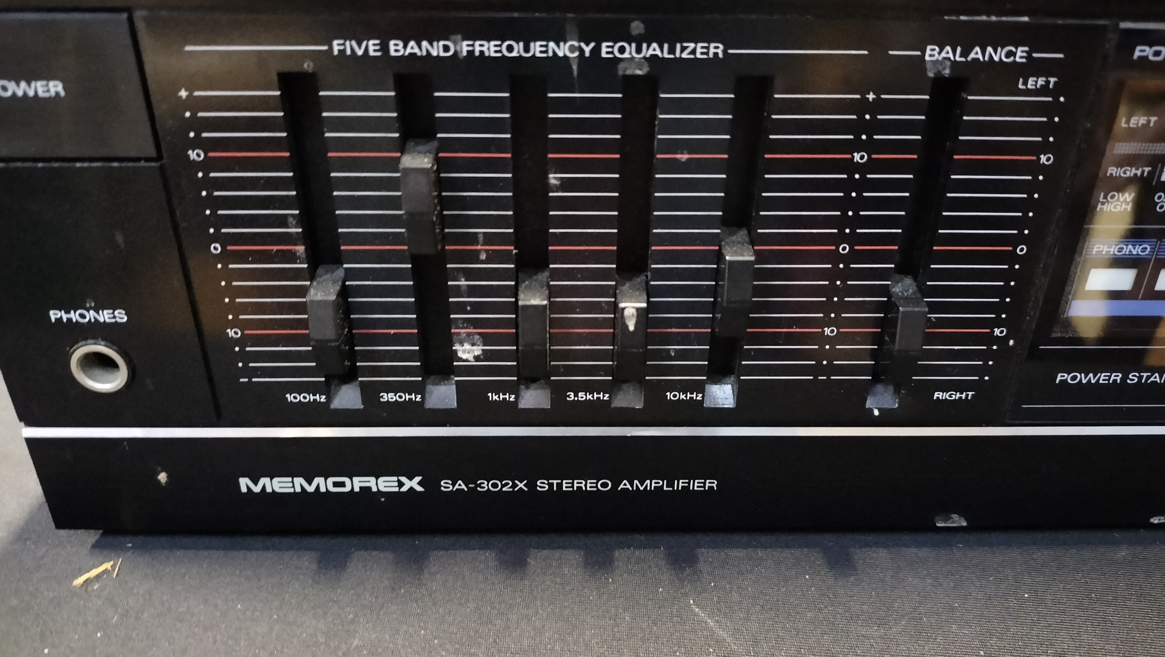 A trio of black stereo components comprising a Genexxa LAB-1000 turntable, a Memorex SA-302X amplifier with remote and manual, and a Pioneer PD-Z81M multi-play CD player with manual and magazine.