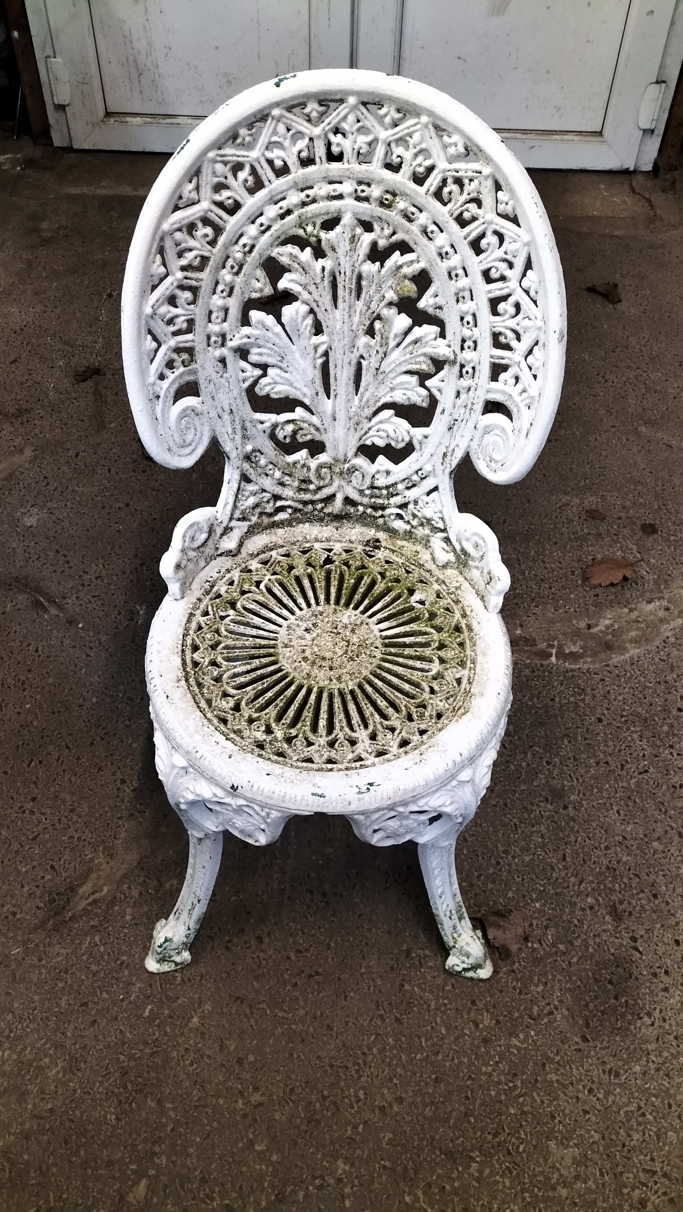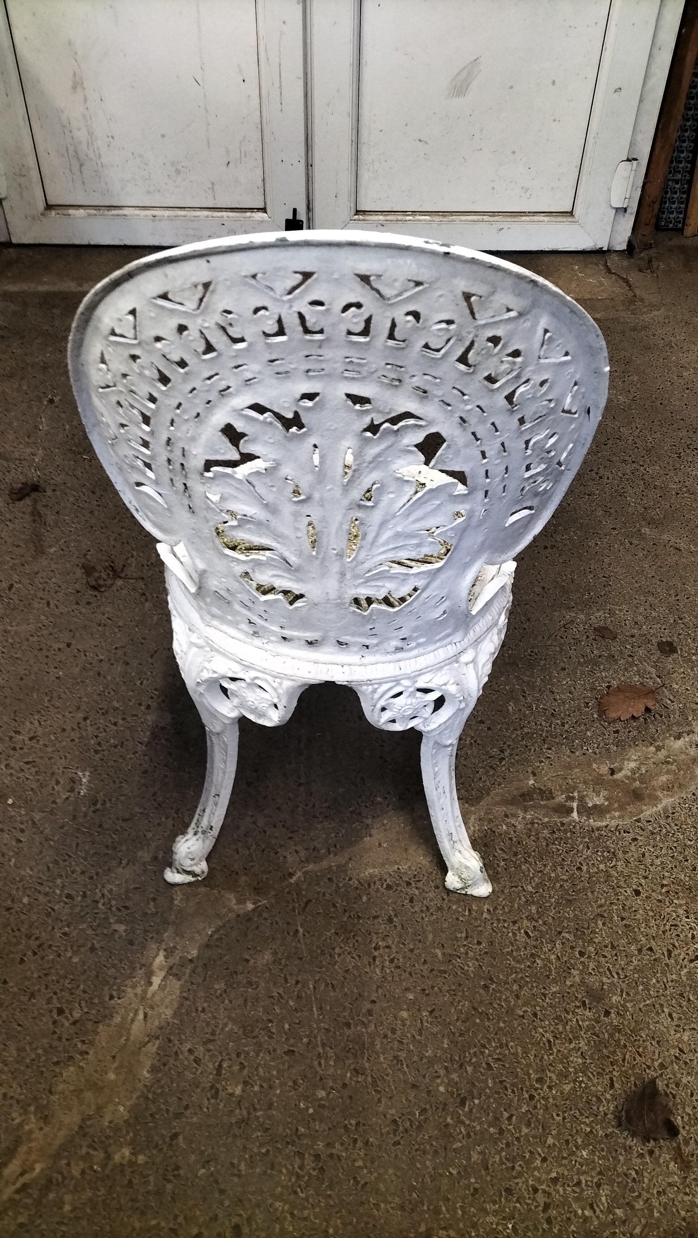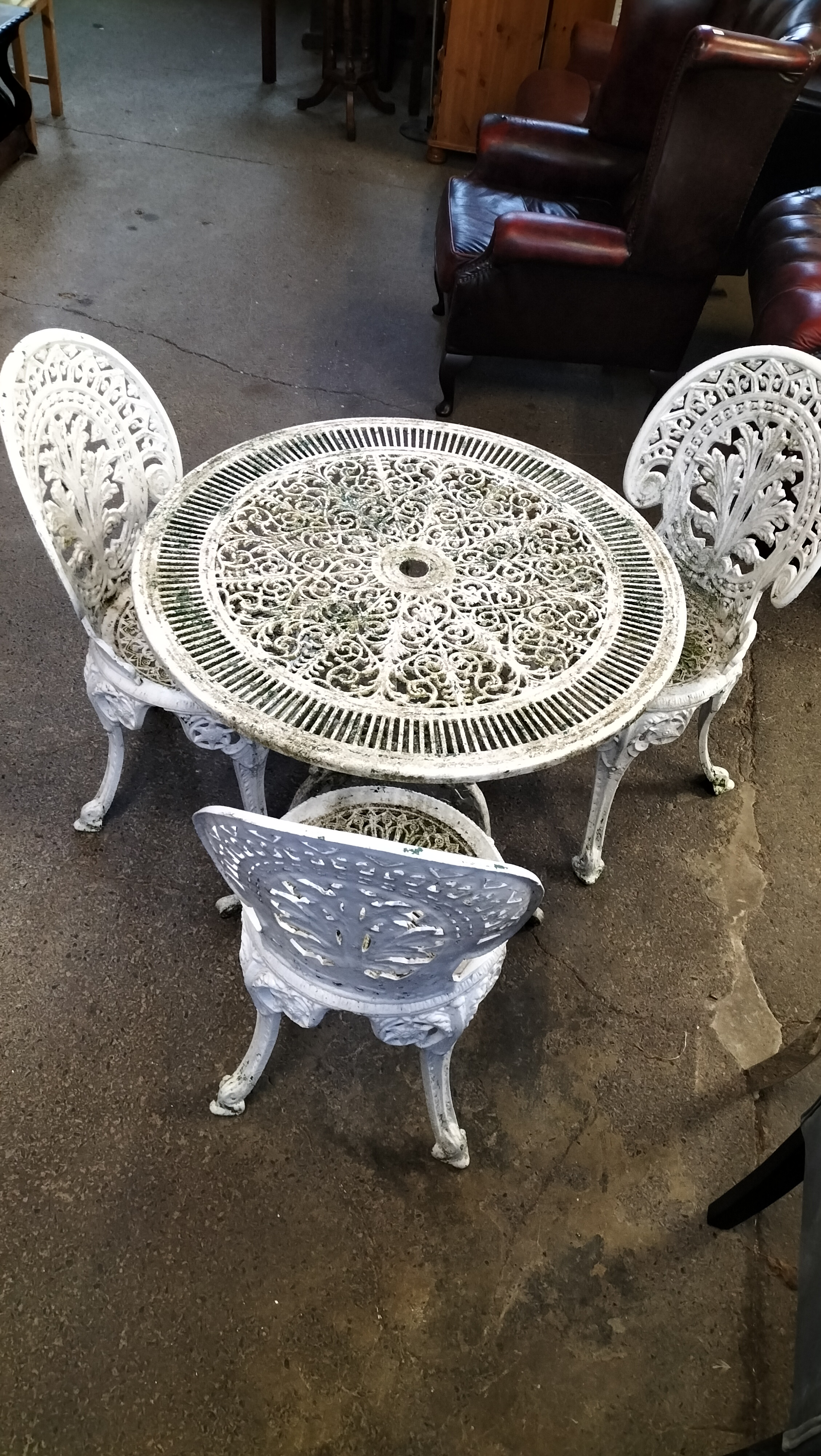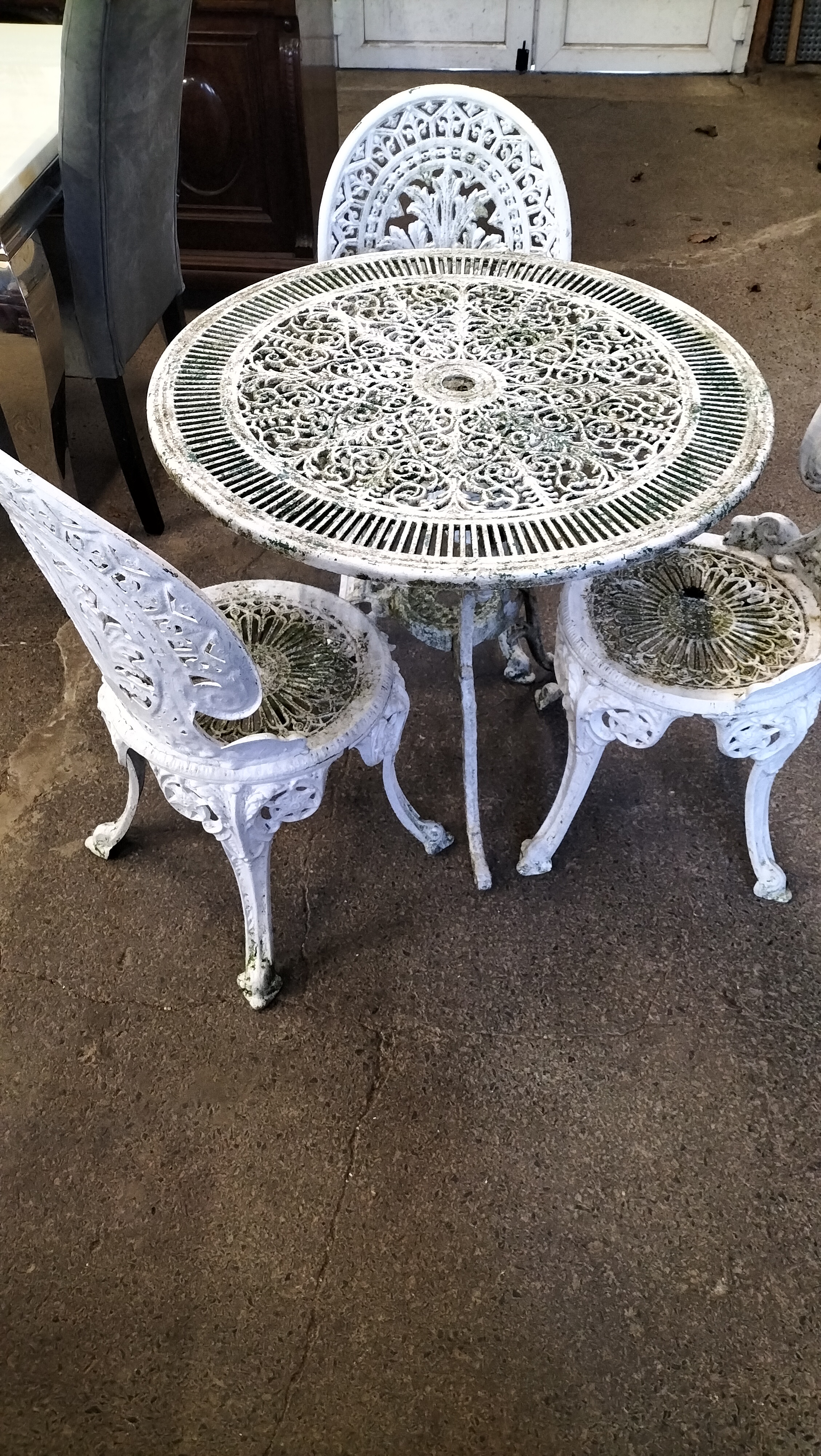 A collection of white ornate cast metal garden furniture including a round table and three matching chairs showing a weathered finish.