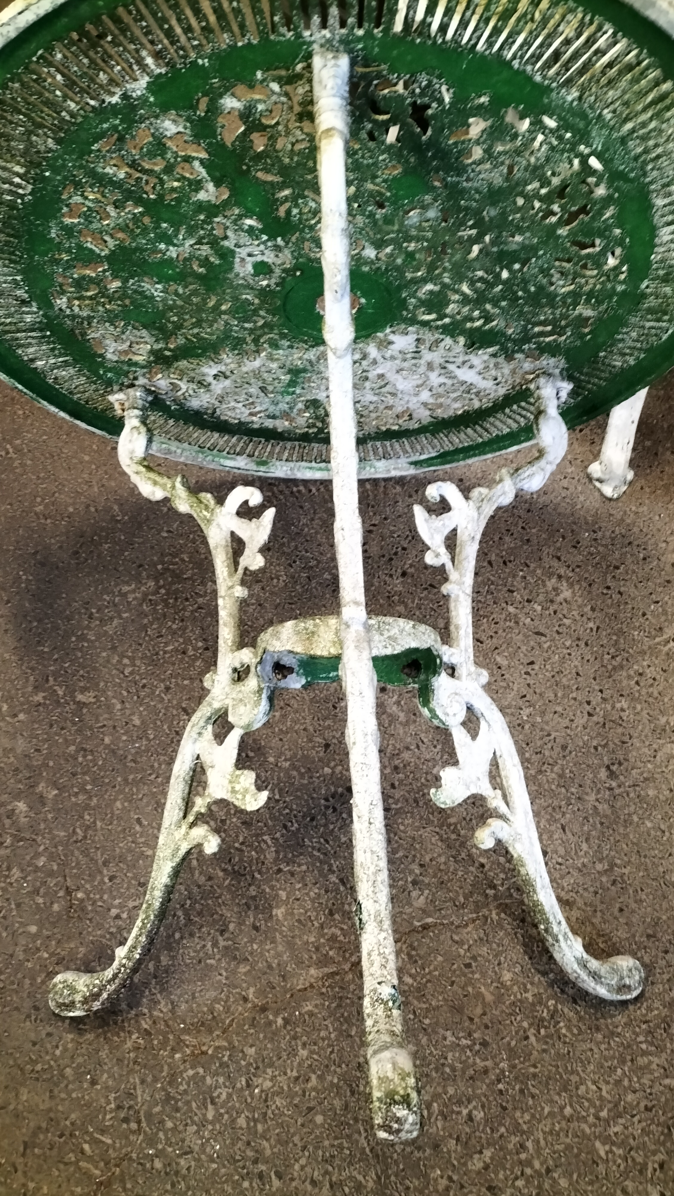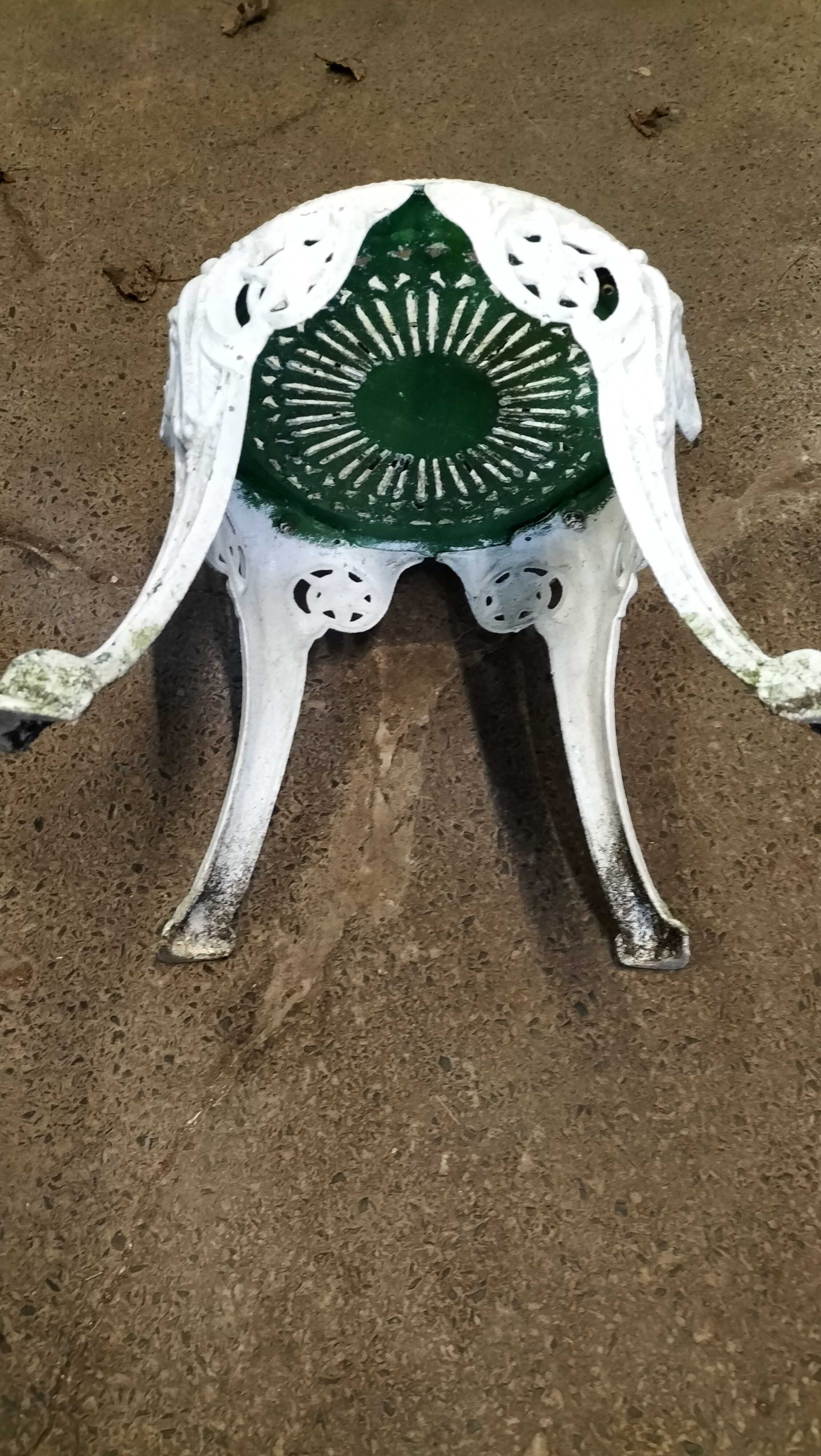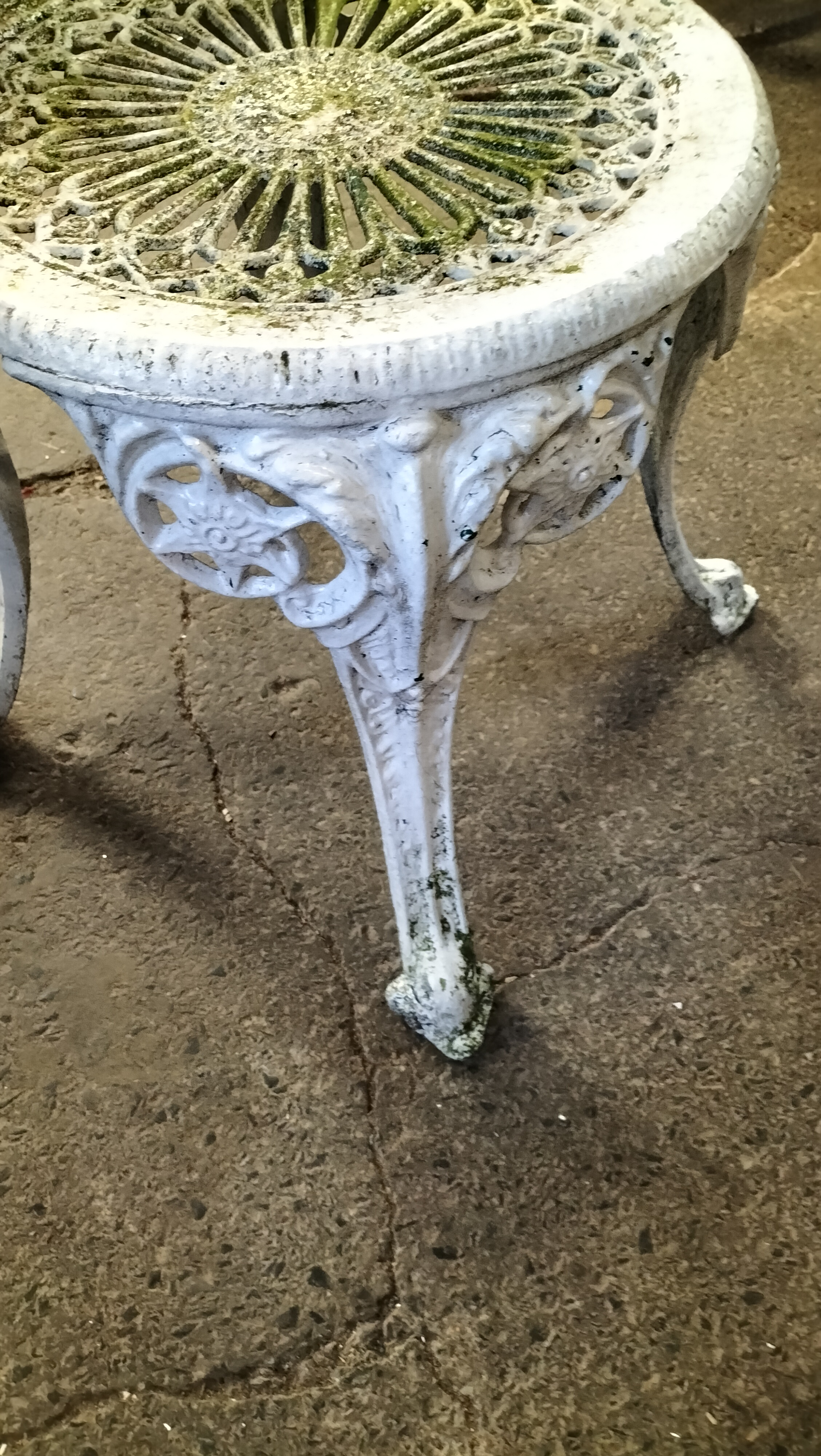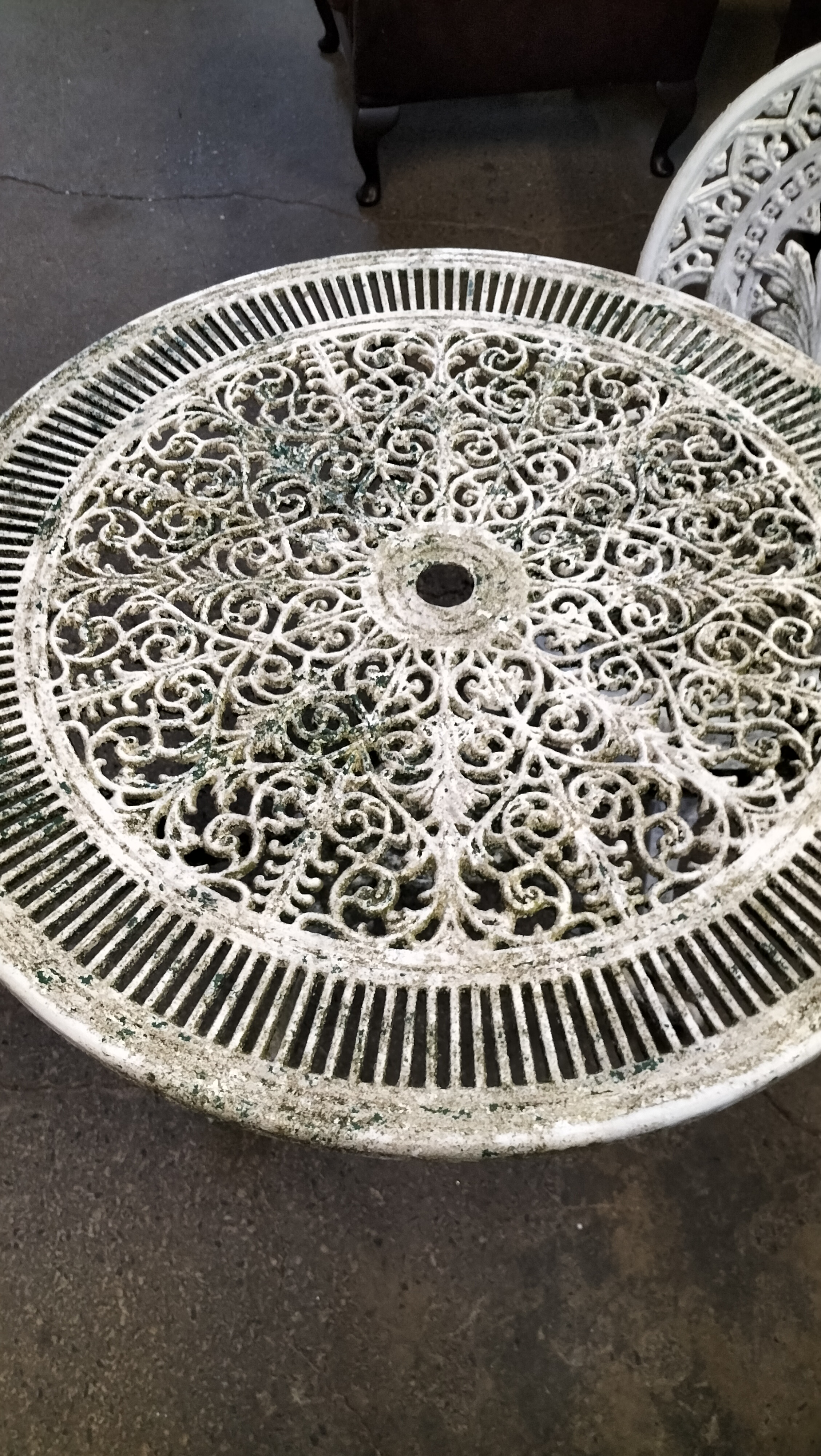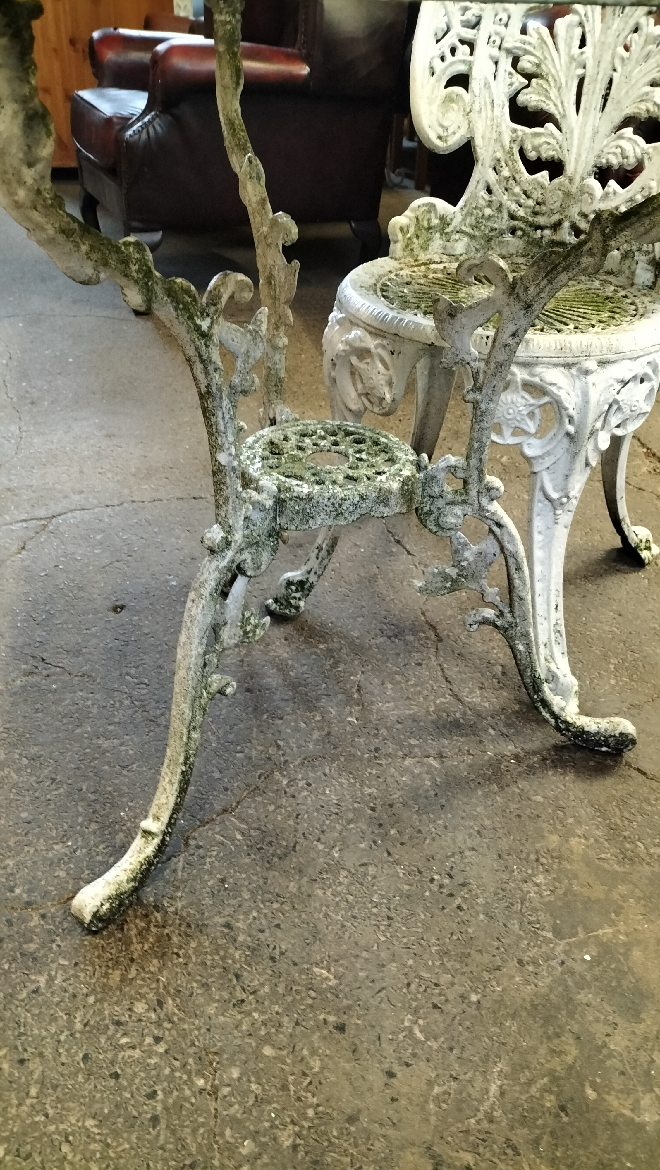A collection of white ornate cast metal garden furniture including a round table and three matching chairs showing a weathered finish.