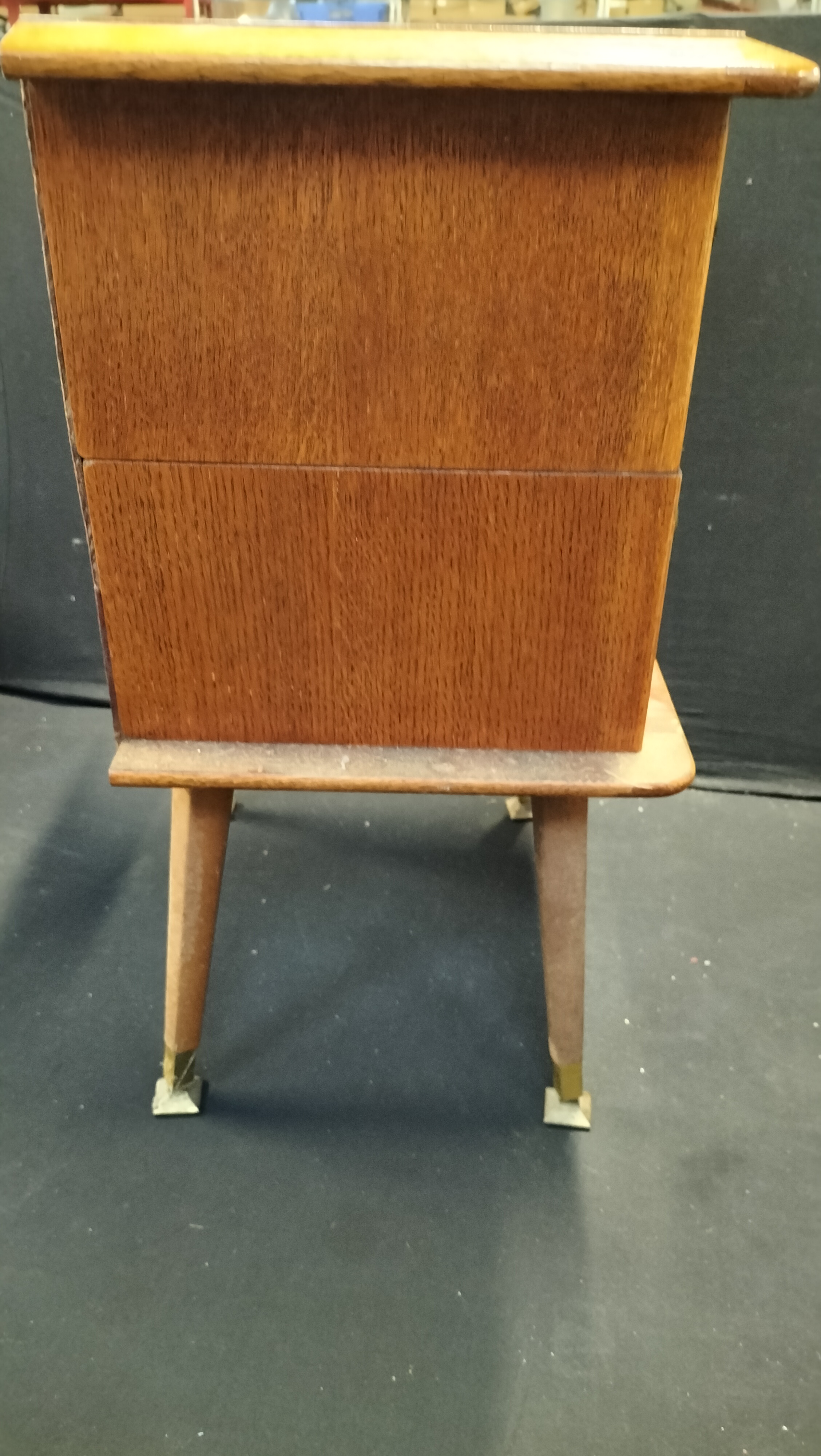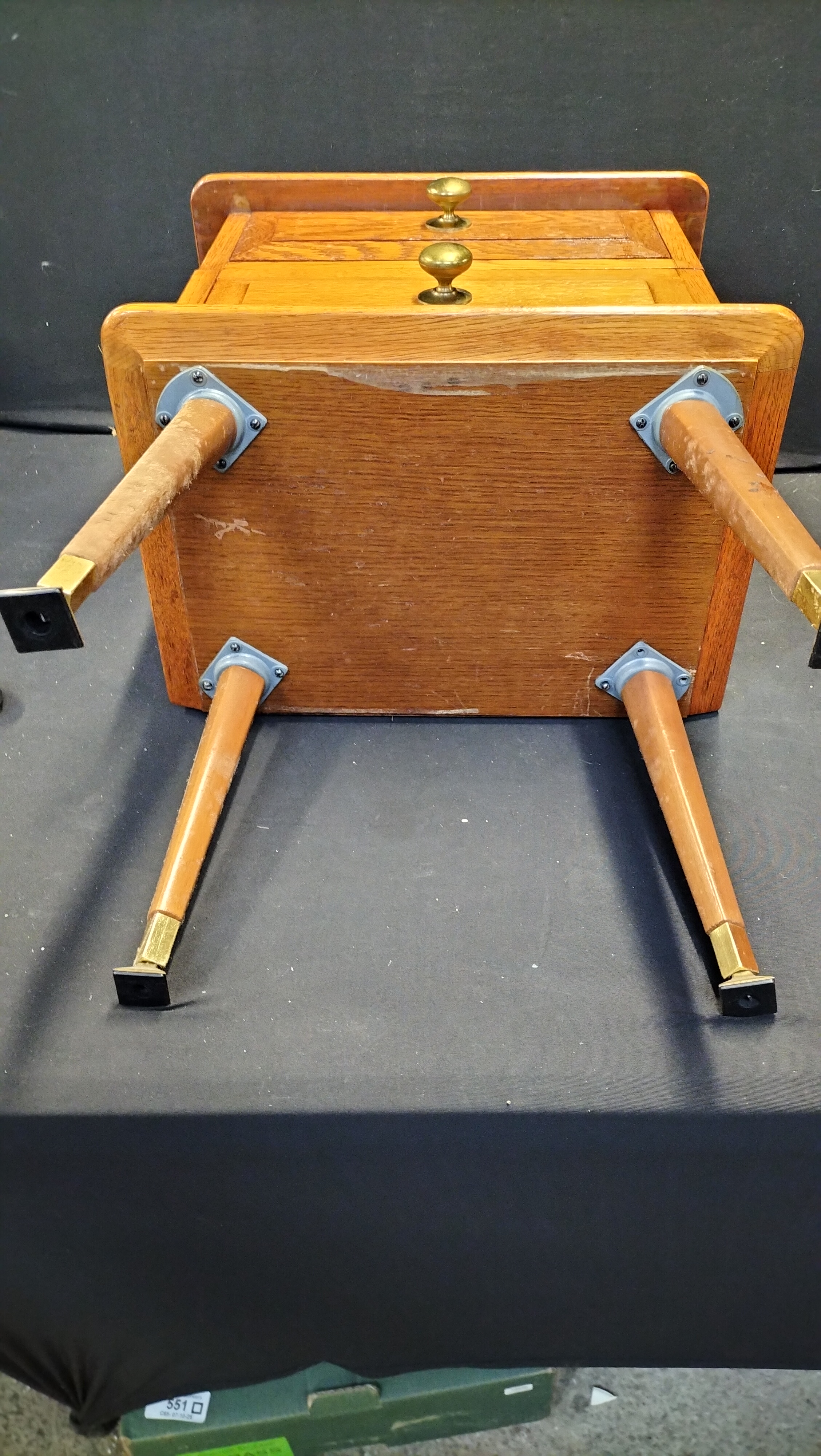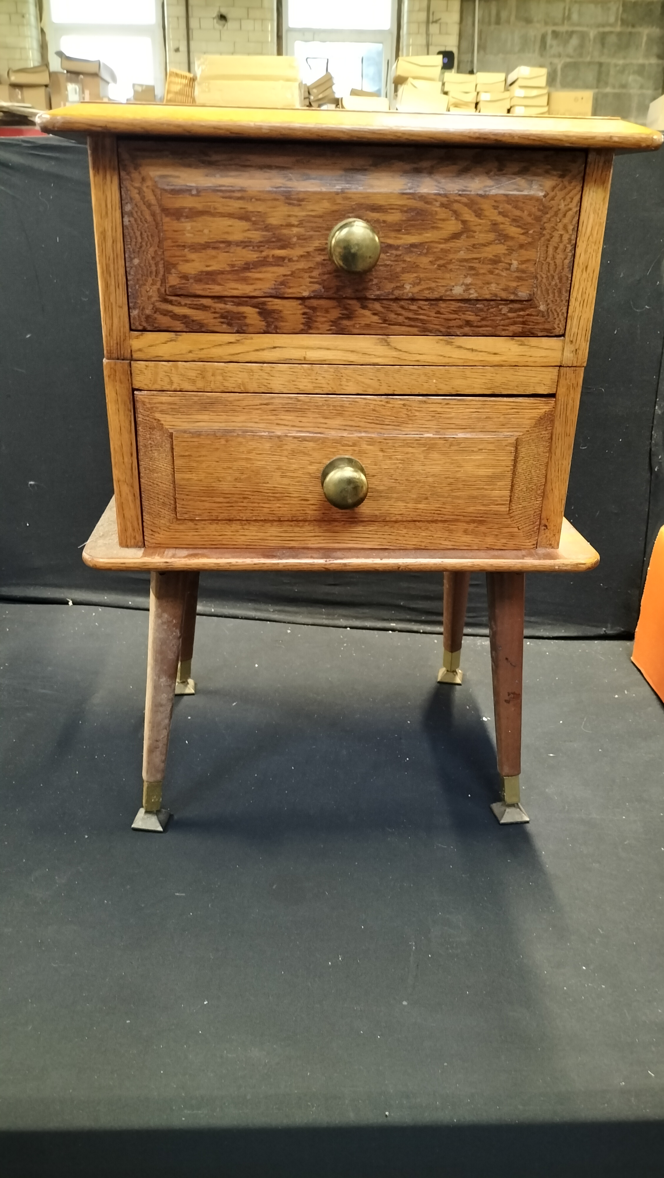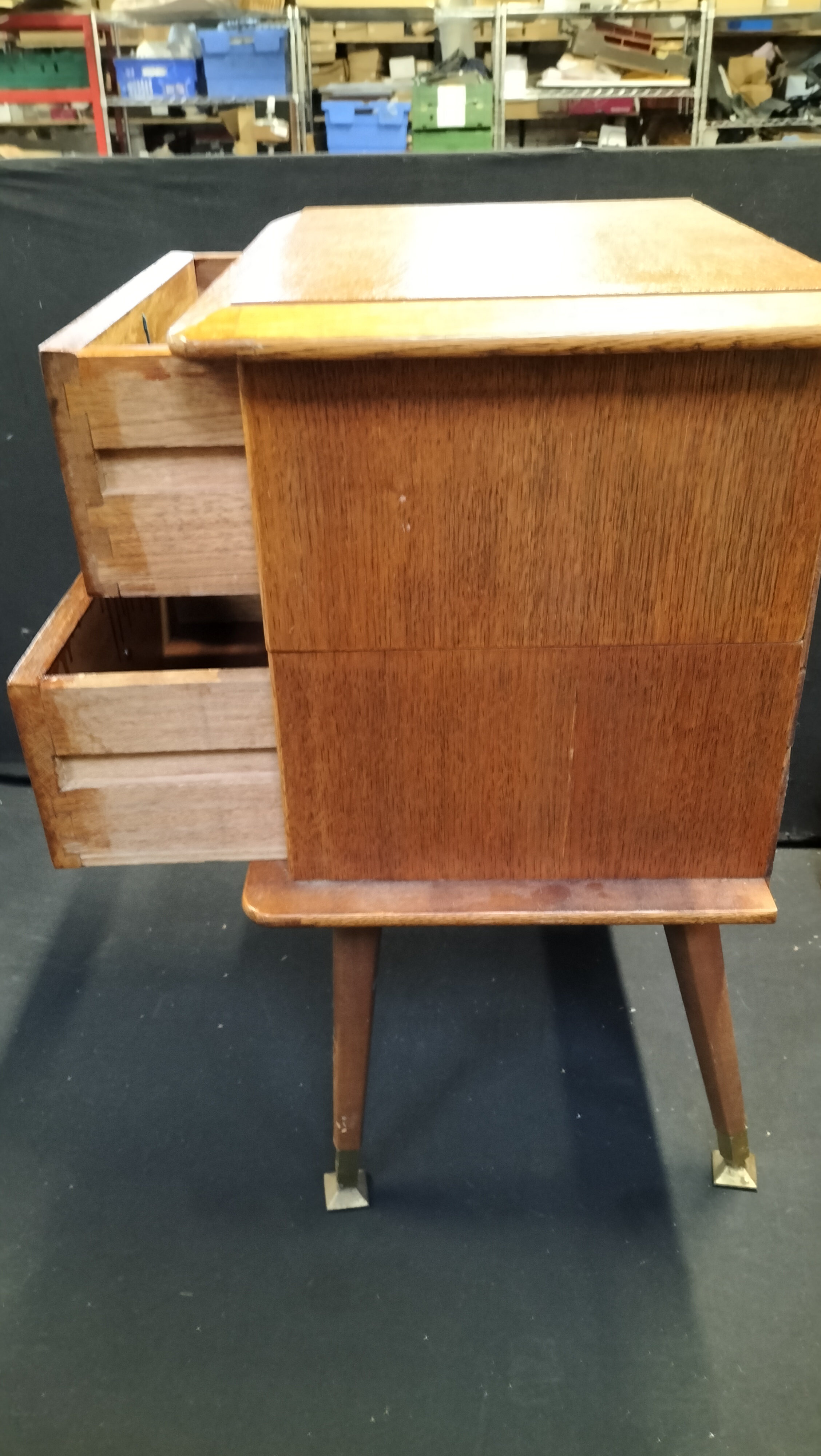 A mid century modern wooden nightstand featuring two drawers with brass-coloured round pulls and tapered legs finished with metal caps.