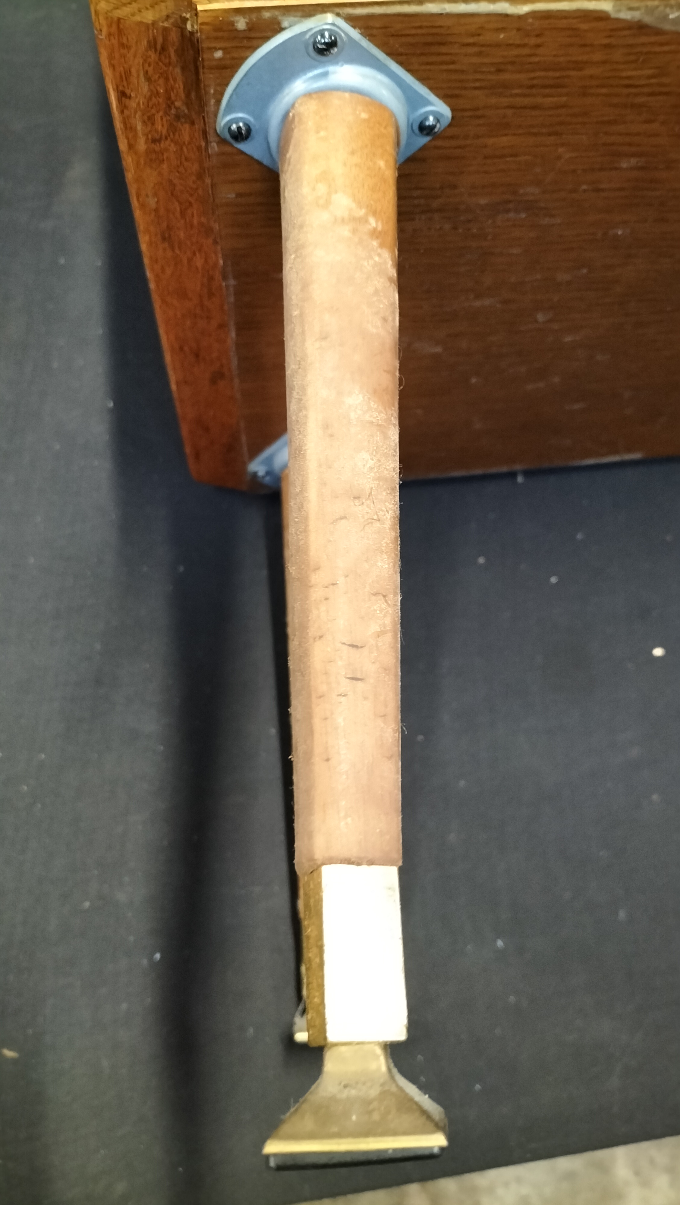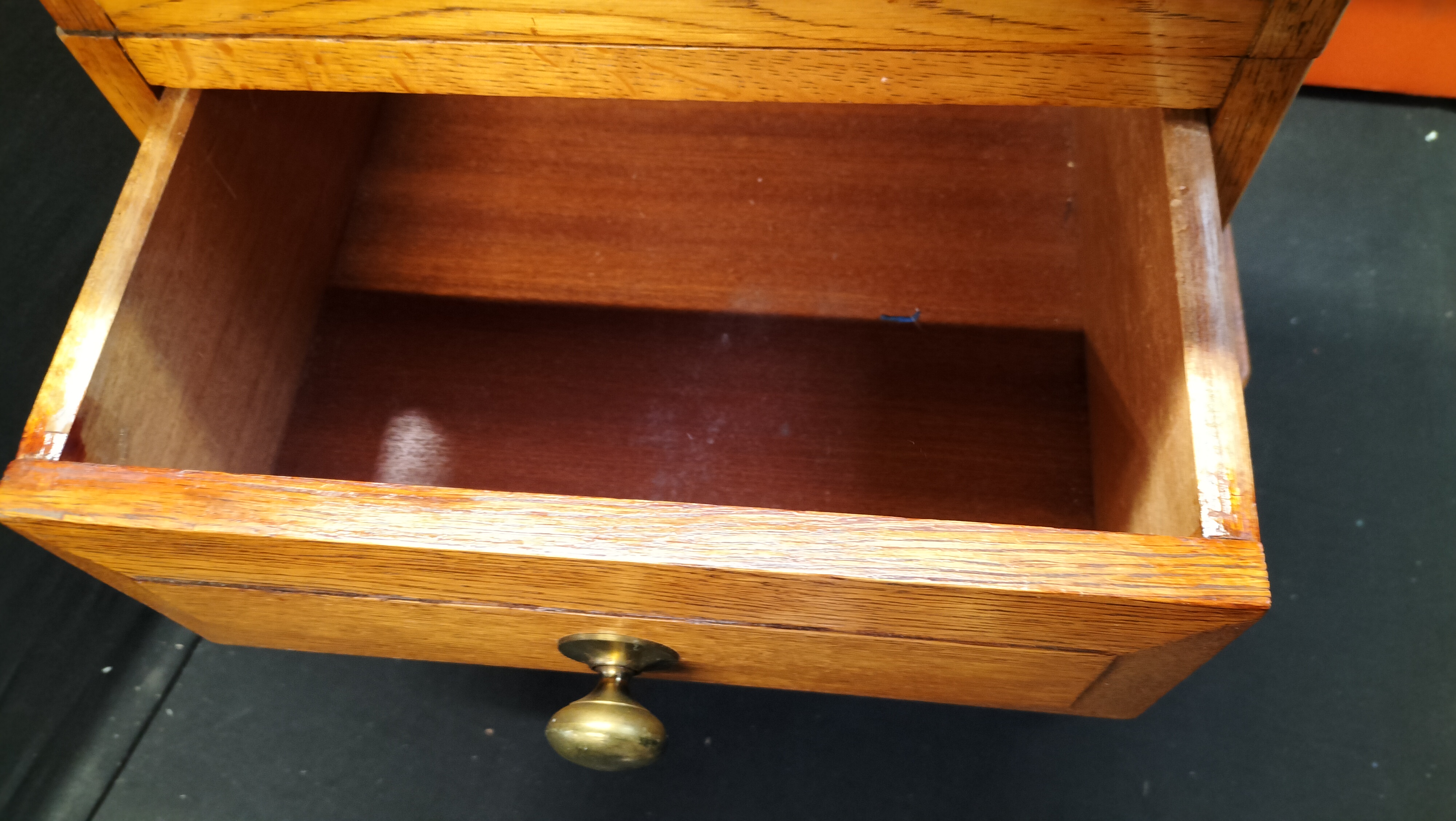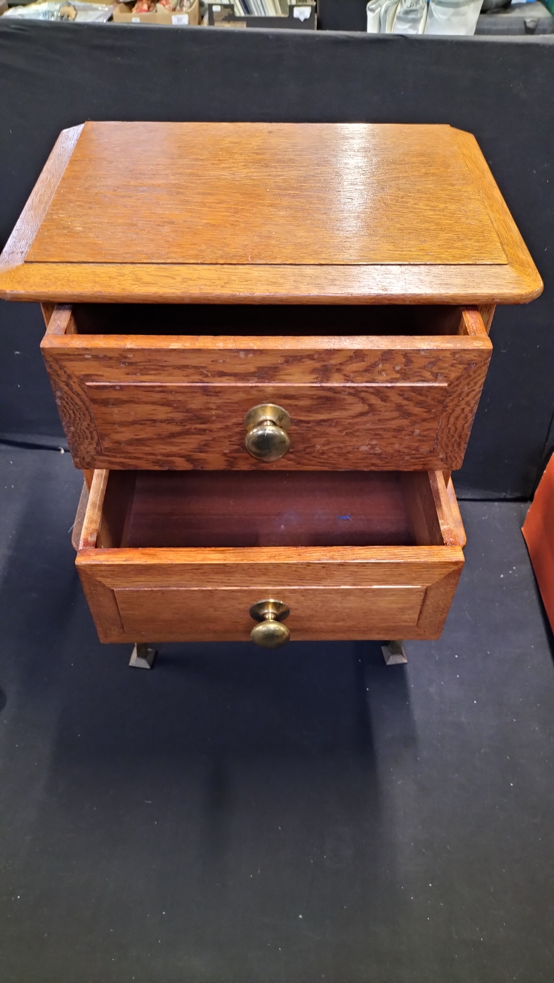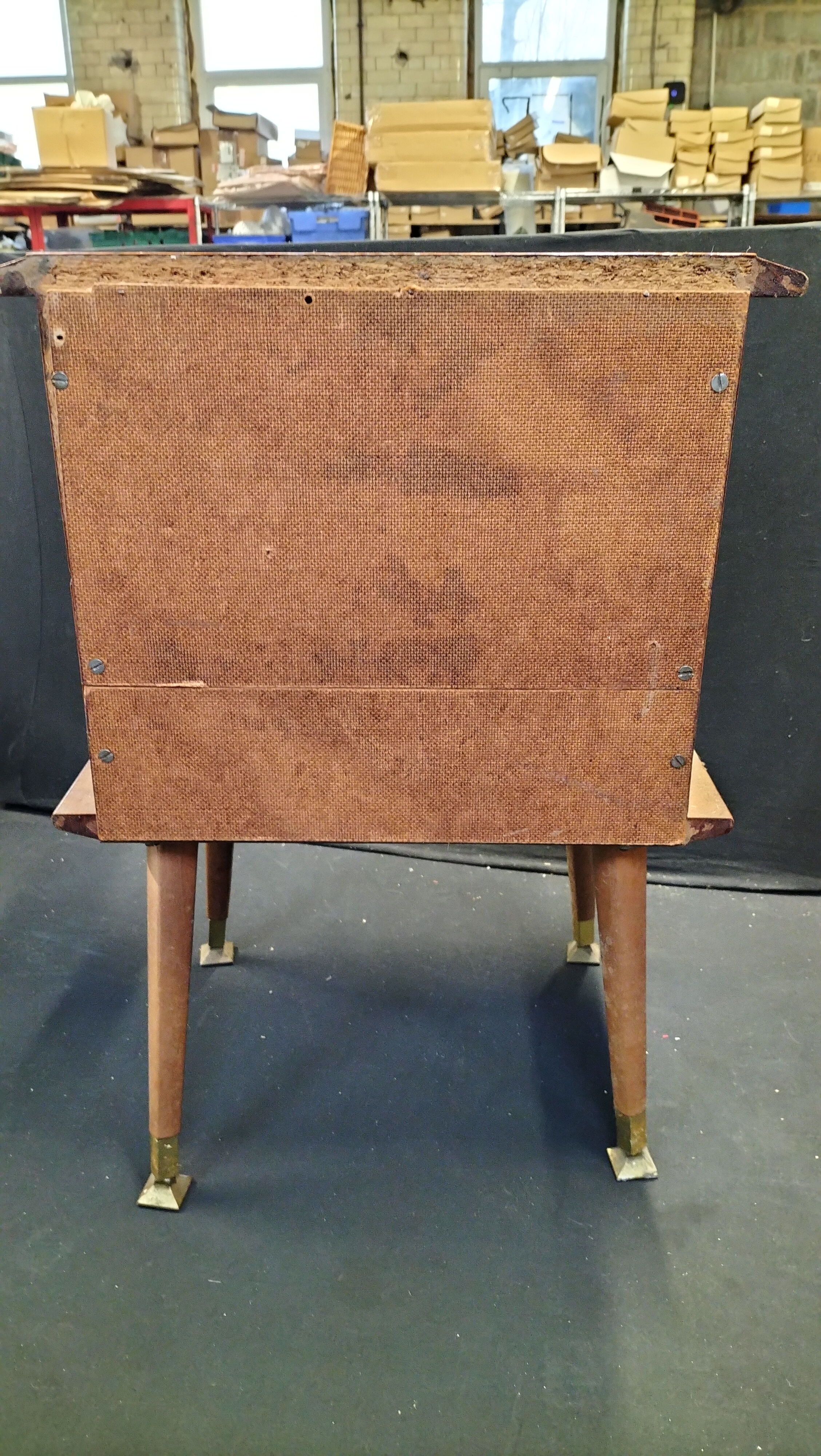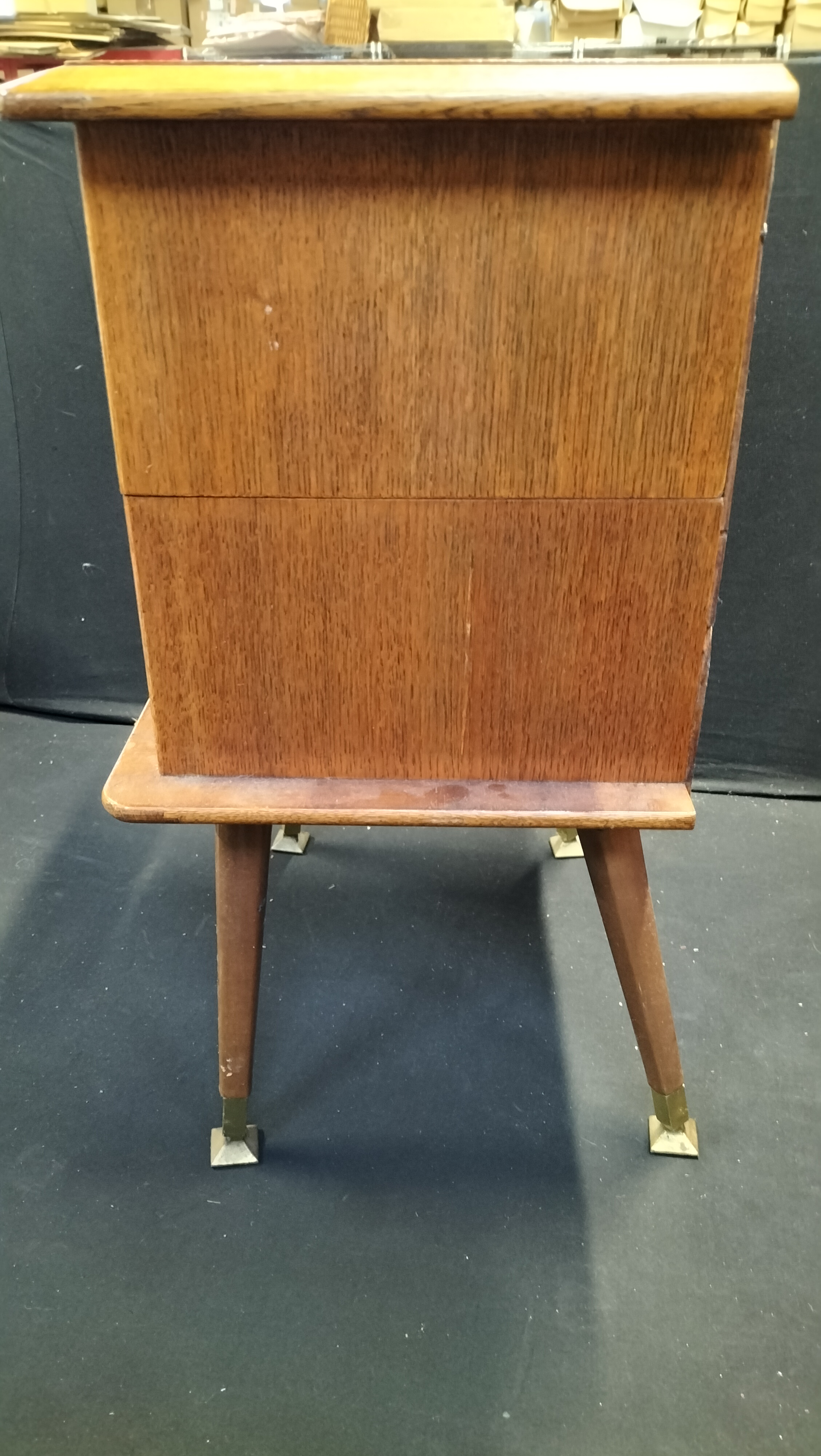 A mid century modern wooden nightstand featuring two drawers with brass-coloured round pulls and tapered legs finished with metal caps.