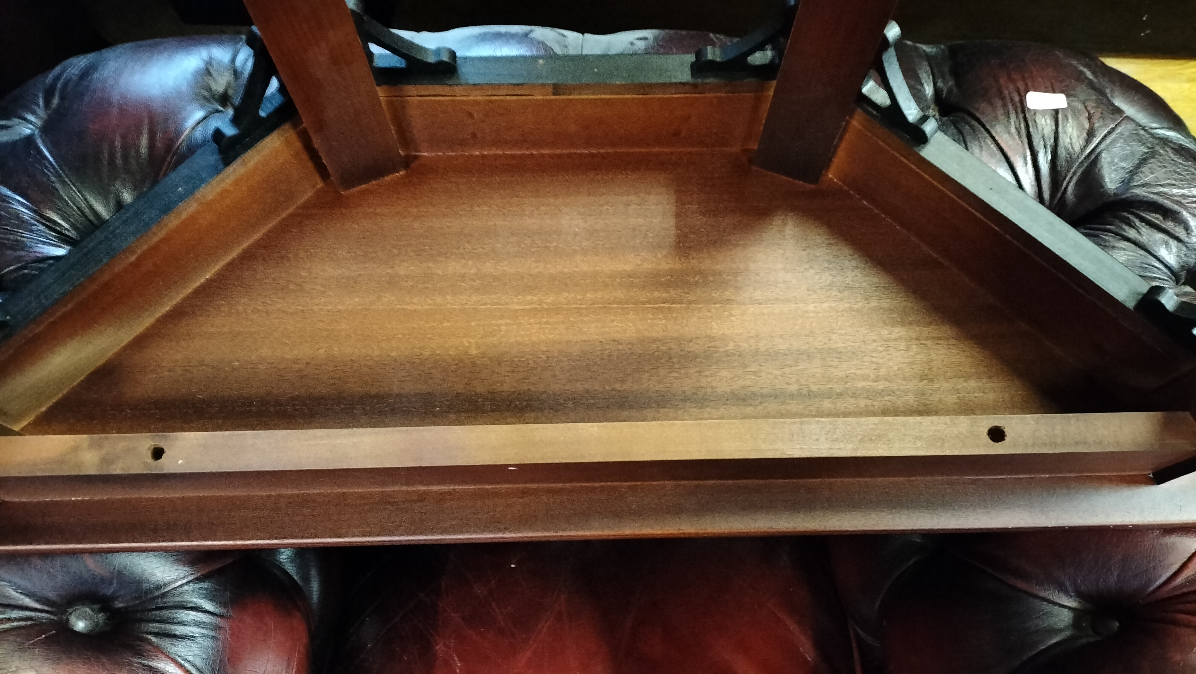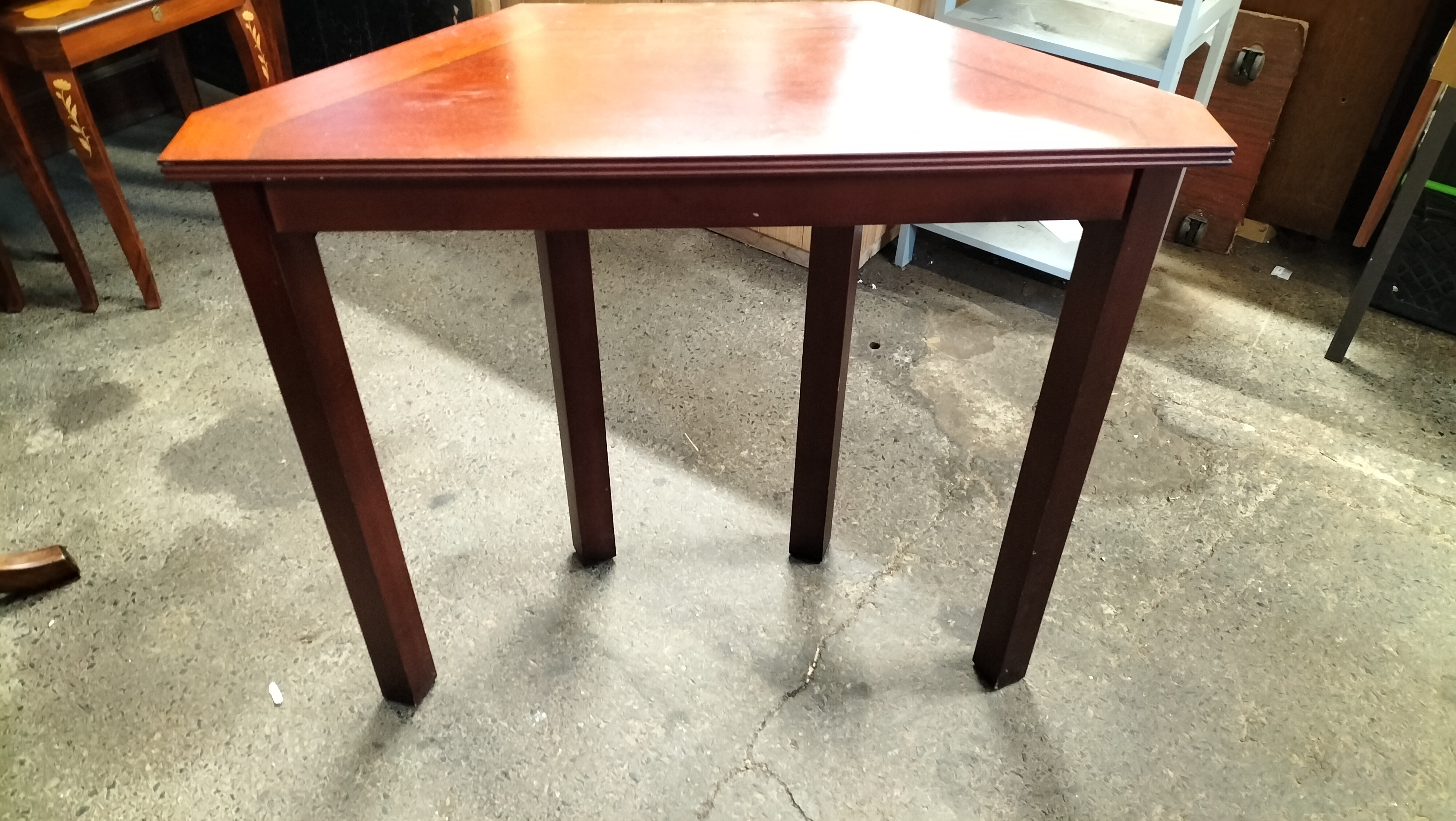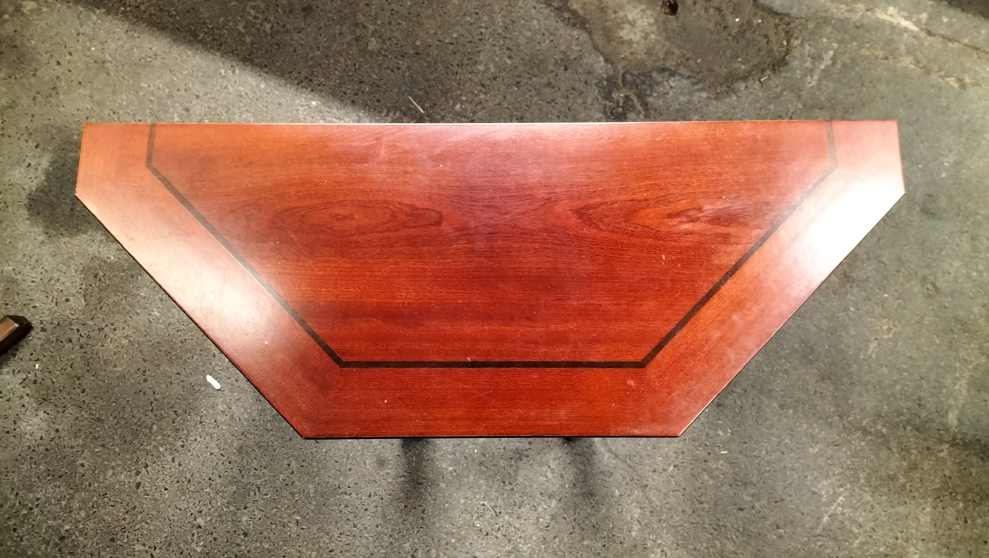 A wood console table featuring a semi-octagonal top with a dark inlay border, reddish-brown finish, and four tapered legs with decorative black metal brackets.