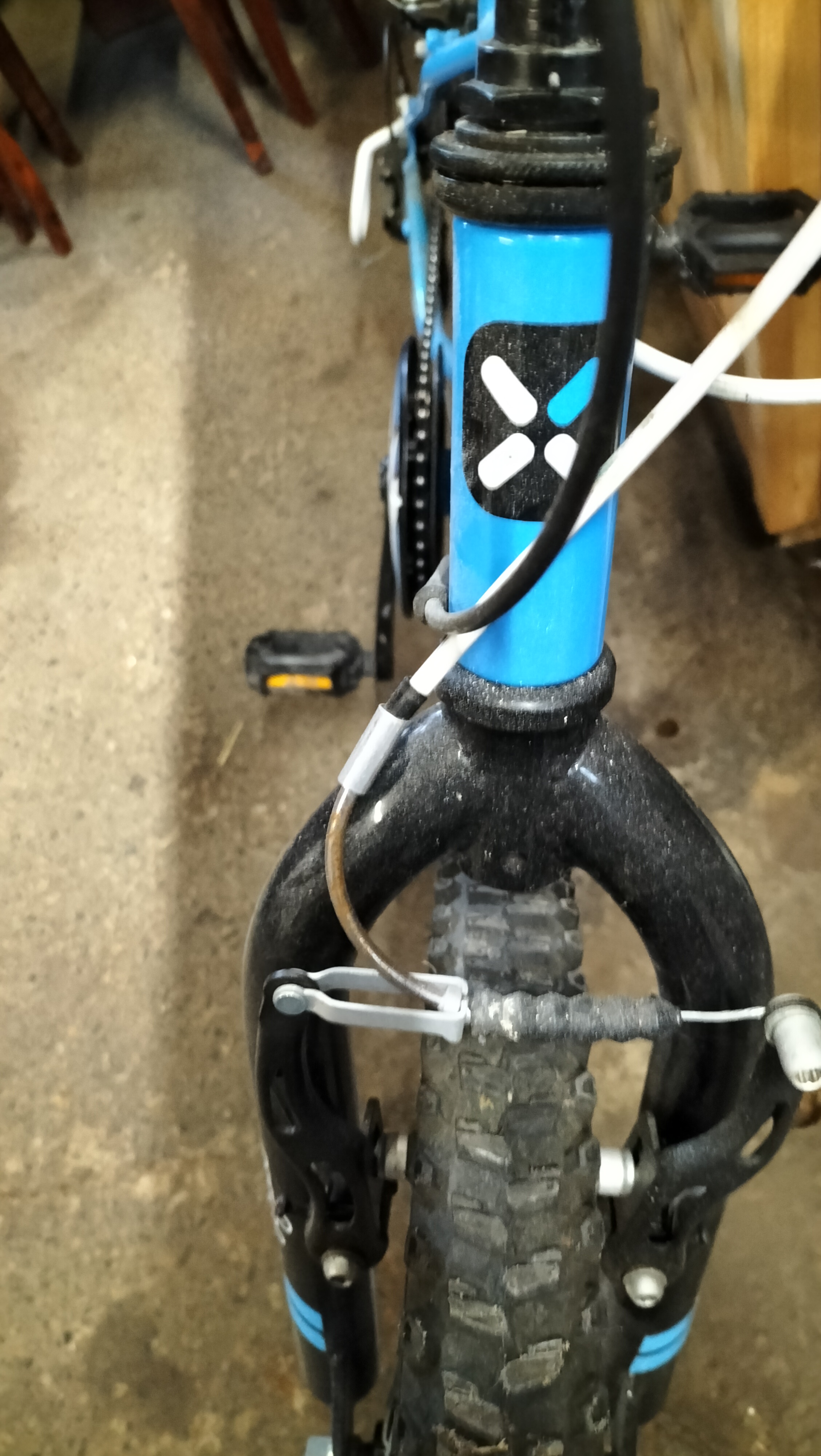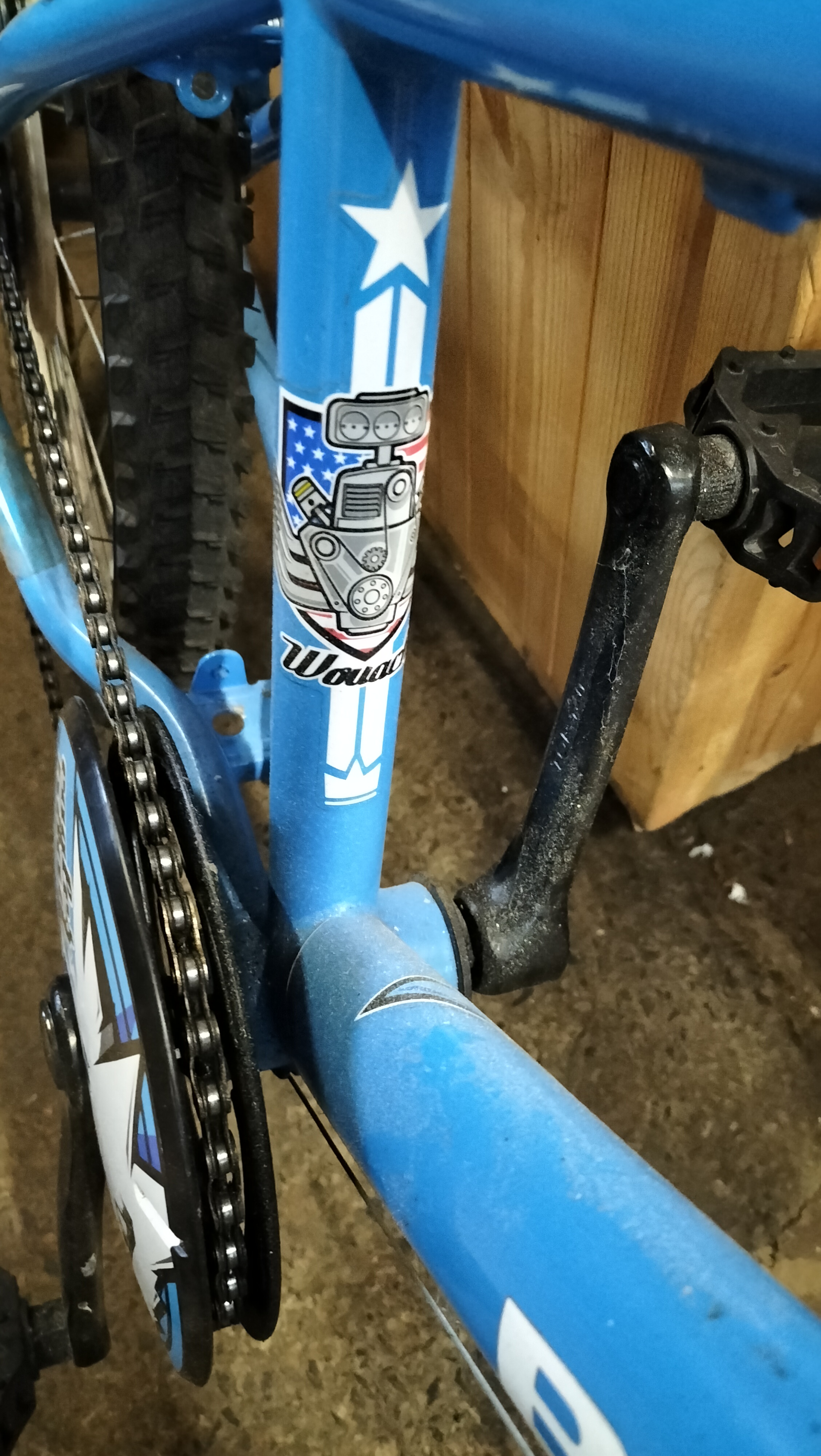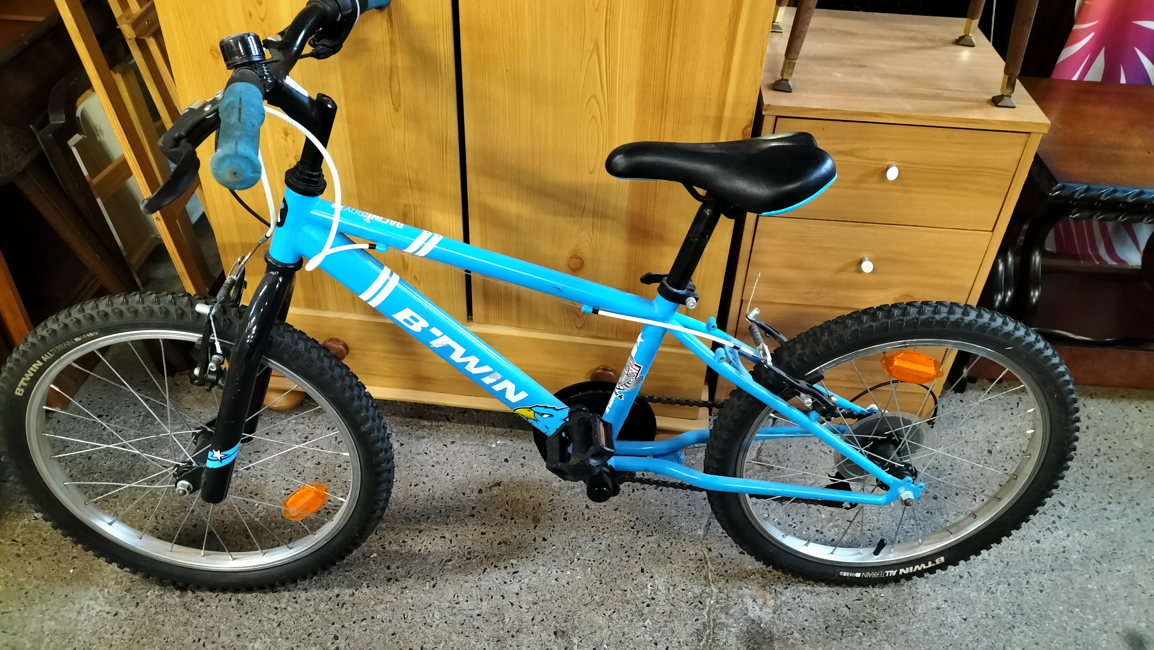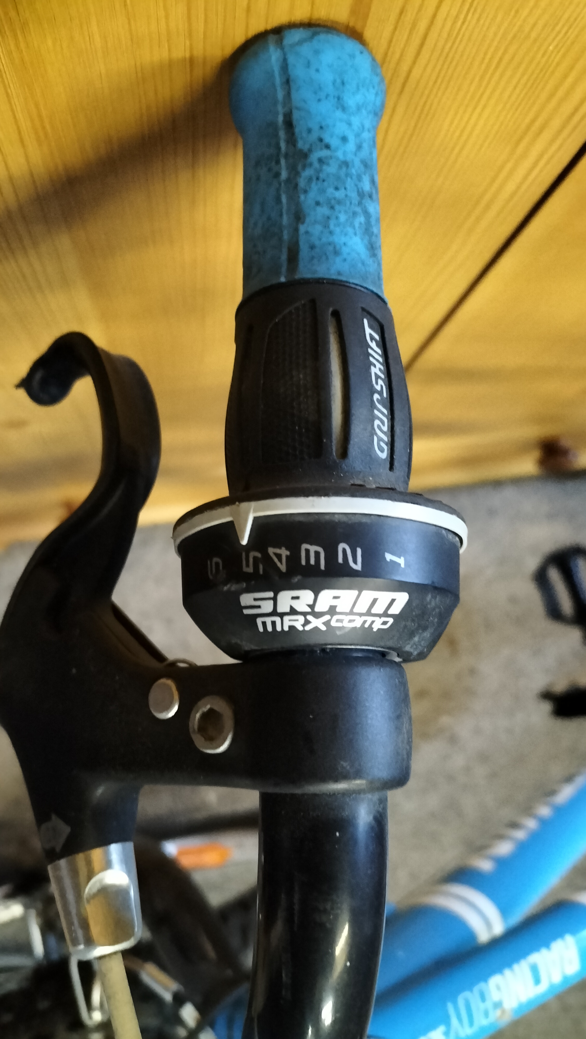 A bright blue and black children’s bicycle featuring a SRAM MRXcomp shifter, Shimano rear derailleur, and 20-inch all-terrain tyres.