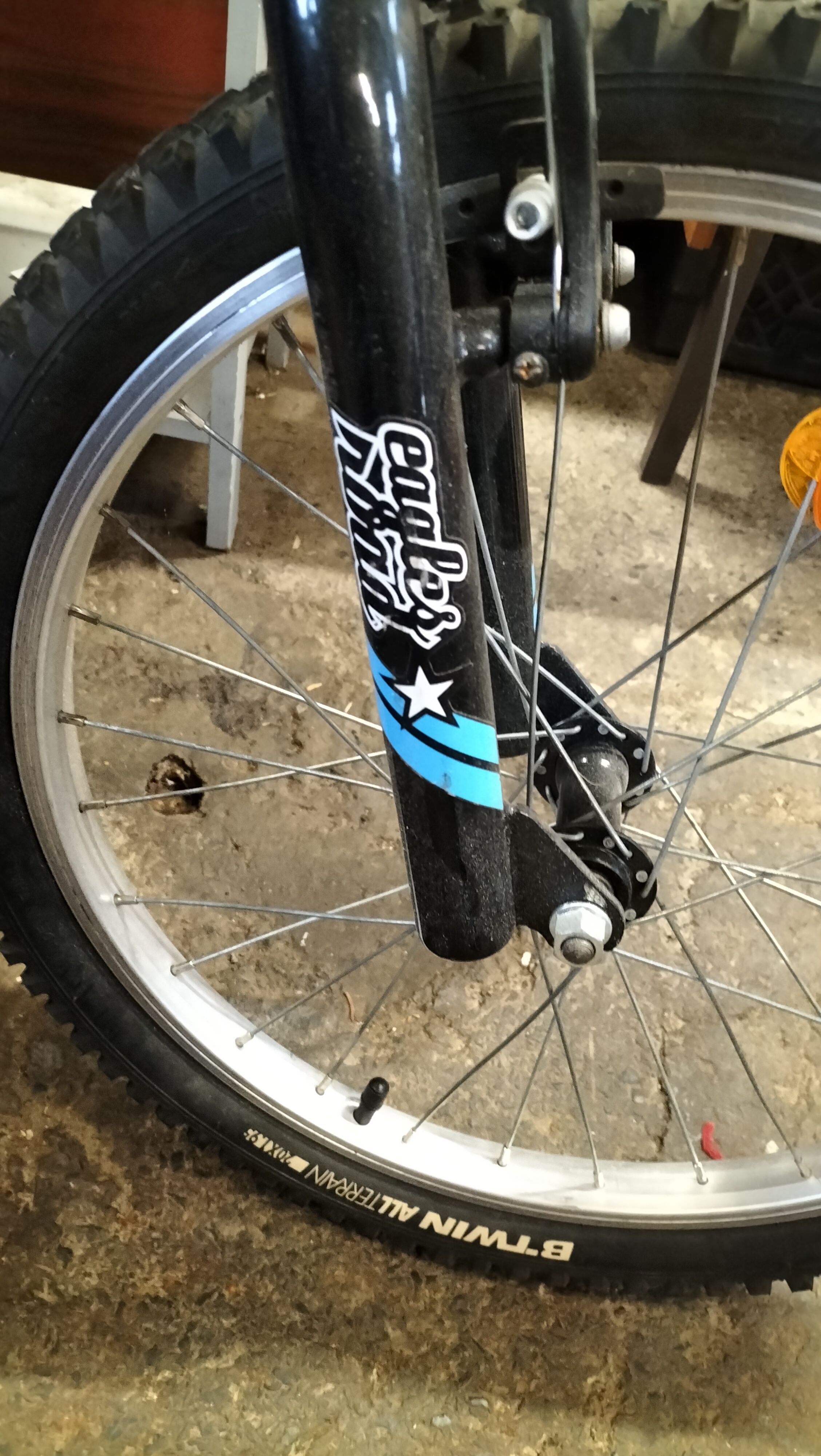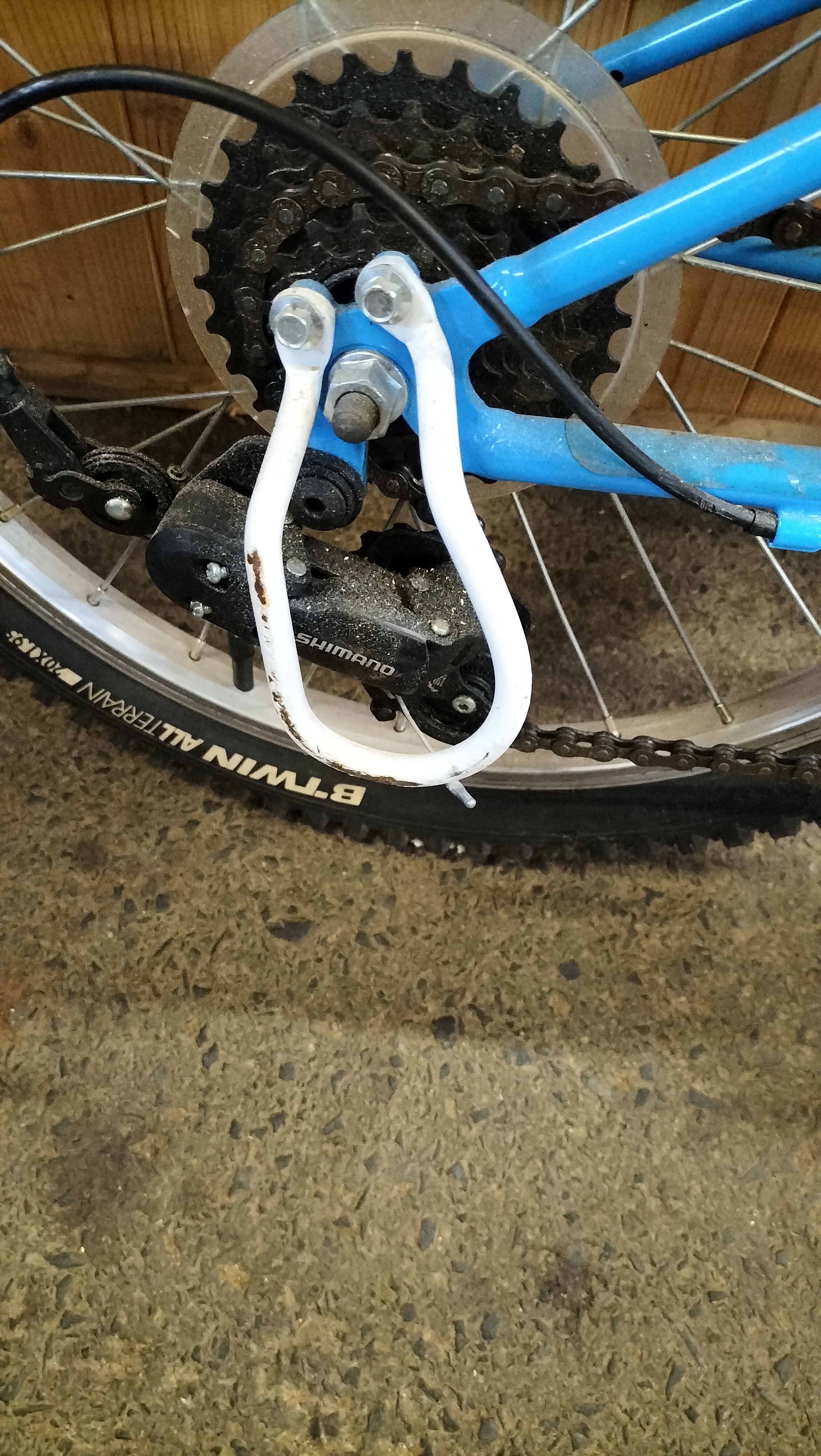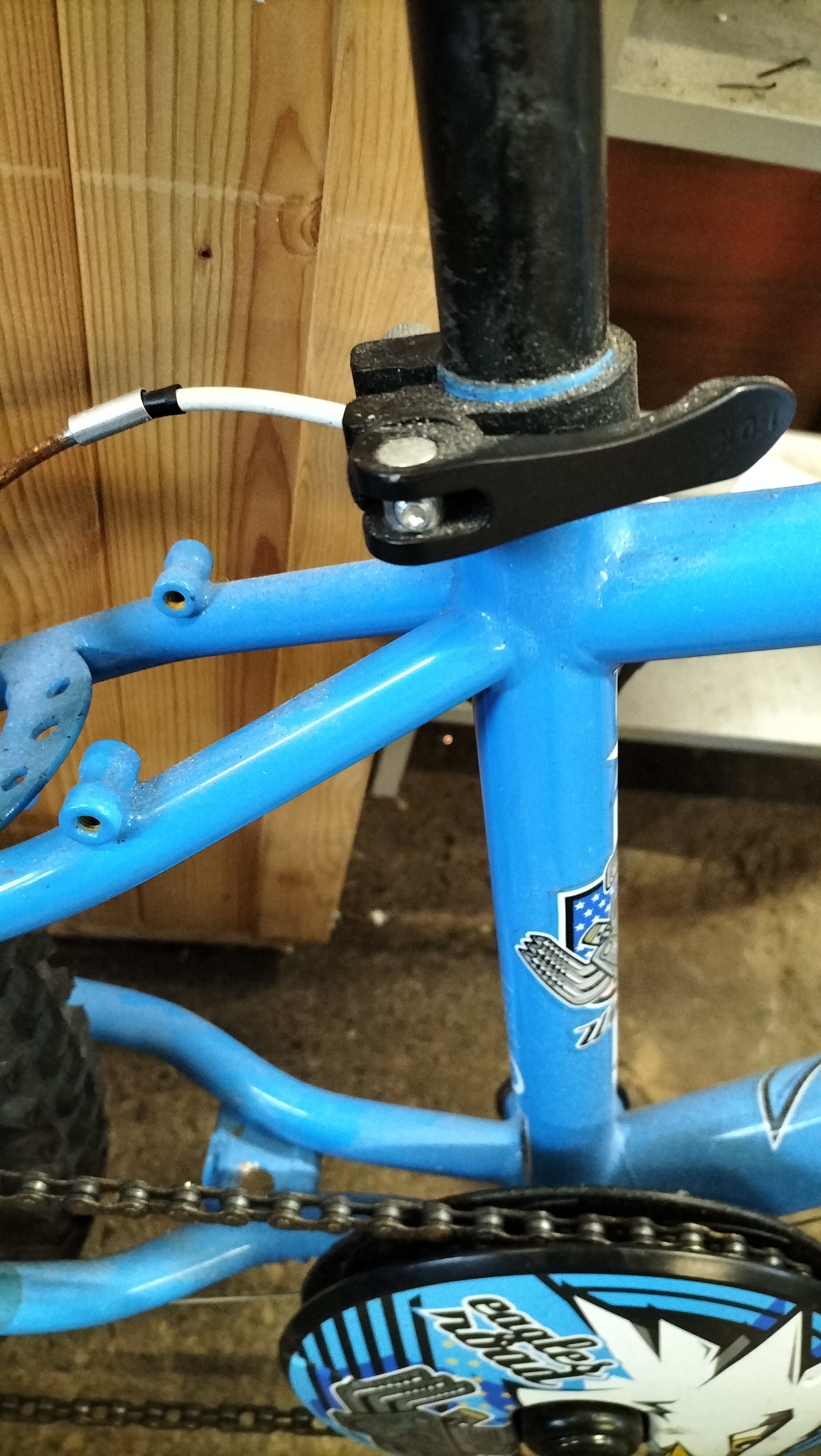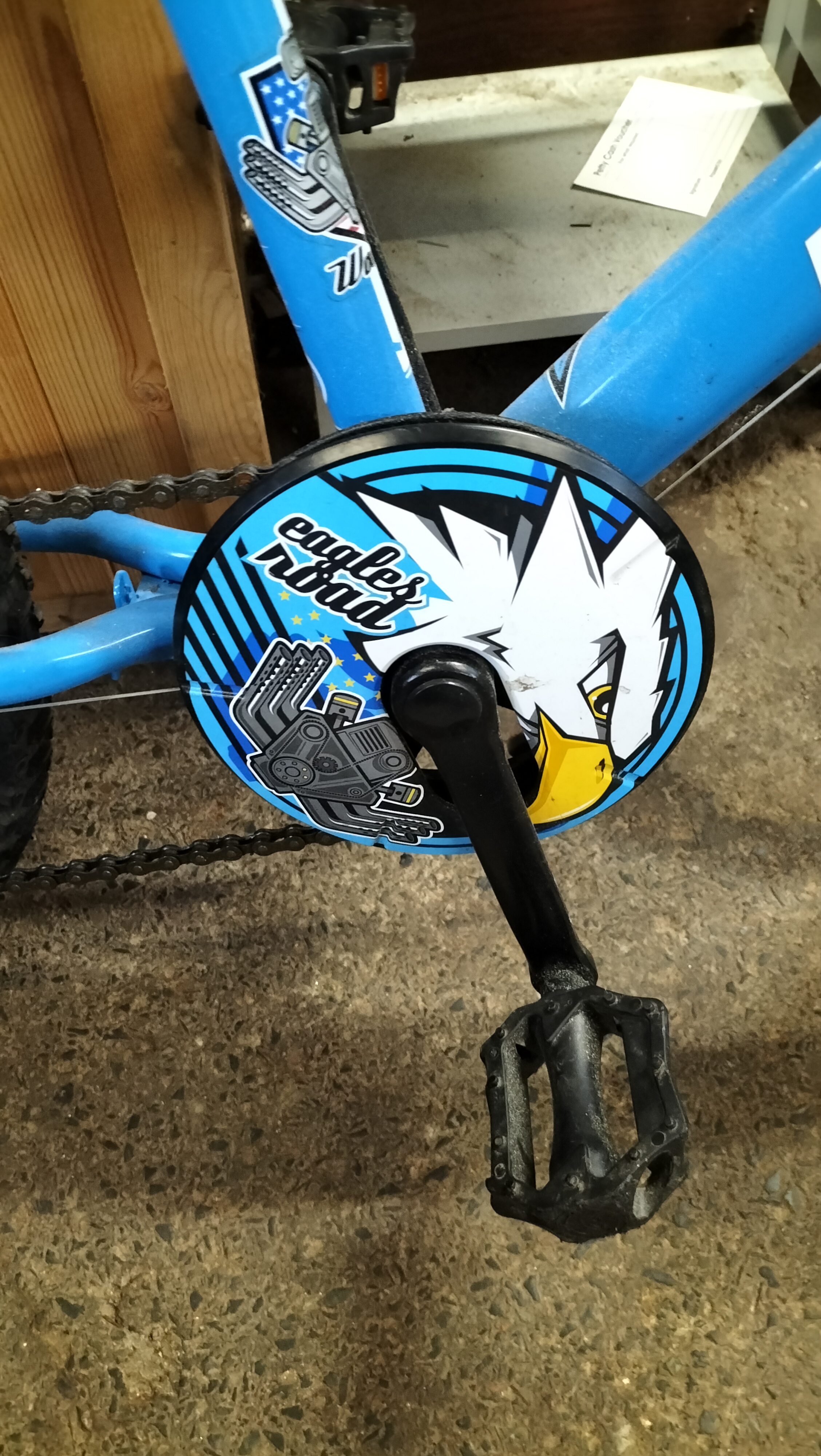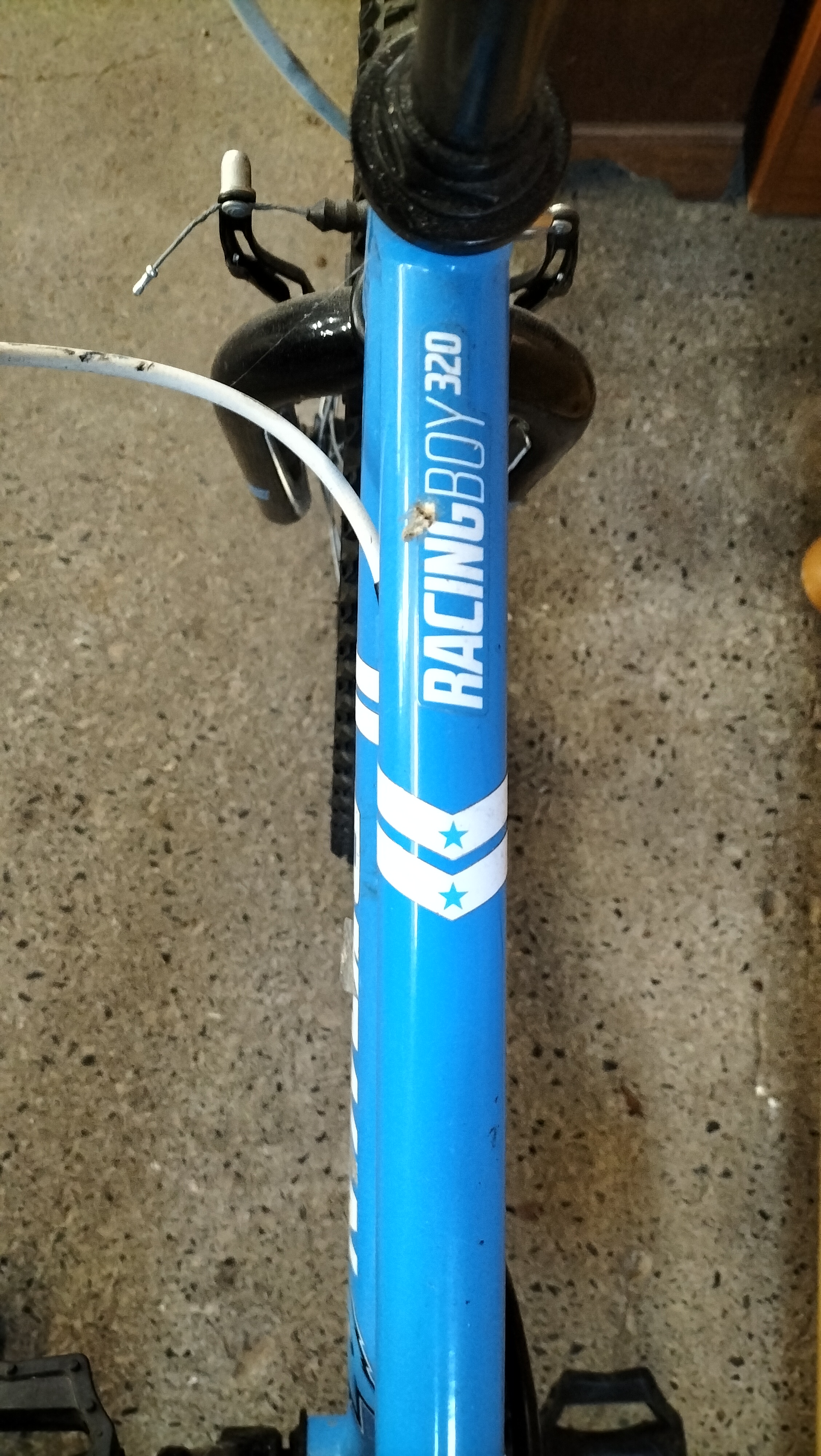 A bright blue and black children’s bicycle featuring a SRAM MRXcomp shifter, Shimano rear derailleur, and 20-inch all-terrain tyres.