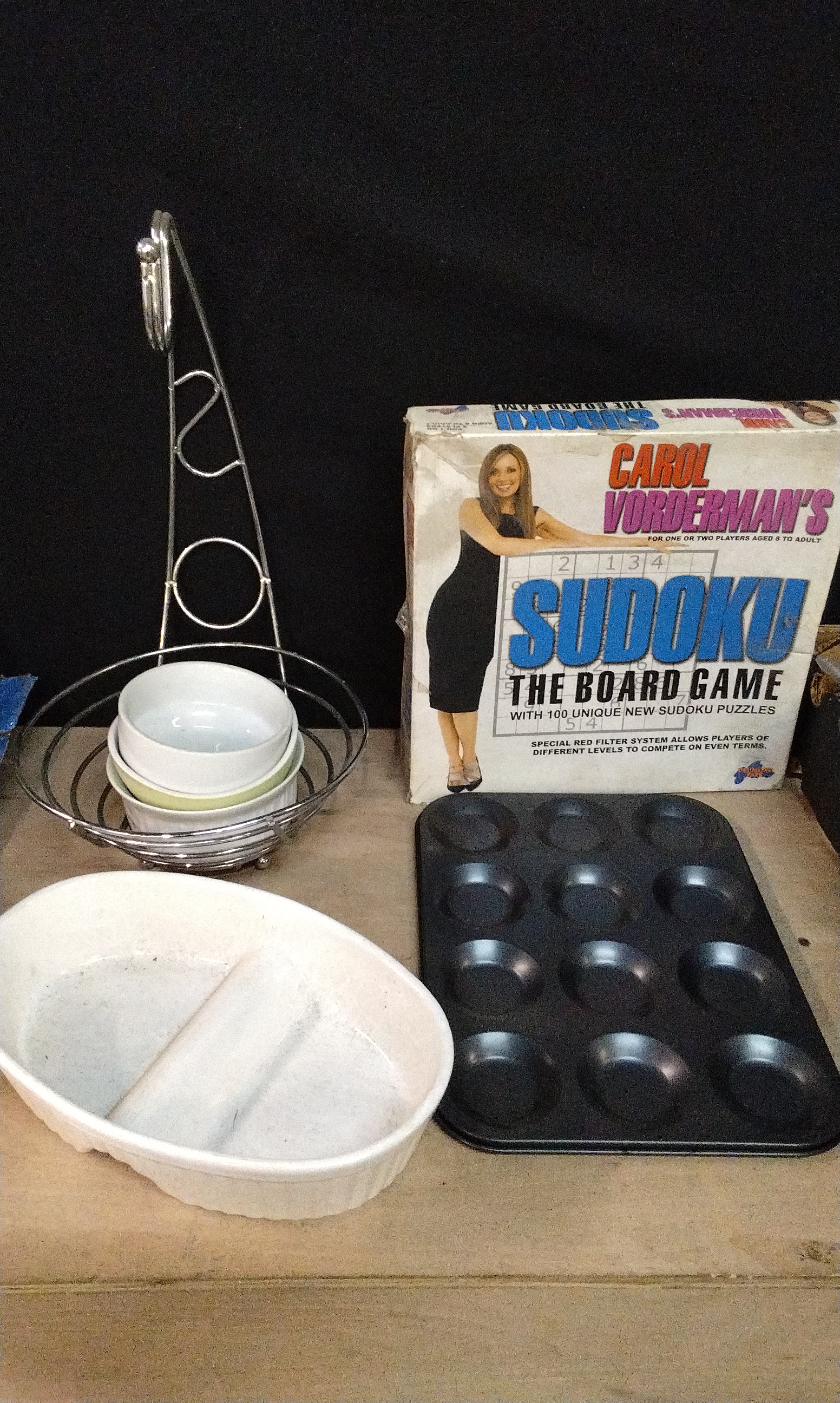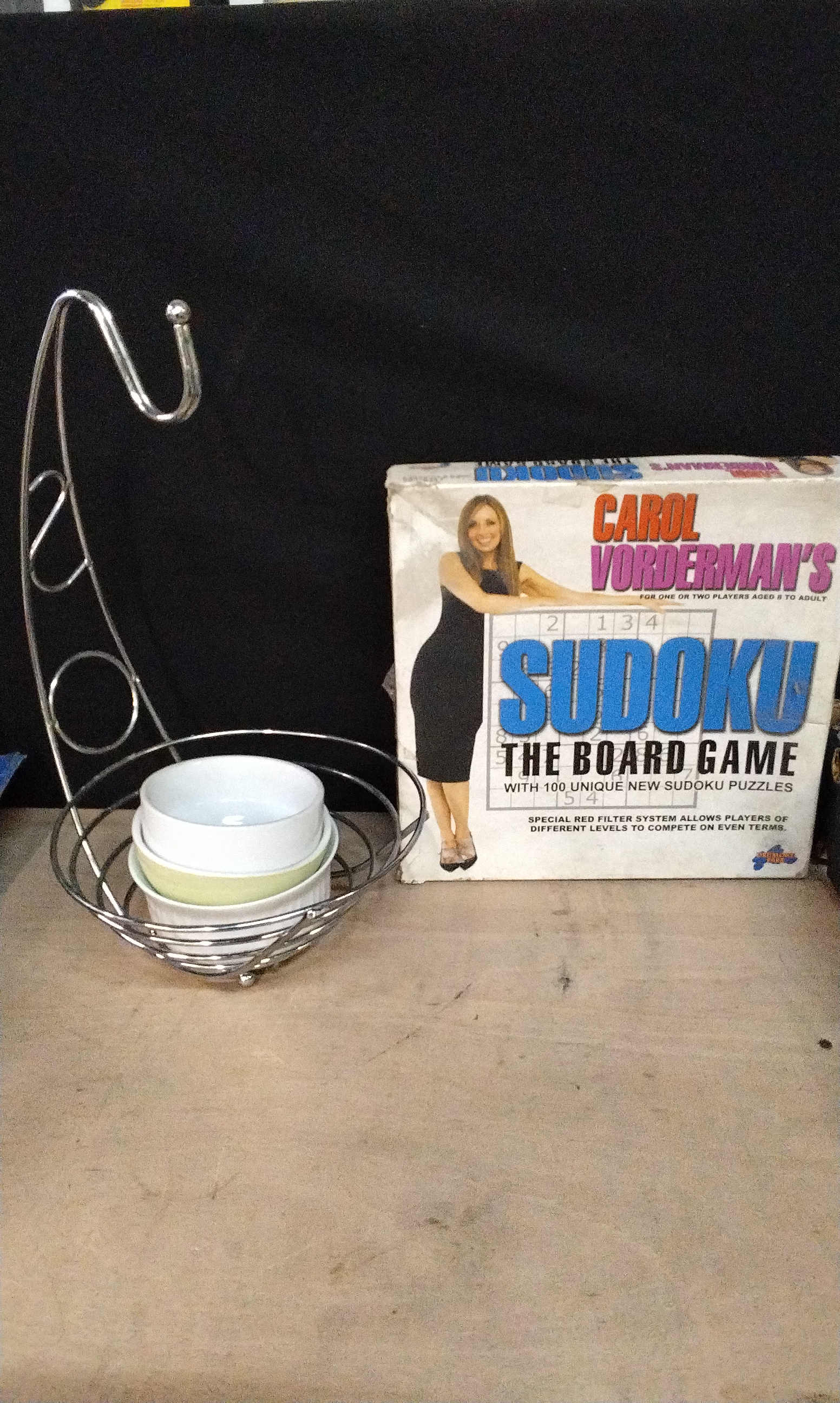 Mixed Lot Including Carol Vorderman's Sudoku, Metal Fruit Bowl Cooking Items and Bowls