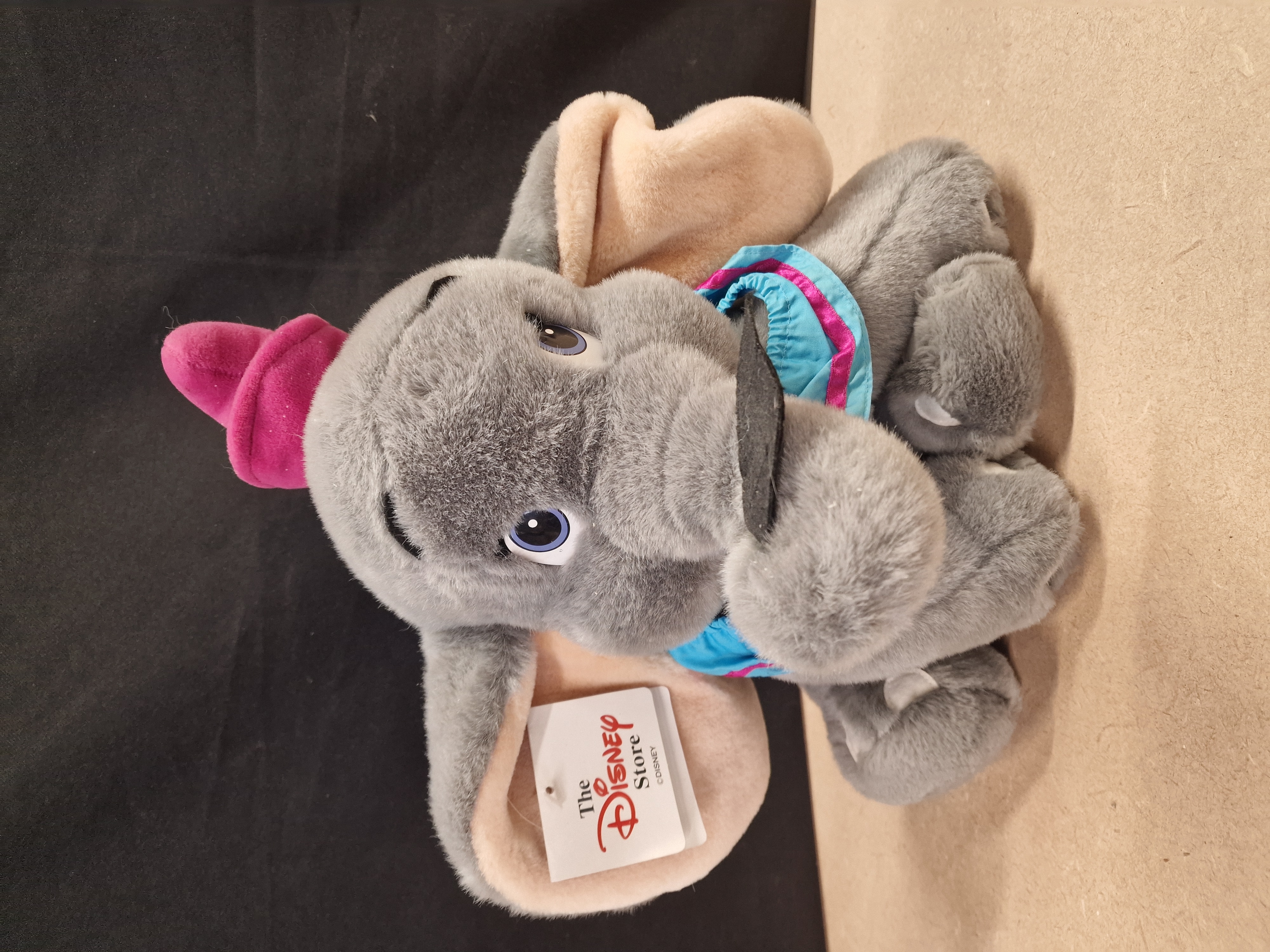 A gray Dumbo plush elephant featuring pink and blue accents and a black feather, complete with a Disney Store hang tag.