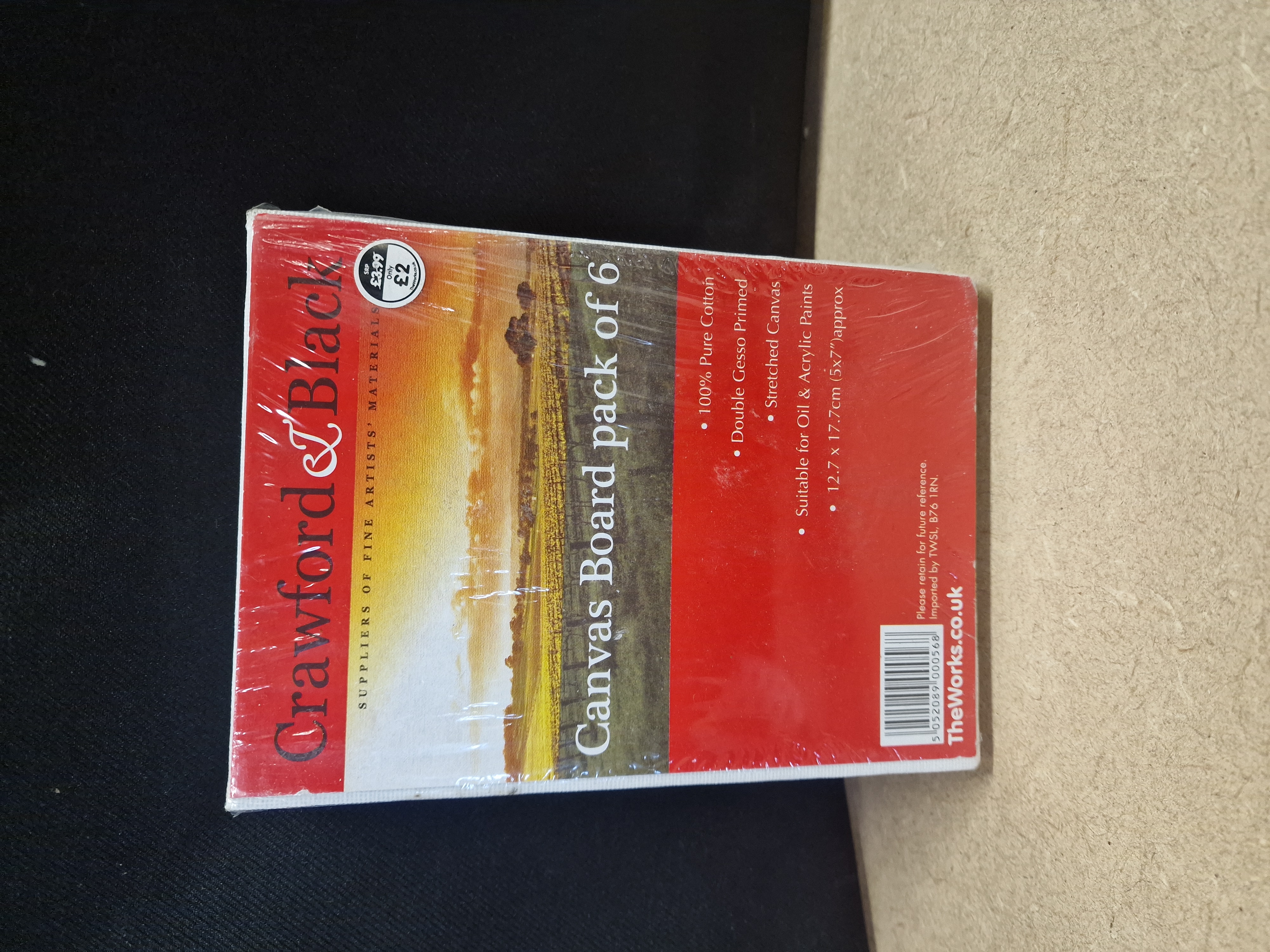 A pack of six Crawford & Black double gesso primed cotton canvas boards measuring approximately 12.7 x 17.7cm.