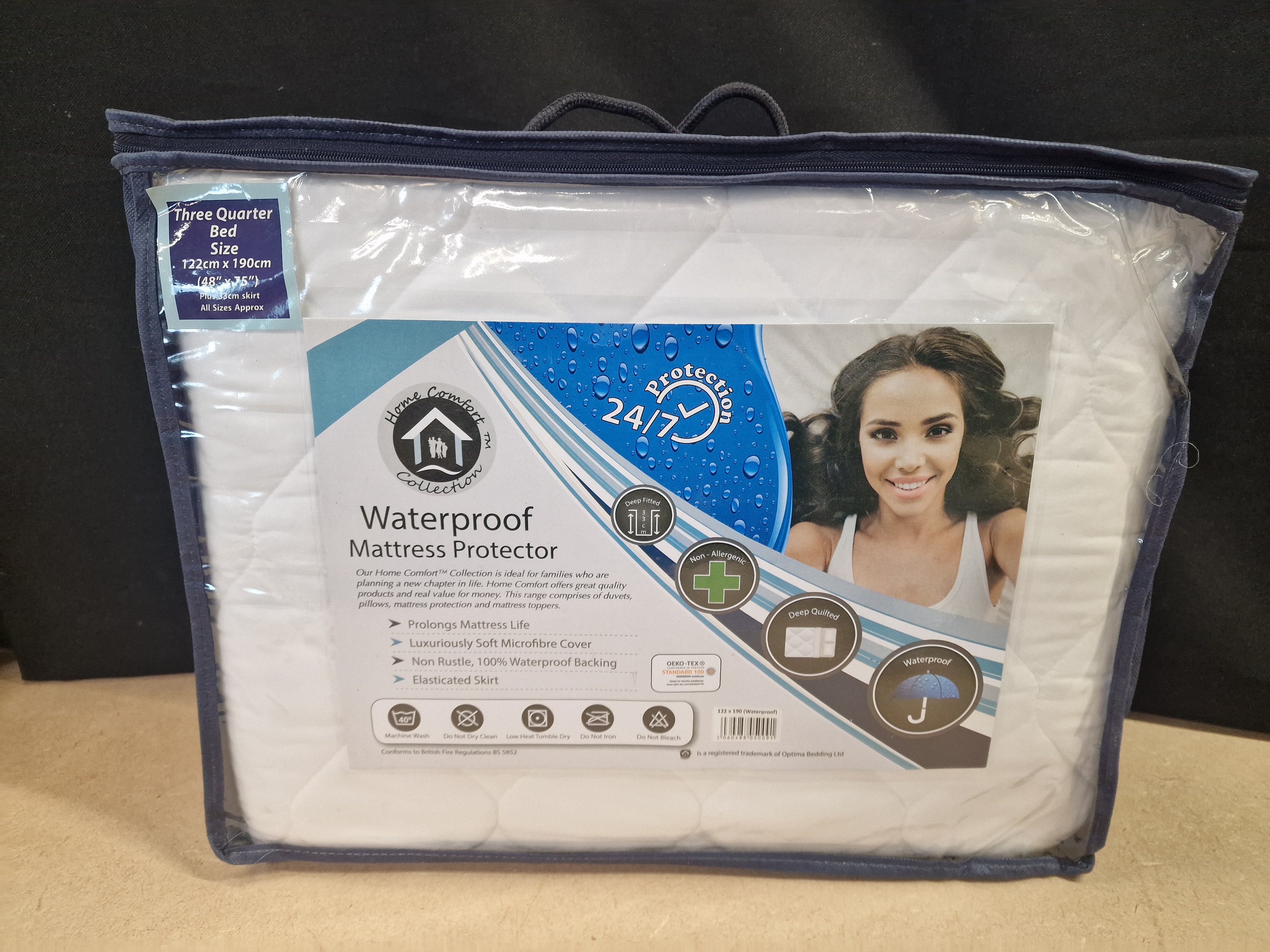 A white waterproof mattress protector for a three-quarter bed measuring 122cm by 190cm, featuring a microfibre cover and elasticated skirt.