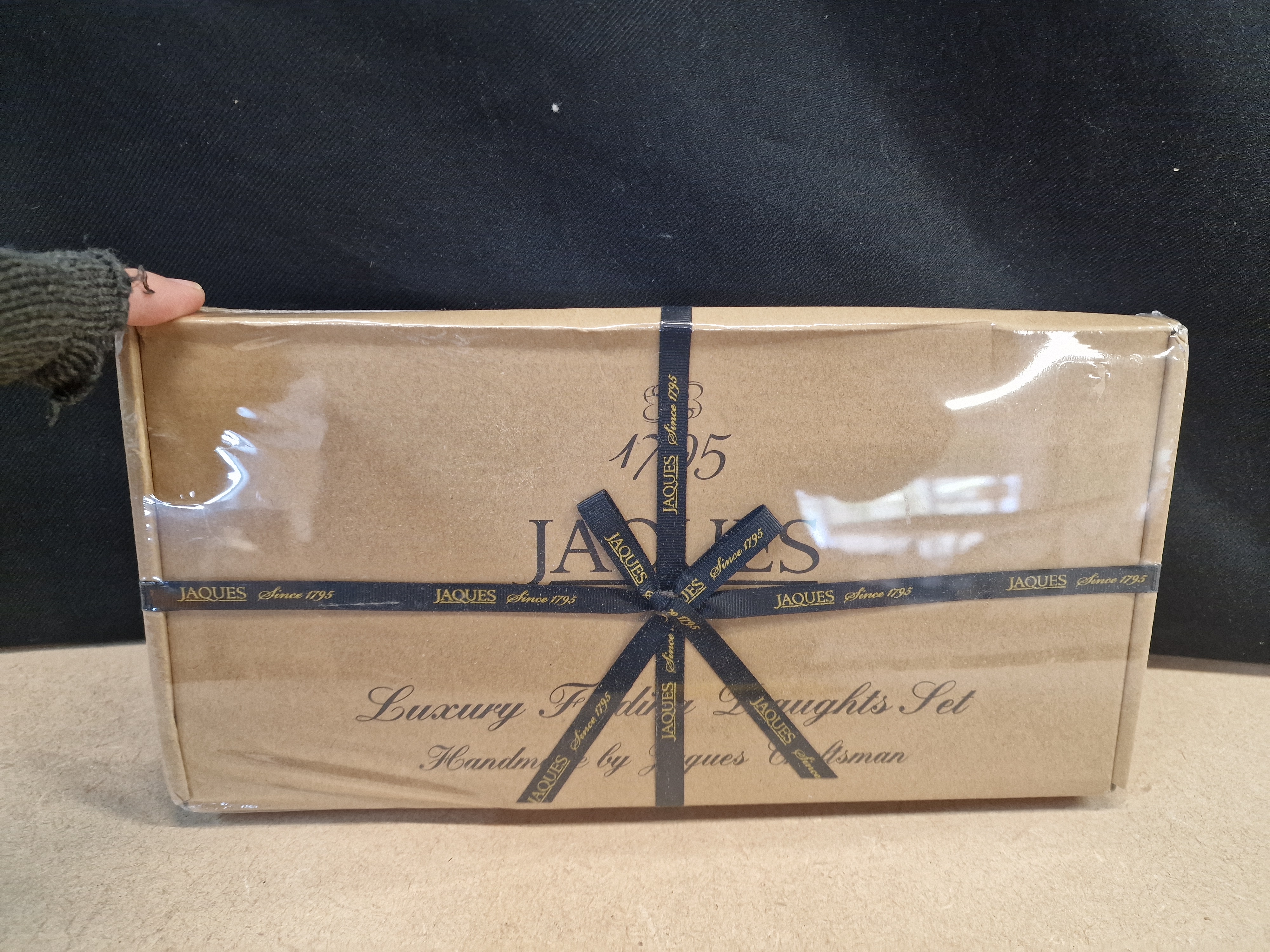 A handmade Jaques of London luxury folding draughts set presented in original brown packaging with branded ribbon.