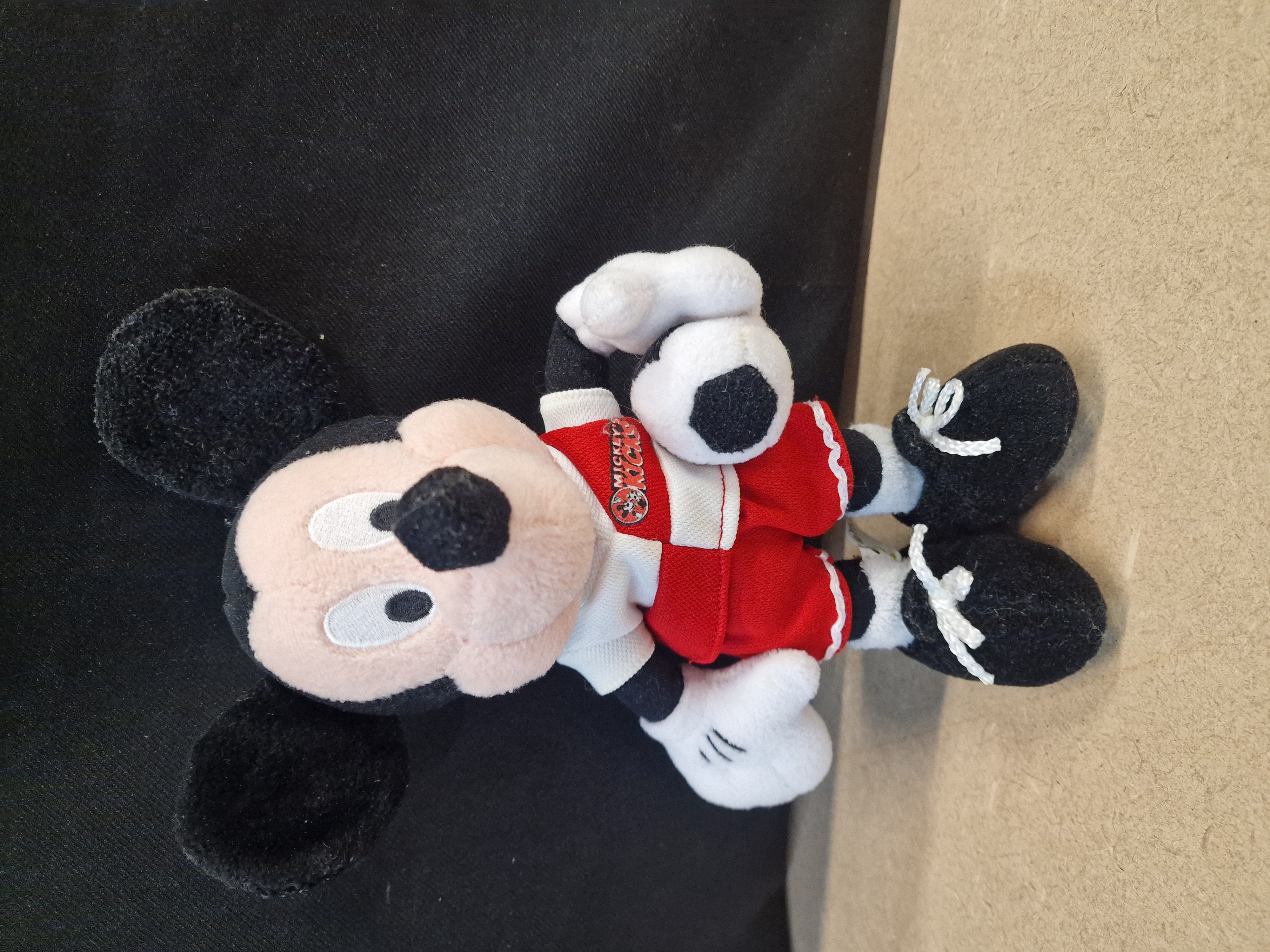 A black, white, and red plush Mickey Mouse toy dressed in a soccer uniform with a MICKEY KICKS patch on the jersey.