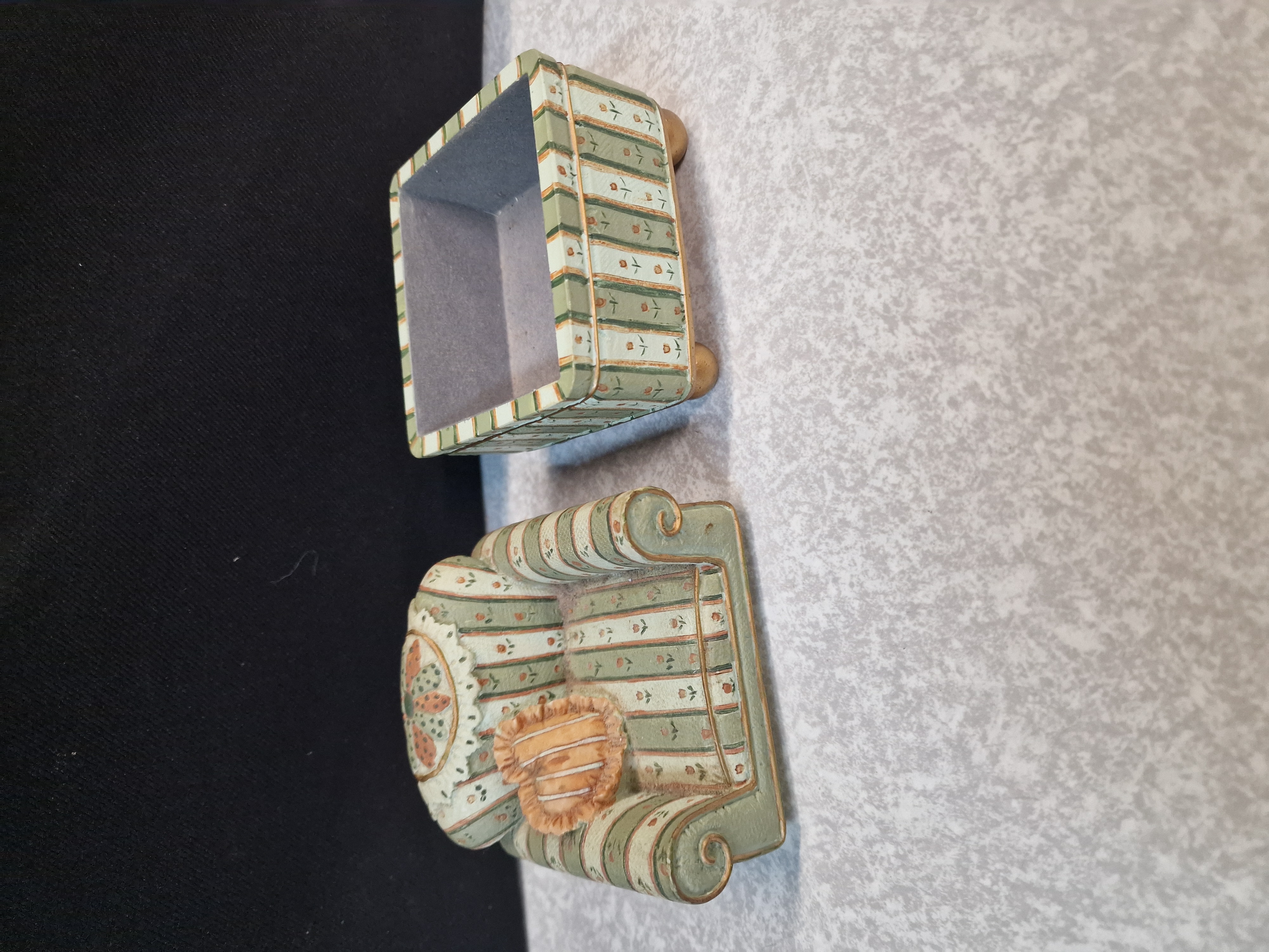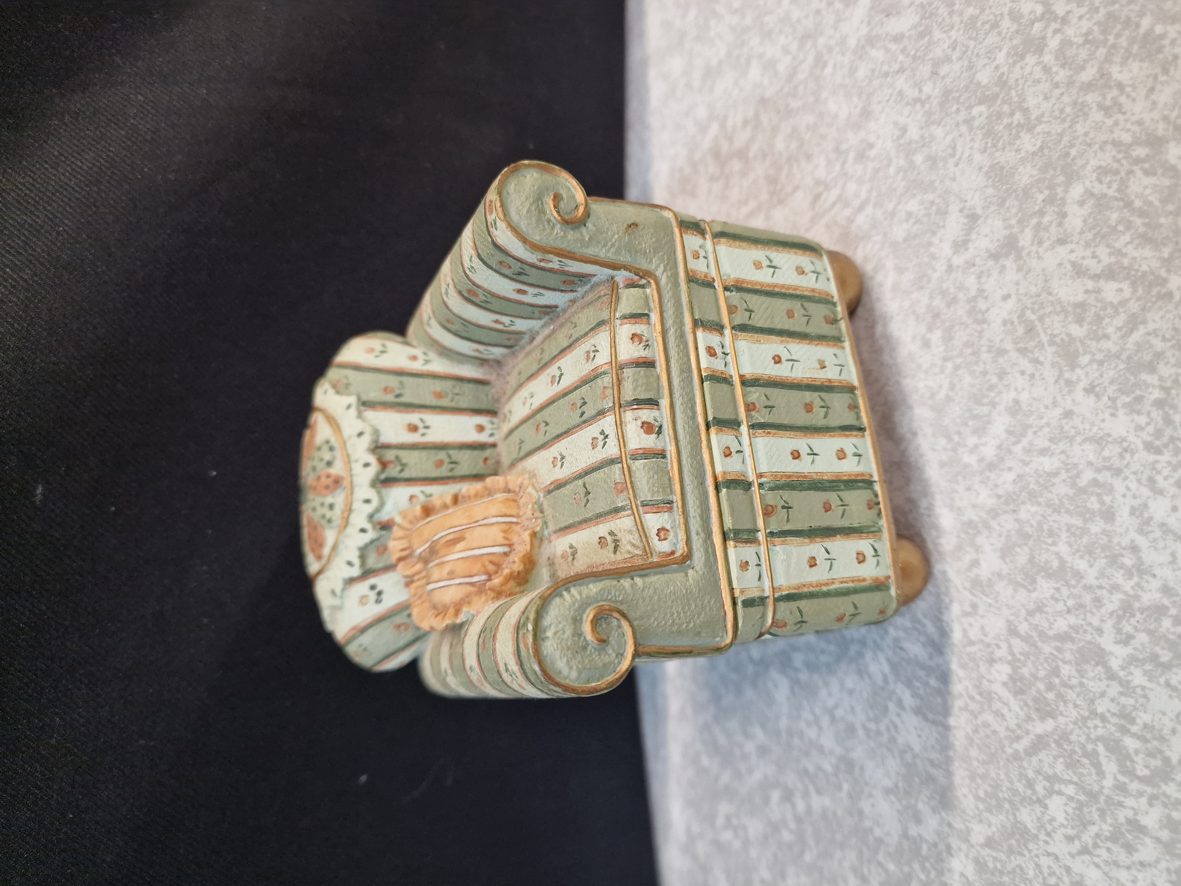 A miniature armchair-shaped trinket box featuring a green and cream striped floral pattern with gold-toned accents and a removable lid.