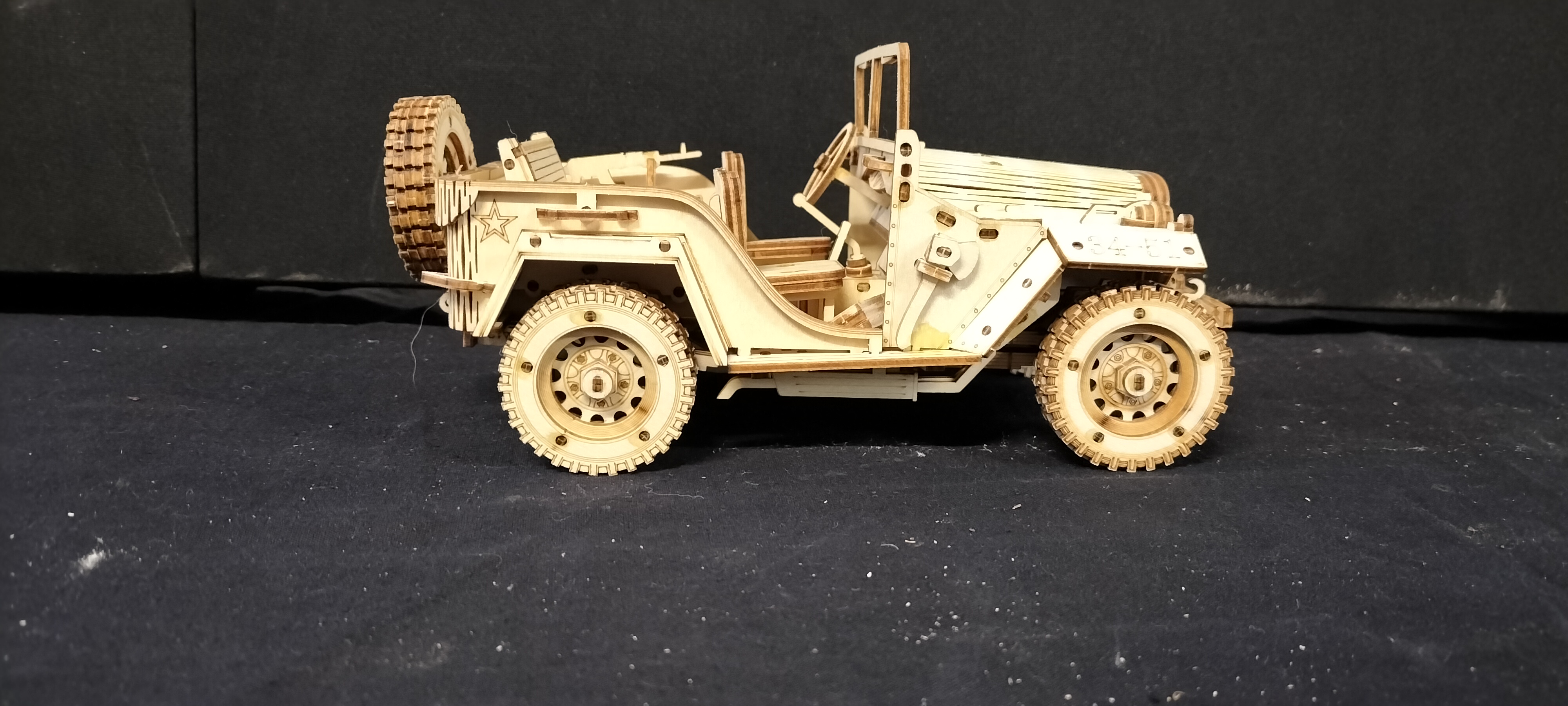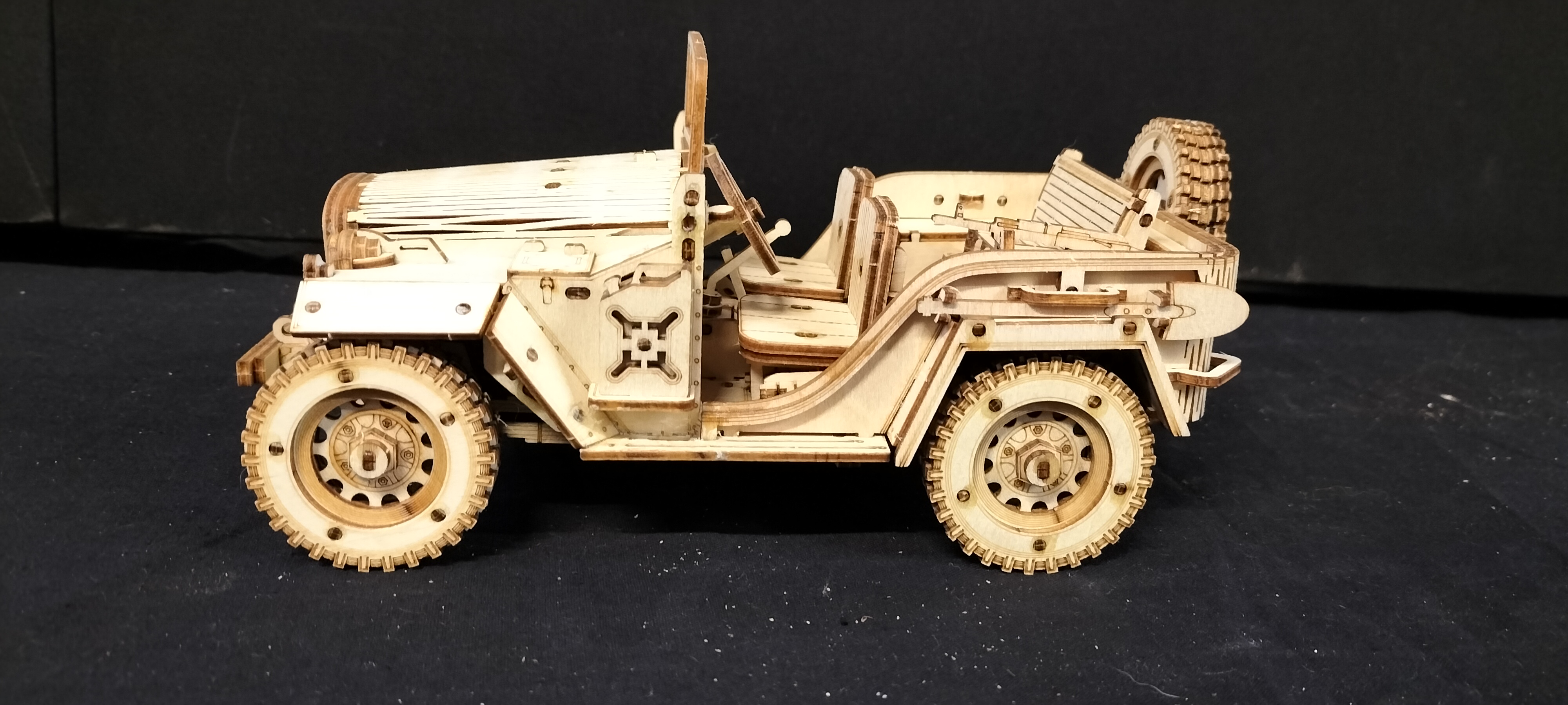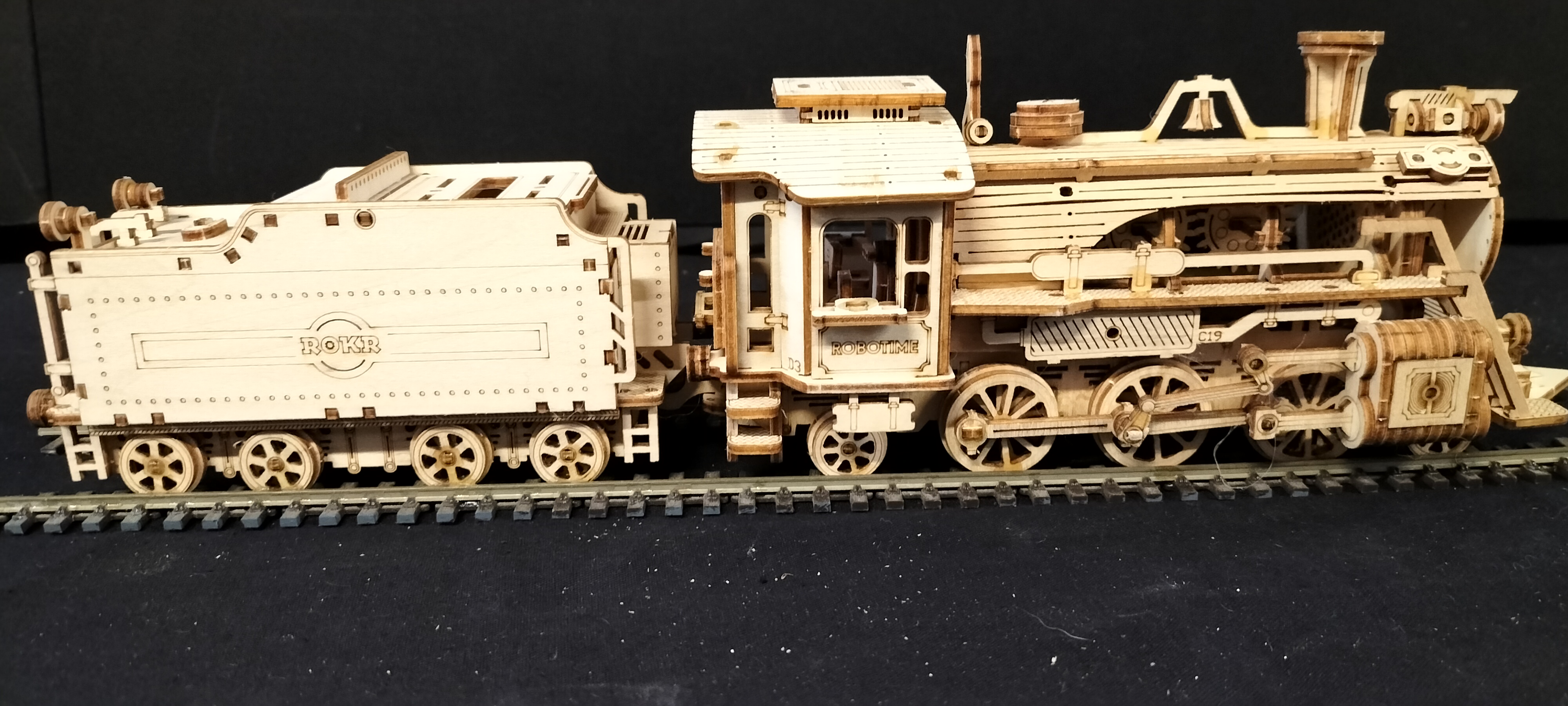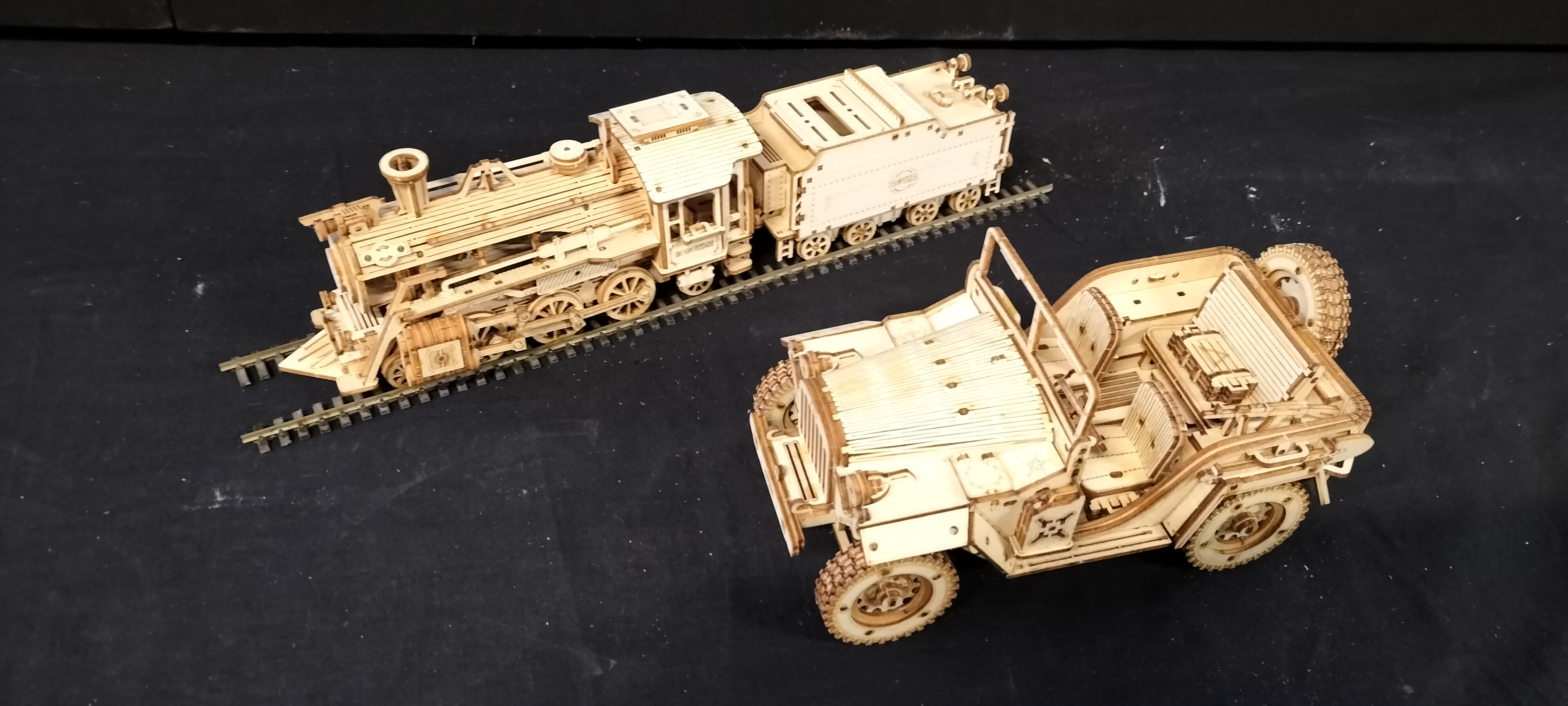 Two natural-toned wooden laser-cut models comprising a steam locomotive with tender on tracks and a military-style jeep, both featuring ROKR and Robotime branding.