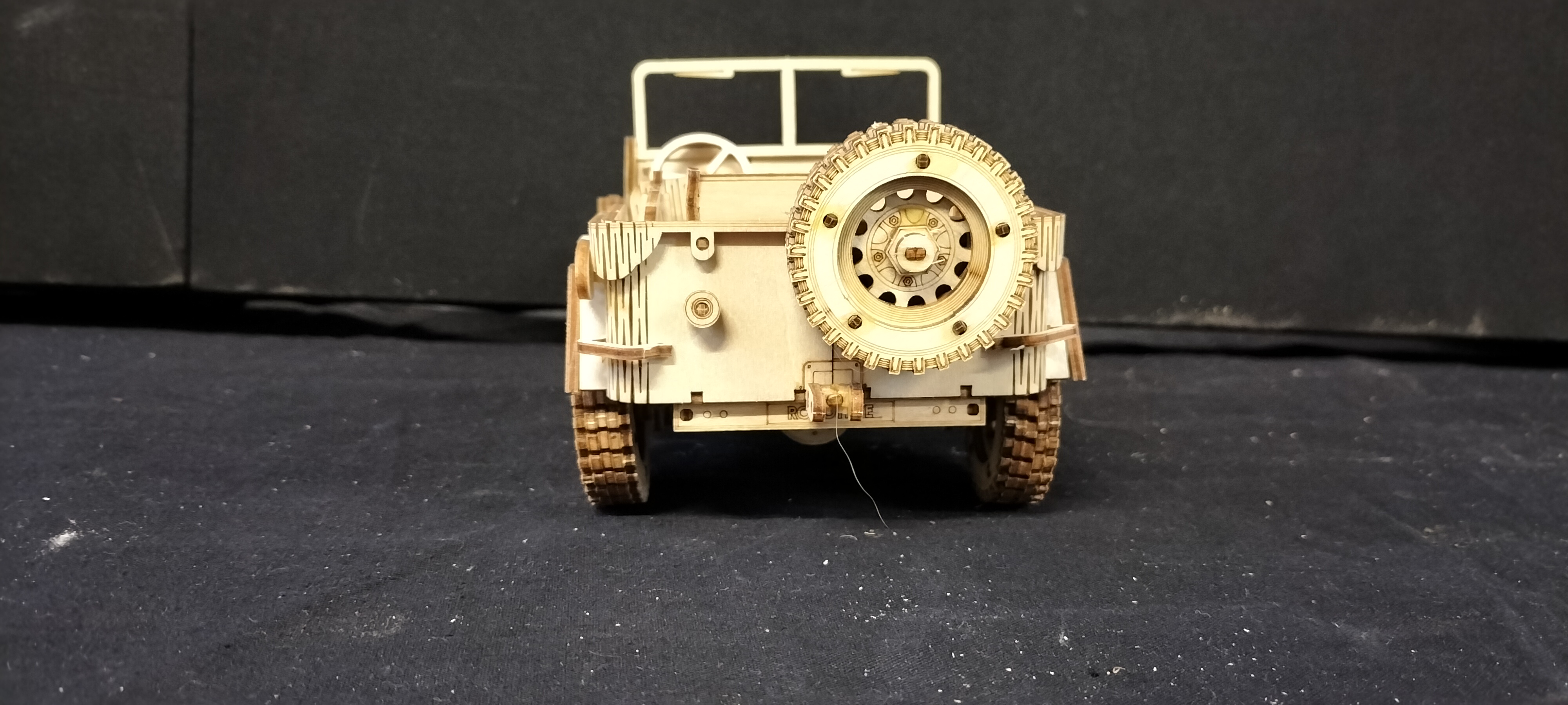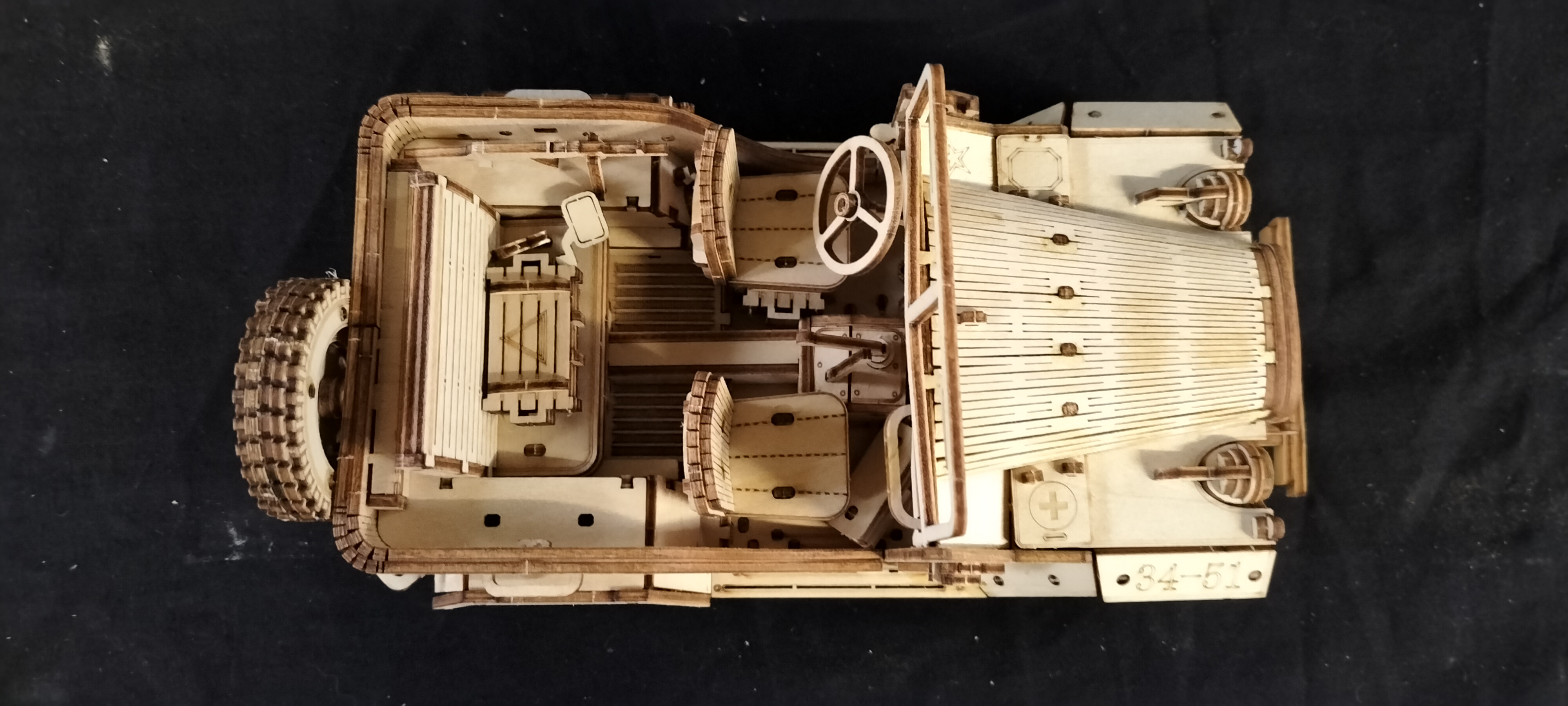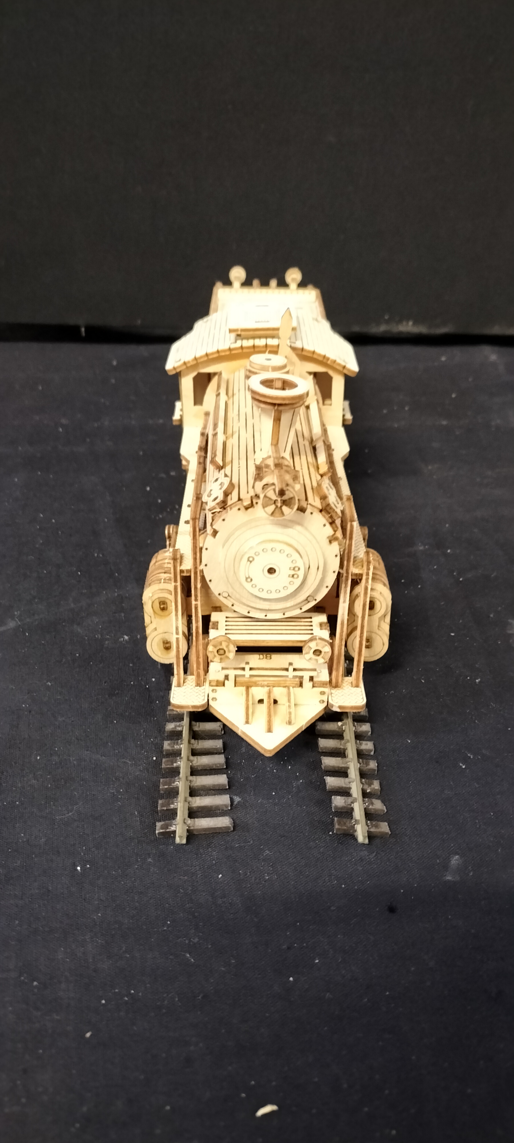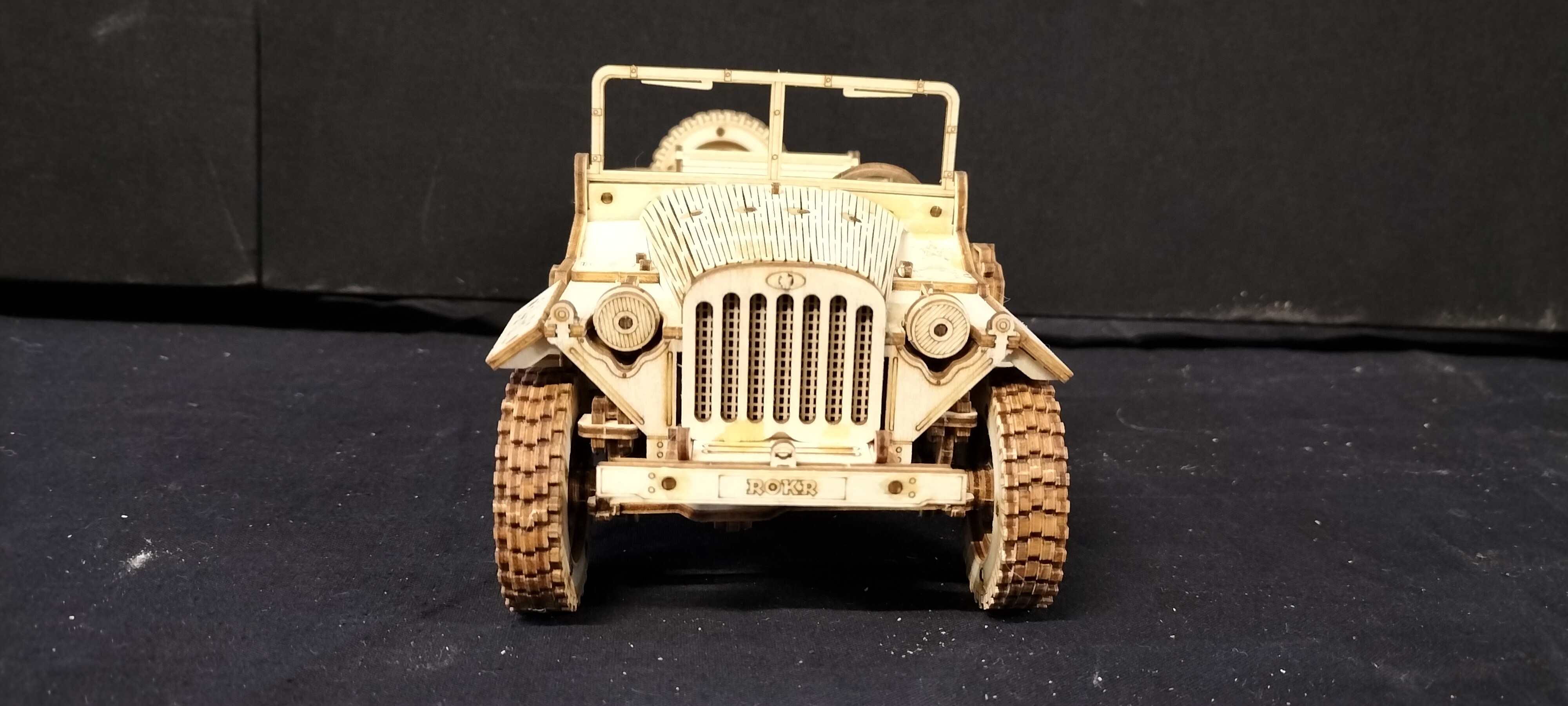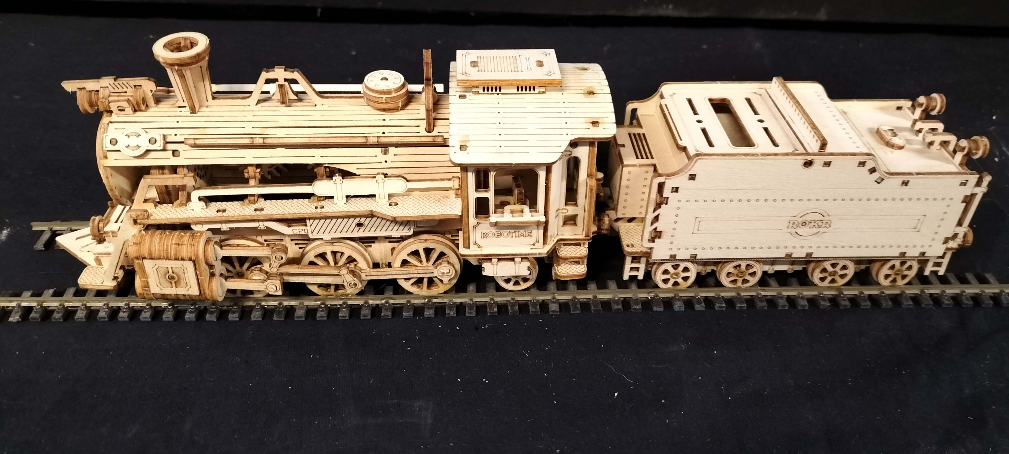 Two natural-toned wooden laser-cut models comprising a steam locomotive with tender on tracks and a military-style jeep, both featuring ROKR and Robotime branding.
