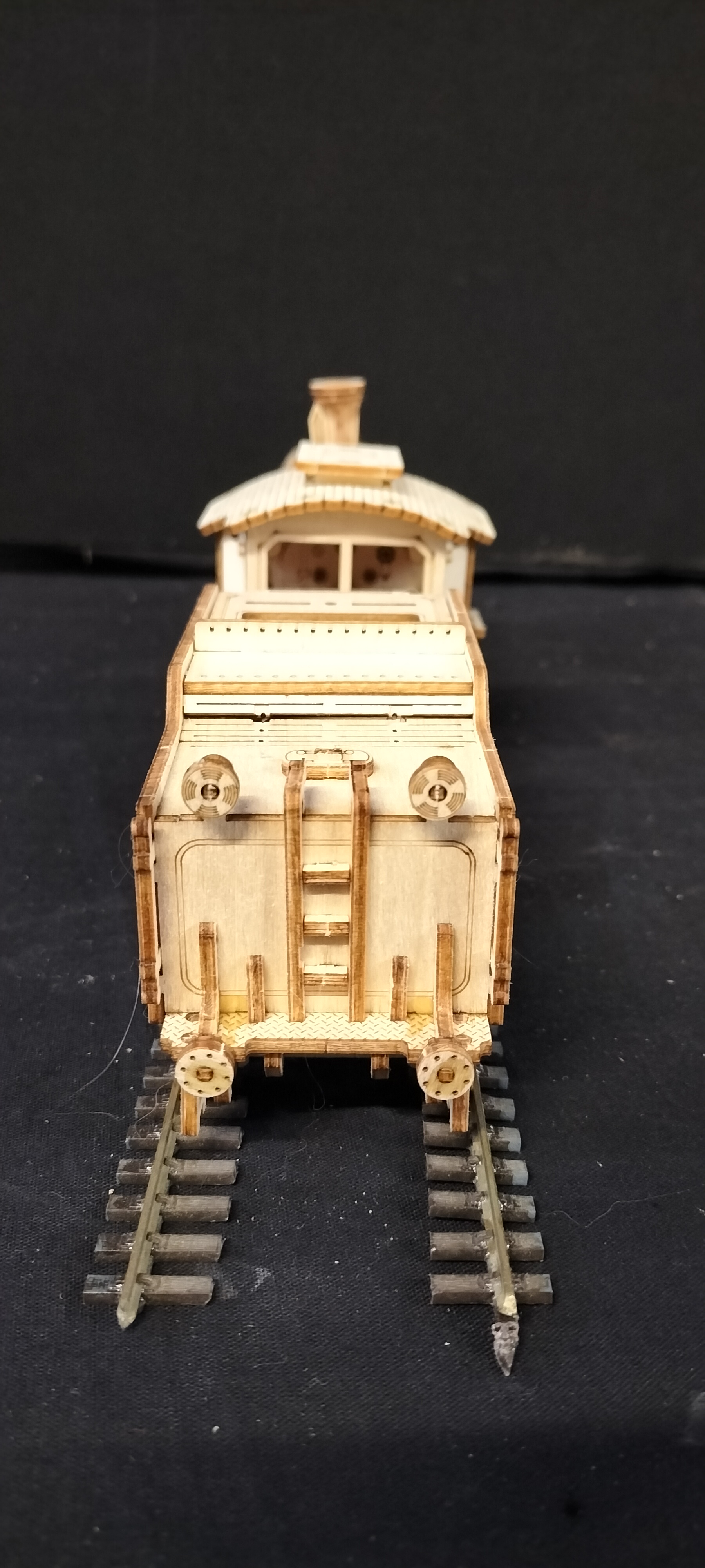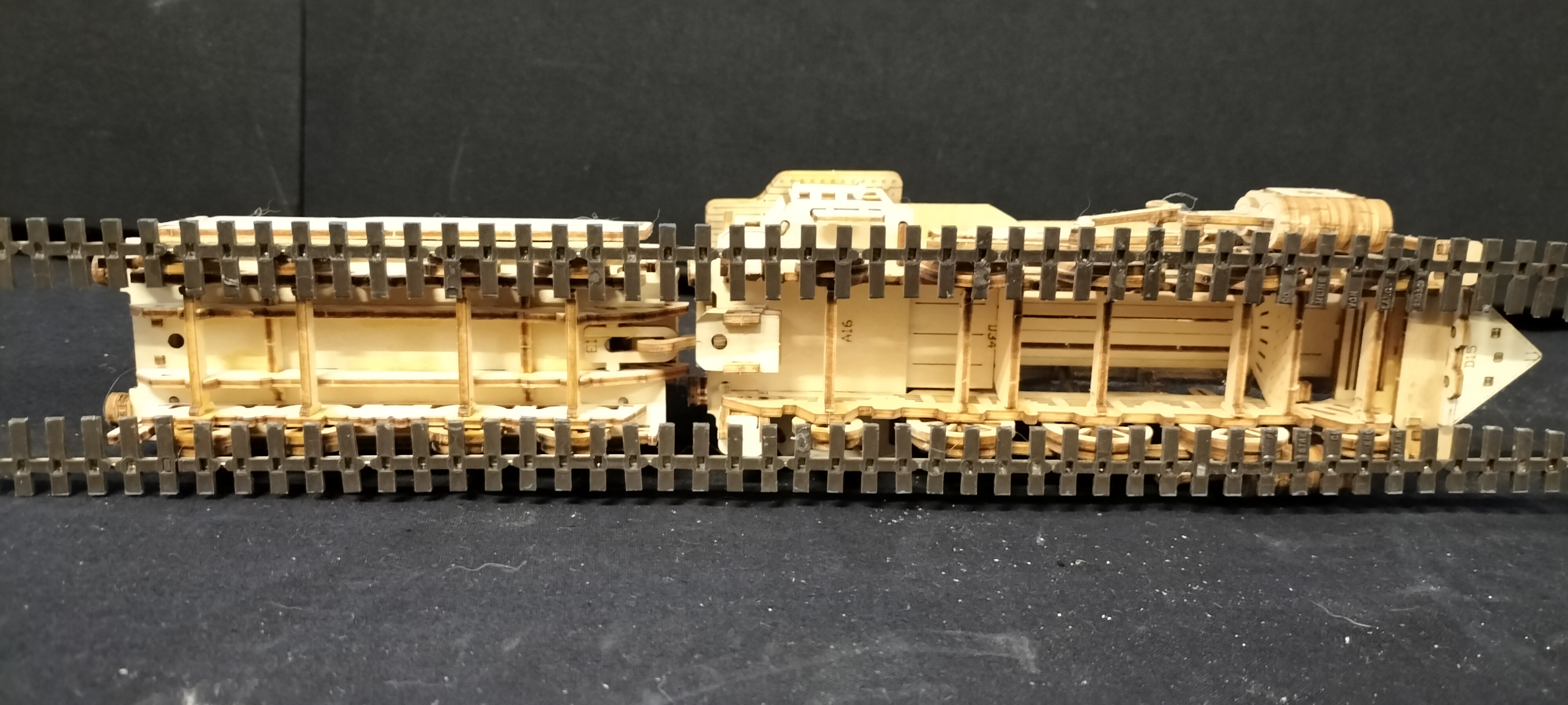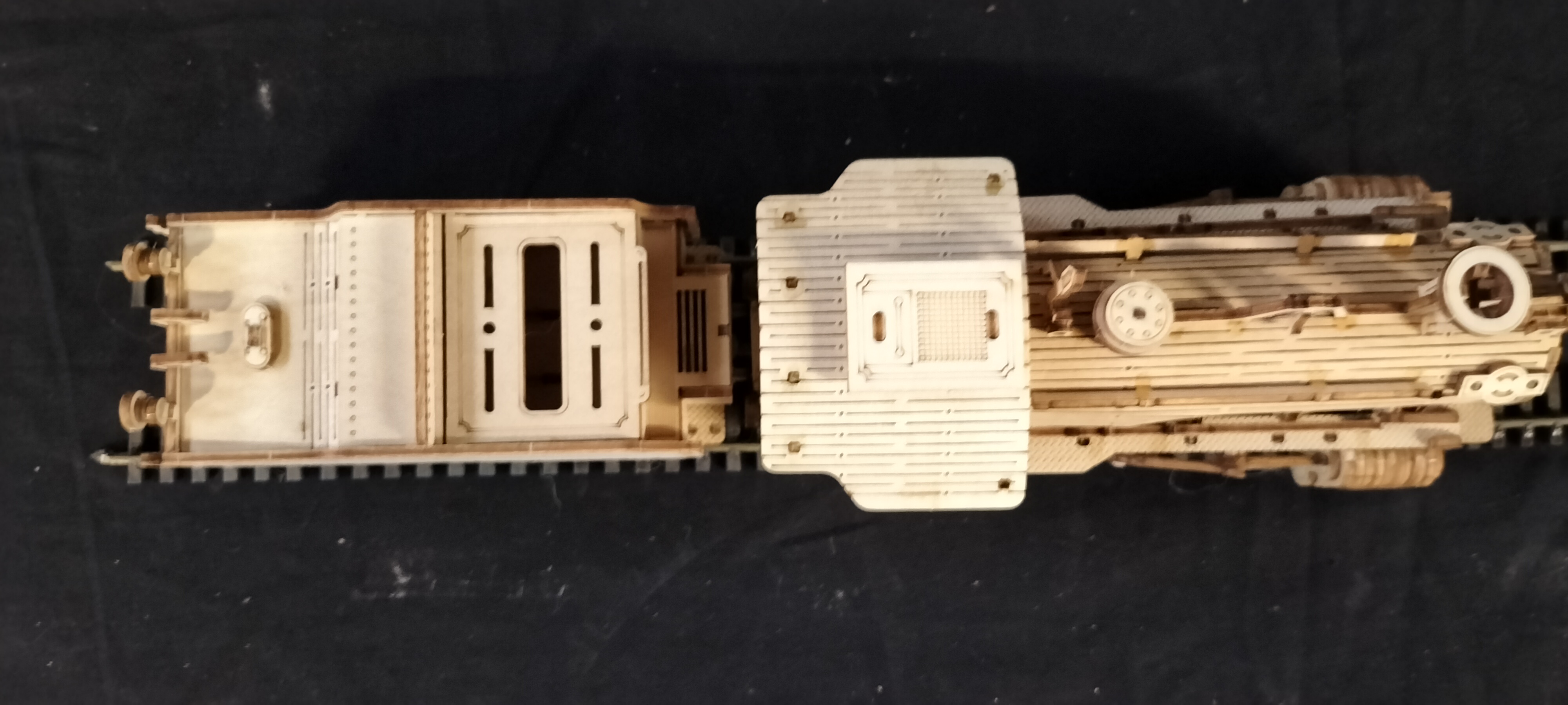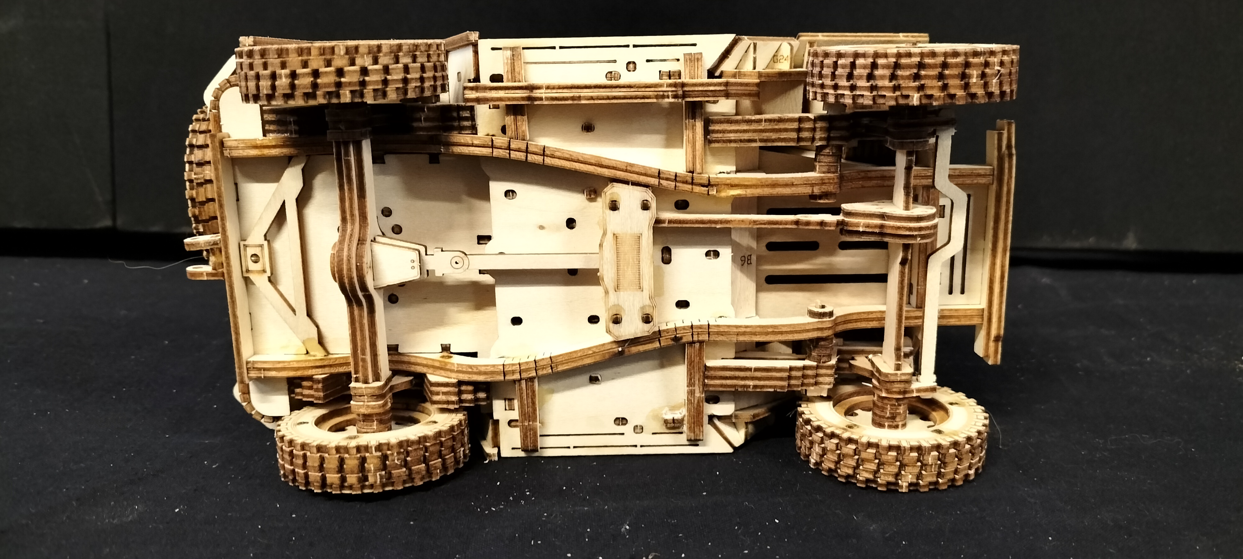 Two natural-toned wooden laser-cut models comprising a steam locomotive with tender on tracks and a military-style jeep, both featuring ROKR and Robotime branding.