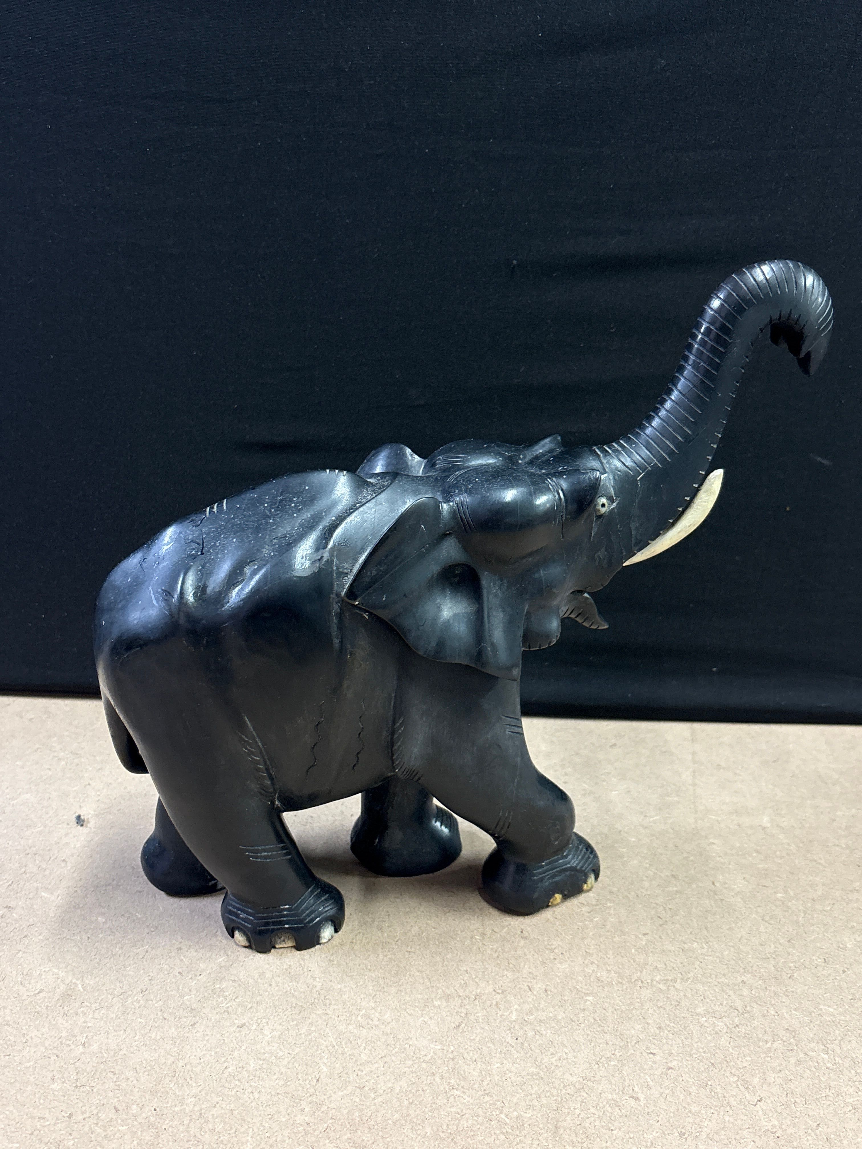 A large, hand-carved elephant figurine of African origin, expertly crafted from solid ebony wood. The sculpture features a dynamic pose with the trunk raised high, symbolising good luck and prosperity. It exhibits detailed anatomical stylisation on the ears, trunk, and feet, characteristic of mid-20th-century artisanal woodcarving. The piece includes inset light-coloured eyes and a single remaining tusk fashioned from a contrasting white material, likely bone. There are no visible maker’s marks or signatures. Dimensions: Height and length not specified.