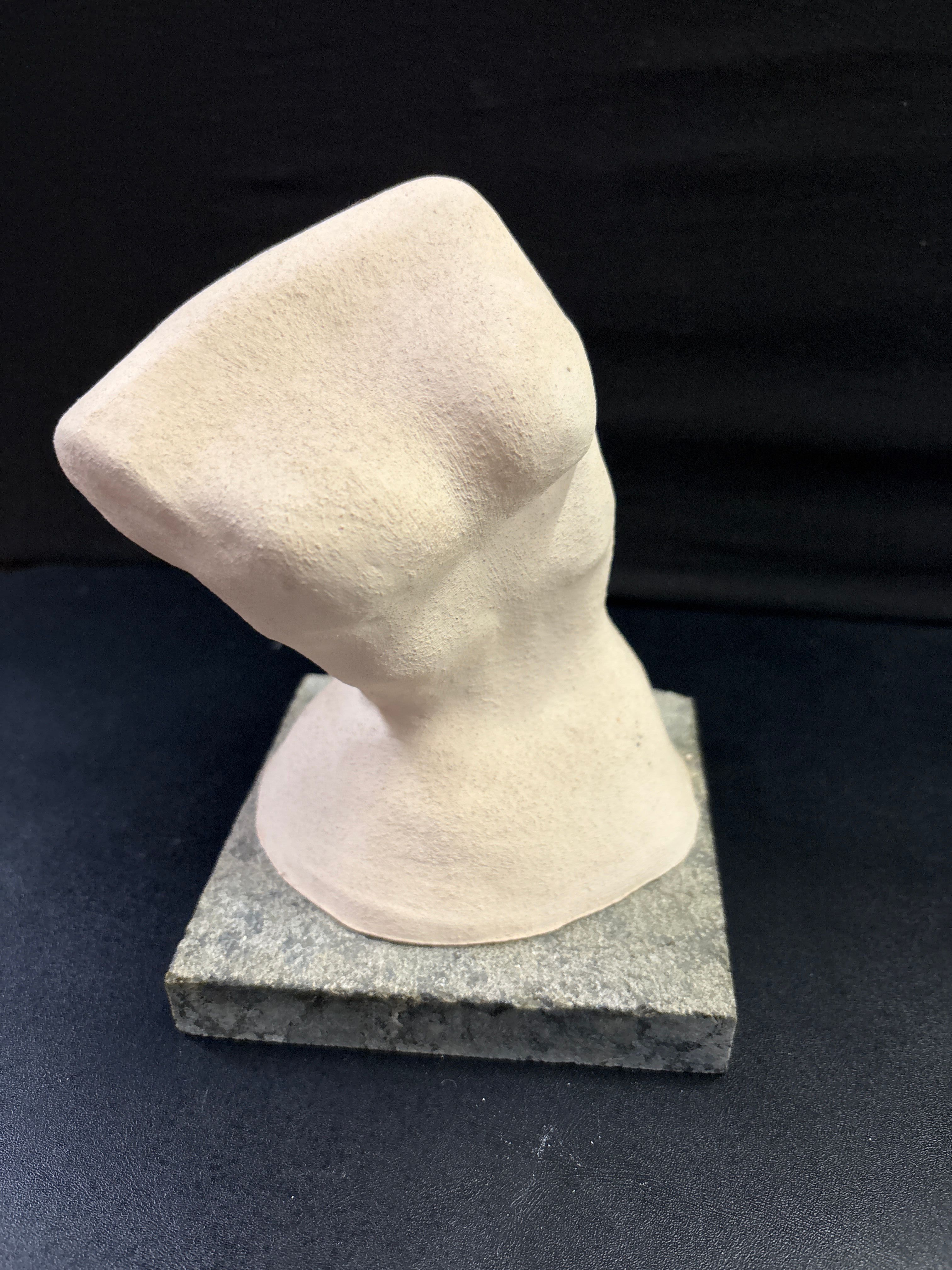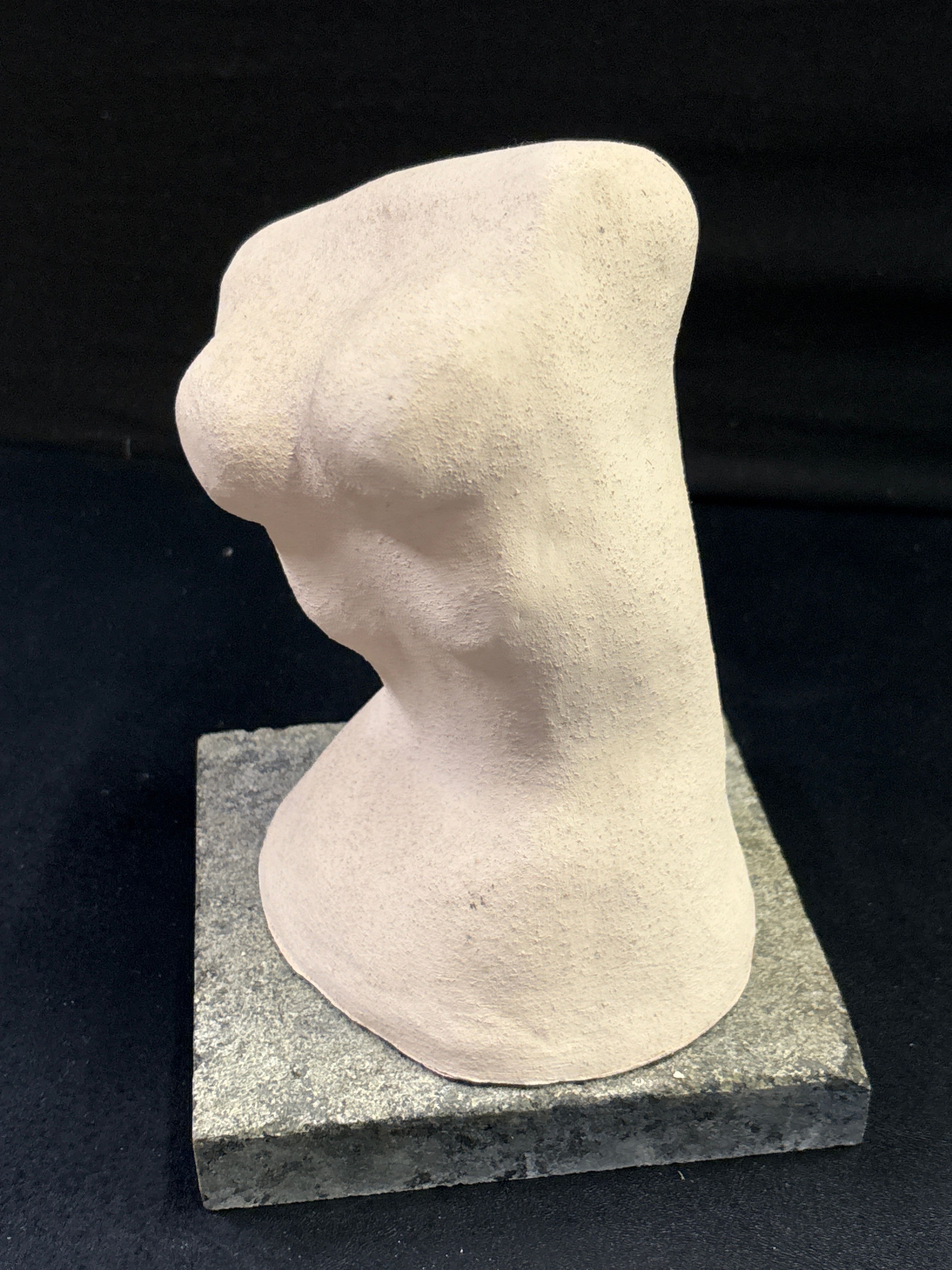 A contemporary minimalist sculpture depicting a female torso, executed in ceramic with a fine-textured, light-toned surface. The work captures the abstracted, simplified curves of the midsection and chest, reflecting a modernist sensibility that emphasises essential form. The torso is mounted horizontally onto a separate square, dark grey speckled stone plinth with a honed finish. No artist’s signature, foundry marks, or edition numbers are visible on the piece. 15 cm x 18 cm x 12 cm