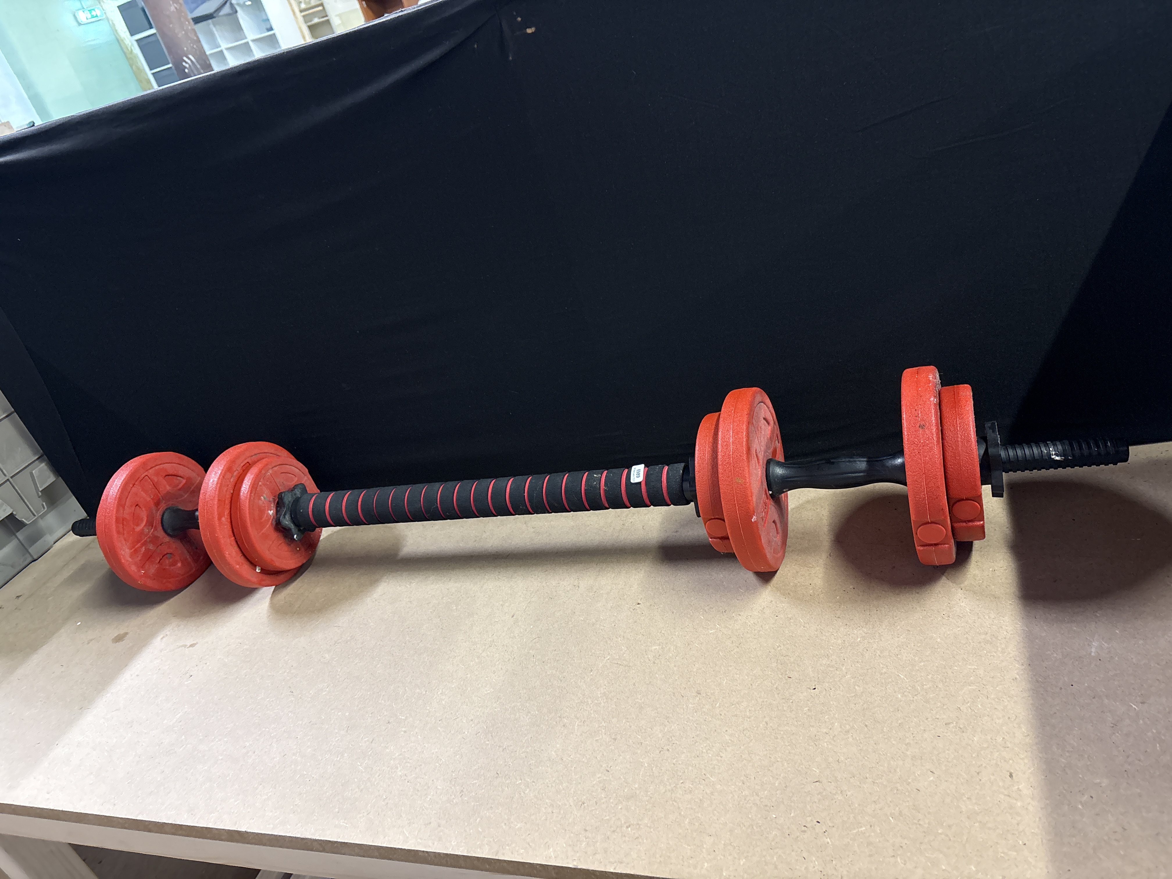 This lot consists of a modular home fitness system attributed to Soozier, designed for versatile strength training. The set is engineered to function as both independent dumbbells and a full-length barbell via a central foam-padded connecting sleeve. The weight plates are constructed with a durable red plastic exterior and are sand-filled. The assembly features a black and red colour scheme with a textured foam grip at the centre for ergonomic handling. The plates are secured using black plastic spin-lock collars on threaded bar ends. While no manufacturer branding is embossed on the items, the design is consistent with contemporary 4-in-1 adjustable weight sets. A small white inventory or identification sticker is affixed to the padded bar.