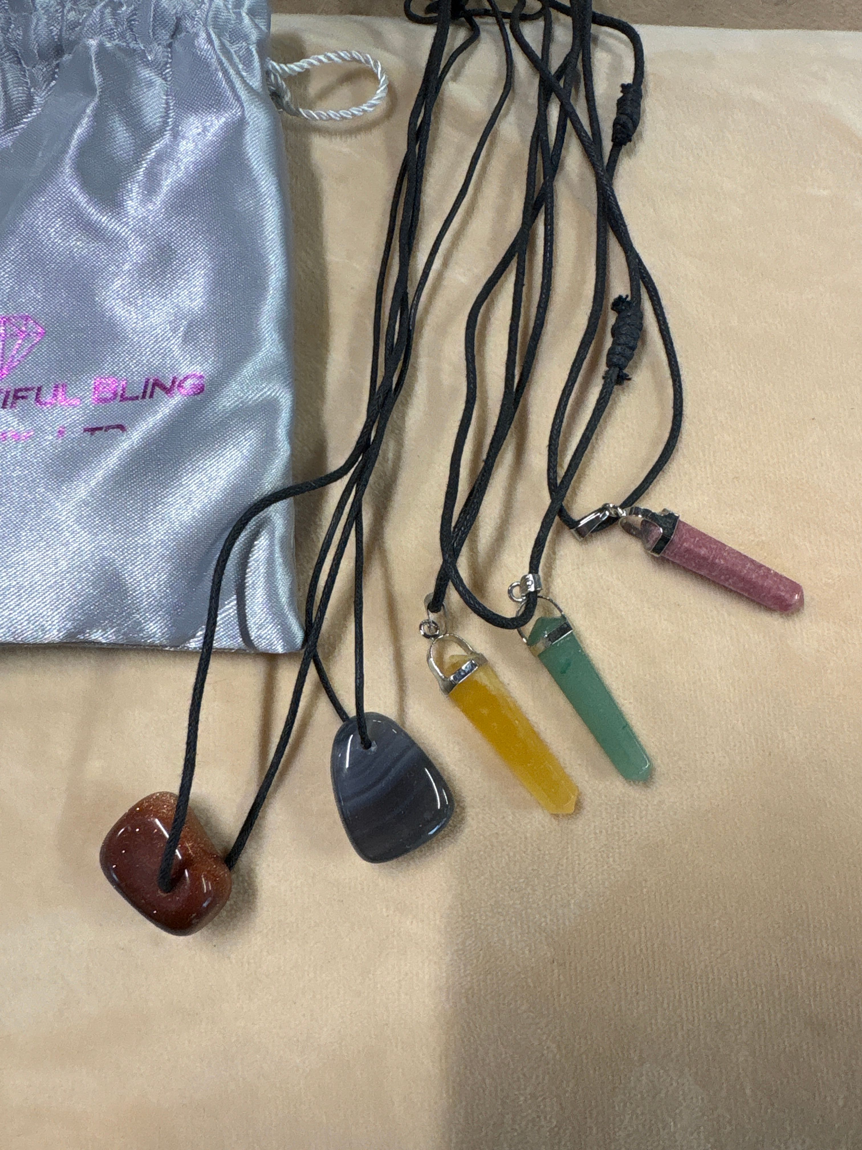 A collection of five crystal pendant necklaces. The set includes three hexagonal point (obelisk) cut crystals in shades of mottled pink, semi-translucent green, and opaque yellow, each mounted in silver-tone base metal bails with bail loops for detachment. Additionally, there are two tumbled and polished stones, including a dark grey banded agate and a reddish-brown goldstone, both featuring drilled holes. Each pendant is suspended from a simple black fabric cord in a rope style. The necklaces are accompanied by a silver-tone satin drawstring pouch branded Beautiful Bling with a diamond logo. No hallmarks are present. Length: Adjustable. Pendant length: 30mm – 35mm.