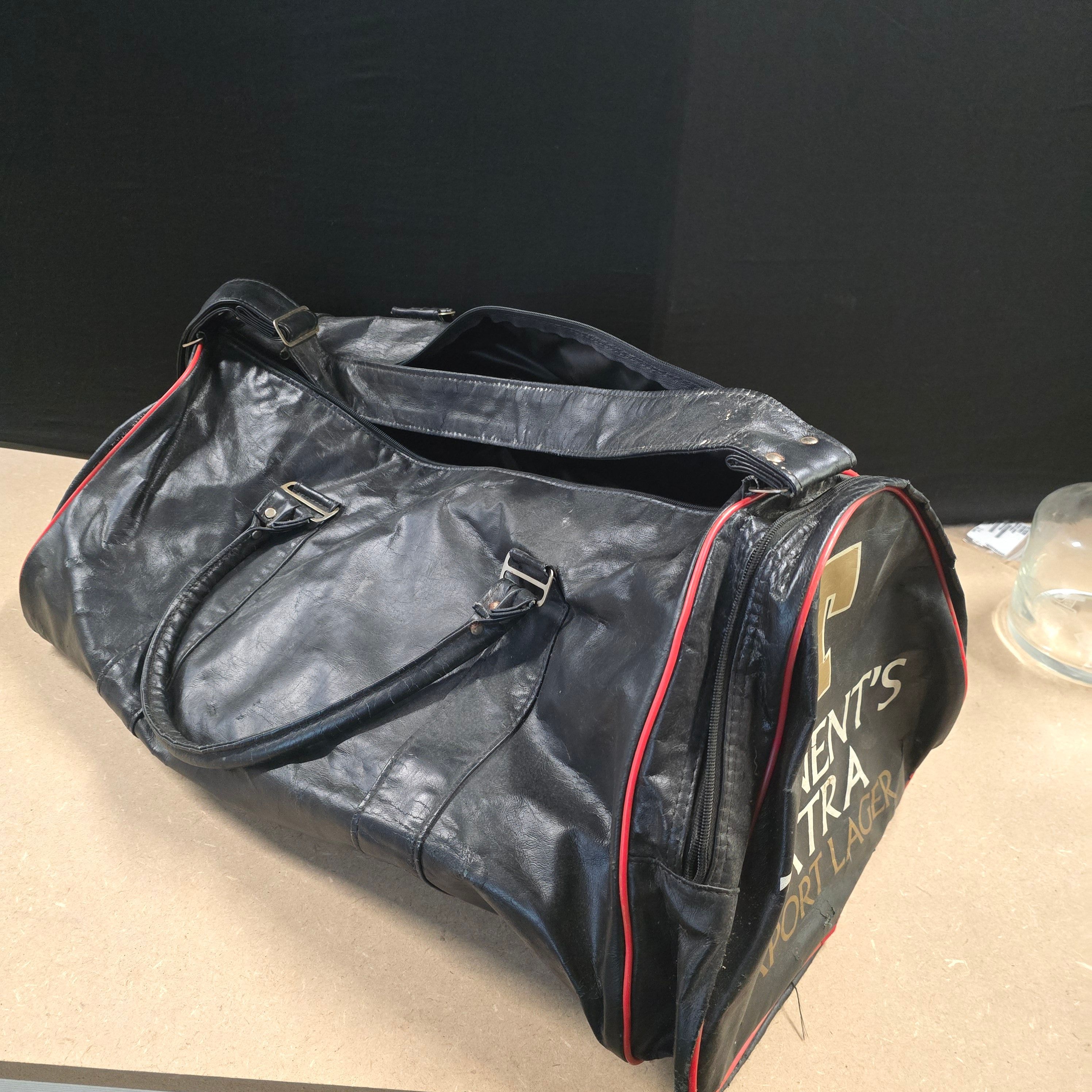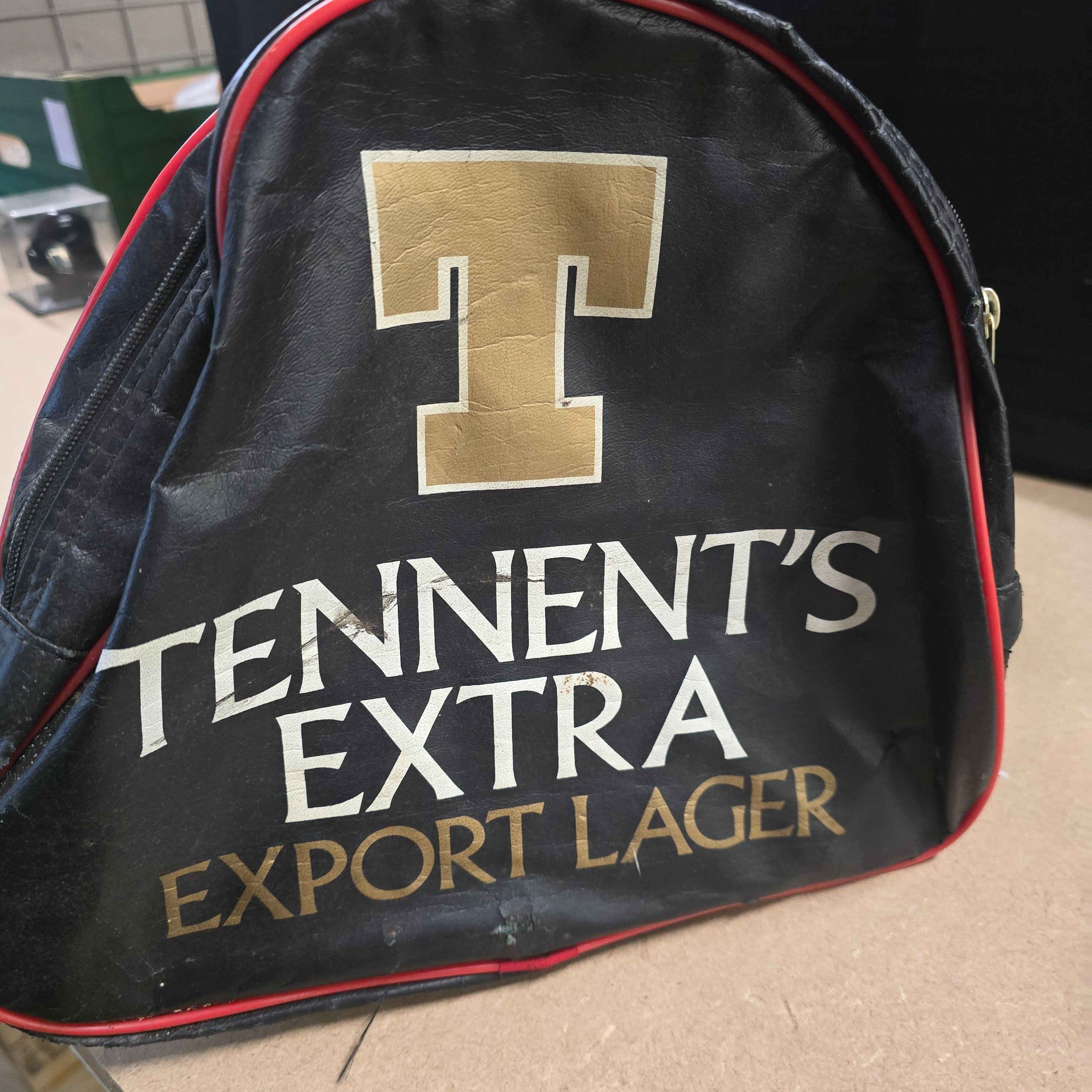 An original promotional holdall for Tennent Caledonian Breweries, manufactured from black faux-leather vinyl with contrasting red plastic piping and metal hardware. The end panel features a large screen-printed gold Tennent’s T logo alongside the text TENNENT’S EXTRA EXPORT LAGER in white and gold sans-serif typography. This item dates from the 1980s to the early 1990s and is a genuine piece of vintage brewing memorabilia. Dimensions: 48cm x 26cm x 26cm.