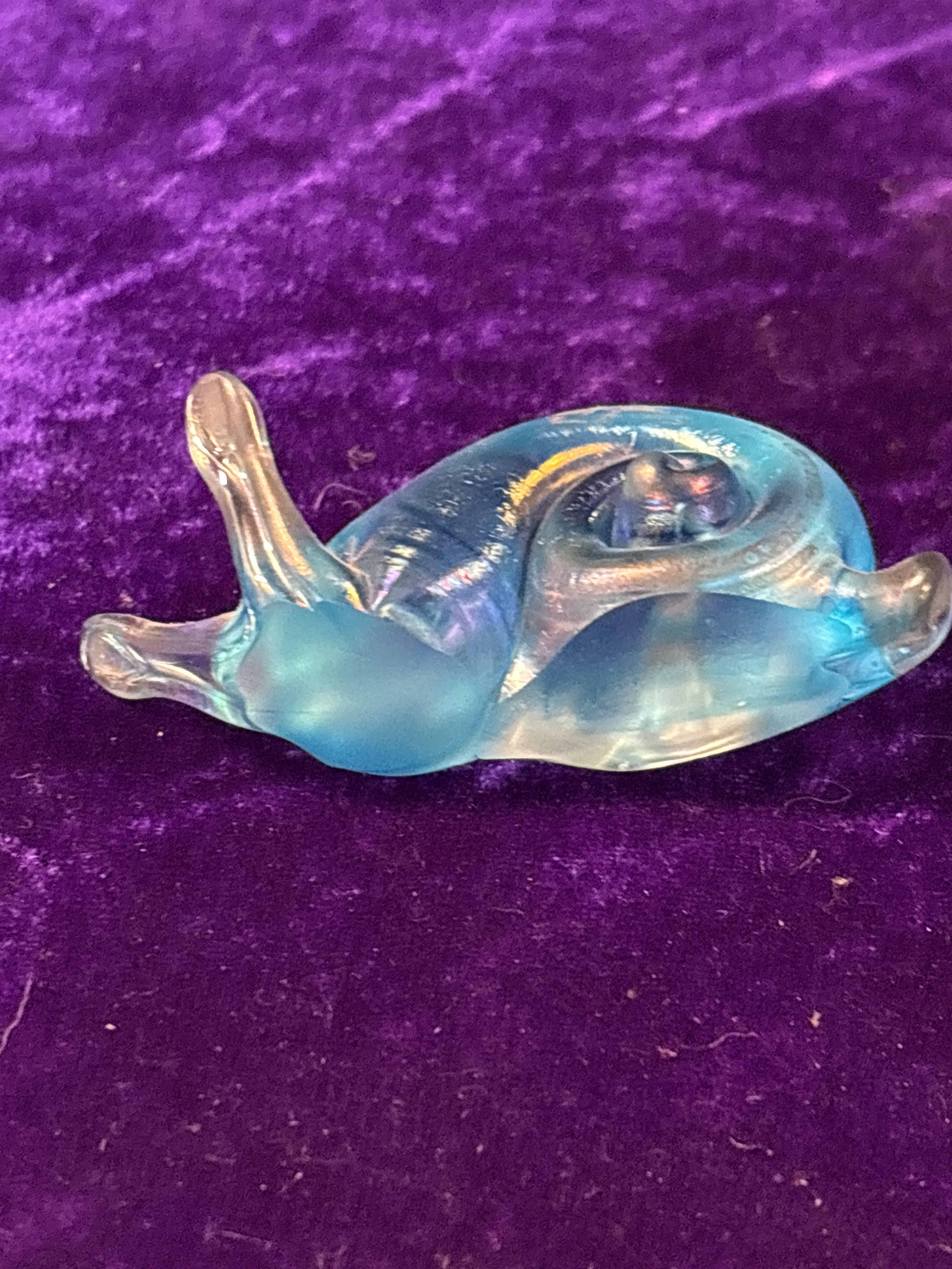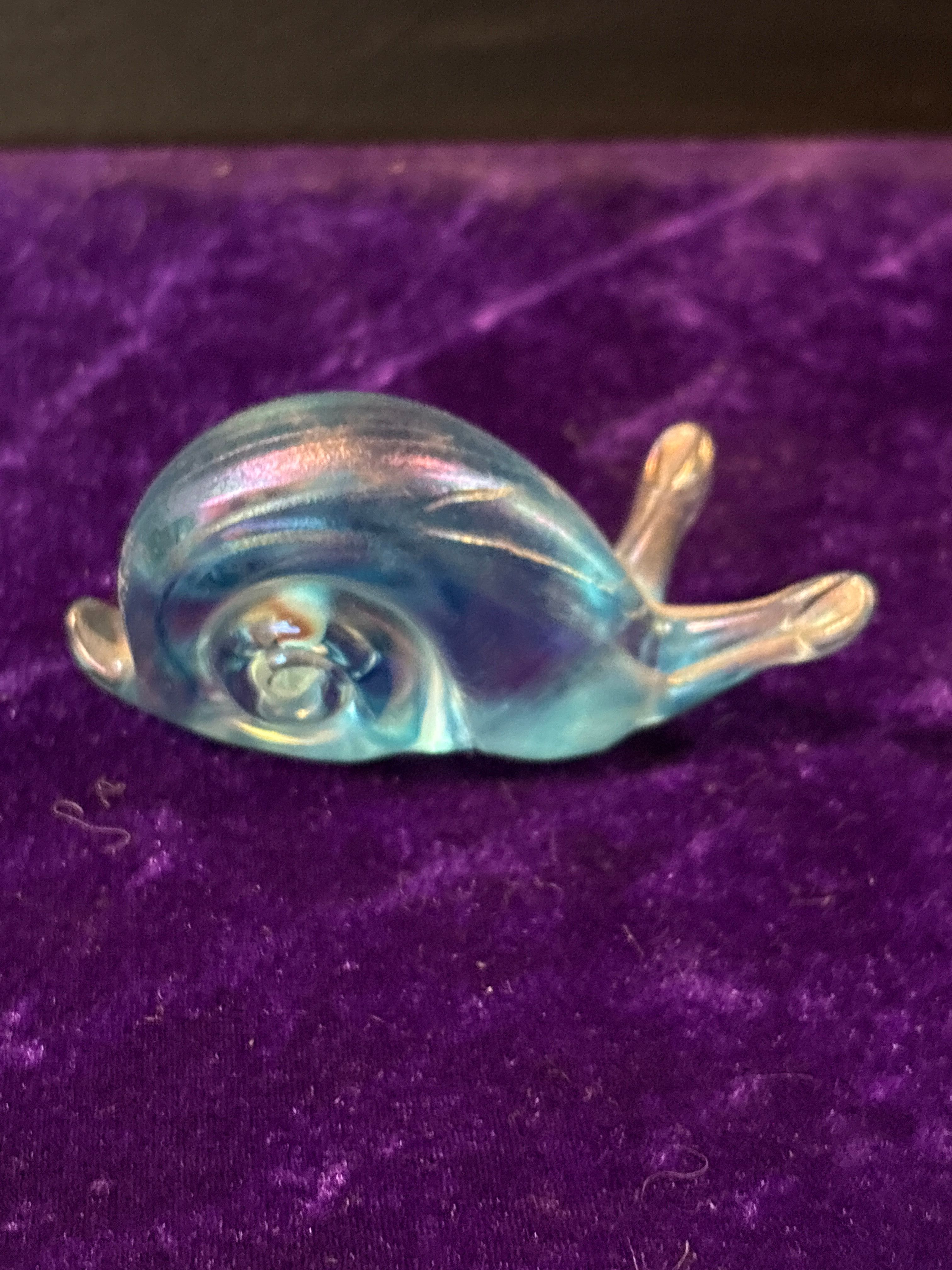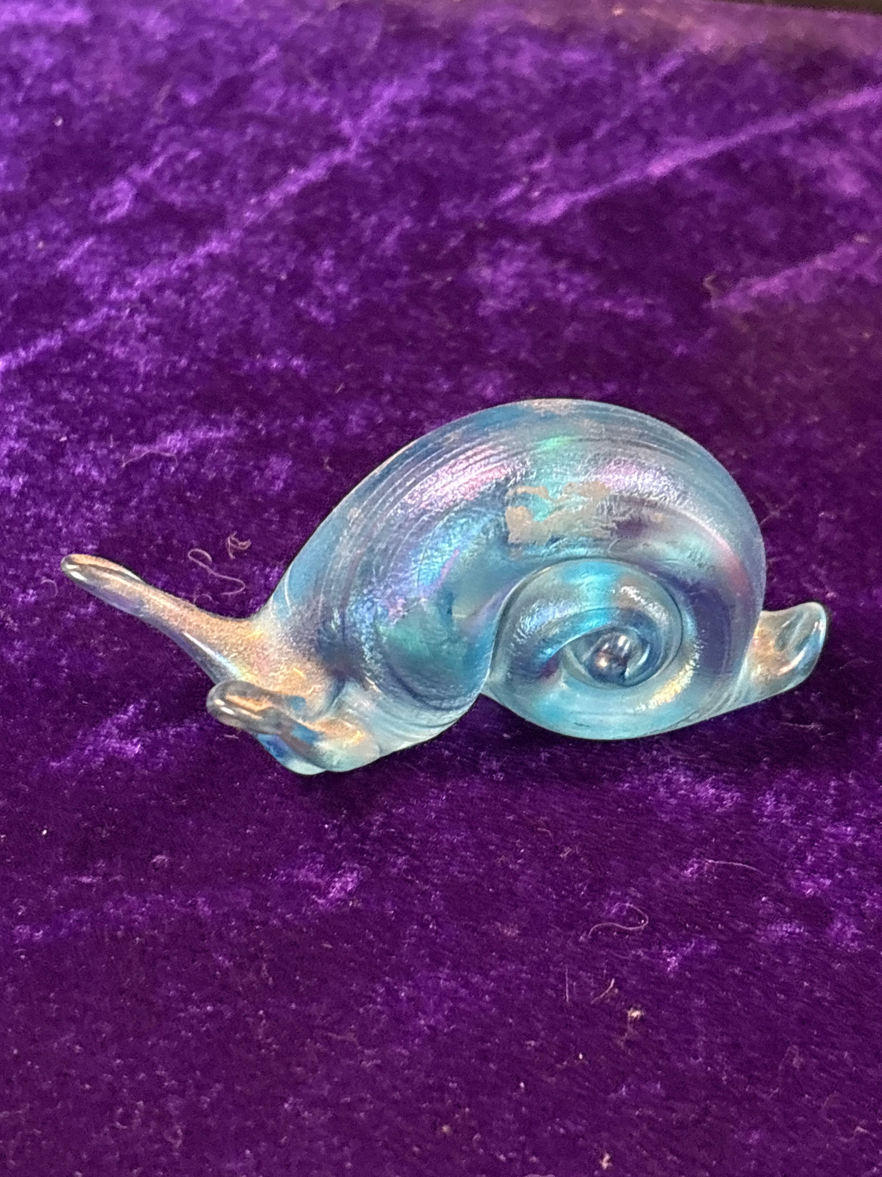 A small, hand-formed studio art glass figurine depicting a stylised snail or aquatic creature. The piece is executed in translucent aqua-blue glass, featuring a tightly coiled spiral body with three integral protruding appendages. The surface is finished with an all-over metallic iridescence, reflecting a spectrum of colours typical of the Art Nouveau tradition. This paperweight demonstrates a fluid, organic form characteristic of late 19th and early 20th-century glassmaking aesthetics. No maker’s marks, signatures, or pontil marks are present. Dimensions: Approximately 7.5 cm x 9 cm.