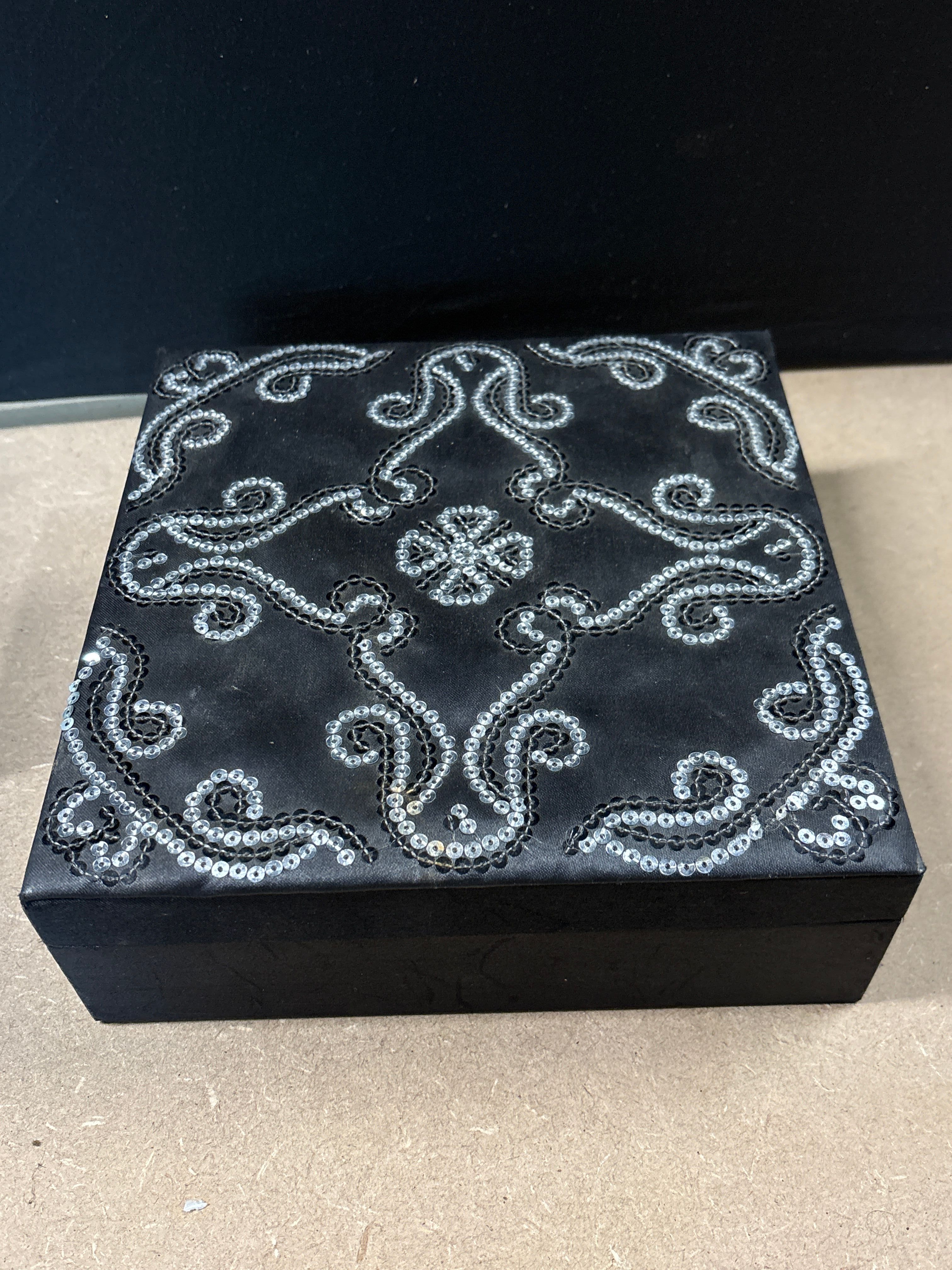 A single lot comprising a collection of assorted contemporary costume jewellery contained within a decorative jewellery box. The pieces include necklaces, bracelets, rings, and decorative hair or clothing accessories. Materials consist of simulated pearls, faceted glass and acrylic beads in various colours, silver and gold-toned metal chains, and rhinestone-set components. One item retains a small identification tag. The jewellery box is finished in a black satin-like fabric, with the lid featuring an ornate, symmetrical scrollwork pattern rendered in silver-toned sequins. The interior of the box is fabric-lined and includes a small square mirror on the underside of the lid.