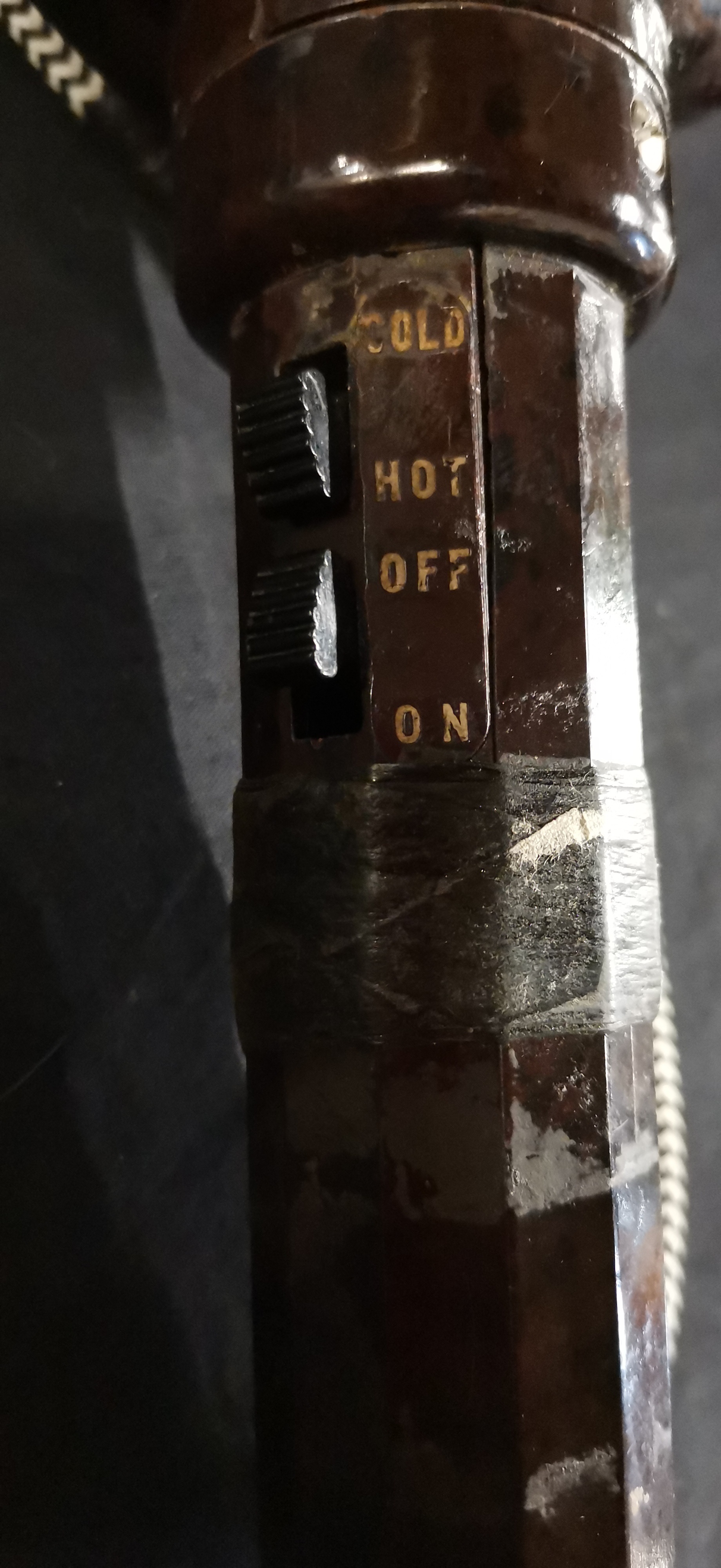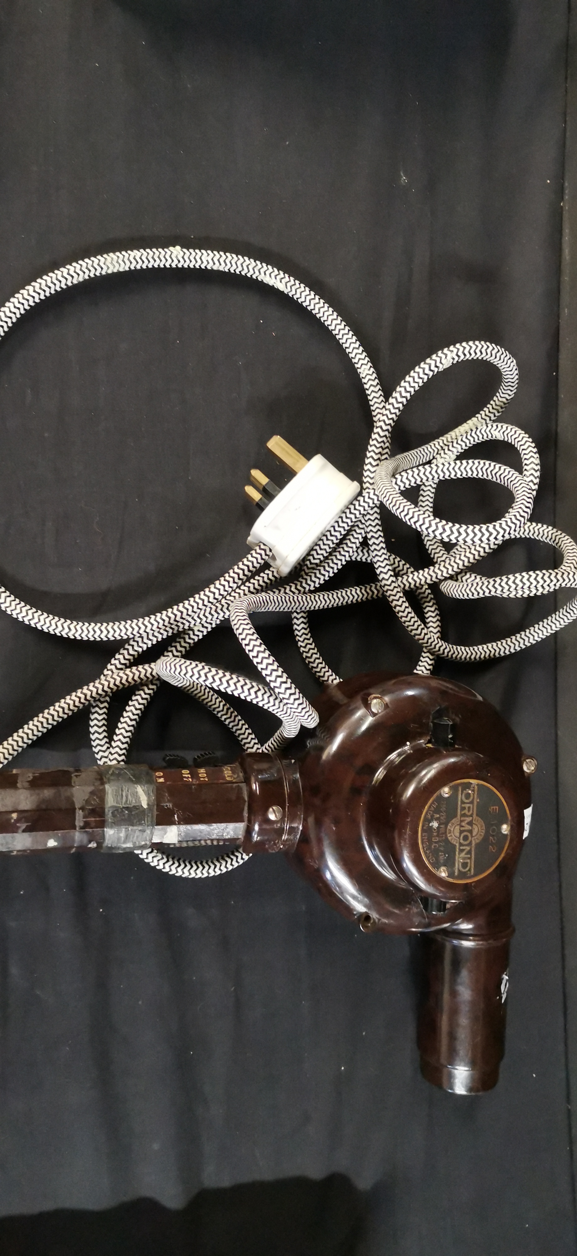 A vintage brown Bakelite hair dryer by Ormond featuring a black and white chevron cord and a white three-pin plug.