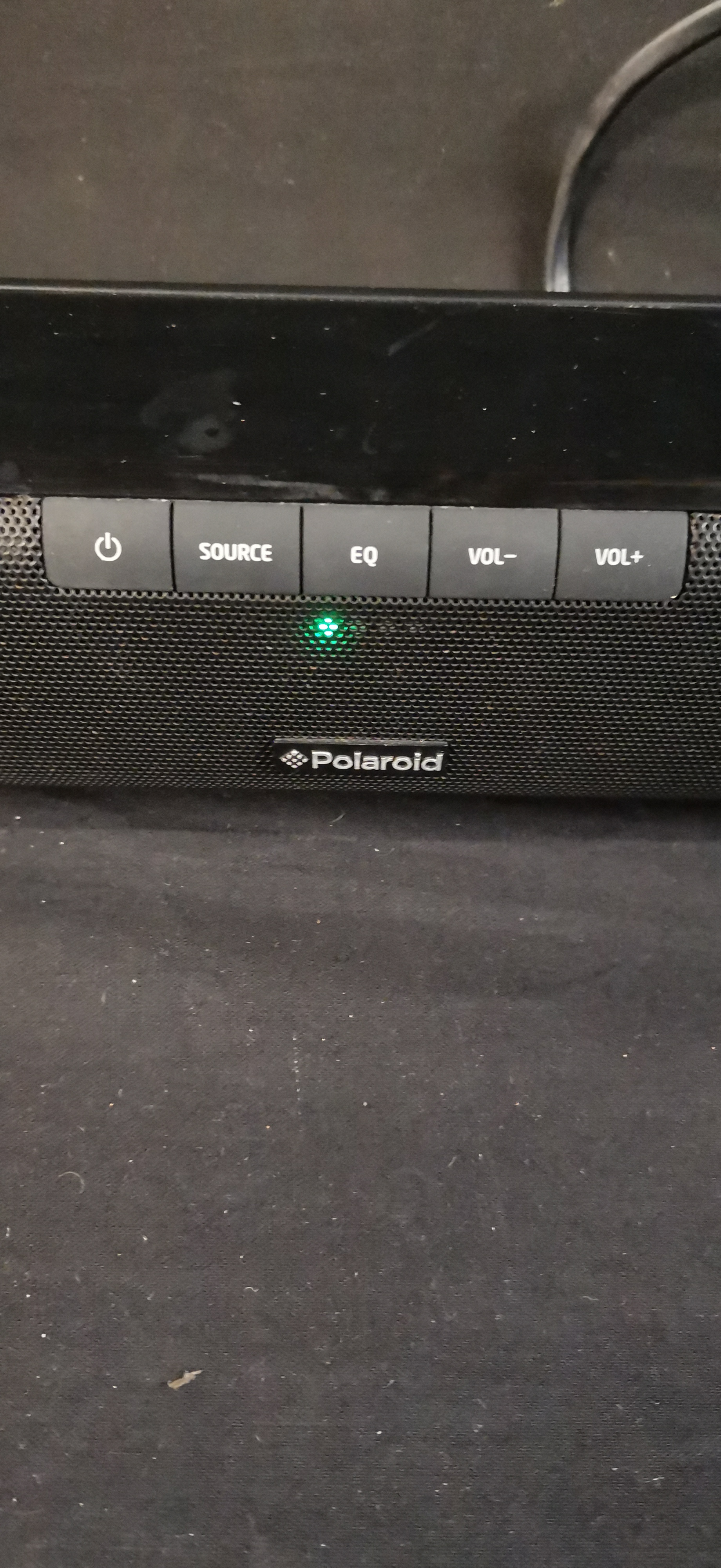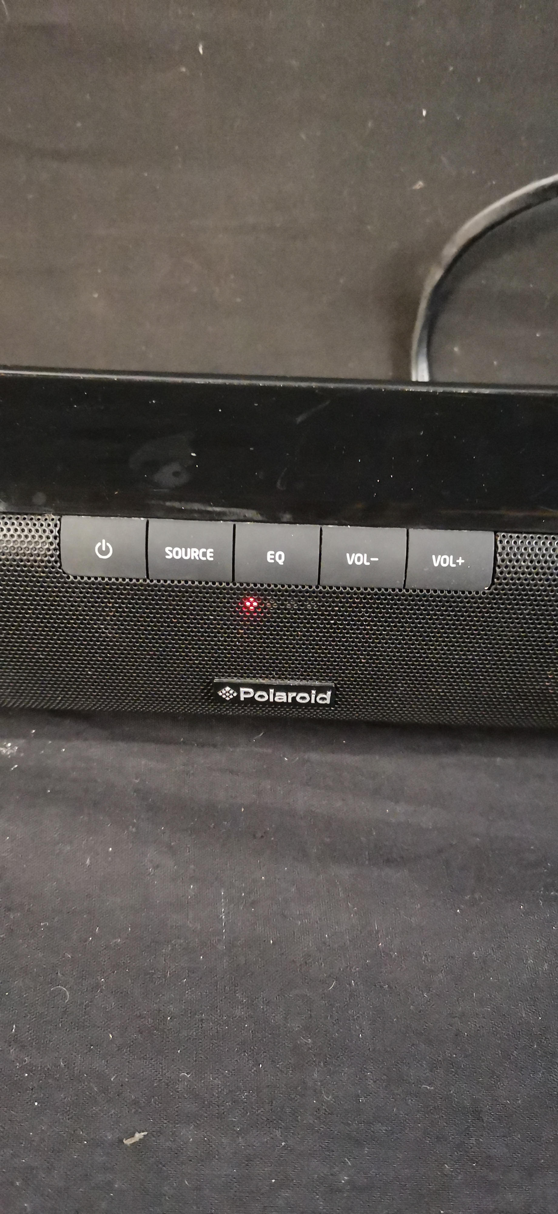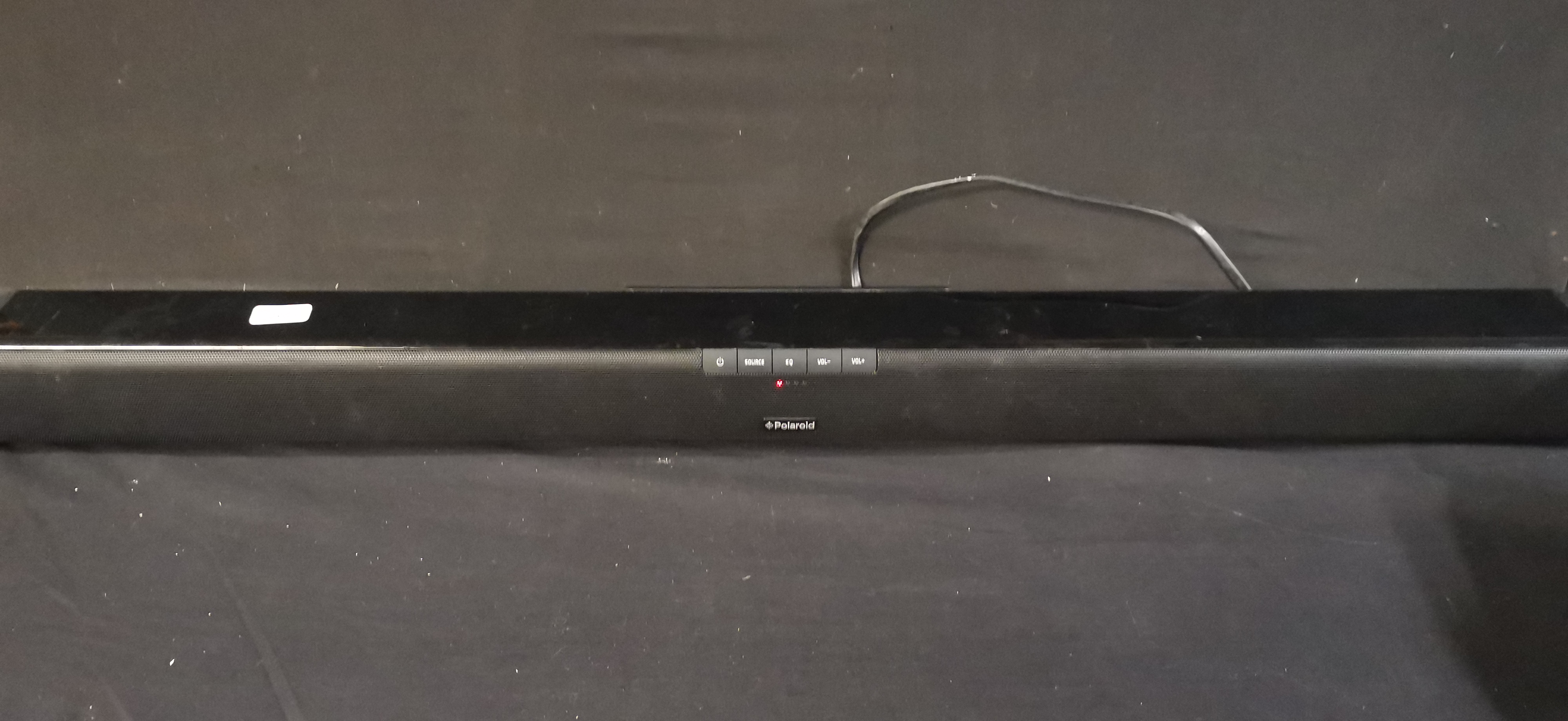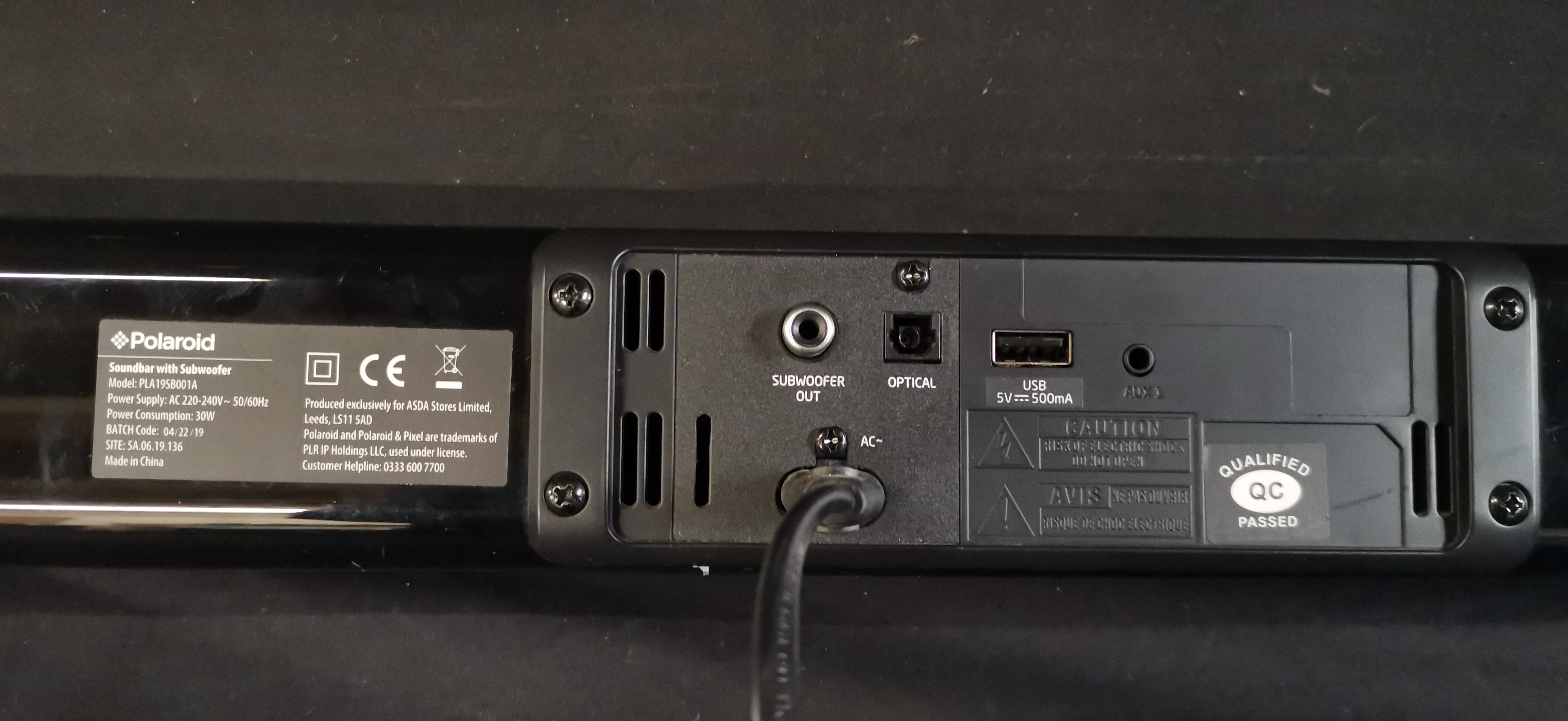 A black Polaroid soundbar model PLA19SB001A featuring front-mounted controls and rear connectivity including optical, USB, and subwoofer output ports.