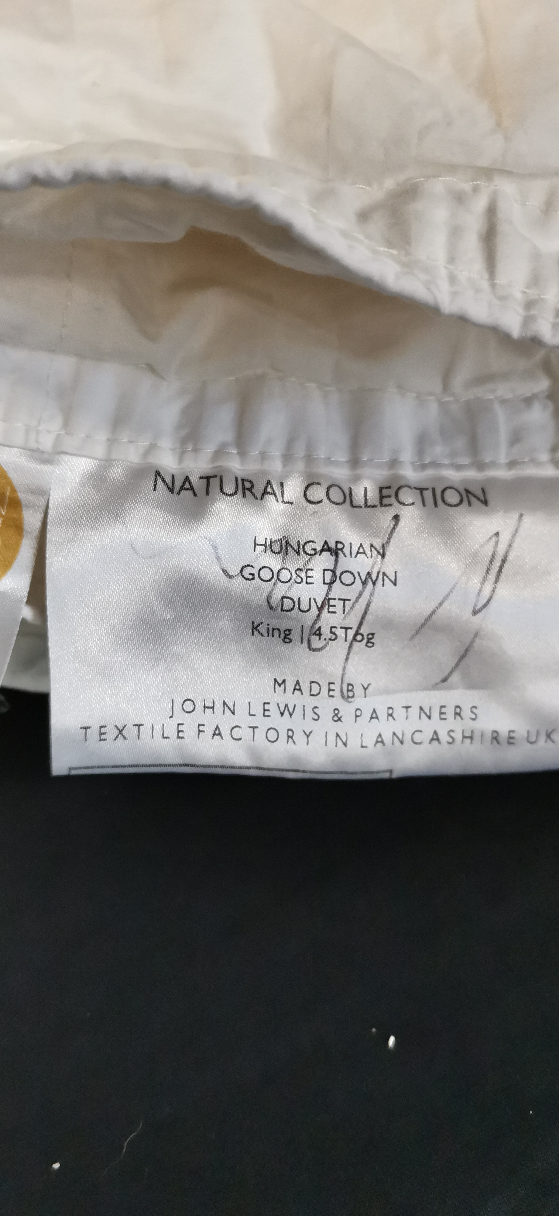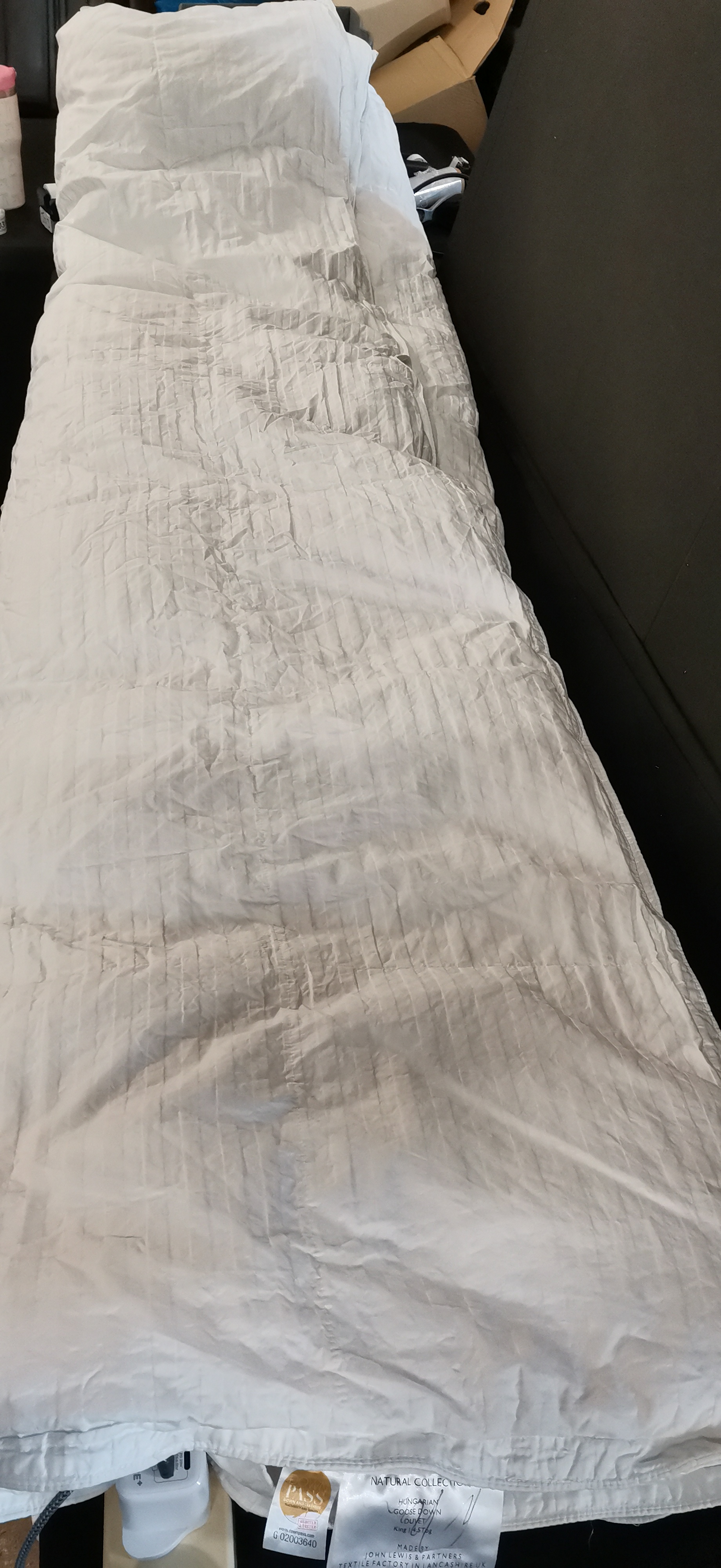 A white king size Hungarian goose down duvet from the Natural Collection with a 4.5 tog rating, manufactured in Lancashire.