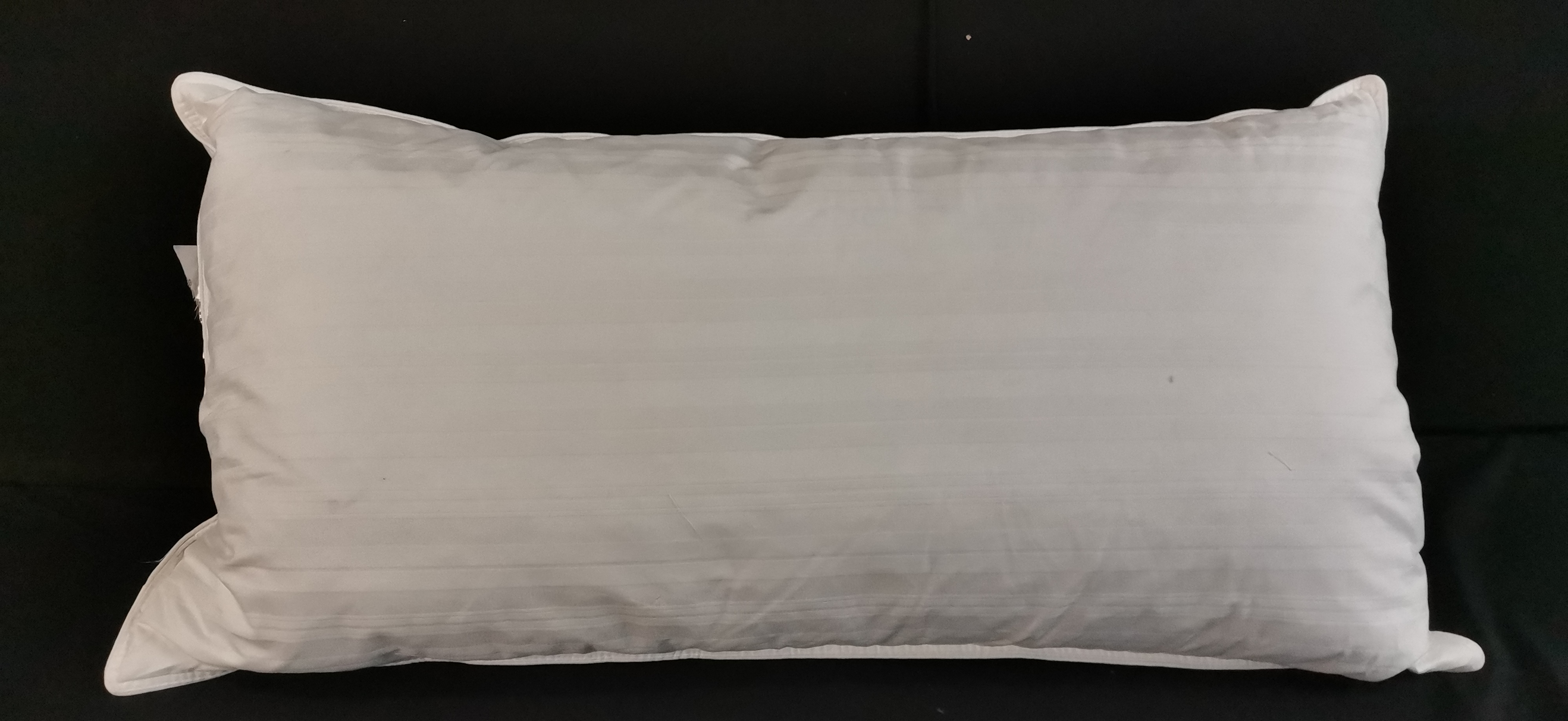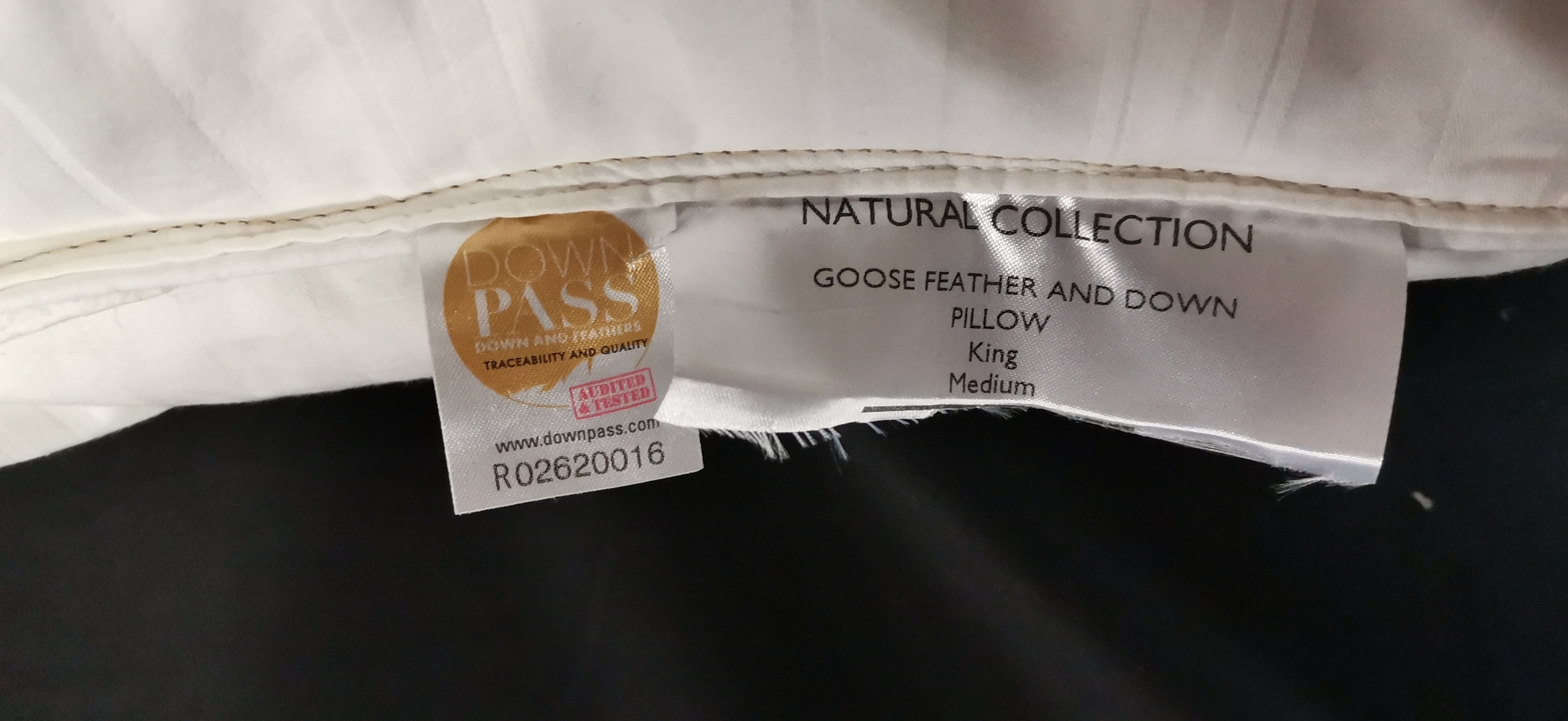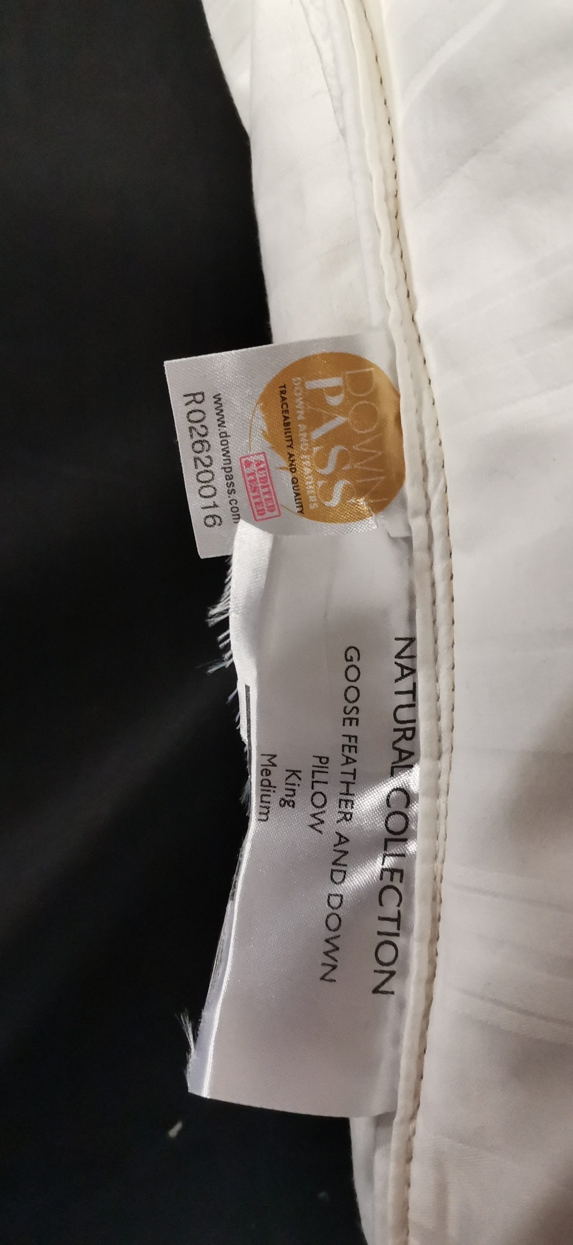 A white King-sized goose feather and down pillow from the Natural Collection featuring a striped cotton cover and a Down Pass quality and traceability label.
