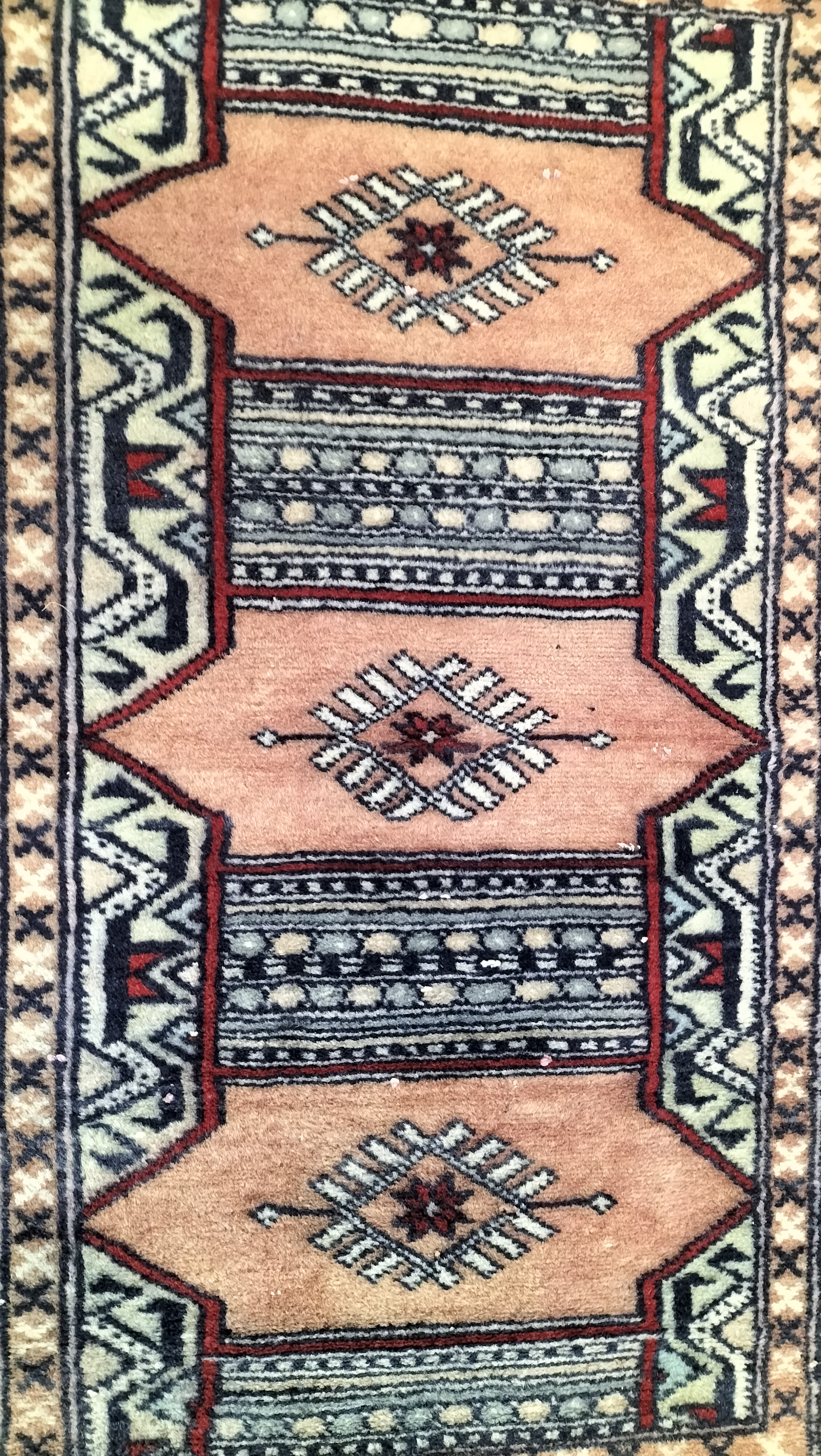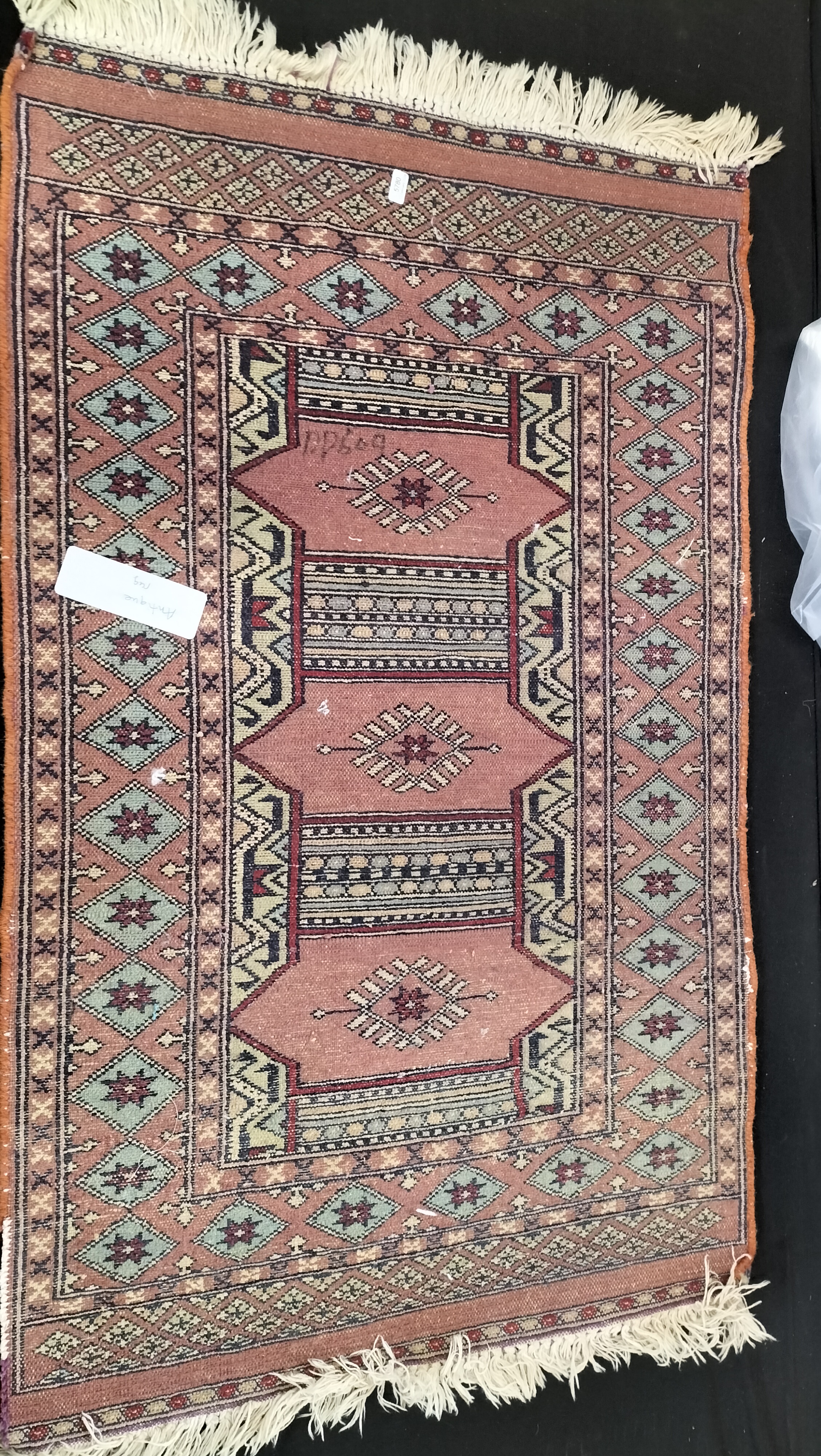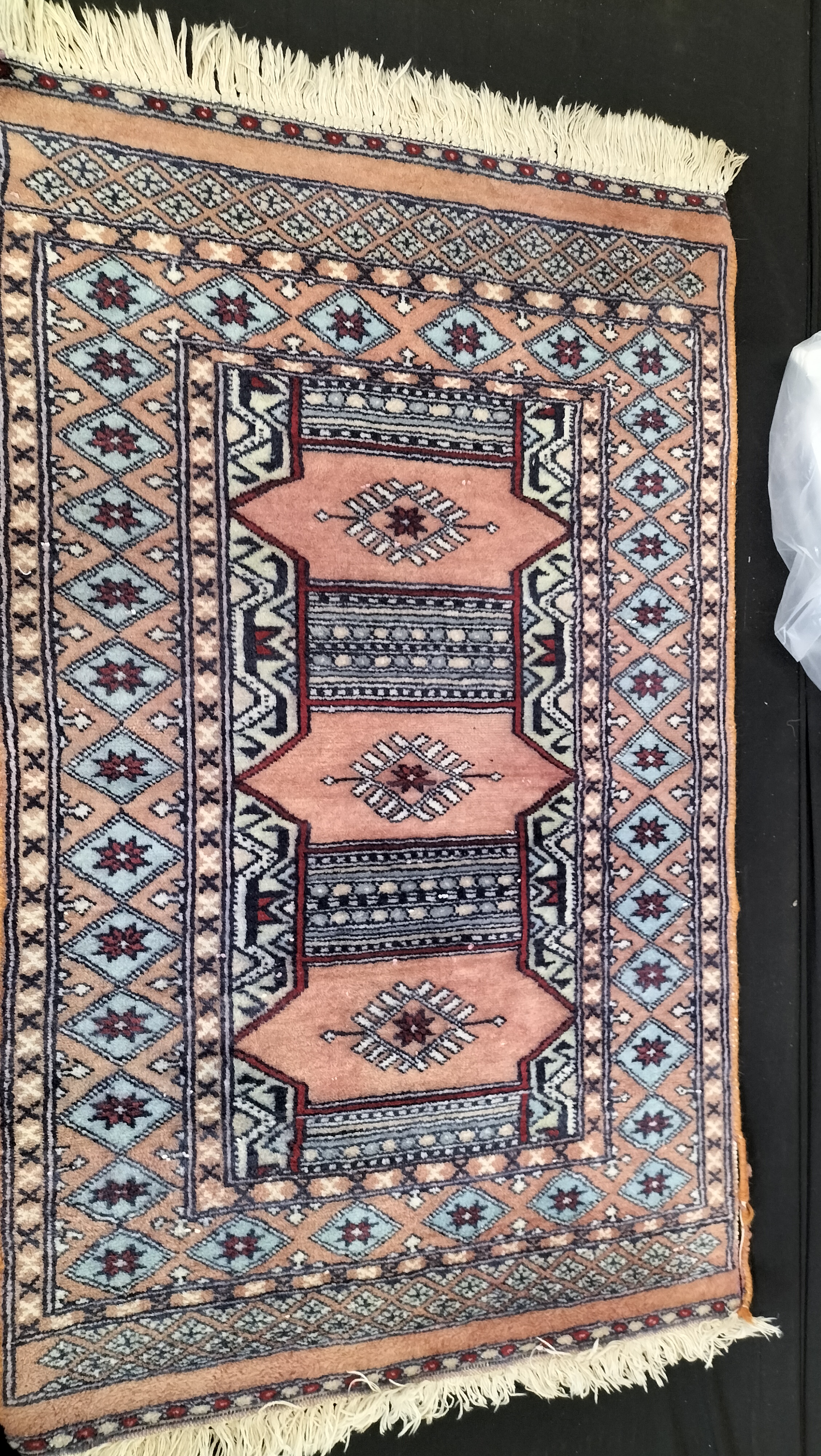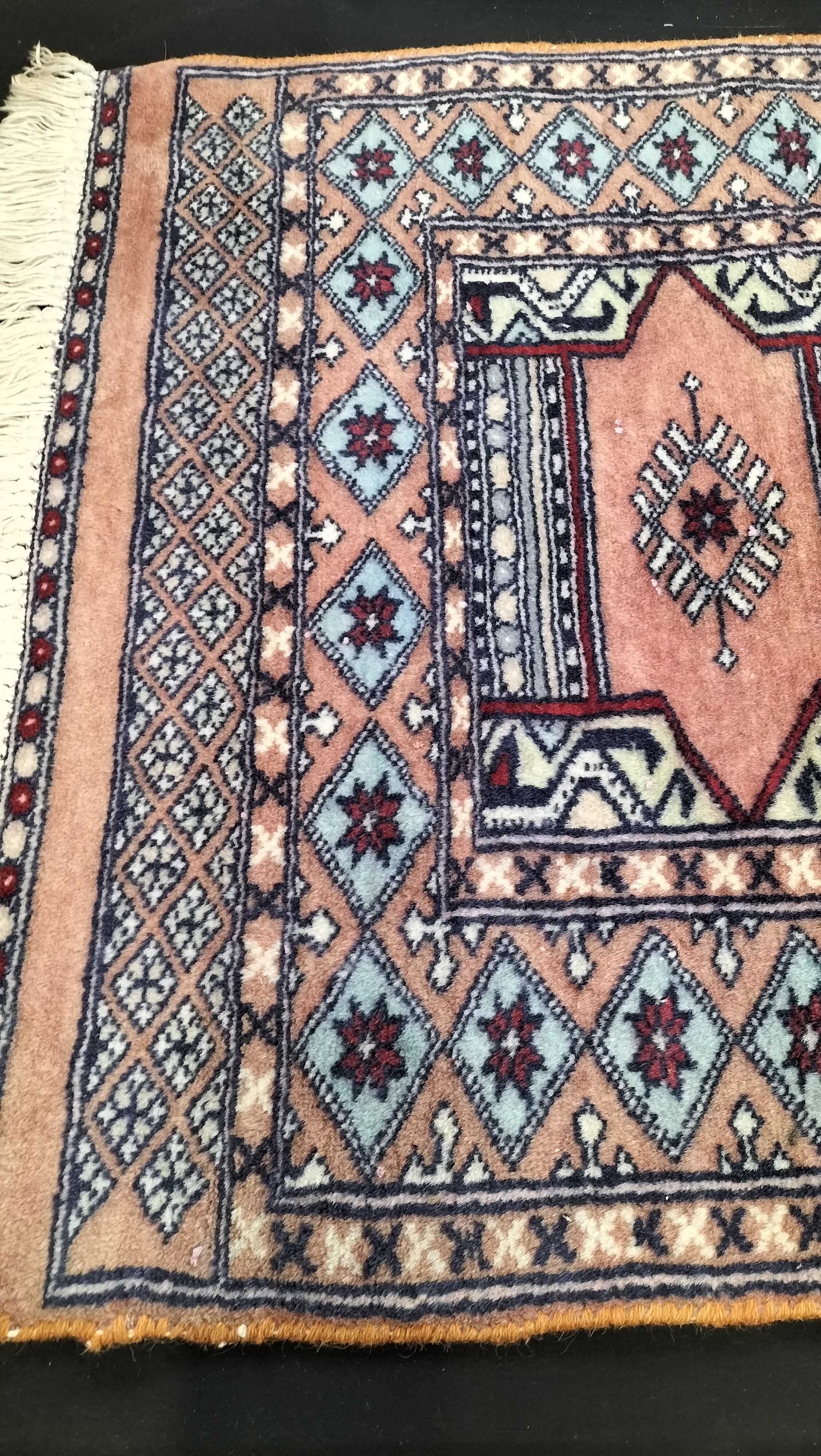 An antique hand-knotted wool area rug featuring a geometric tribal design in peach, light blue, and cream tones with cream-coloured fringe.