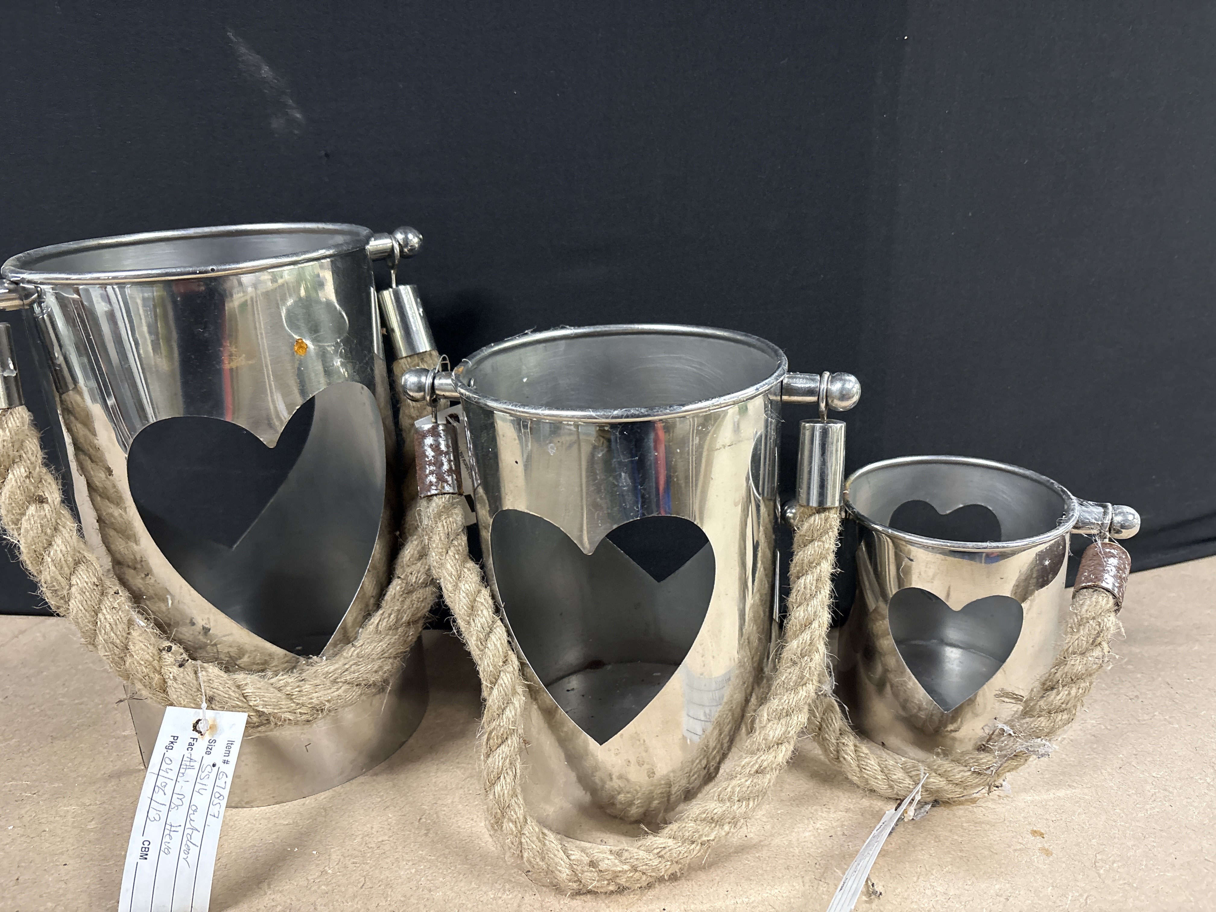 A graduated set of three contemporary decorative candle holders or lanterns by Next, constructed from polished silver-tone metal and natural-fibre rope. Each cylindrical vessel features large heart-shaped cutouts on opposing sides, designed to house candles for outdoor use. The thick rope handles are secured to the rim by metal brackets finished with ball finials. The items include an attached identification tag for Item # 67857. Dimensions: Graduated heights.