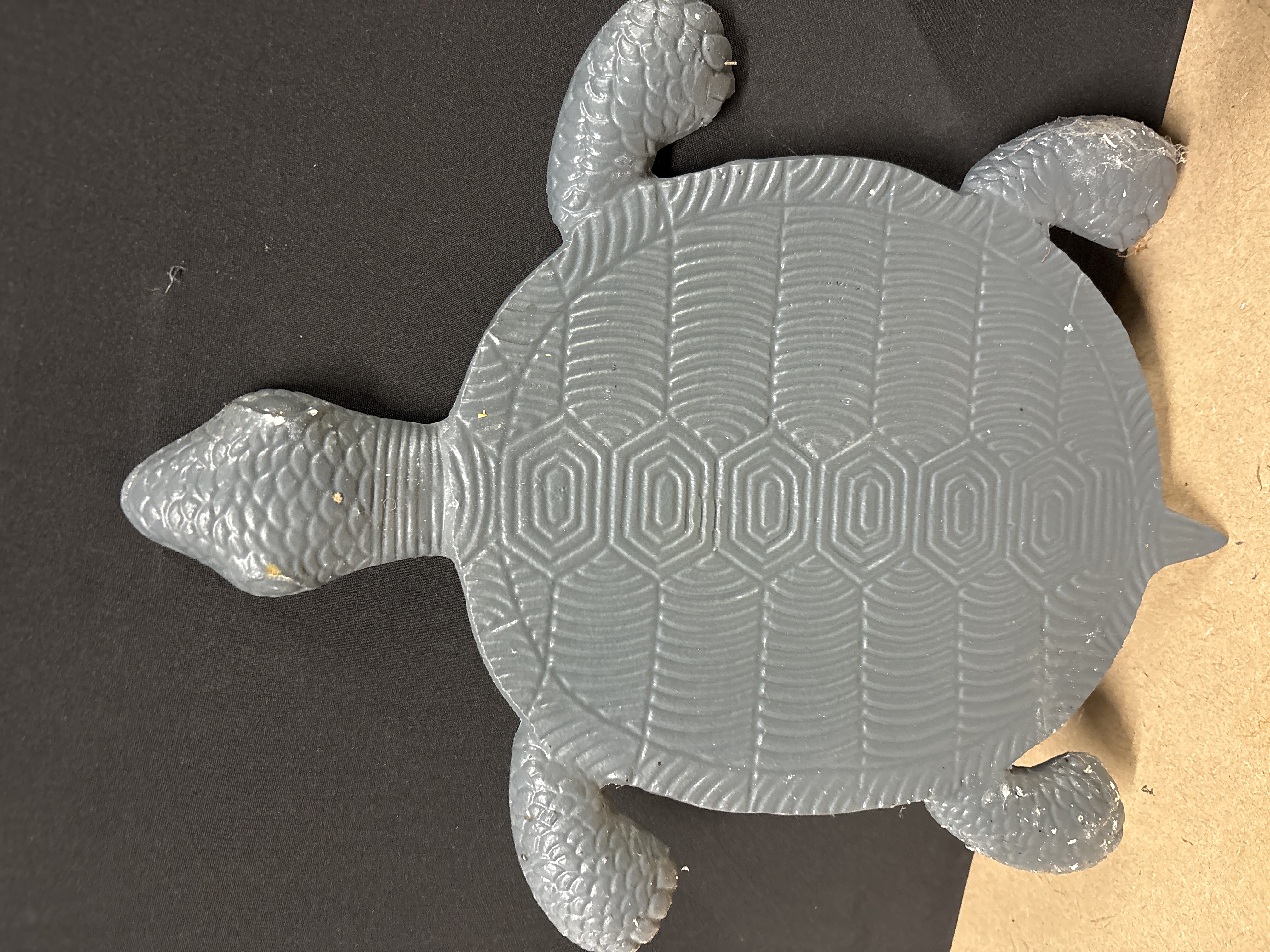 A set of three decorative garden stepping stones attributed to Esschert Design. Each piece is cast from metal and features embossed nature-inspired motifs, including a turtle with a detailed geometric shell, a spiral ammonite shell, and a butterfly with textured wing patterns. These items are designed for use as garden path pavers or decorative wall plaques, finished in a uniform grey colour. Dimensions: Turtle approximately 32cm x 26cm, Ammonite approximately 25cm diameter, Butterfly approximately 32cm x 25cm.
