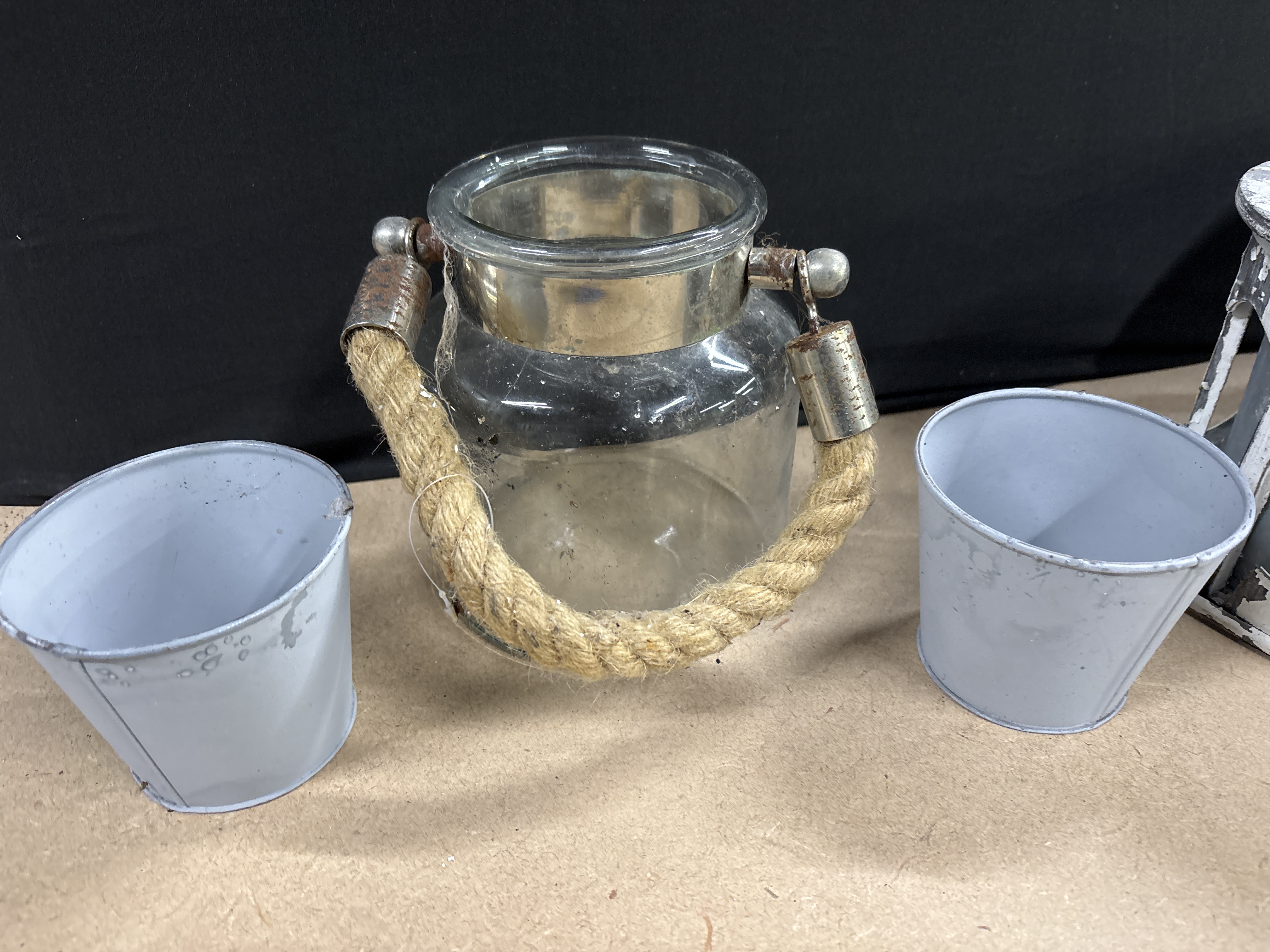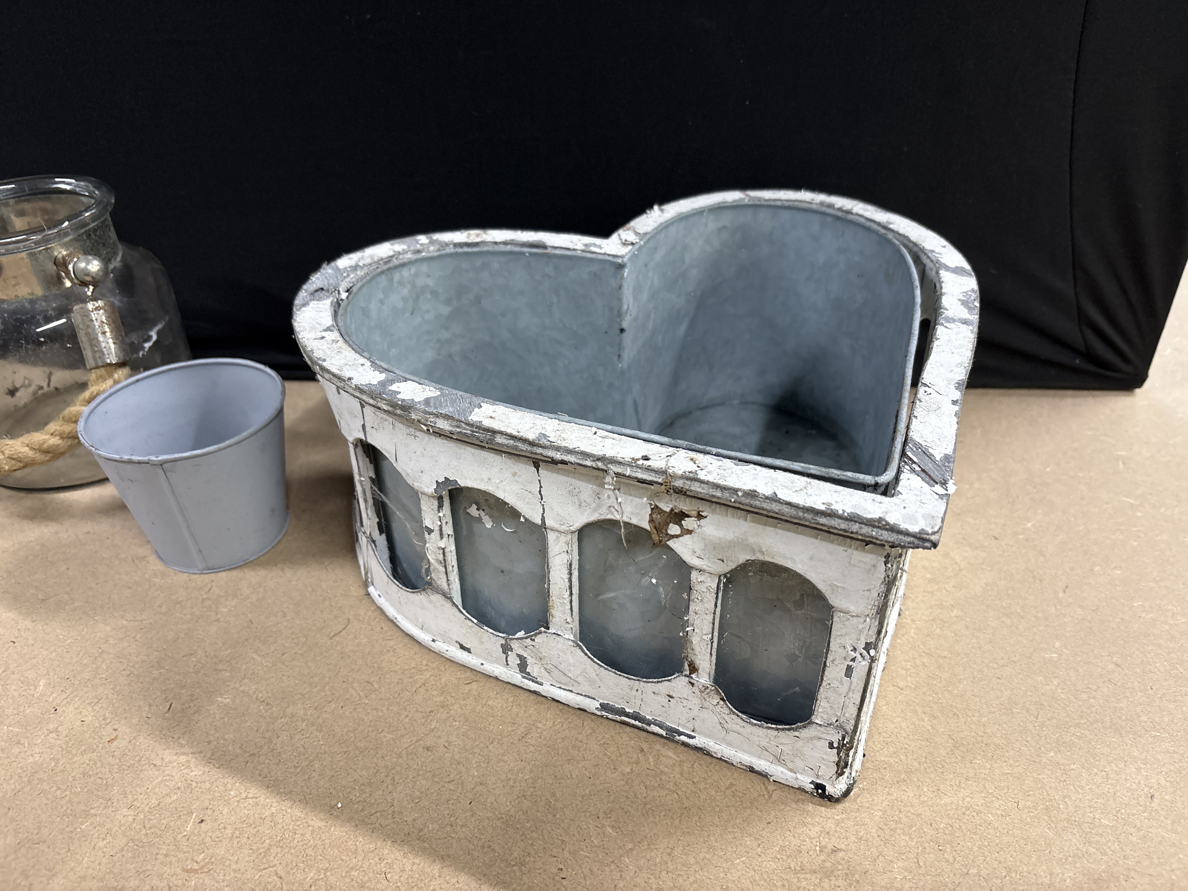 A lot consisting of four decorative garden ornaments manufactured from metal and glass. The collection includes a heart-shaped planter featuring a metal liner and a white-painted frame with a distressed finish. Also included is a glass lantern with a metal rim and a thick natural fibre rope handle attached via metal hardware. The set is completed by two small tapered metal buckets with a pale grey painted finish. These pieces reflect a rustic, shabby chic aesthetic suitable for garden or home decoration. No maker’s marks are present. Dimensions: Heart planter approx. 25cm x 25cm x 12cm; Lantern height approx. 15cm; Buckets height approx. 10cm.