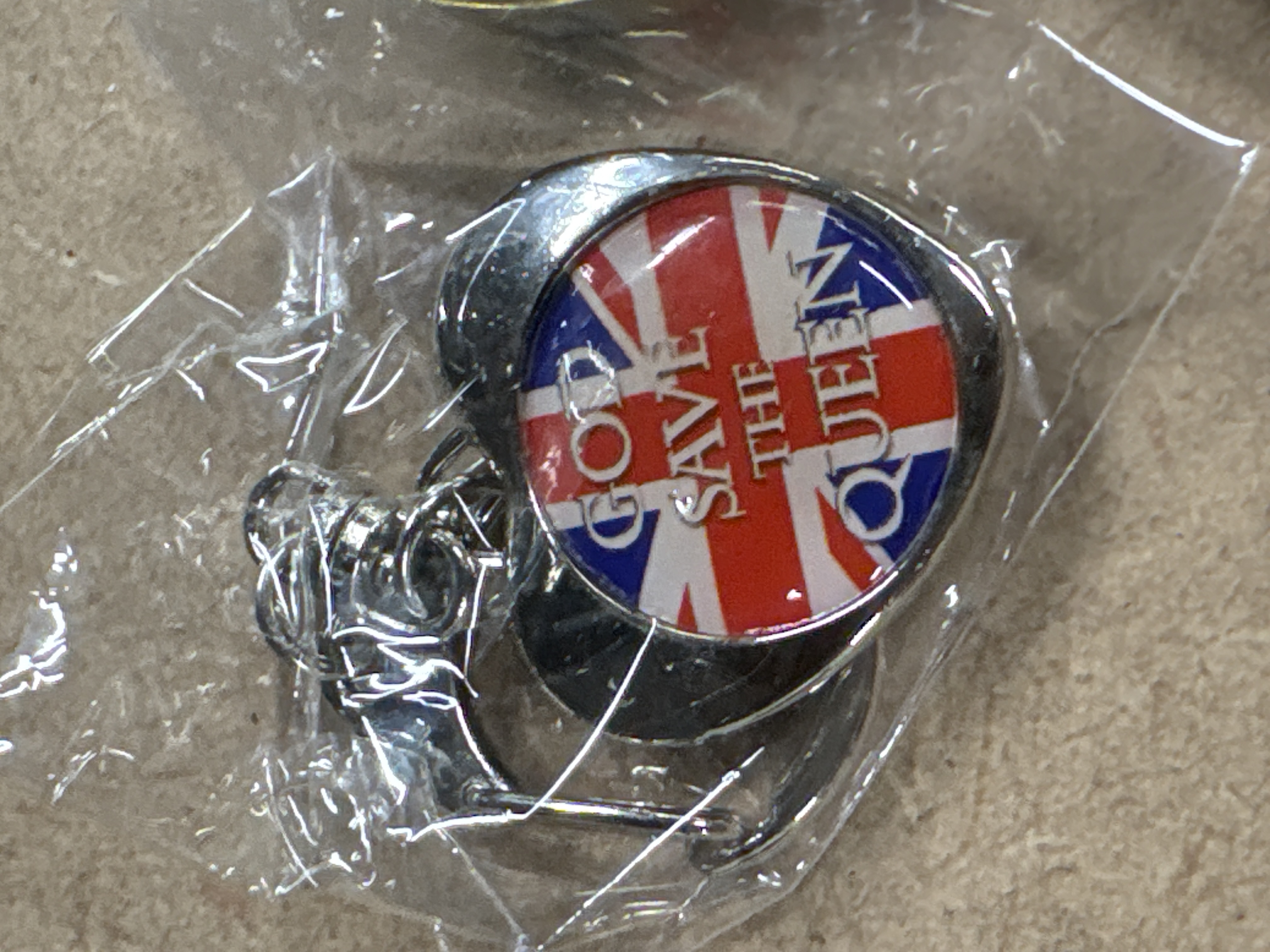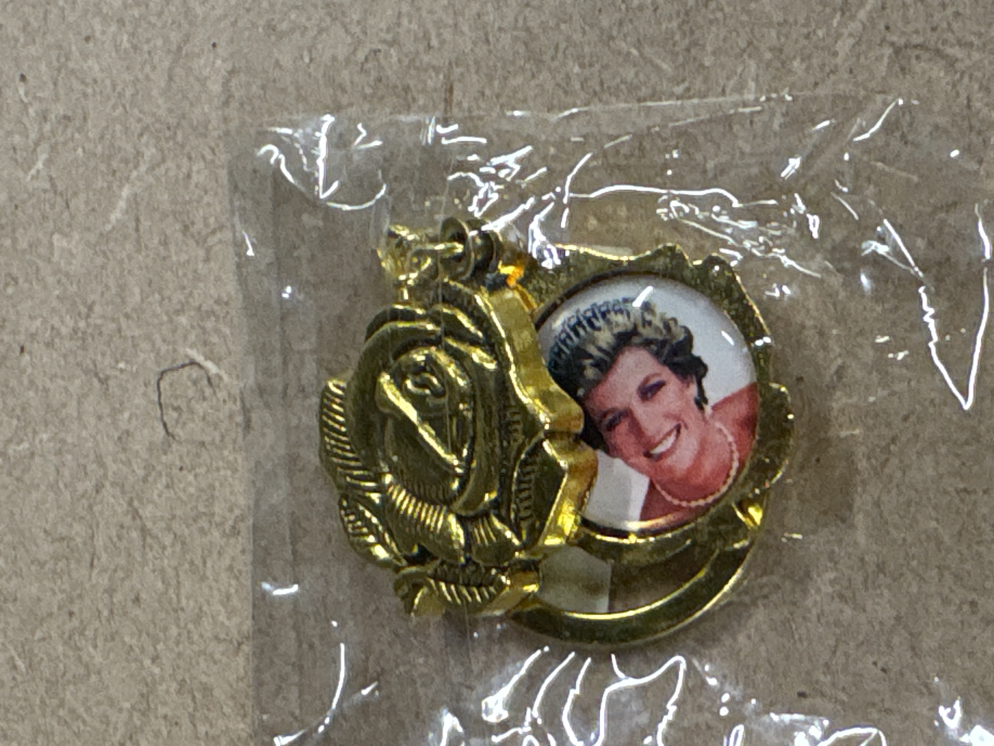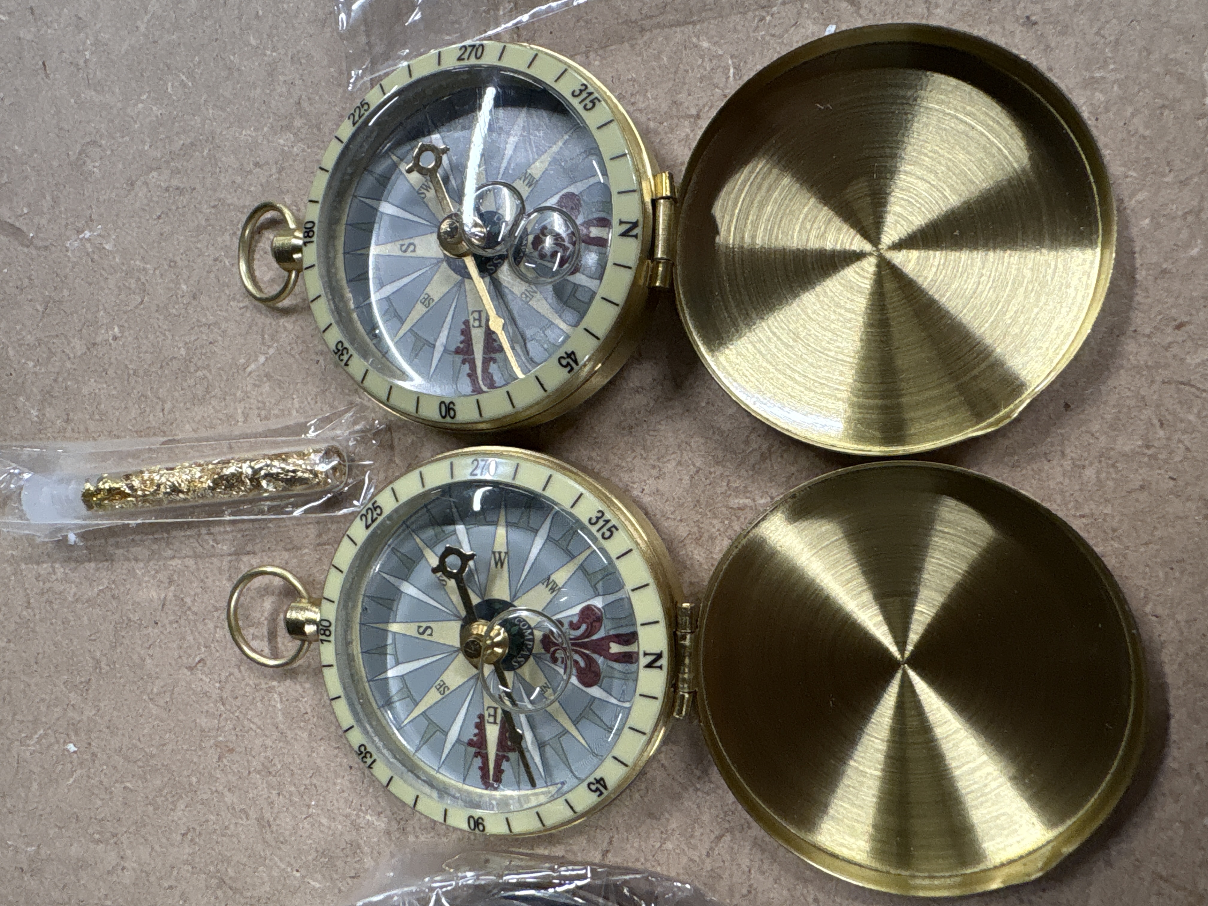 This lot comprises five individual items of commemorative interest, primarily associated with the Windsor Mint. The collection includes two identical brass-toned compasses designed in a traditional pocket-watch aesthetic, featuring hinged protective lids and decorative dials with cardinal points and degree markings. Also included is a gold-toned hinged pendant in the form of a rose, which opens to reveal a photographic portrait of Diana, Princess of Wales. The lot is further enhanced by a heart-shaped Union Jack keychain bearing the patriotic inscription GOD SAVE THE QUEEN and a small, sealed plastic vial containing decorative gold-coloured flakes. These items represent typical late 20th-century souvenir production, blending functional nautical-style instruments with royal commemorative themes. Compasses: 48mm diameter. Pendant: 30mm x 25mm. Keychain: 40mm width. Vial: 45mm length.