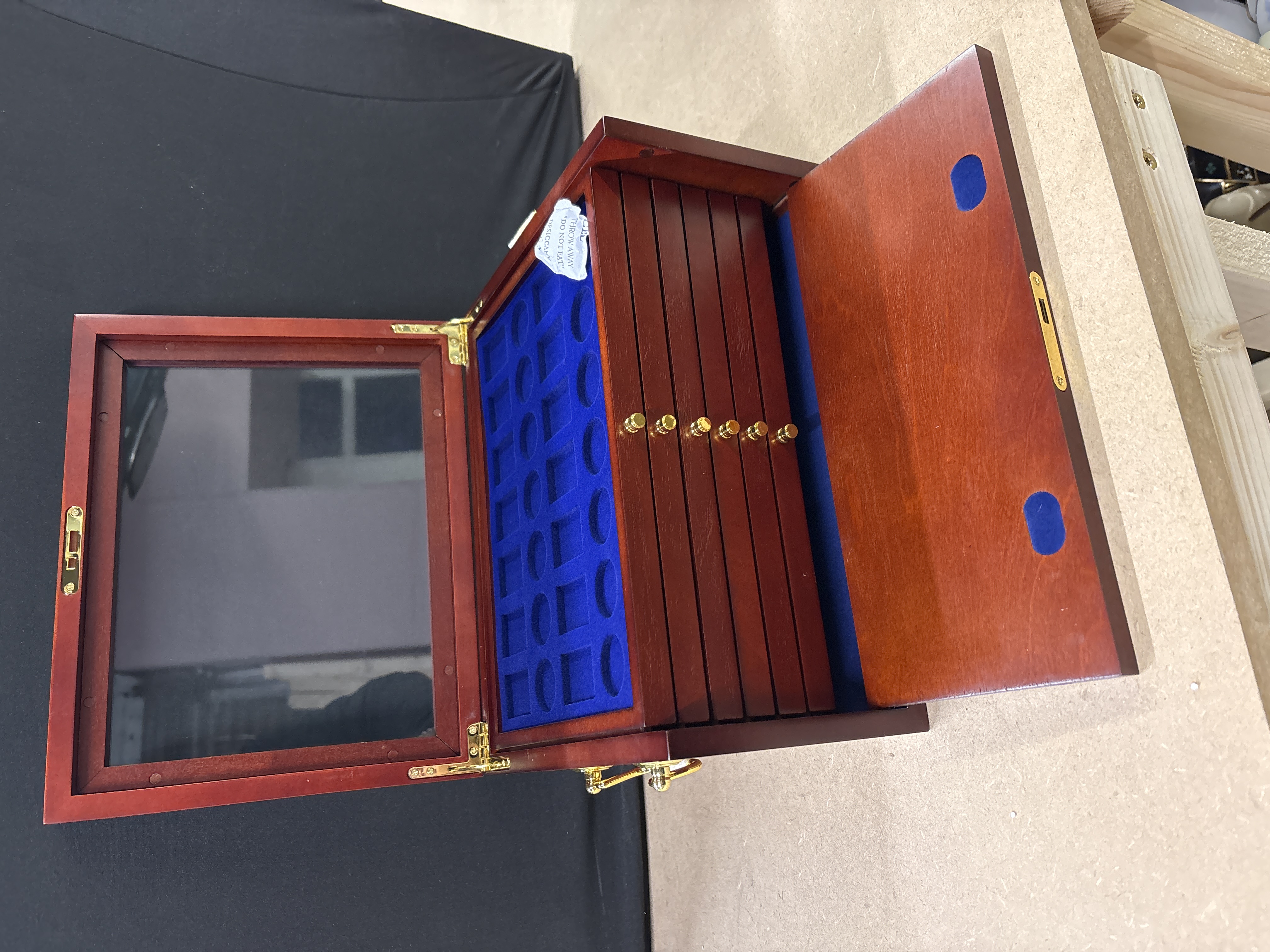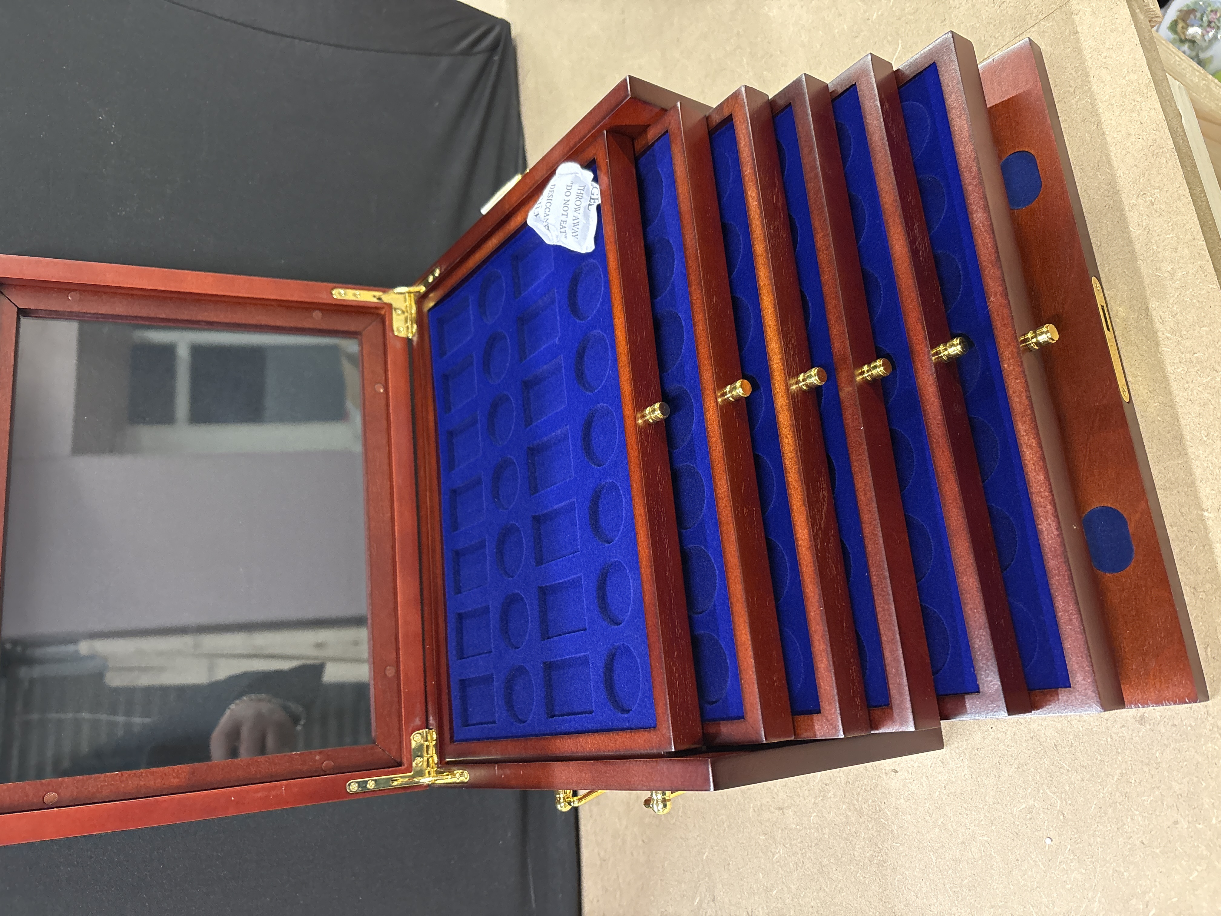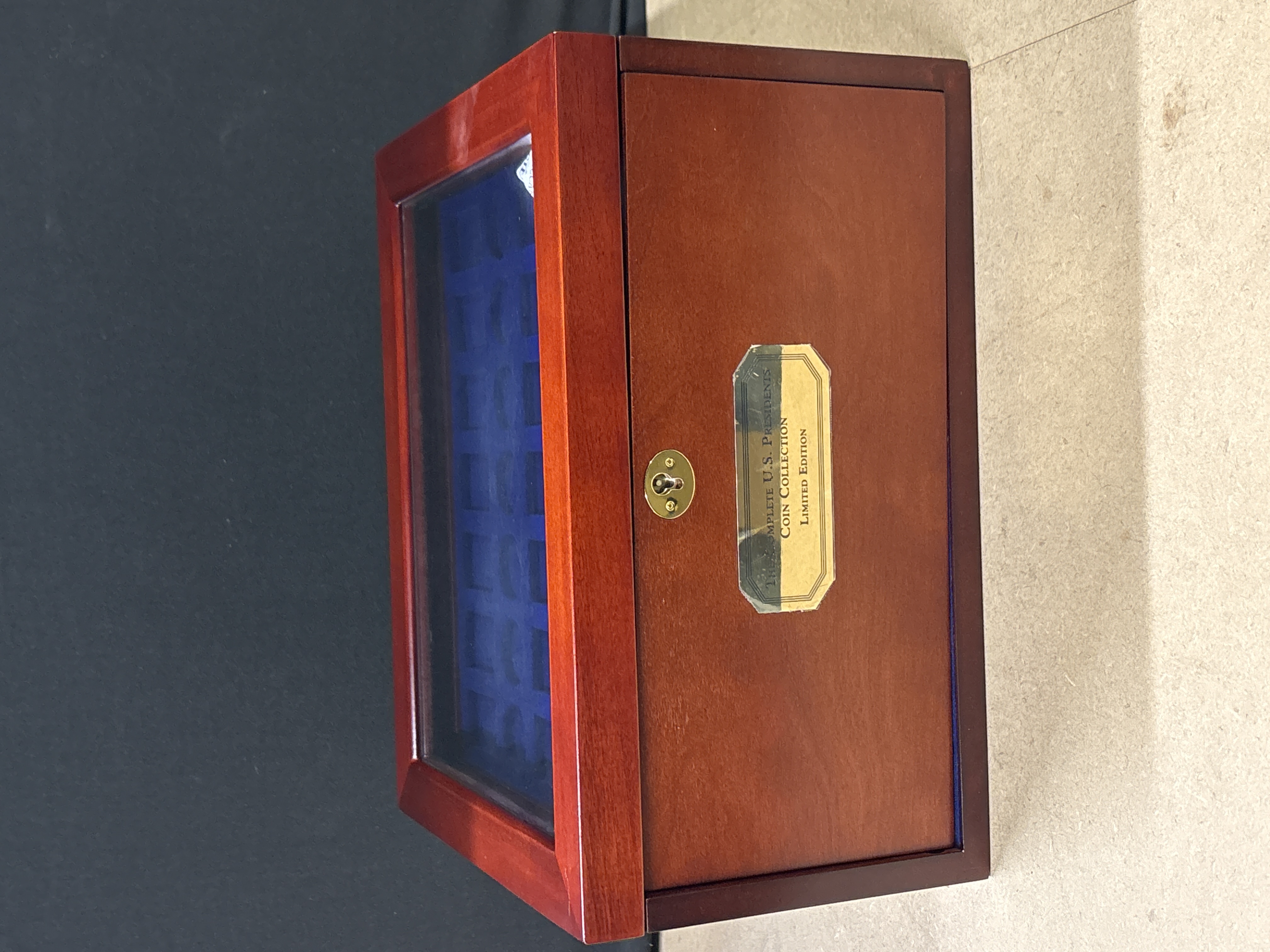 A single rosewood coin collector box produced for The Complete U.S. Presidents Coin Collection Limited Edition, likely issued by the Postal Commemorative Society. The cabinet features a hinged glass-front door and six internal pull-out trays. Each tray is lined with royal blue felt and contains recessed circular and rectangular cutouts designed for the storage of coins and associated display cards. The exterior is fitted with brass-toned hardware, including a side-mounted identification plaque, individual drawer pull knobs, and a front-facing keyhole escutcheon. This lot consists of the storage cabinet only; no coins or numismatic contents are included.