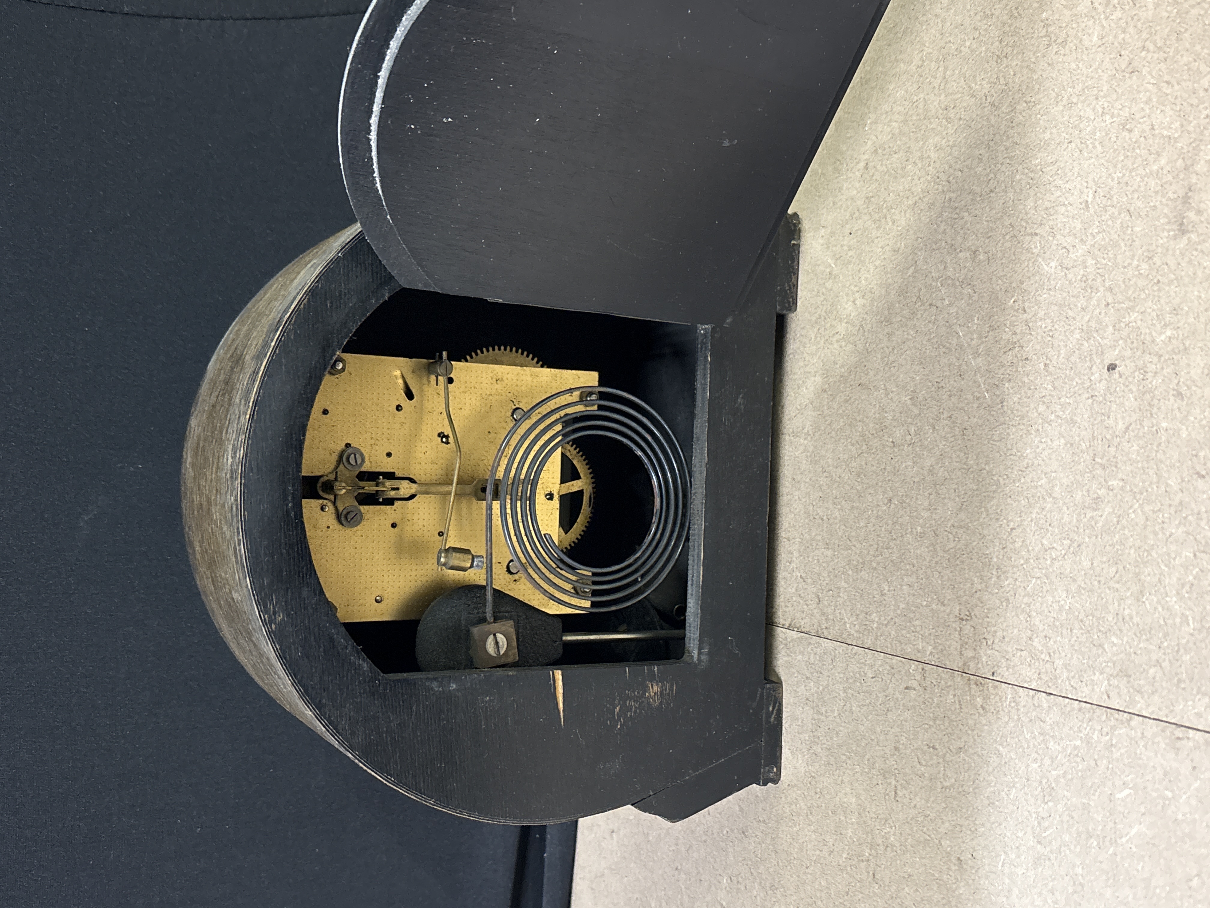 A mid-20th century English mantel clock manufactured by Smiths Enfield. The lot consists of a single clock featuring a rounded-top wood case resting upon two integrated block-style feet. The dial is designed with a silvered chapter ring featuring black Arabic numerals surrounding a central wood-grain panel, clearly marked SMITHS ENFIELD and MADE IN ENGLAND. The face includes two winding arbors and stylised metal hands set behind a hinged chrome-finished bezel with a glass cover. The mechanical striking movement is housed behind a rear wooden door and incorporates a visible spiral gong. Dimensions: Approx. 22cm x 18cm x 11cm.