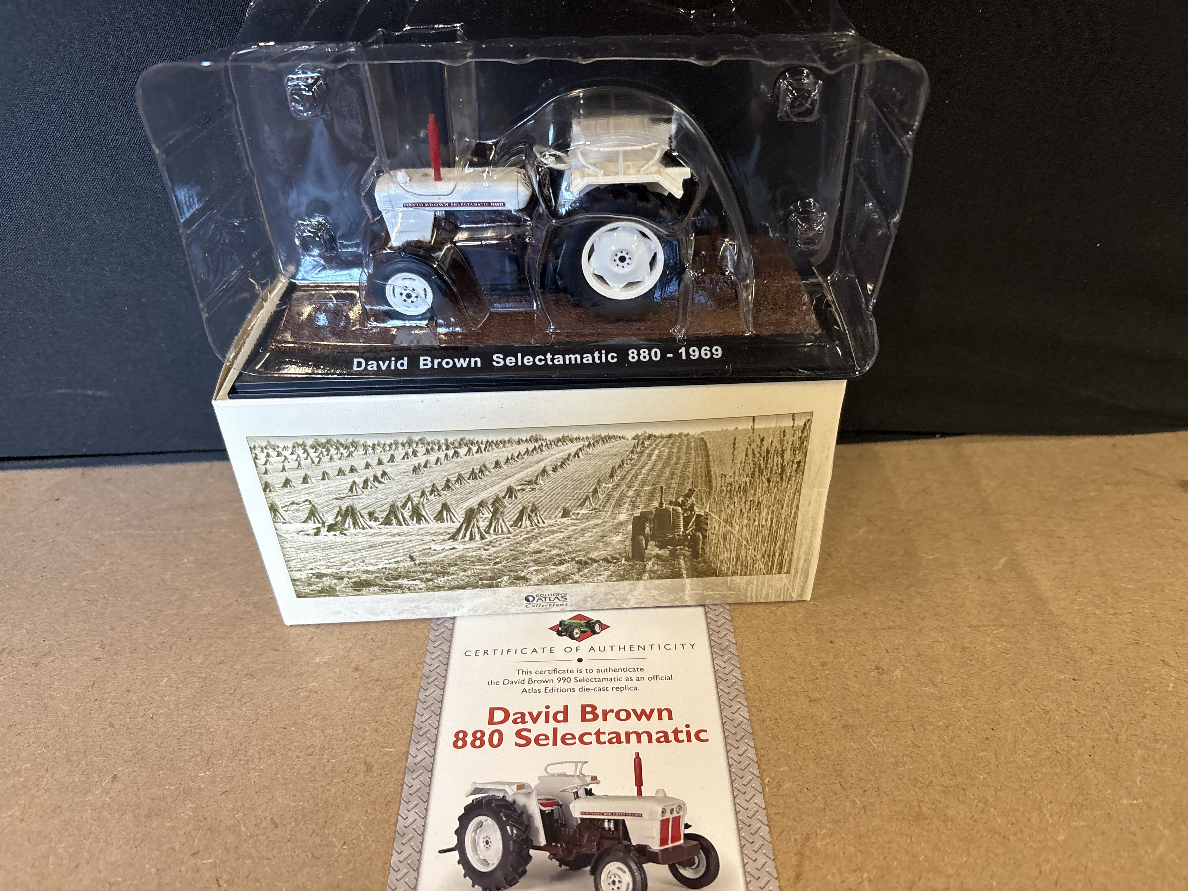 A white and brown die-cast replica of a 1969 David Brown Selectamatic 880 tractor by Atlas Editions, complete with its original display base, pictorial box, and certificate of authenticity.