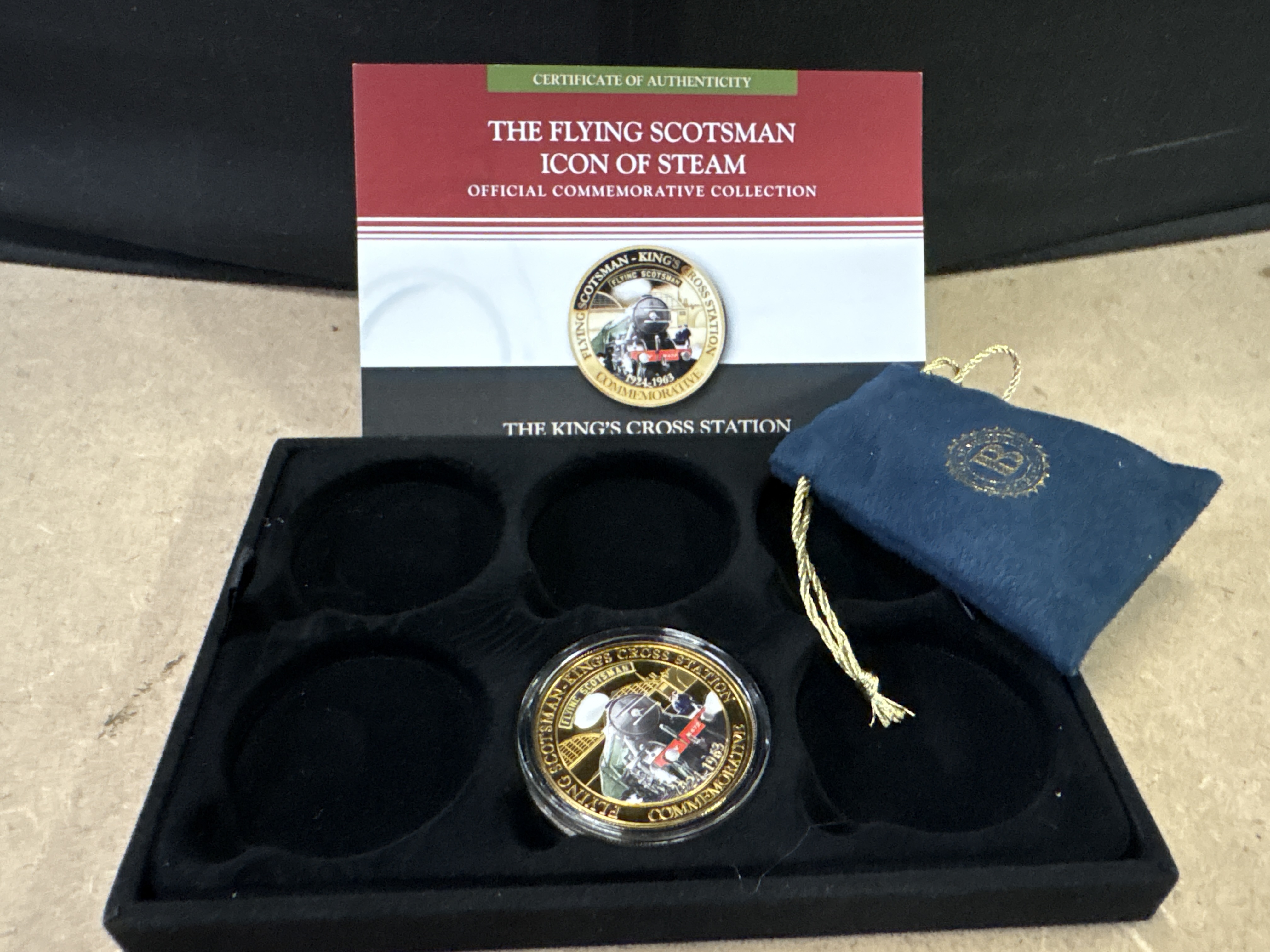 Produced by The Bradford Exchange as part of the Flying Scotsman Icon of Steam Official Commemorative Collection. This Flying Scotsman coin commemorative was issued under licence from SCMG Enterprises Ltd. The obverse features a locomotive wheel design with a central insert of authentic metal from the Flying Scotsman locomotive. The reverse features a colourised locomotive and station facade design. Historical note: Limited edition of 19,340 pieces.
