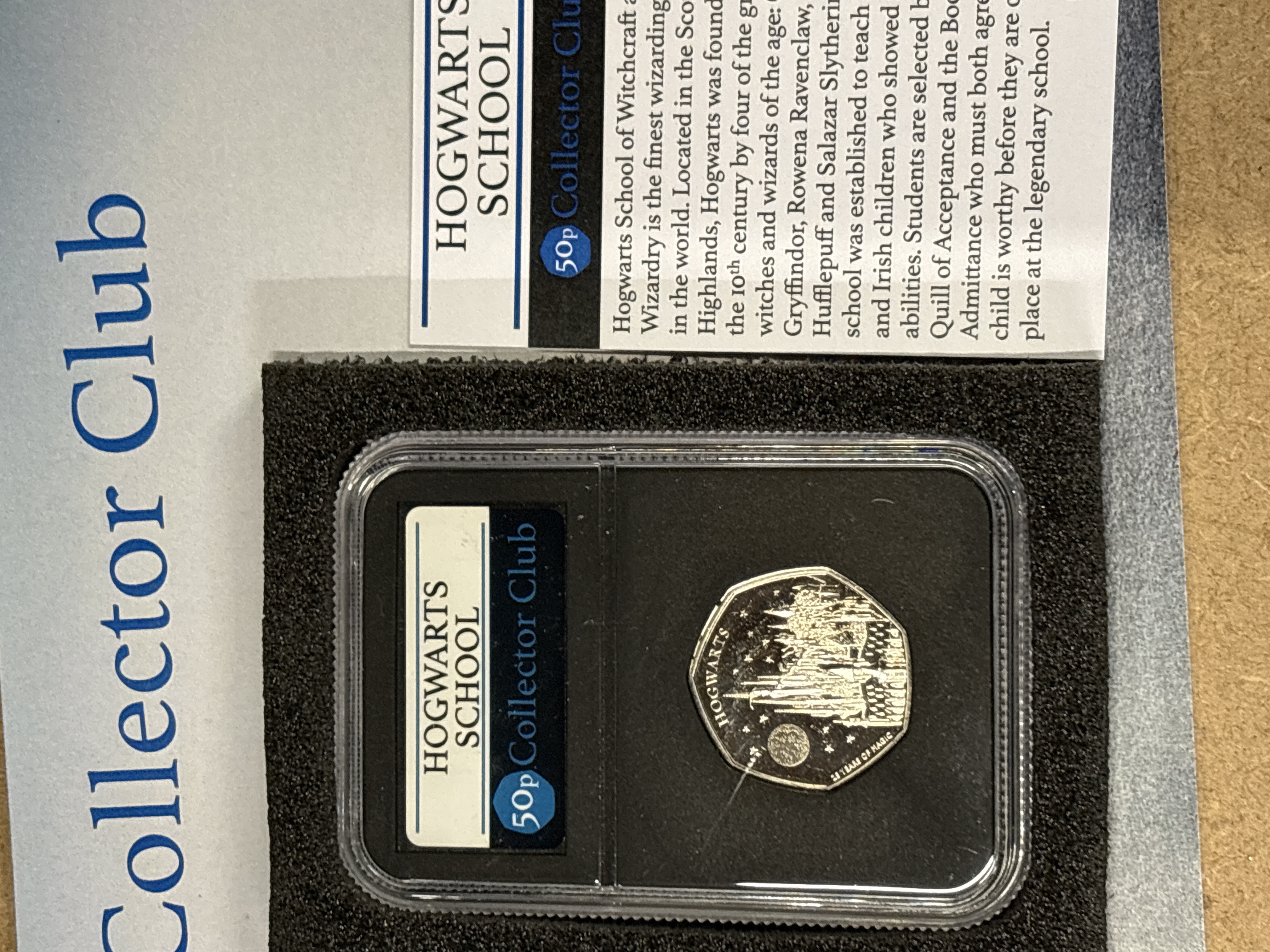 Catalog number Spink 4725. Reverse designed by Ffion Gwillim; obverse by Martin Jennings. Struck at the Royal Mint, Llantrisant. Hogwarts School / King Charles III design type. Features a latent security feature changing between a lightning bolt and the number 25. This uncirculated specimen was distributed by Danbury Mint as part of the 50p Collector Club series. This commemorative issue marks the 25th anniversary of the publication of Harry Potter and the Philosopher’s Stone.